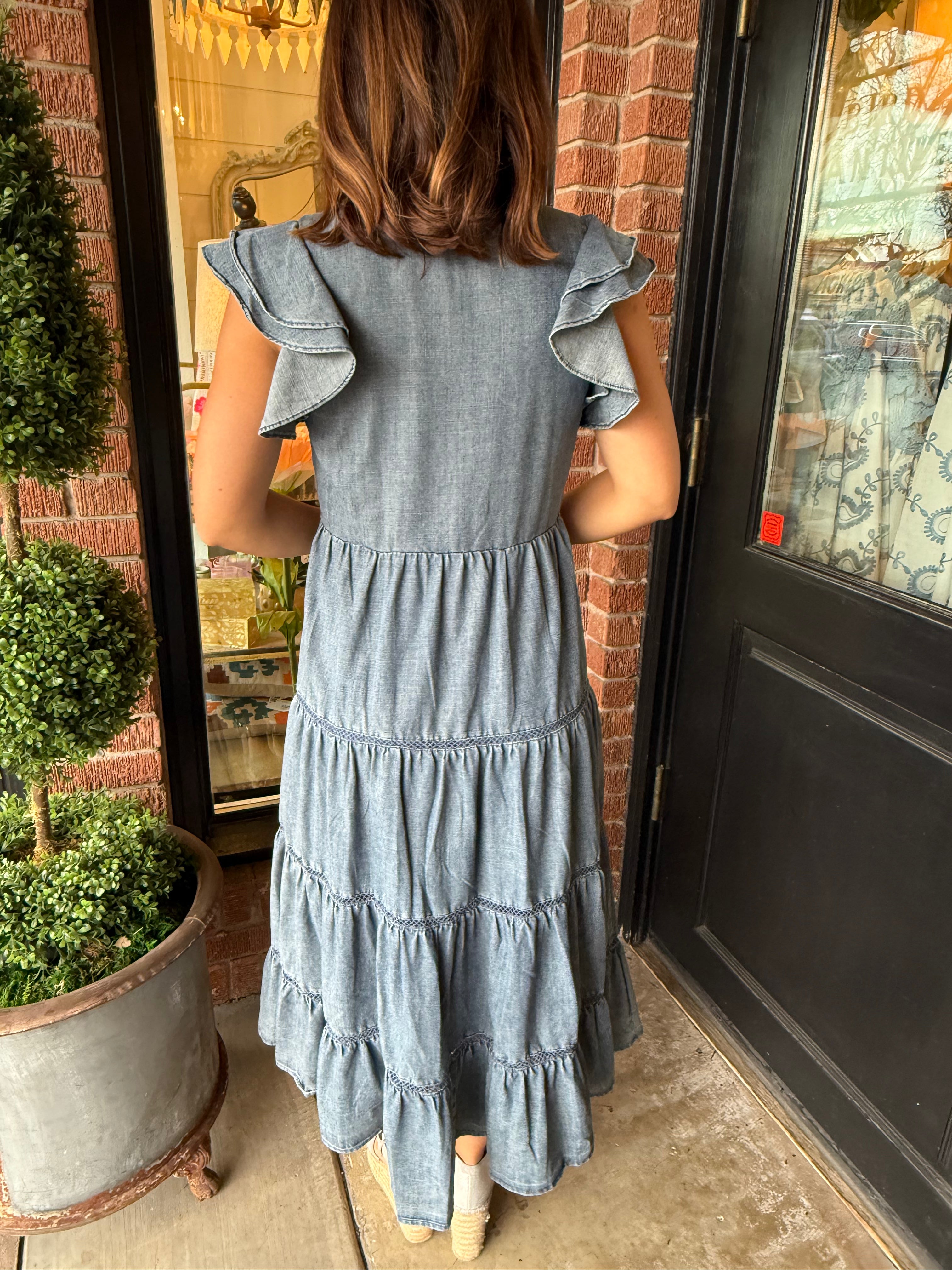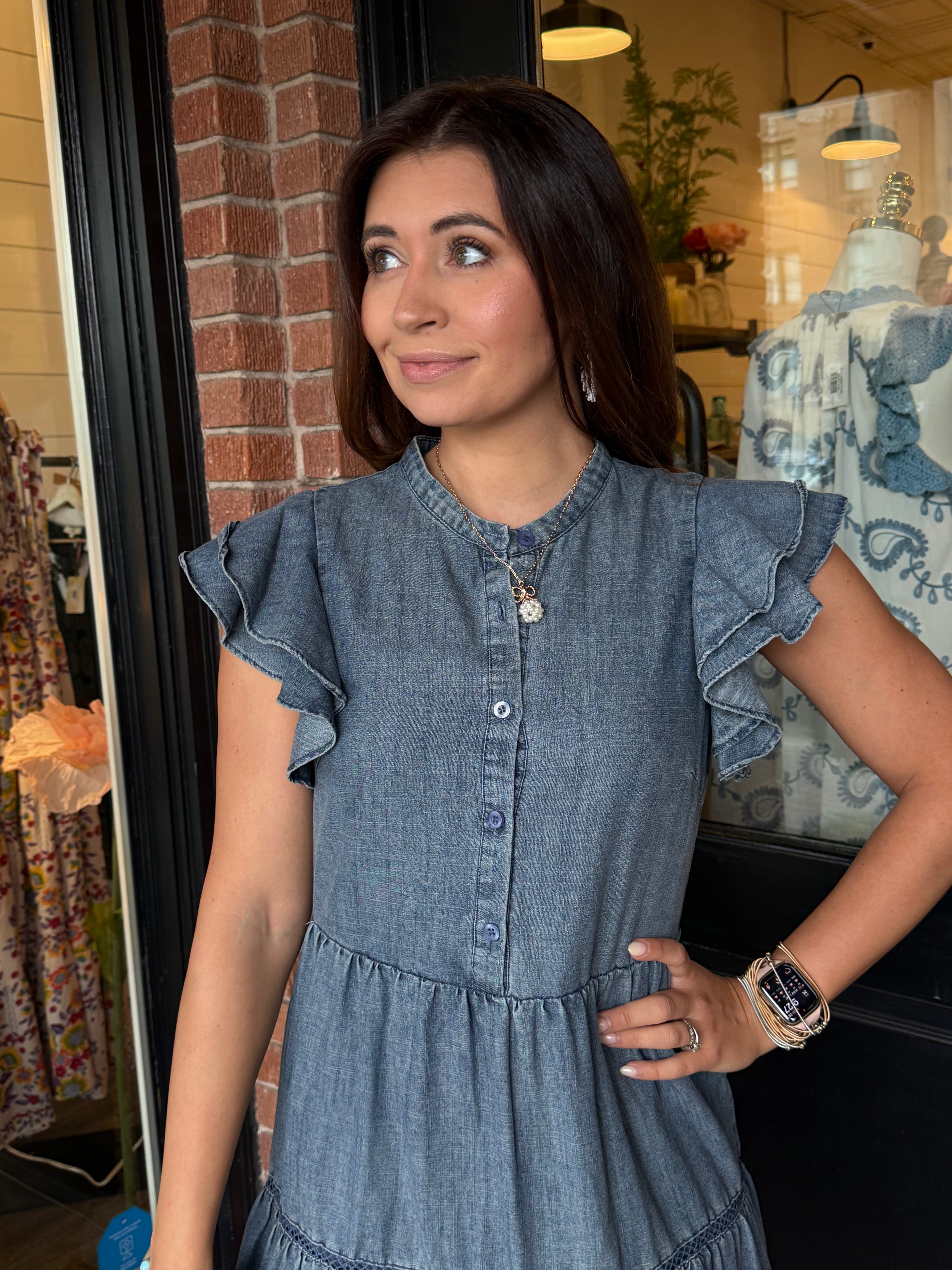 Effortlessly chic and endlessly versatile, the Jenny Midi Denim Dress is a must-have staple for your wardrobe. Designed with a flattering midi-length silhouette, this dress features a classic button-down front, a structured collar, and short sleeves for a timeless touch. The soft, high-quality denim provides the perfect balance of comfort and durability, making it ideal for year-round styling. Dress it up with heeled boots and statement jewelry or keep it casual with sneakers and a tote. A go-to piece for effortless, everyday elegance!