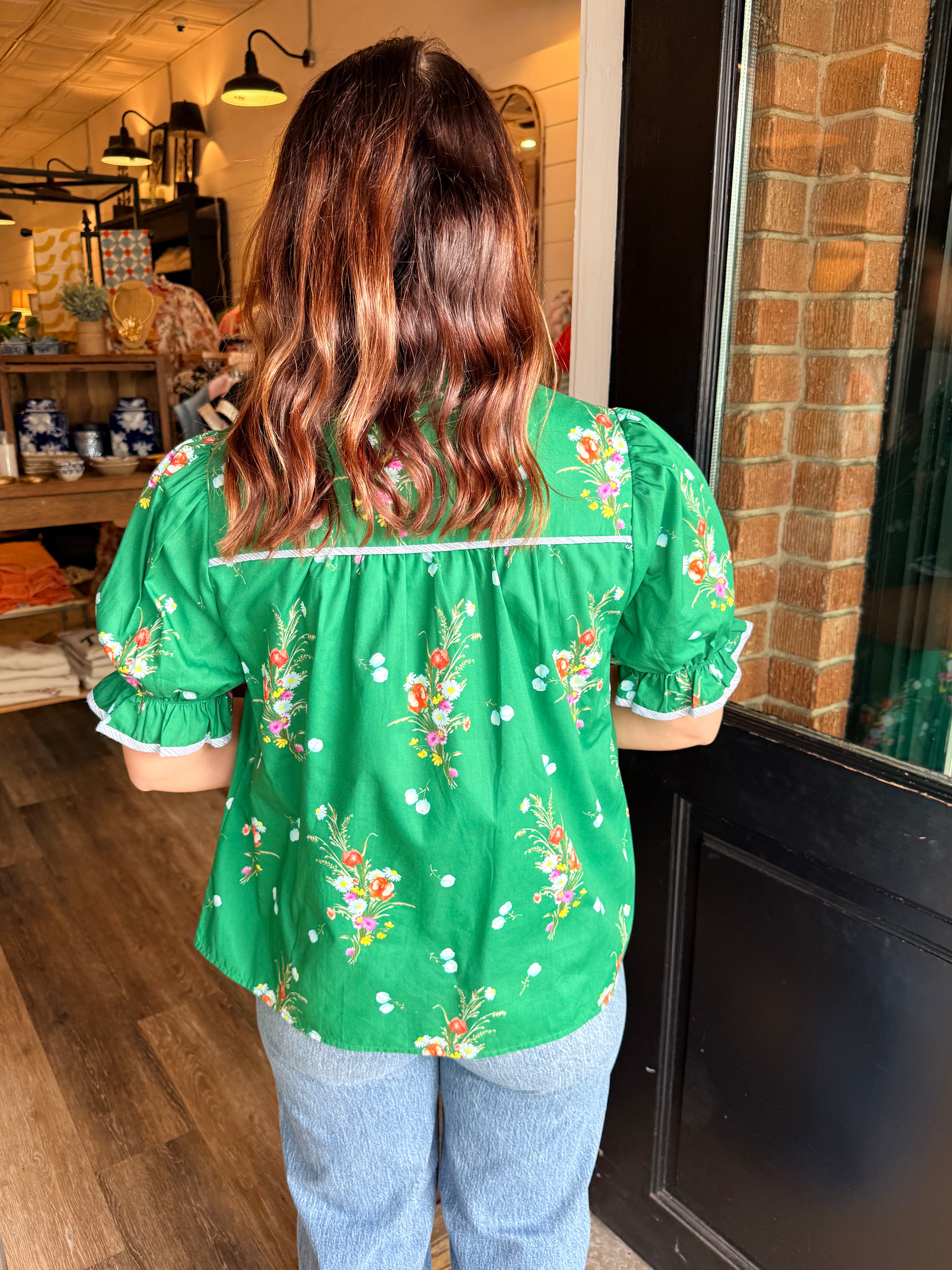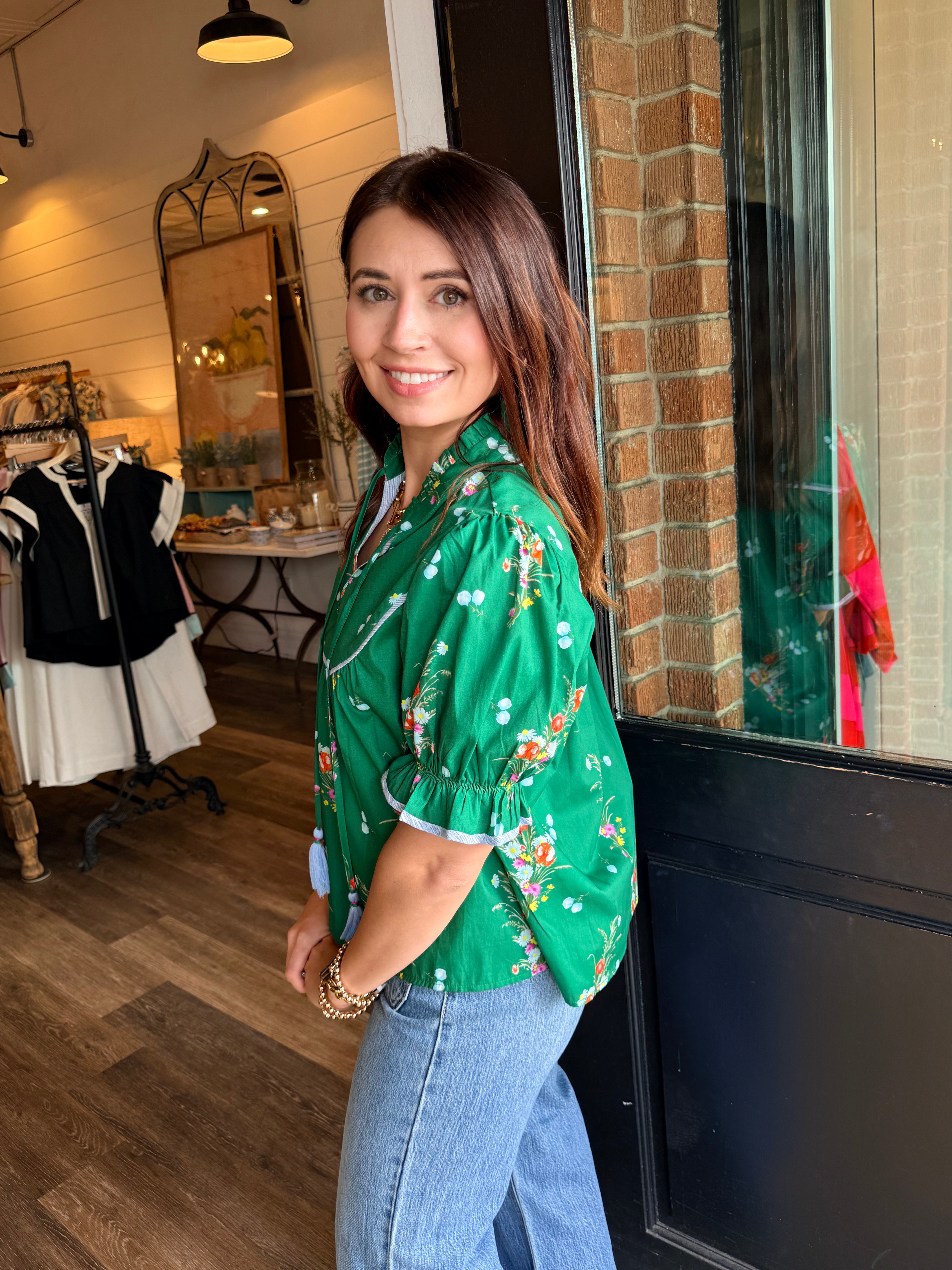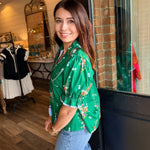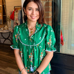 Fresh and easy to wear, the Jordan Green Floral Top is a warm-weather favorite. Designed with a flattering v-neckline and playful tie tassels, this top features short sleeves with elastic cuffs for a comfortable, feminine fit. Made from 100% cotton, it’s lightweight and breathable—perfect for everyday wear with denim, shorts, or skirts.