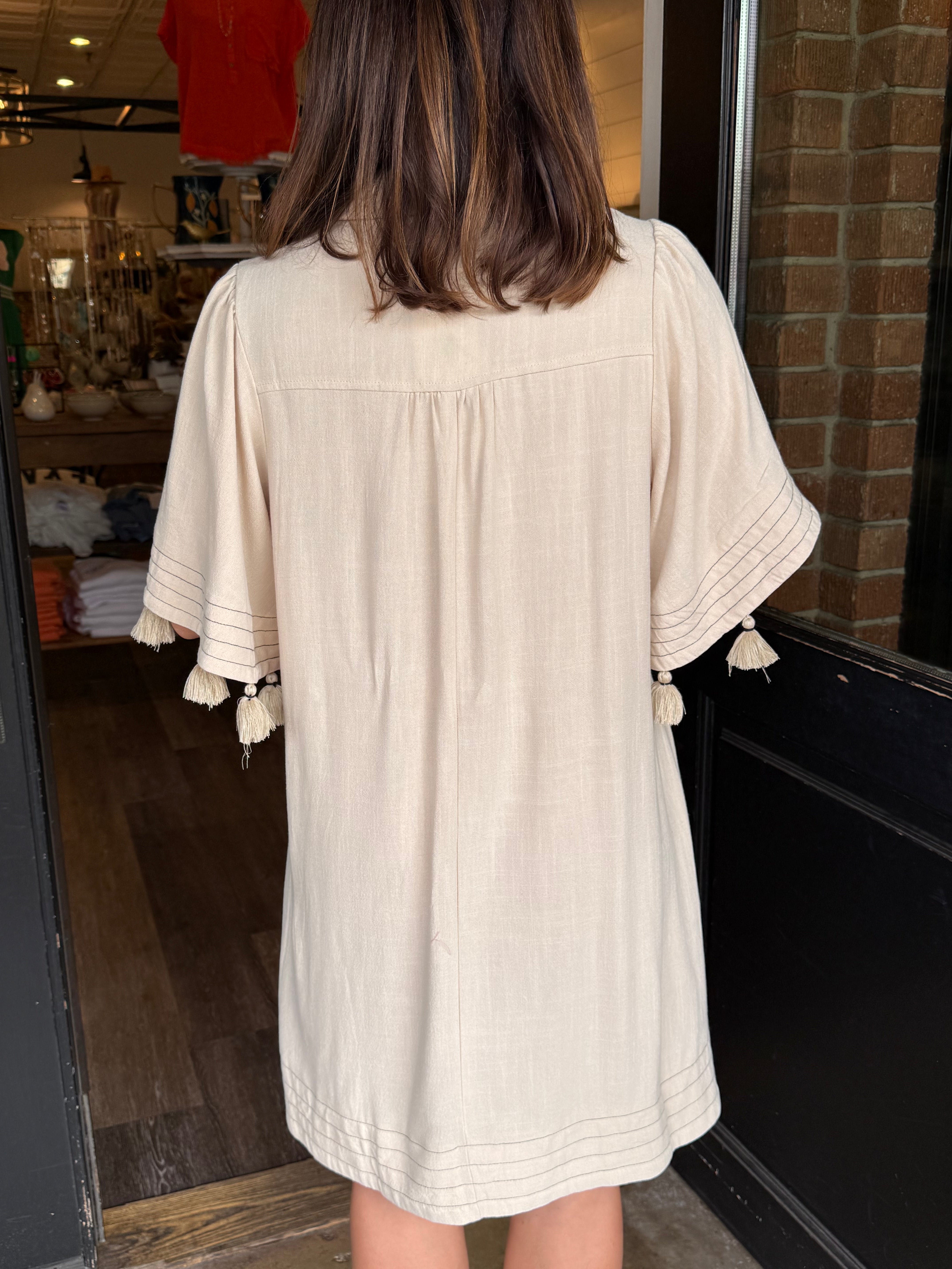 Add a playful twist to your everyday look with the Jude Tassel Hem Dress. Made from lightweight rayon linen, this shirt-style dress features a collared neckline, button-down front, and wing sleeves trimmed with tassel details. Line stitching at the hem and sleeves adds a polished finish, while the relaxed fit and side pockets keep things effortlessly cool.