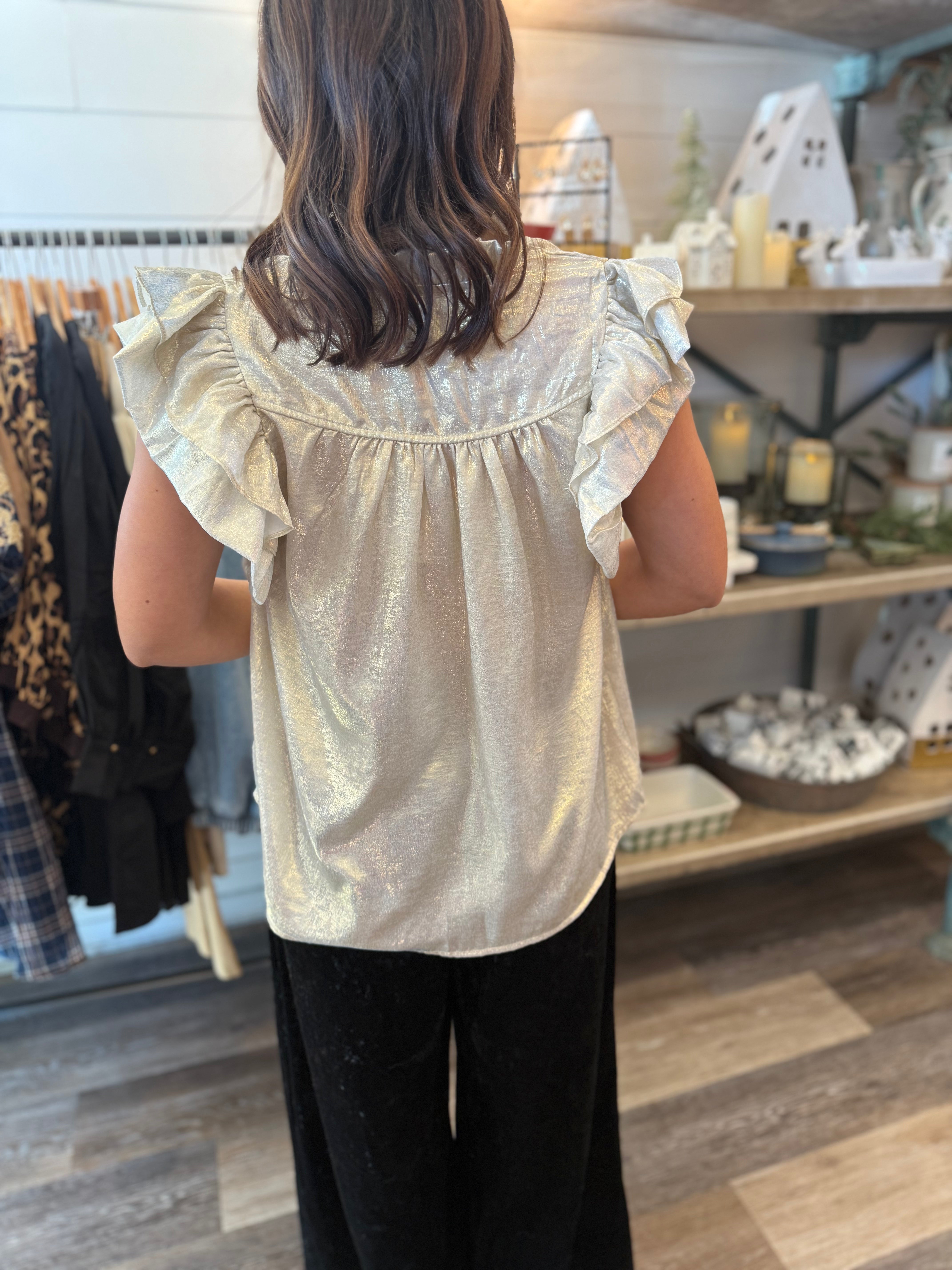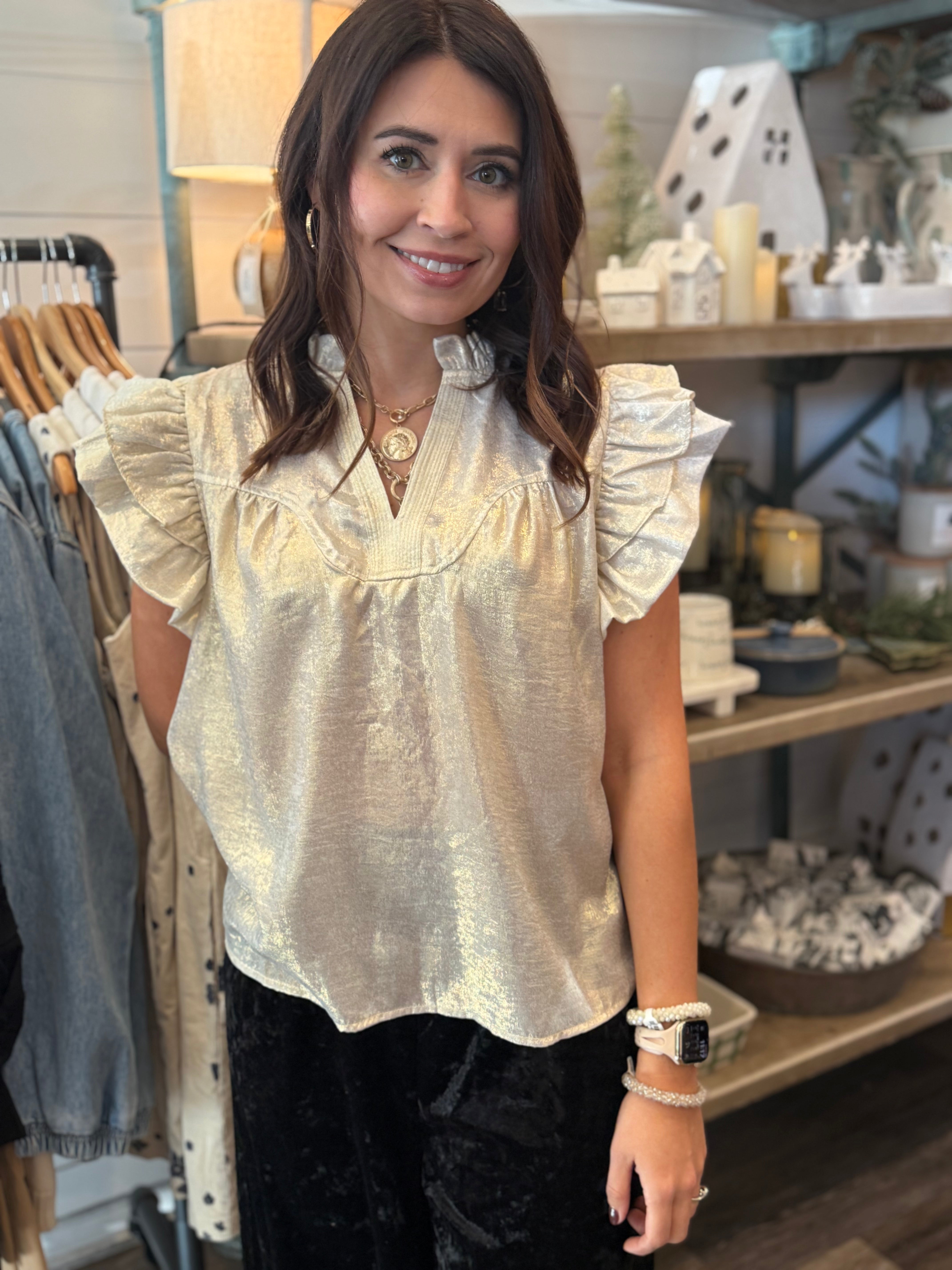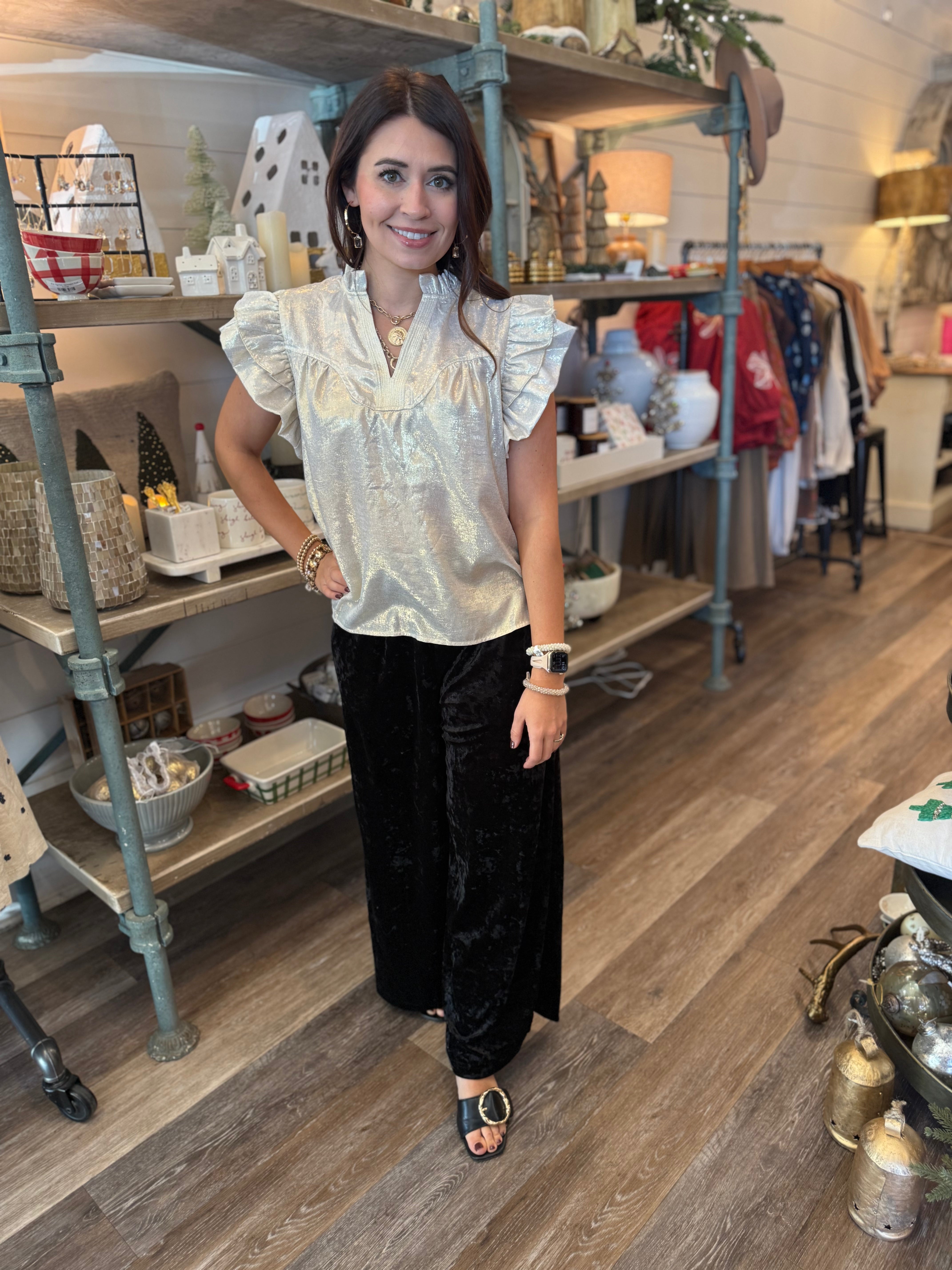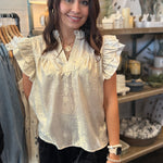 Festive, feminine, and perfect for the holiday season — the Julianna Metallic Flutter Sleeve Top brings shimmer and soft movement to any outfit. Designed with a delicate ruffle neckline and playful flutter short sleeves, this top catches the light beautifully with its subtle metallic finish.