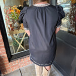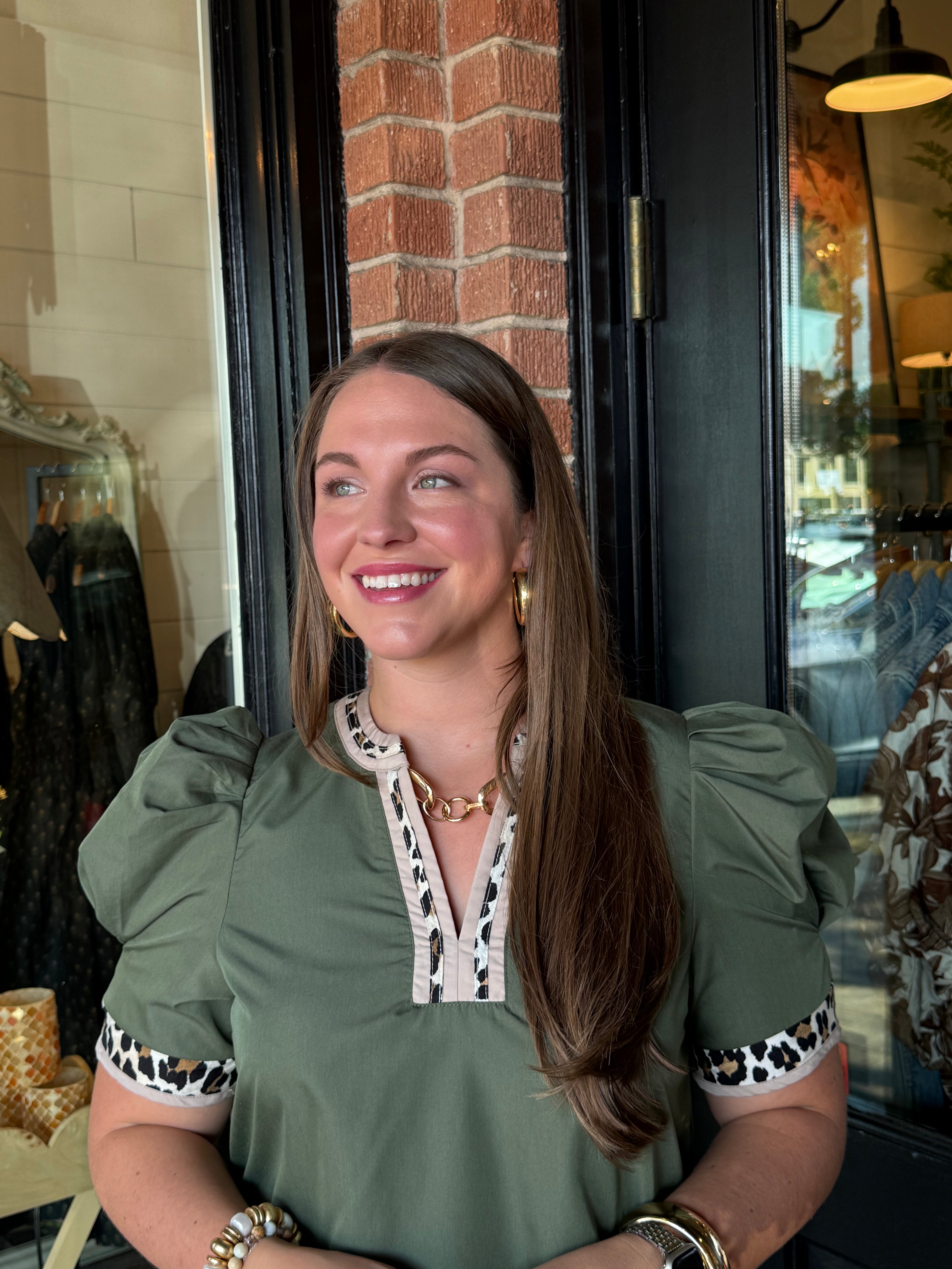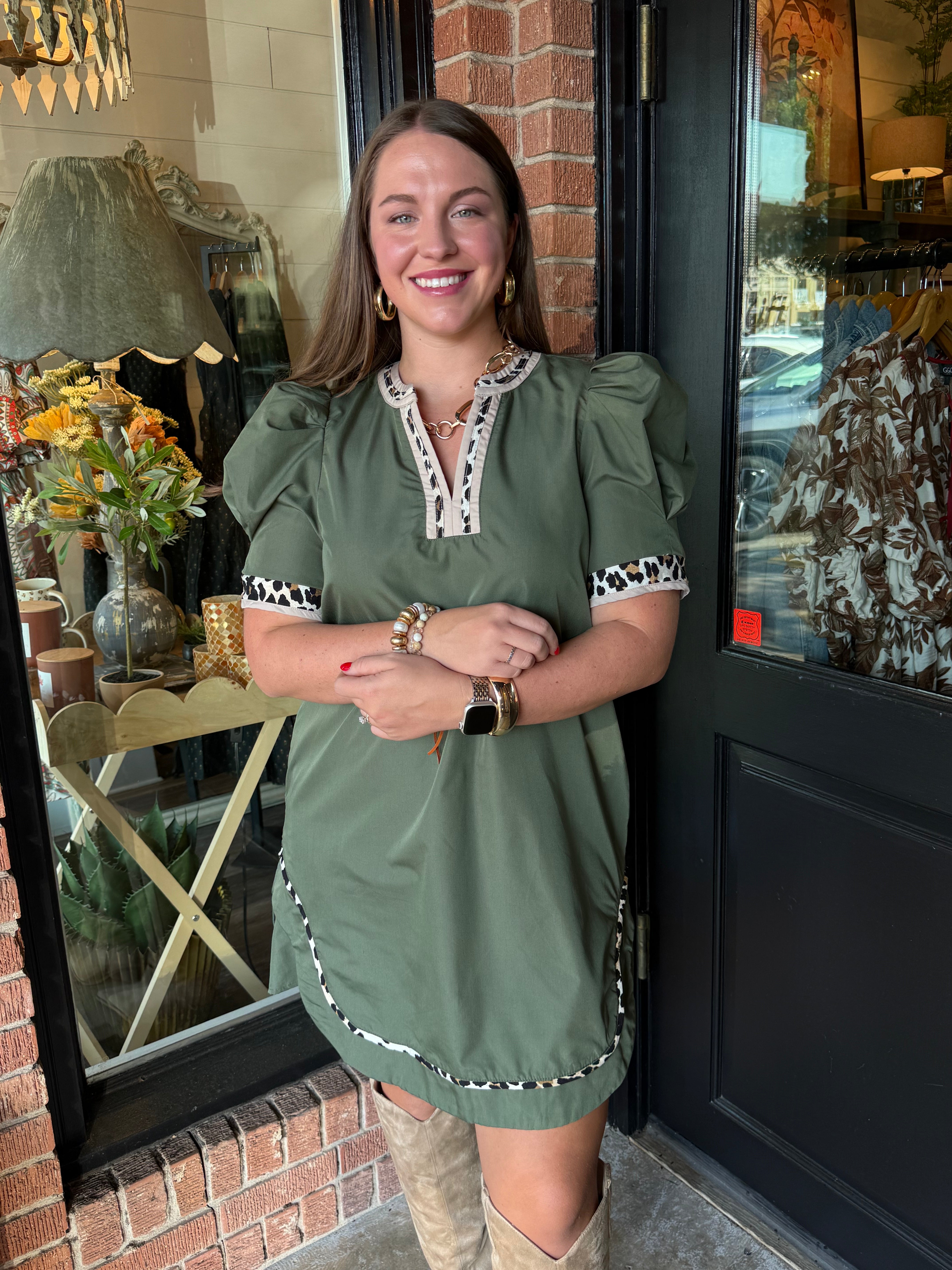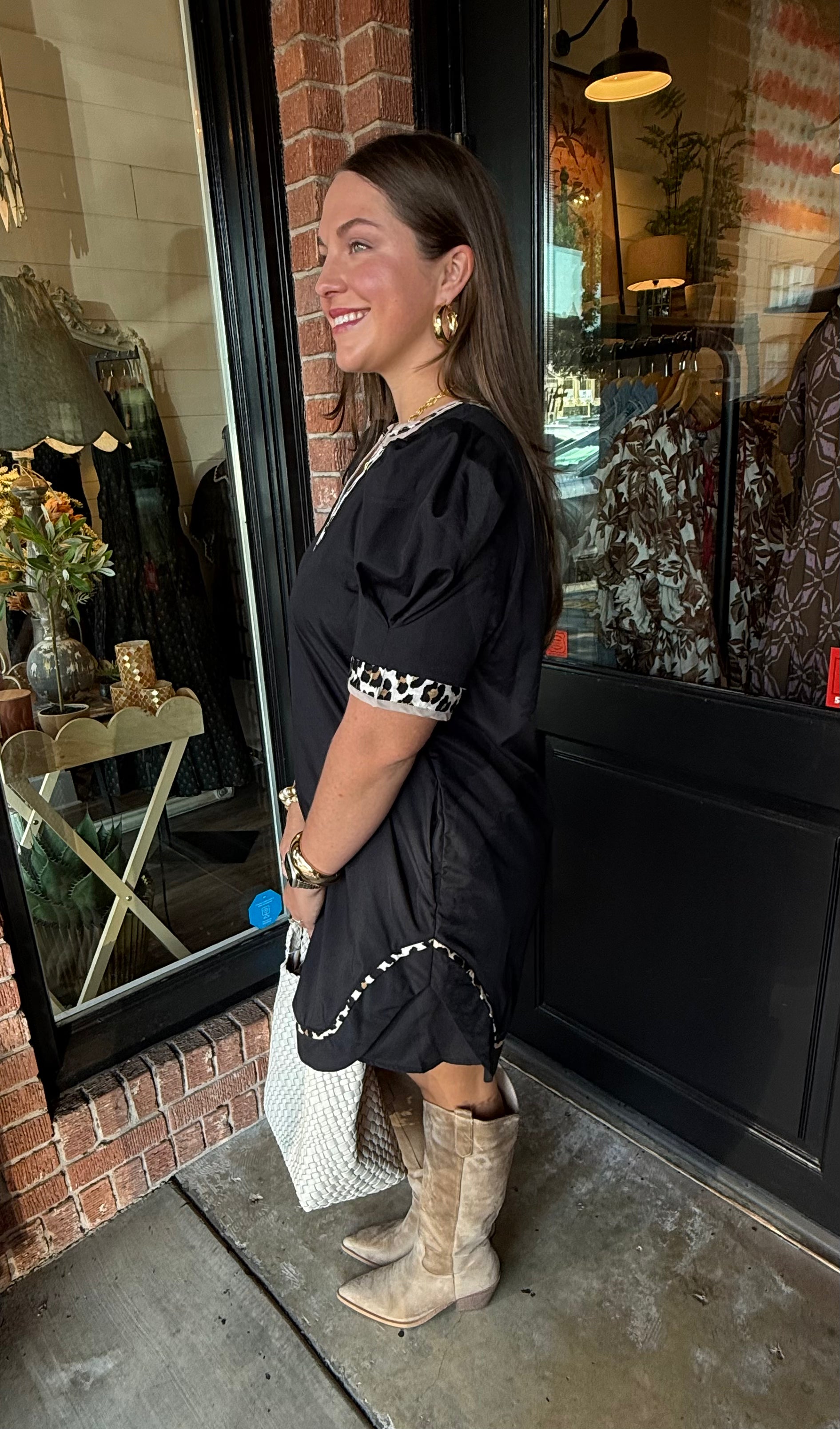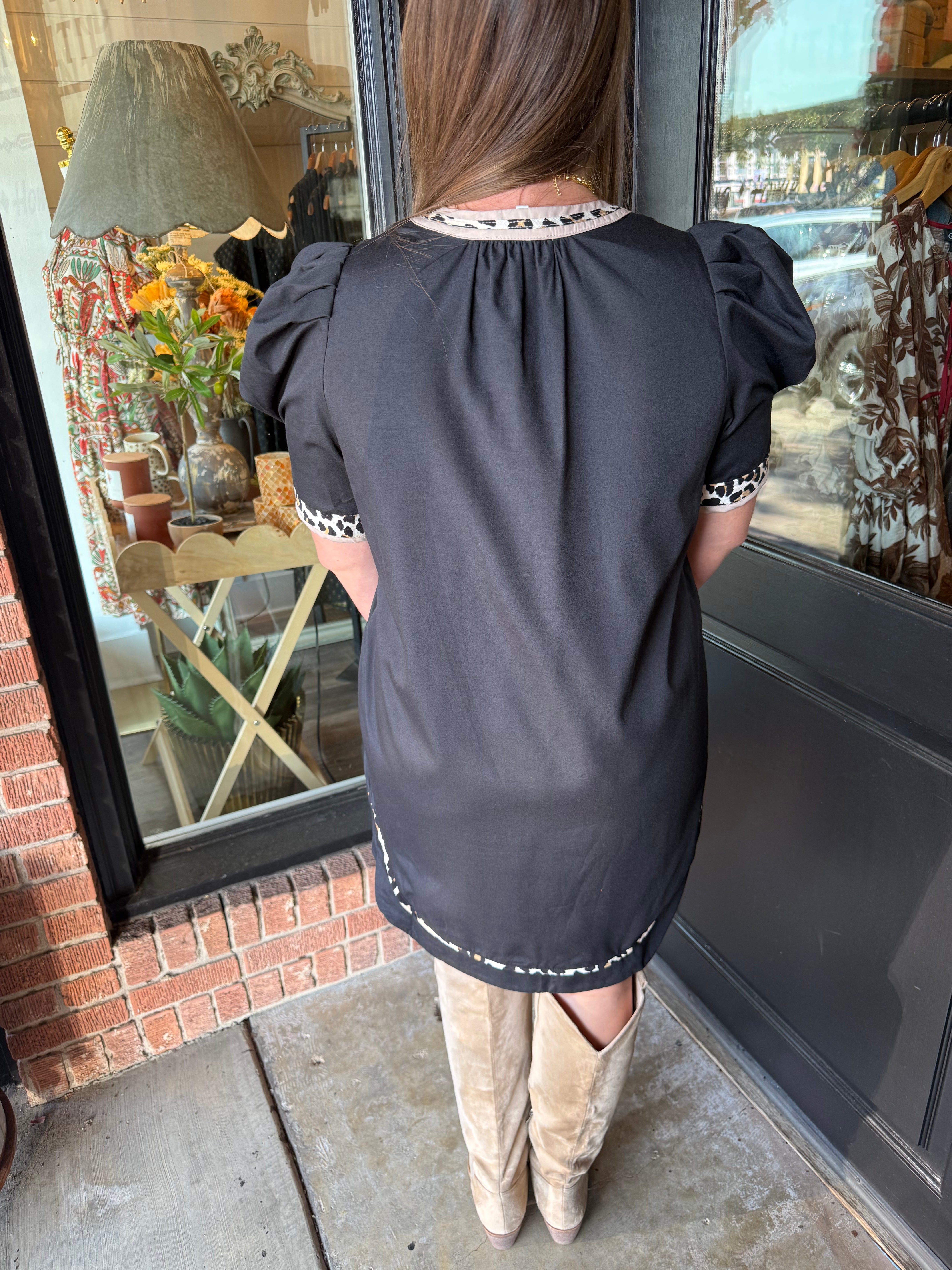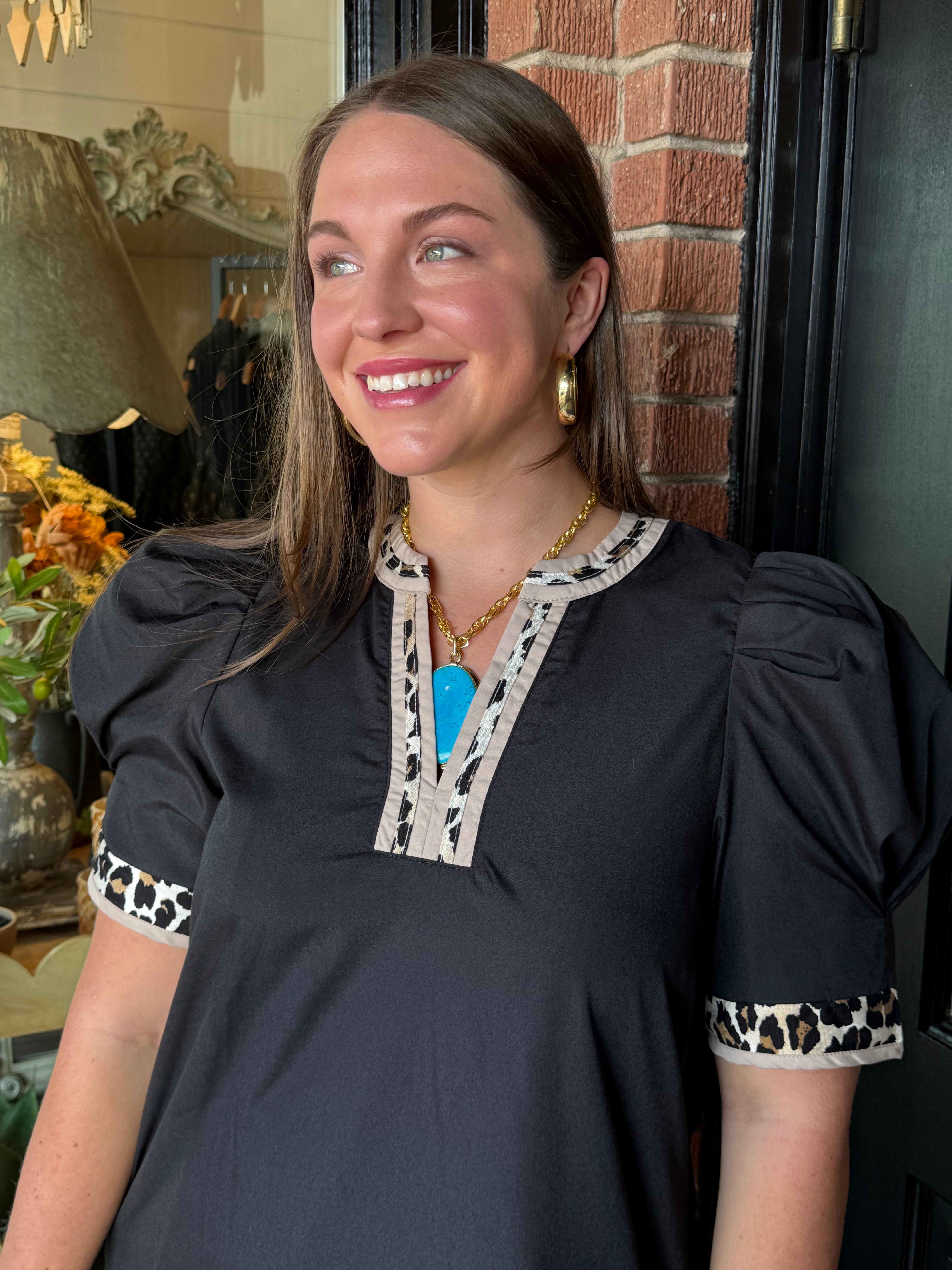 The Kammie Leopard Trim Dress is a chic everyday piece with a touch of bold detail. Designed with leopard print accents along the neckline, sleeves, and hem, this dress blends classic style with a modern edge. Crafted from a soft polyester-cotton blend, it’s comfortable, breathable, and versatile enough to dress up with heels or keep casual with boots or flats.