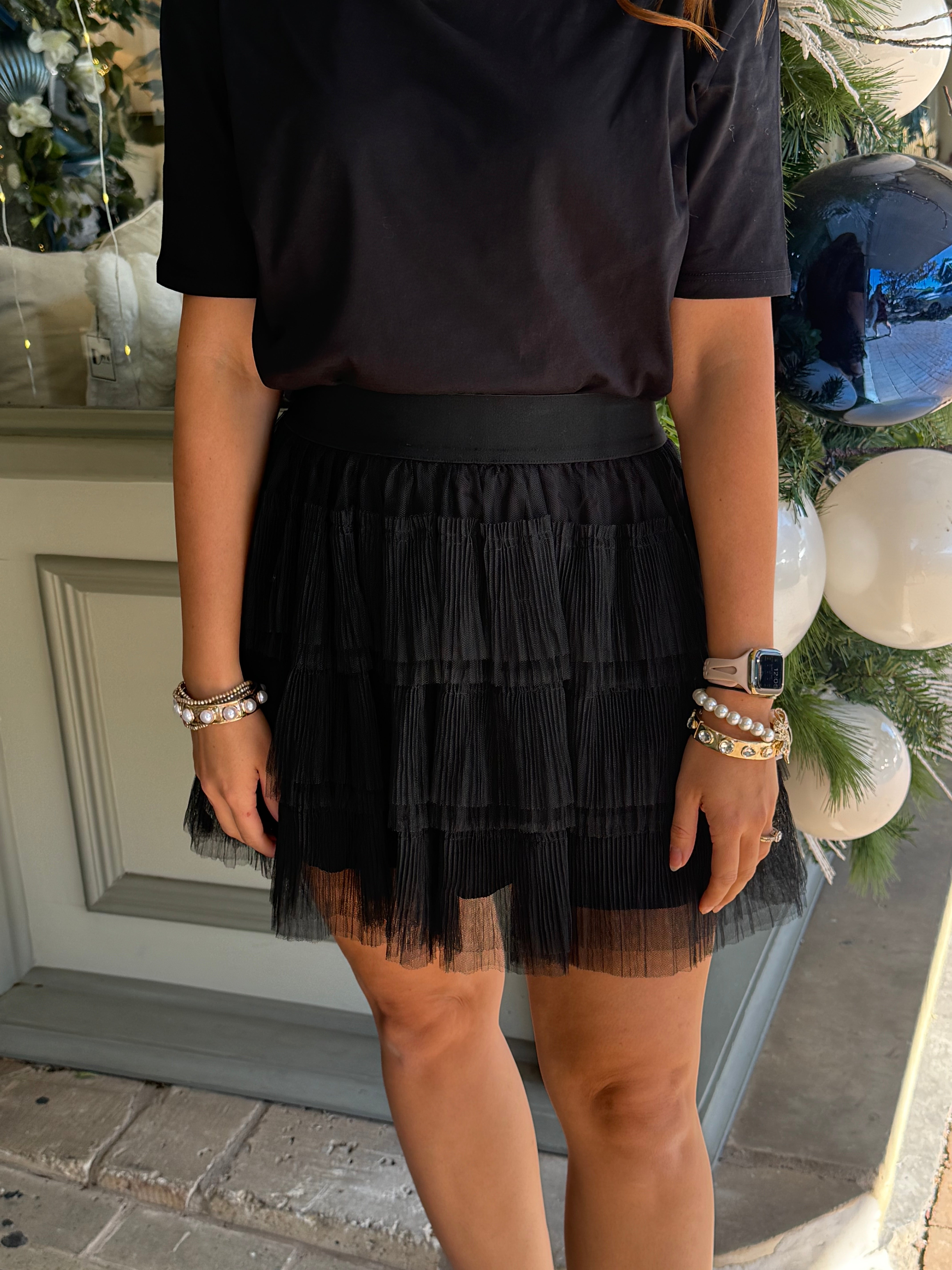 Feminine, flirty, and full of texture — the Katie Black Mini Skirt is the perfect statement piece for any occasion. Featuring a soft tulle overlay, tiered layers, and a comfortable elastic waistband, this skirt moves beautifully and styles effortlessly with everything from cozy sweaters to chic blouses.