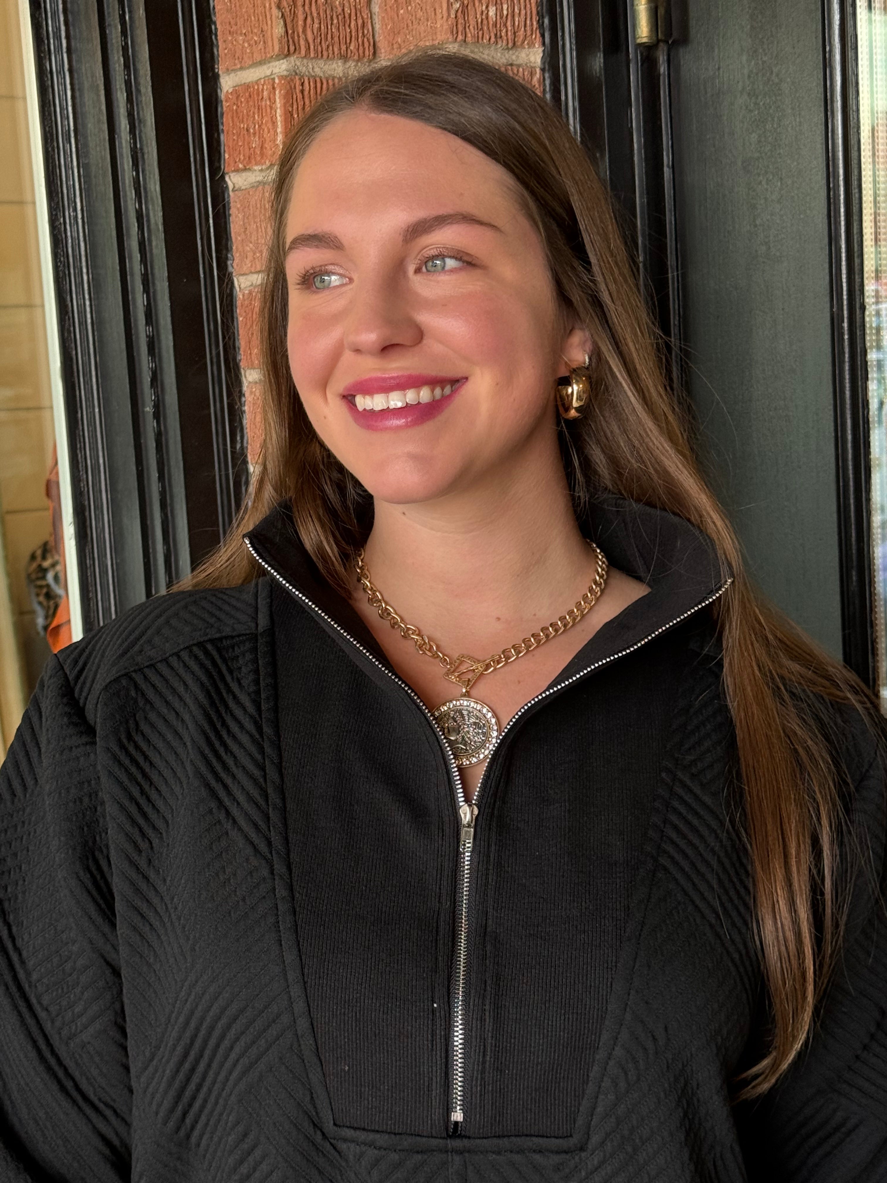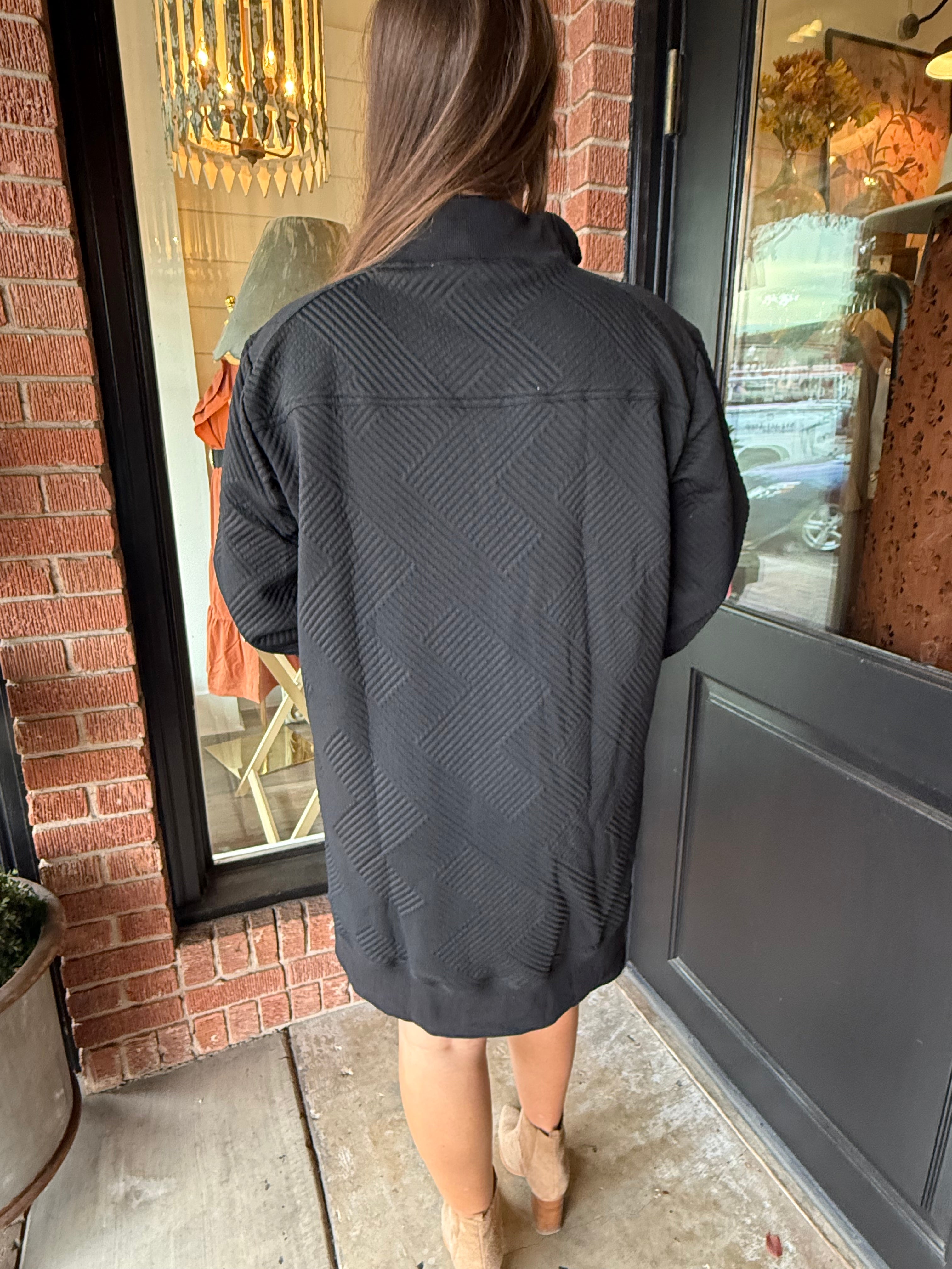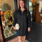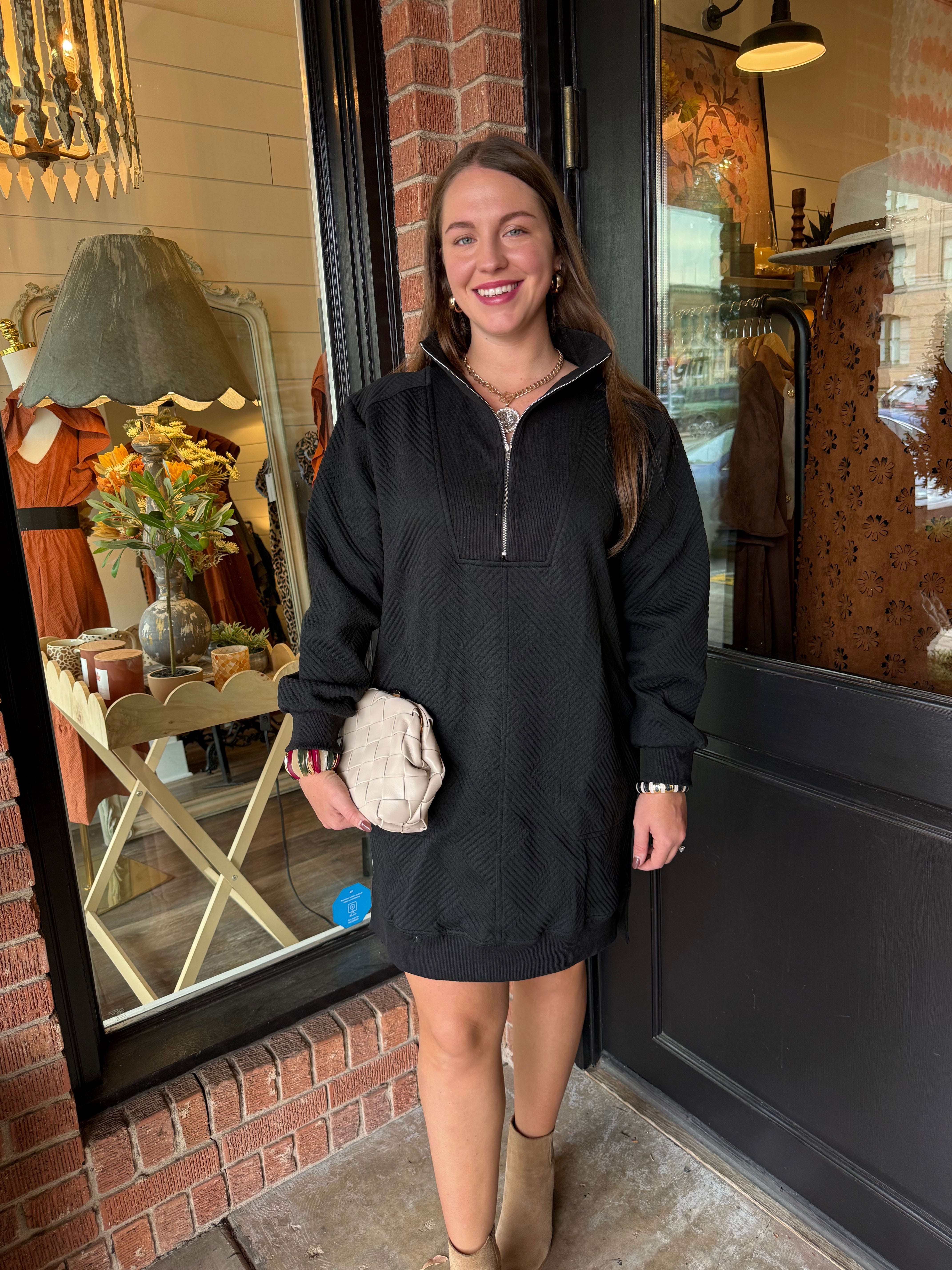 Where comfort meets style — the Kaye Black Sweatshirt Dress is the perfect blend of cozy and chic. Crafted from a soft, textured heavy knit, this dress features a half-zip neckline, long sleeves, and practical side pockets. Its relaxed silhouette makes it an easy choice for everyday wear while still looking polished and put together.