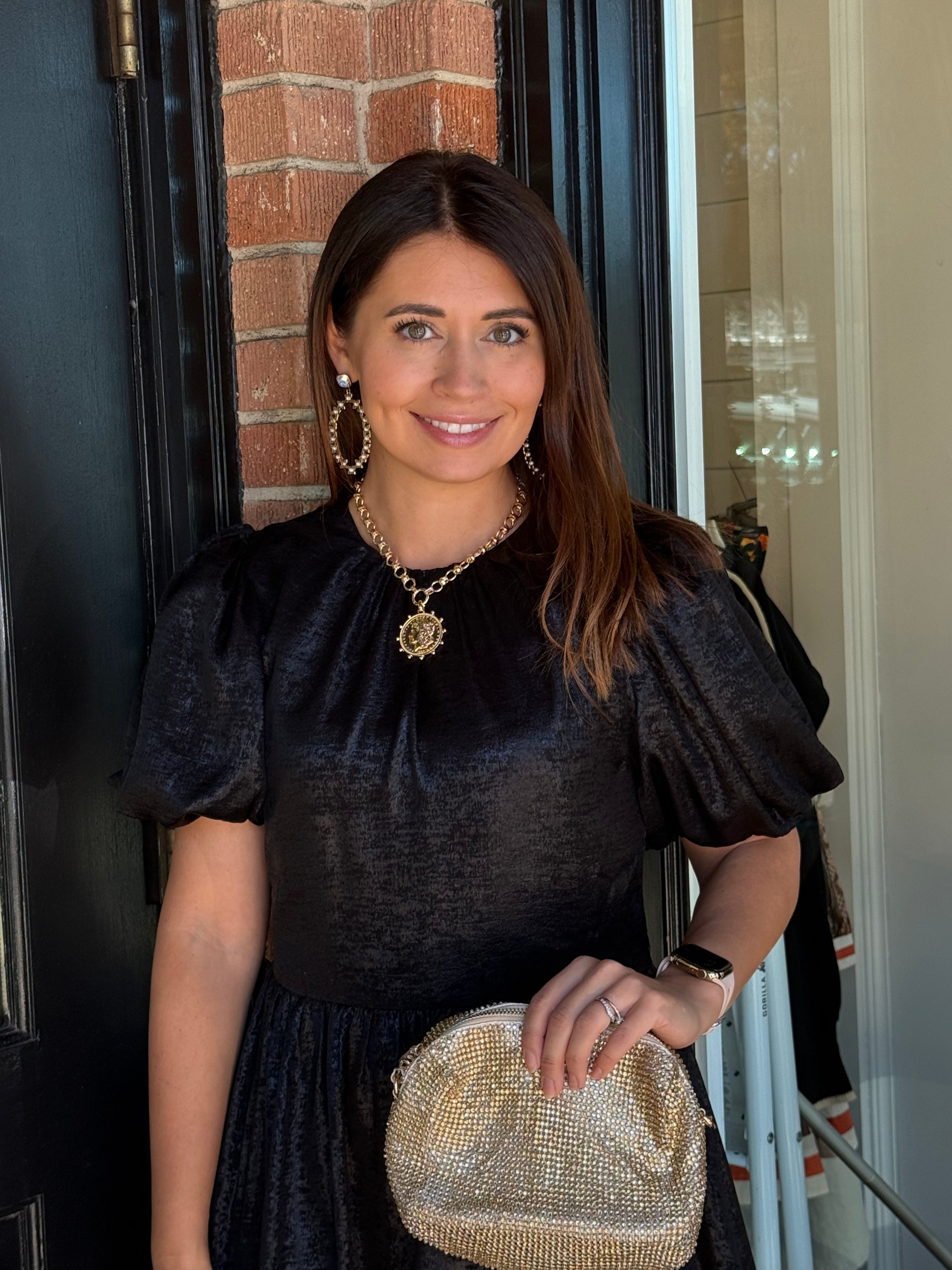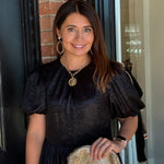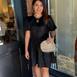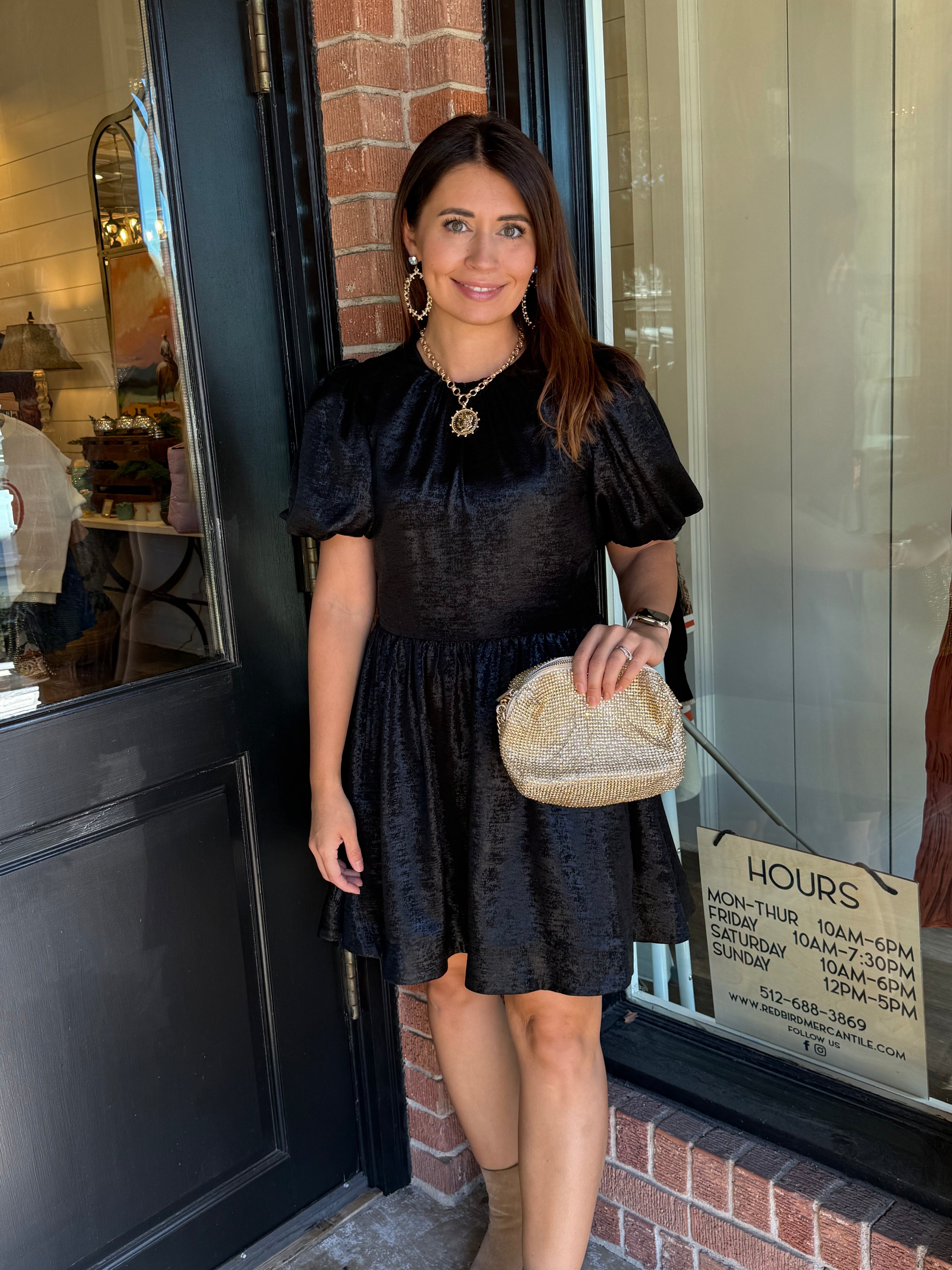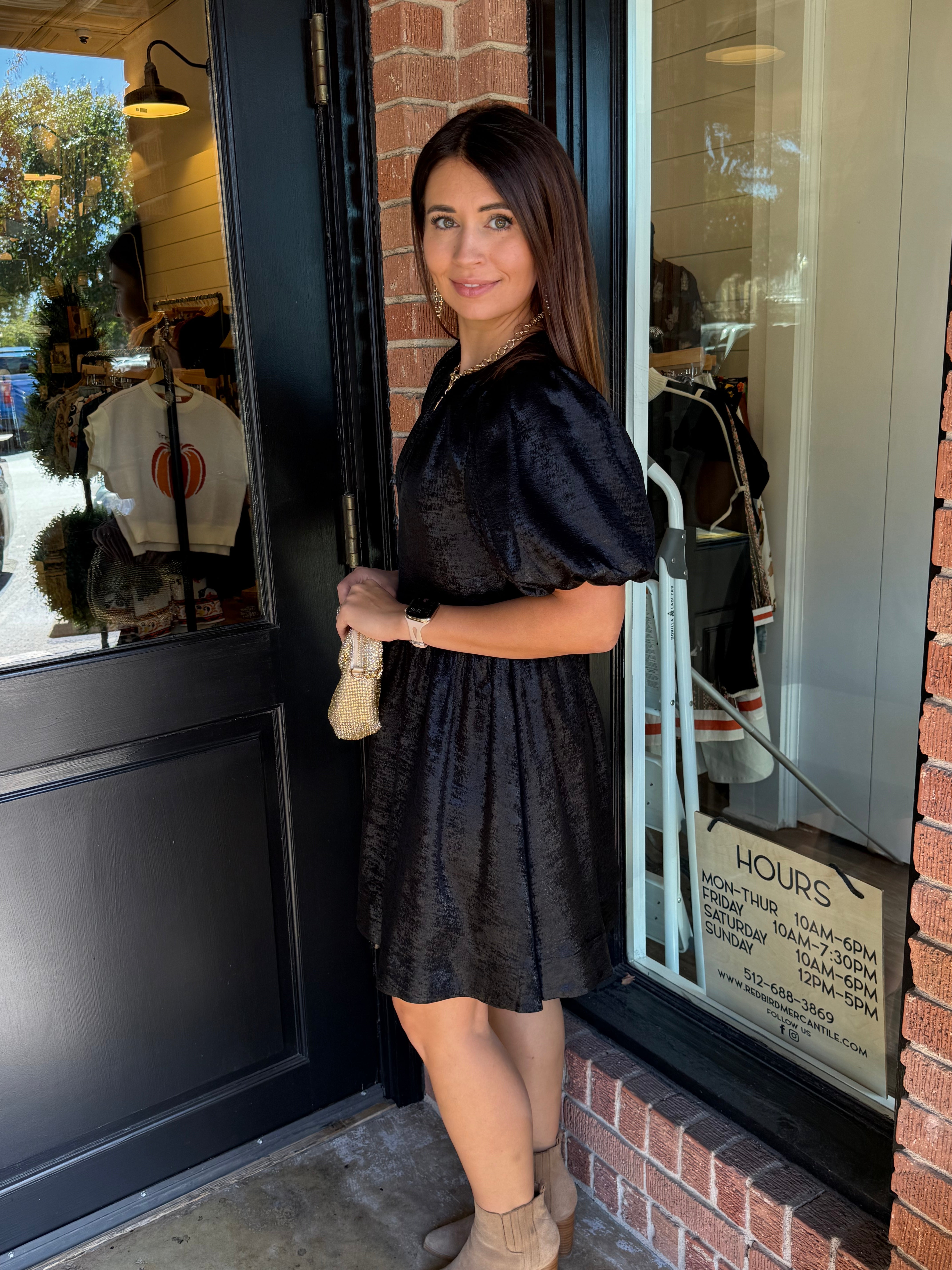 The Kelli Black Mini Dress is a chic staple that belongs in every wardrobe. Featuring feminine puff sleeves and a classic silhouette, this dress is designed to flatter while keeping things effortlessly elegant. Perfect for date nights, parties, or holiday gatherings.