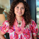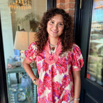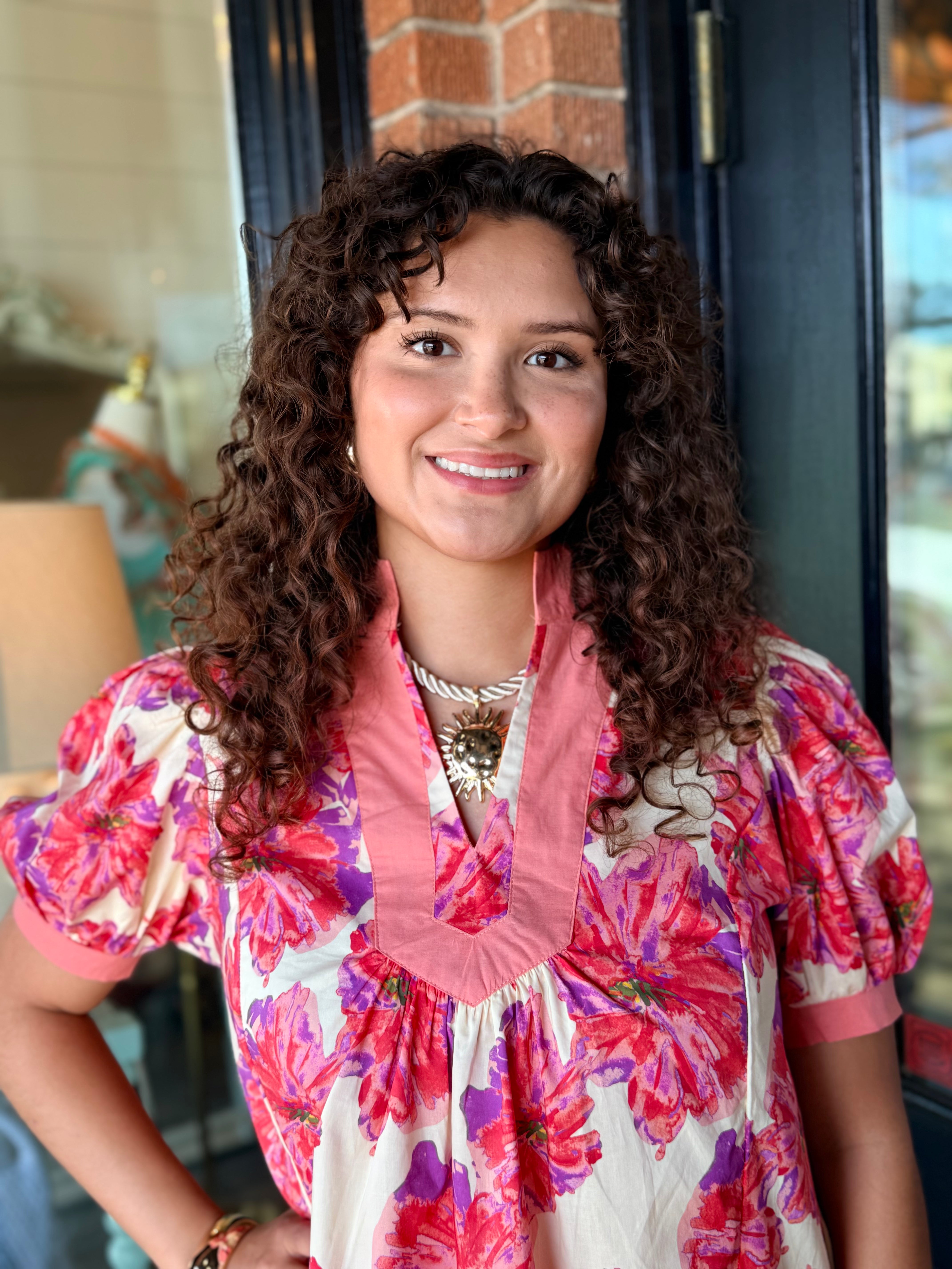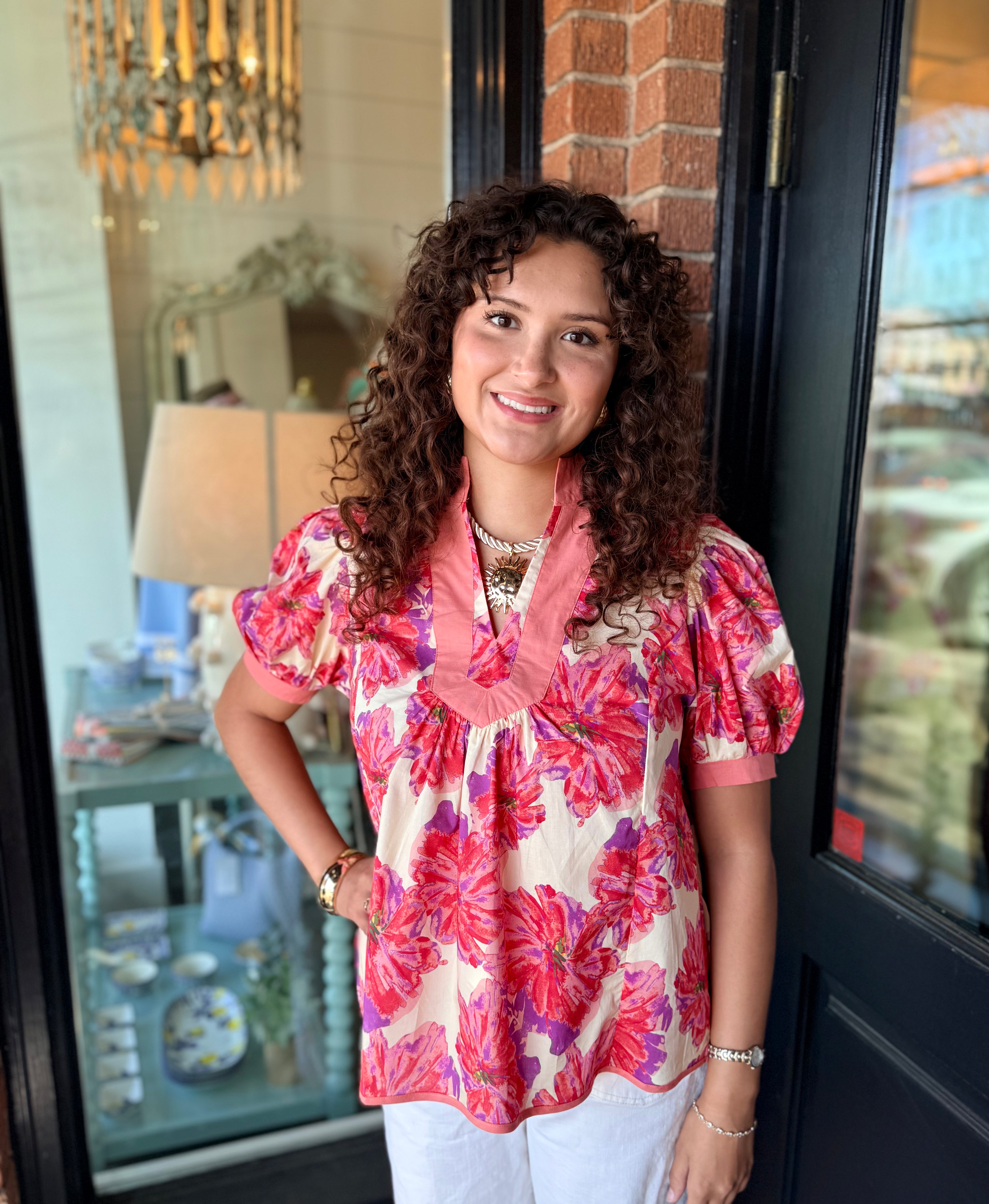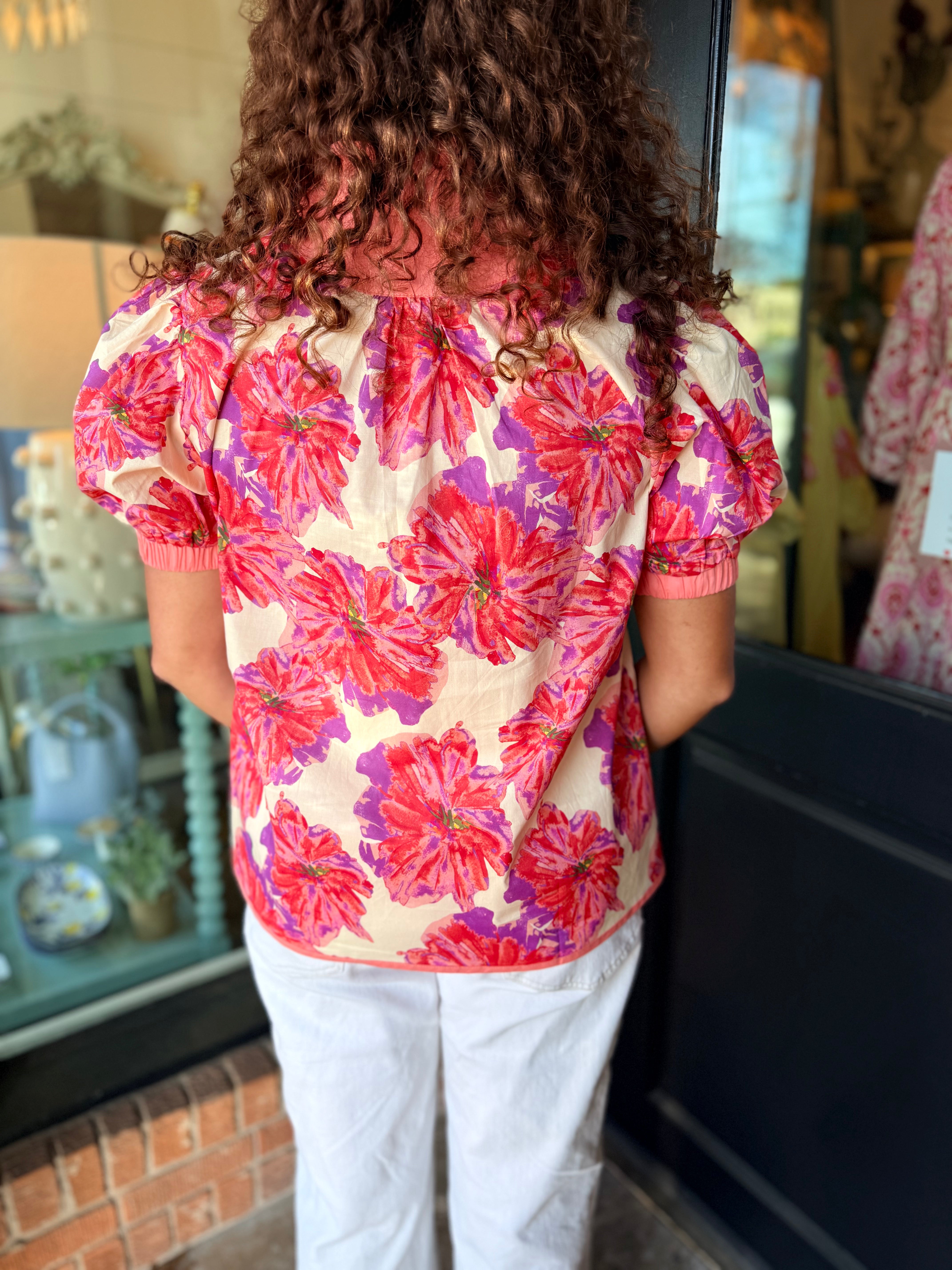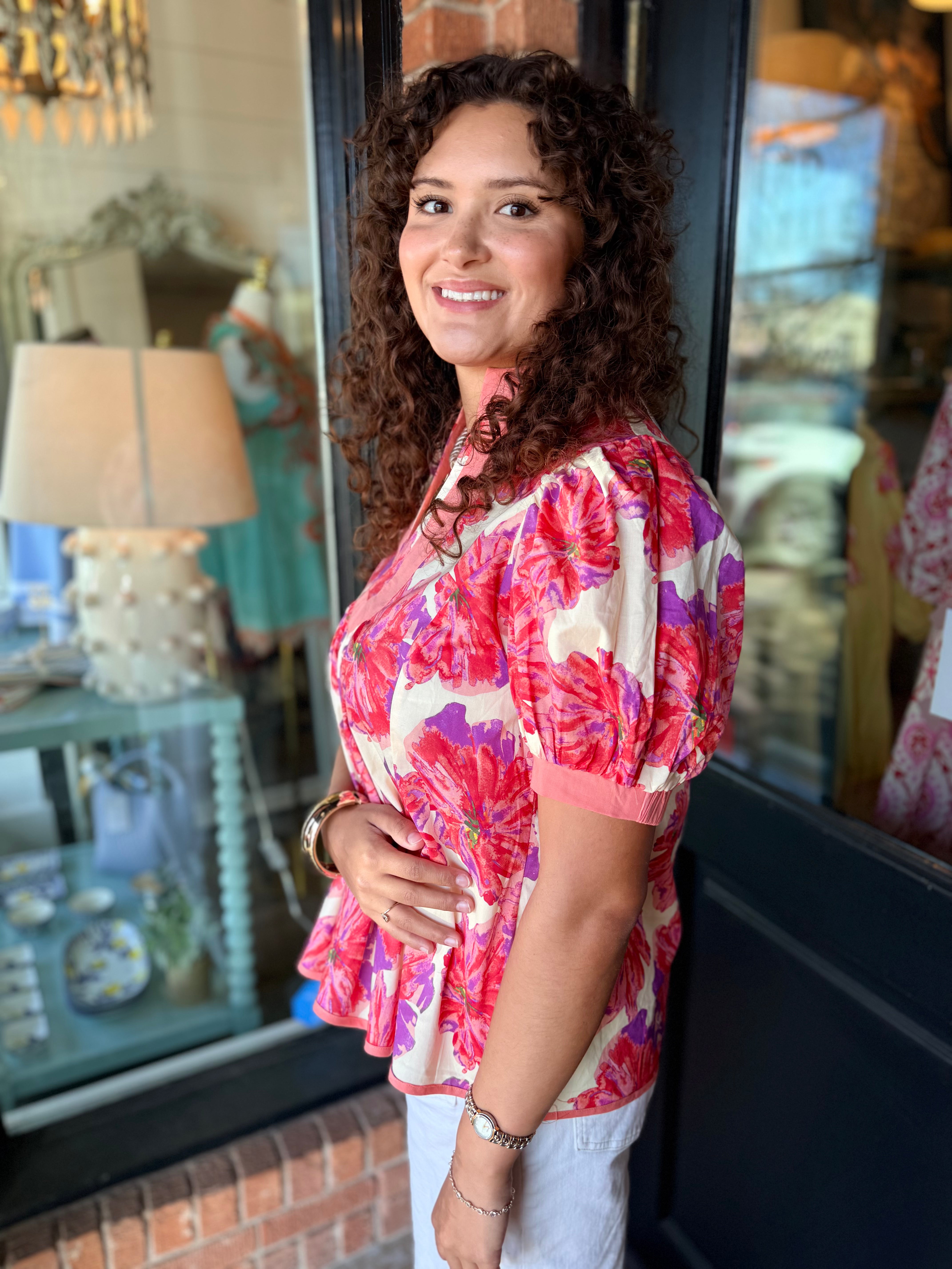 A fresh floral top with a bold, feminine touch. The Kendall Floral Top features a beautiful floral print, a wide contrast neckline, and soft puff sleeves with cuffed edges for a polished look. Easy to pair with denim or white jeans for everyday style.