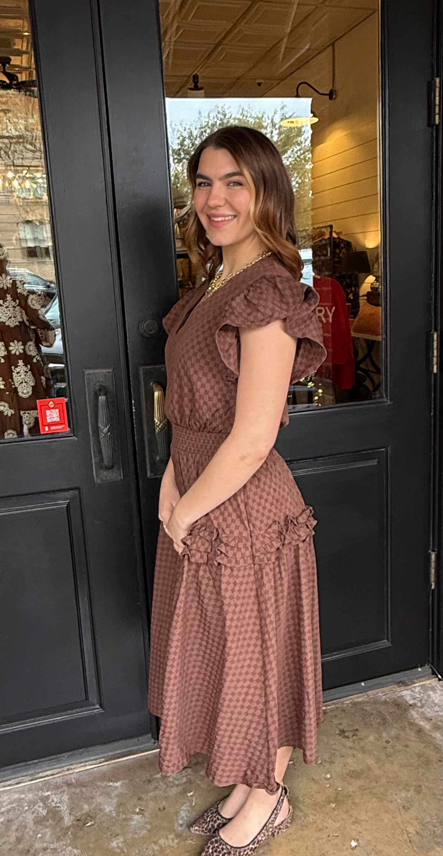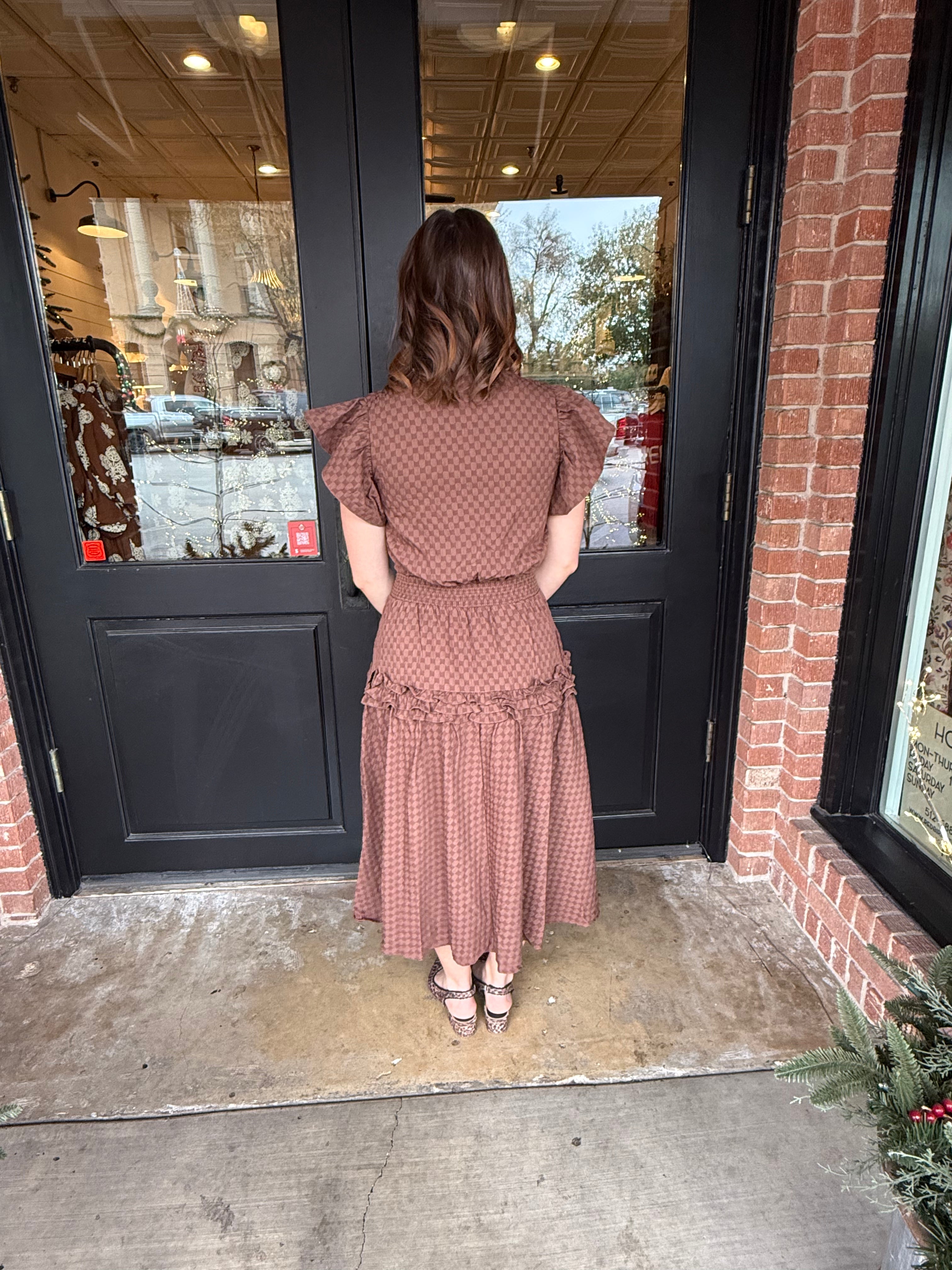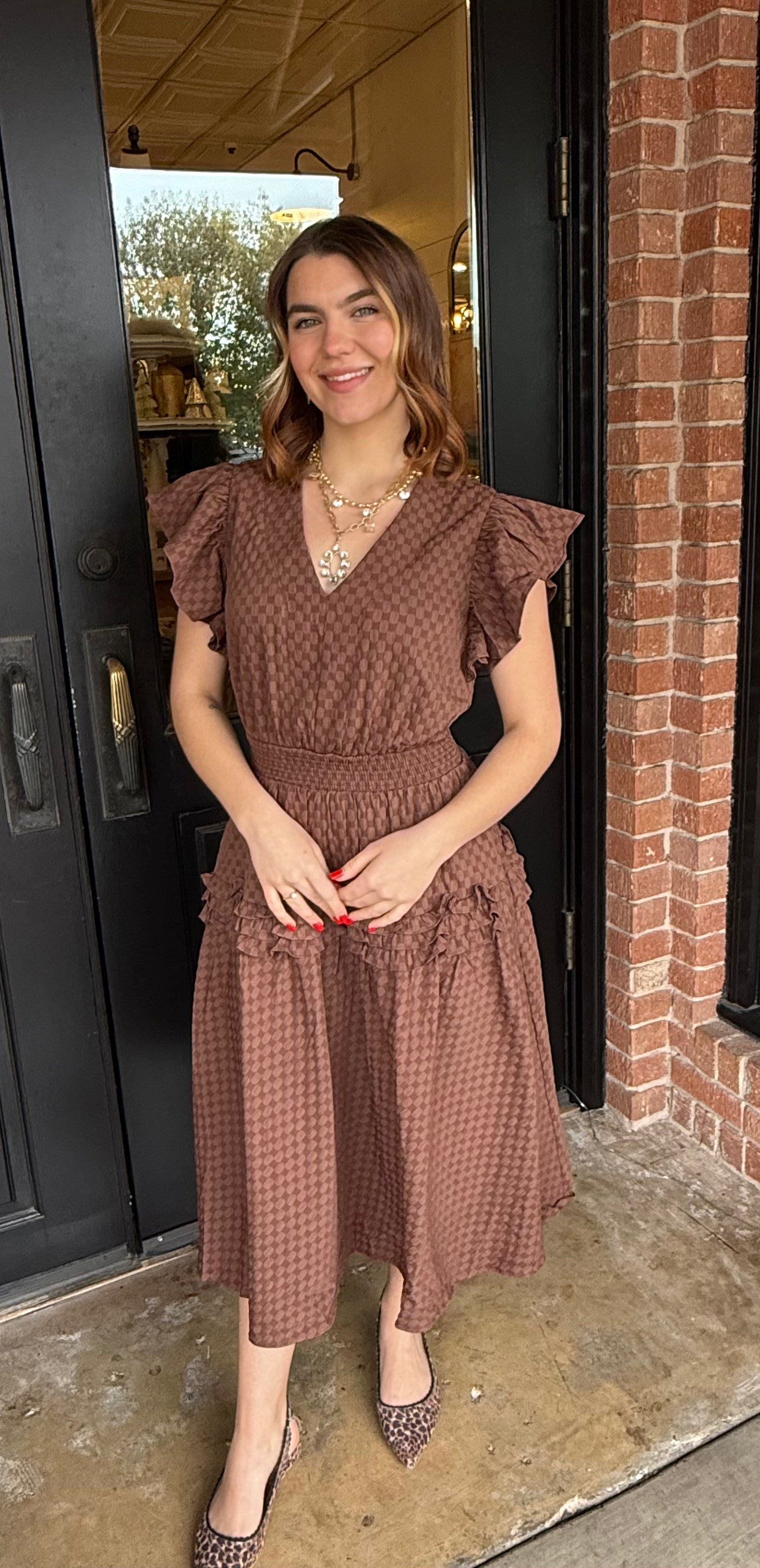 The Kenna is a beautifully detailed midi dress crafted in a soft checkered-texture woven fabric. This feminine silhouette features a classic V-neckline, flutter ruffle short sleeves, a smocked cinched waist for a flattering fit, and an A-line midi skirt finished with ruffle detailing. Side pockets and full lining make it as practical as it is pretty.