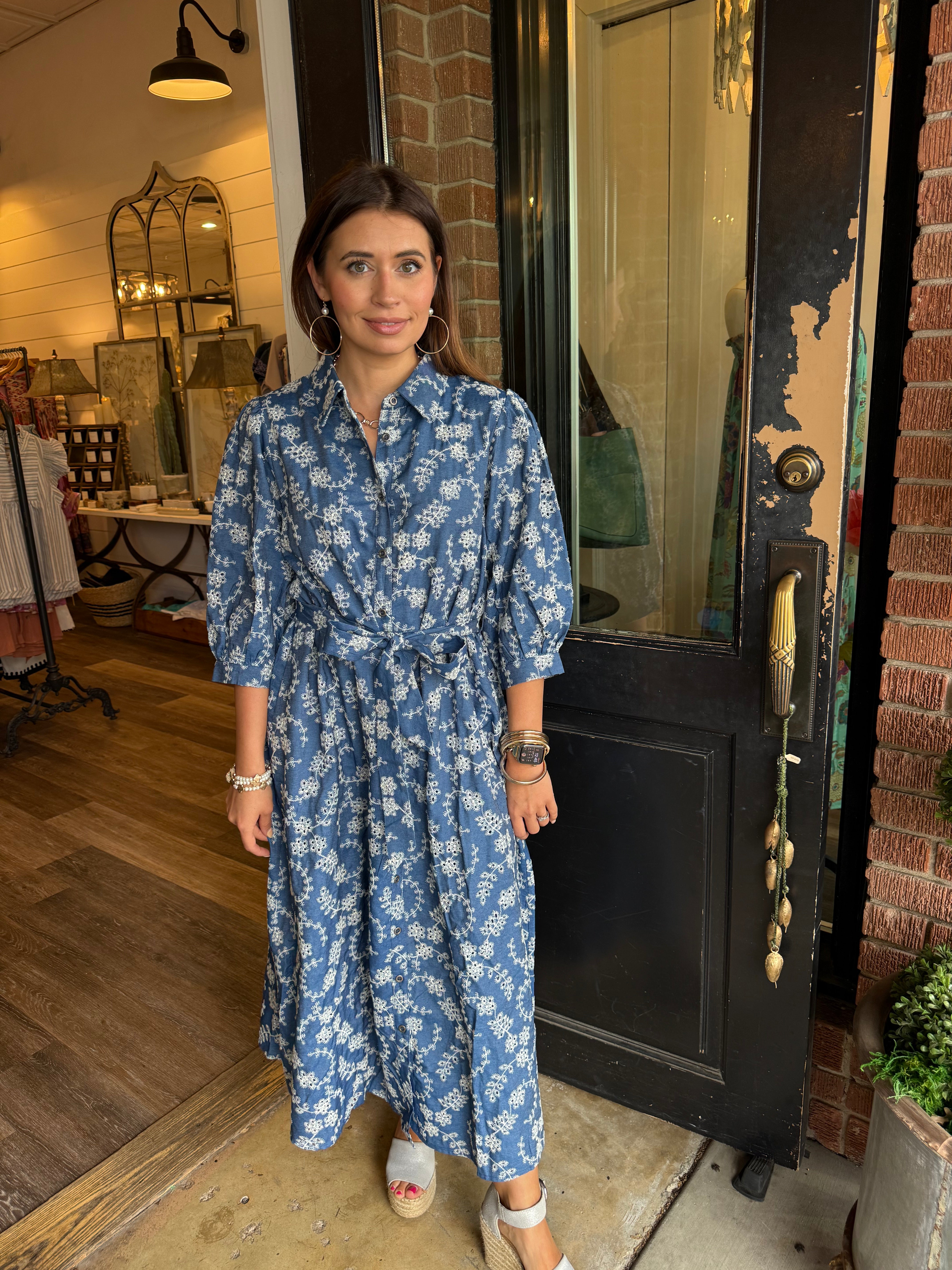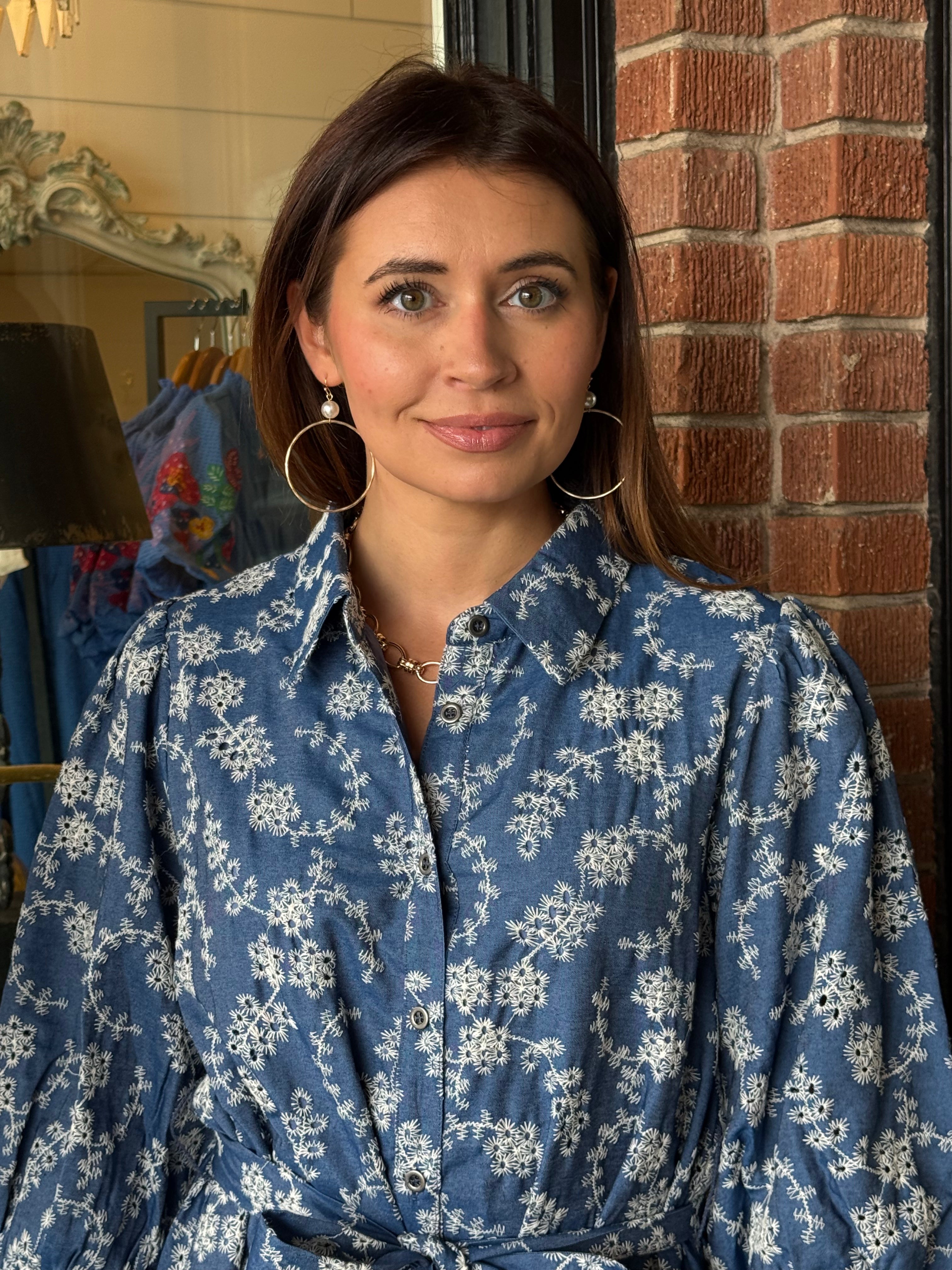 Timeless and effortlessly chic, the Kennedy Denim Midi Dress is a must-have for any wardrobe. Featuring a classic collared neckline and front buttoned closure, this dress exudes sophistication with a touch of casual charm. The belted waistline creates a flattering silhouette, while the three-quarter peasant sleeves with buttoned cuffs add a feminine, vintage-inspired feel. Side pockets offer functionality, and delicate embroidered detailing enhances the overall design. Perfect for day-to-night styling—just pair it with boots or heels for an effortlessly polished look!