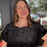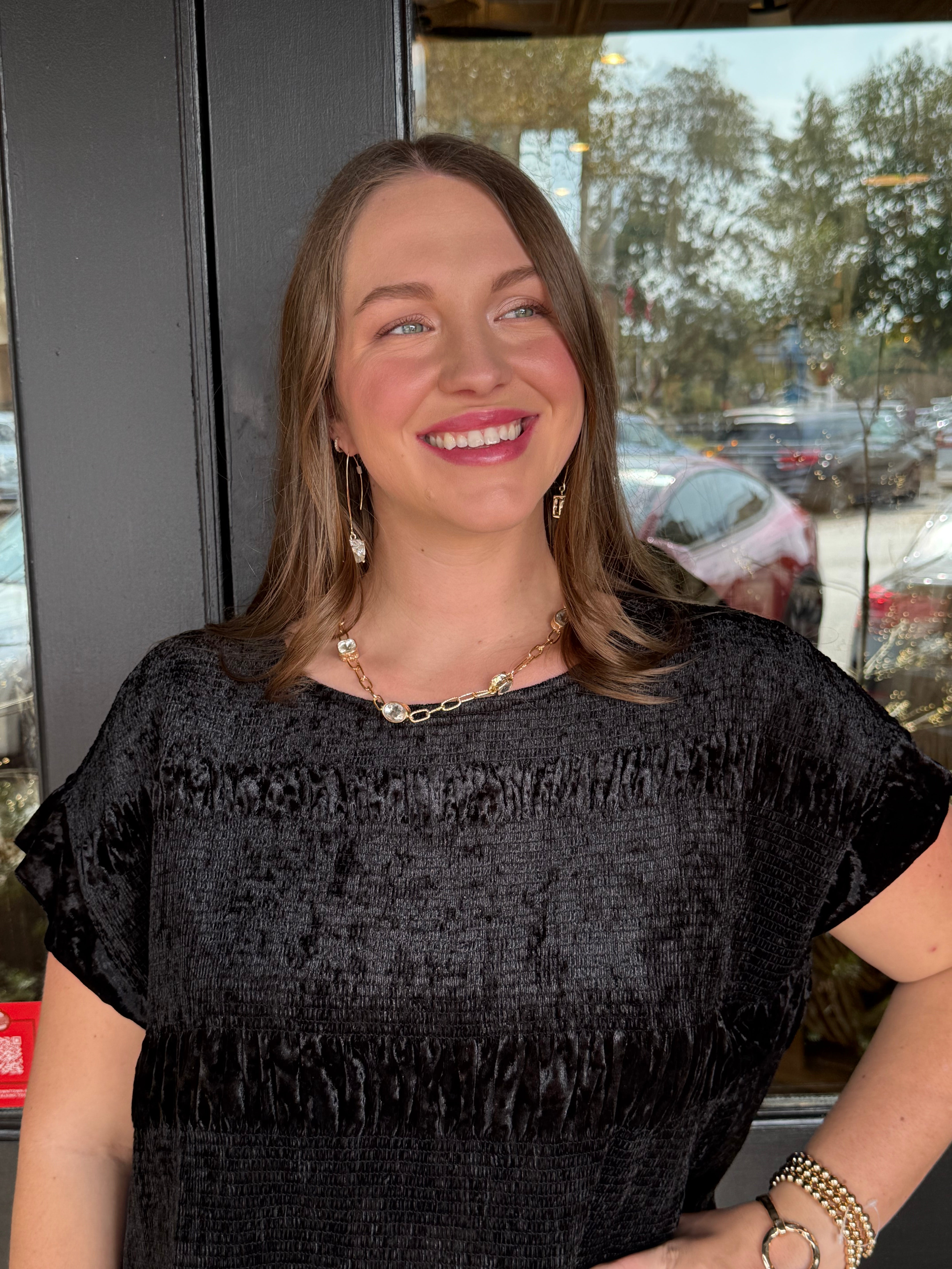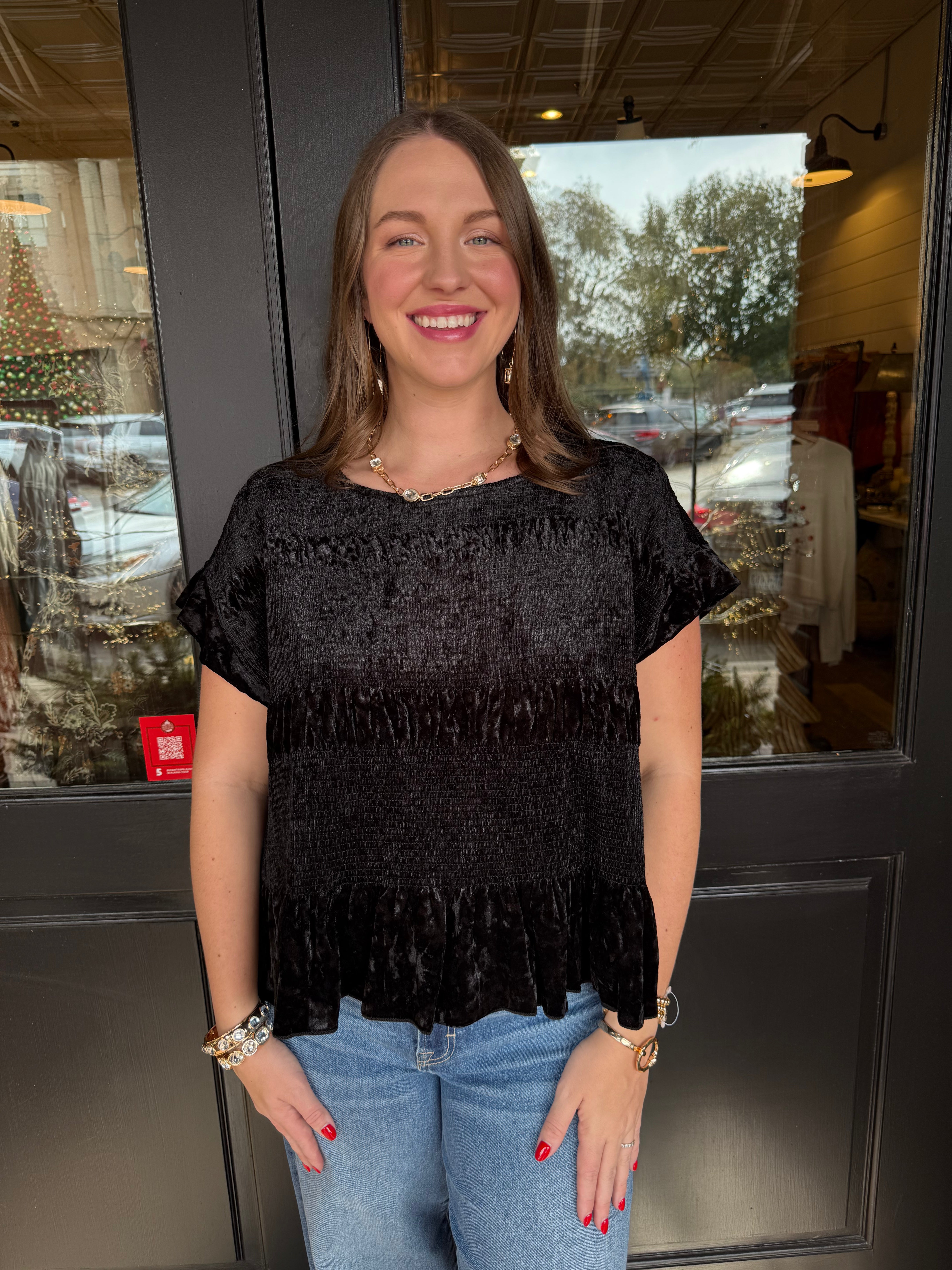 Soft, luxe, and so flattering—the Kim Velvet Smocked Top is the perfect blend of comfort and holiday-ready shine. The tiered smocked body creates a flattering silhouette, while the ruffle hem and cap sleeves add a sweet, feminine finish.