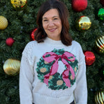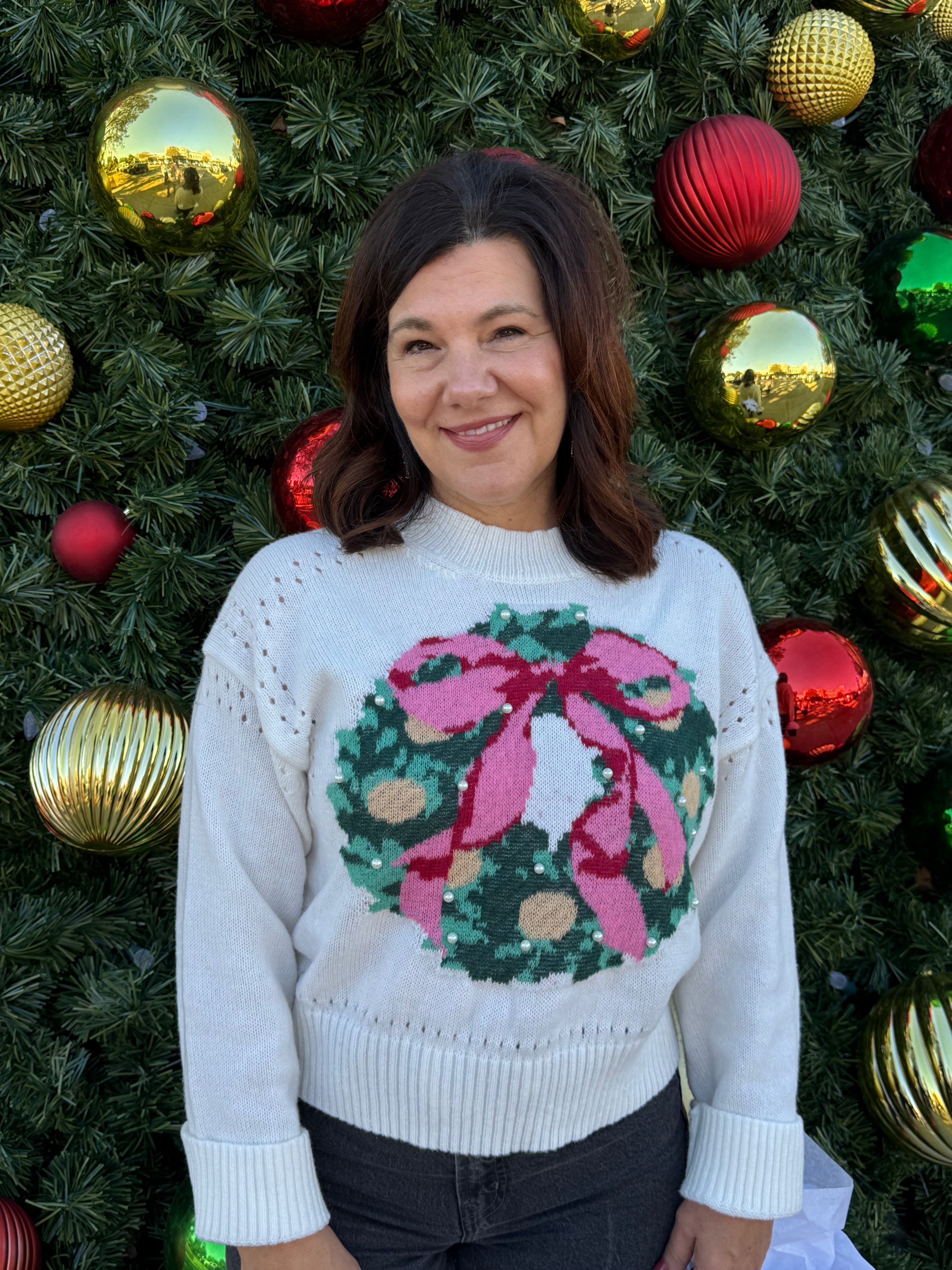 Festive, feminine, and full of holiday cheer — the Krista Christmas Wreath Sweater is the perfect way to sparkle this season!