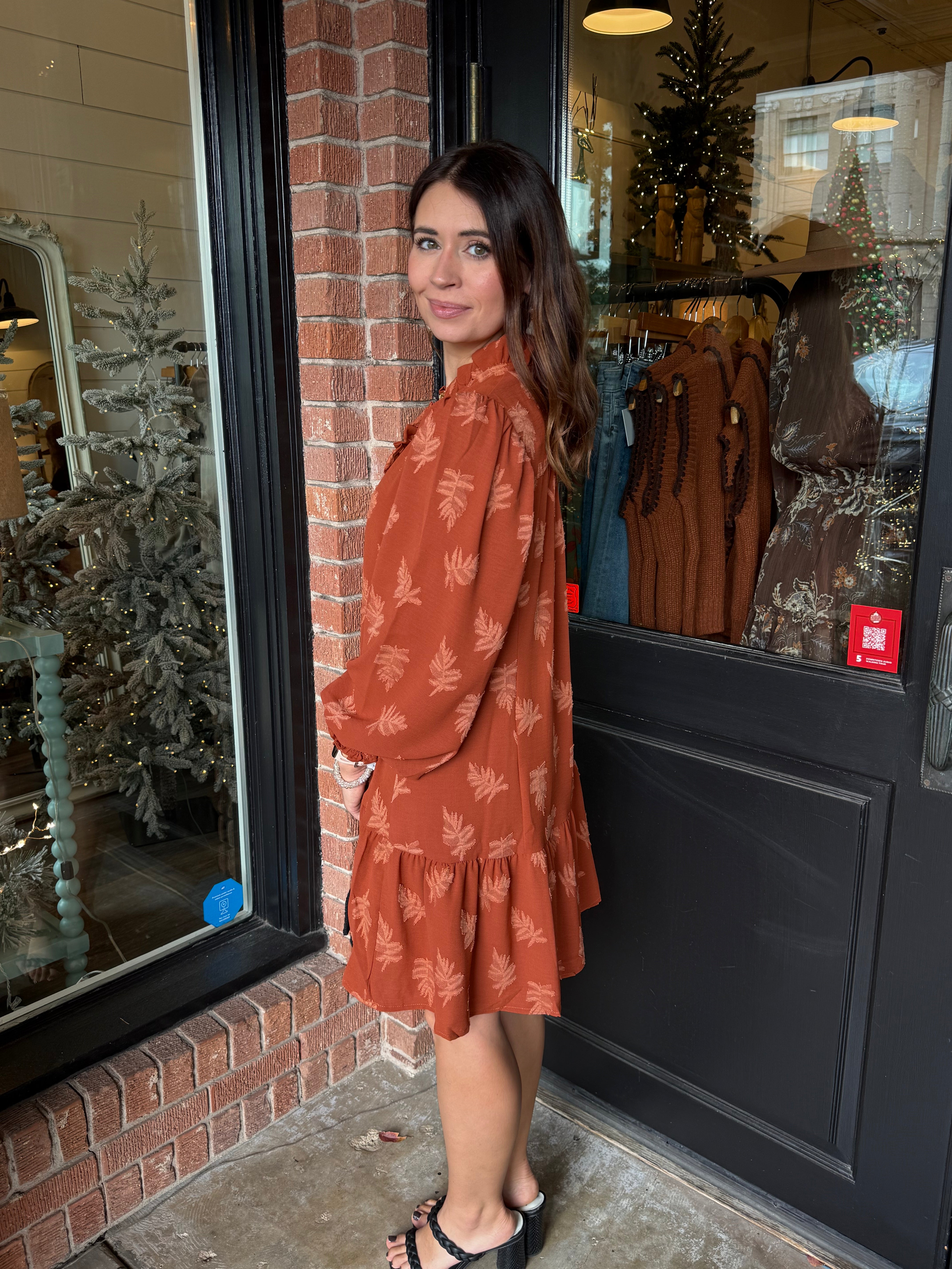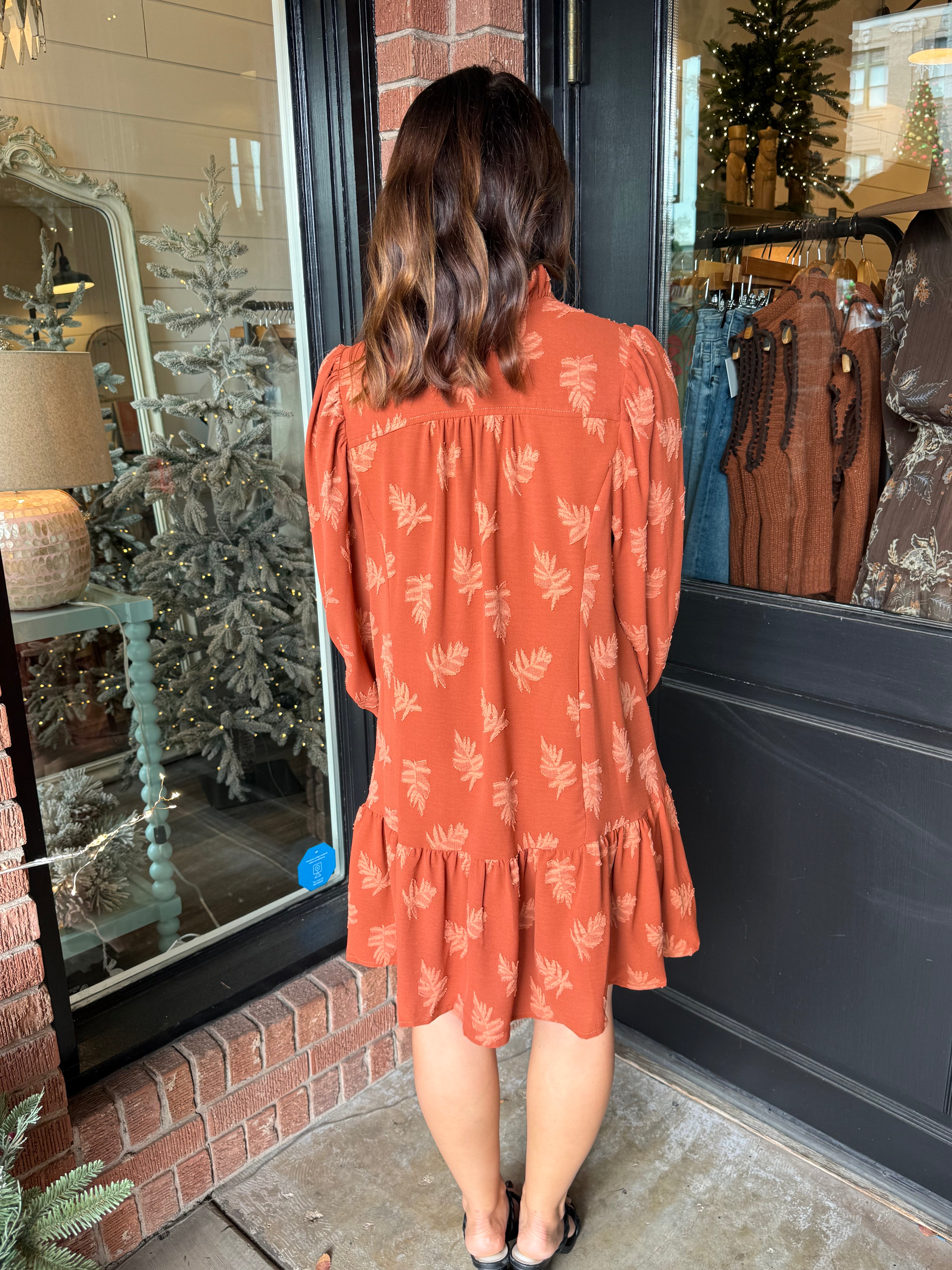 Elegant, effortless, and full of texture—the Kristen Jacquard Floral Dress is a beautiful statement piece with a subtle leaf-patterned jacquard fabric that catches the light just right. The ruffled neckline and tiered hem bring soft movement, while the relaxed shift silhouette keeps the fit comfortable and easy to wear.