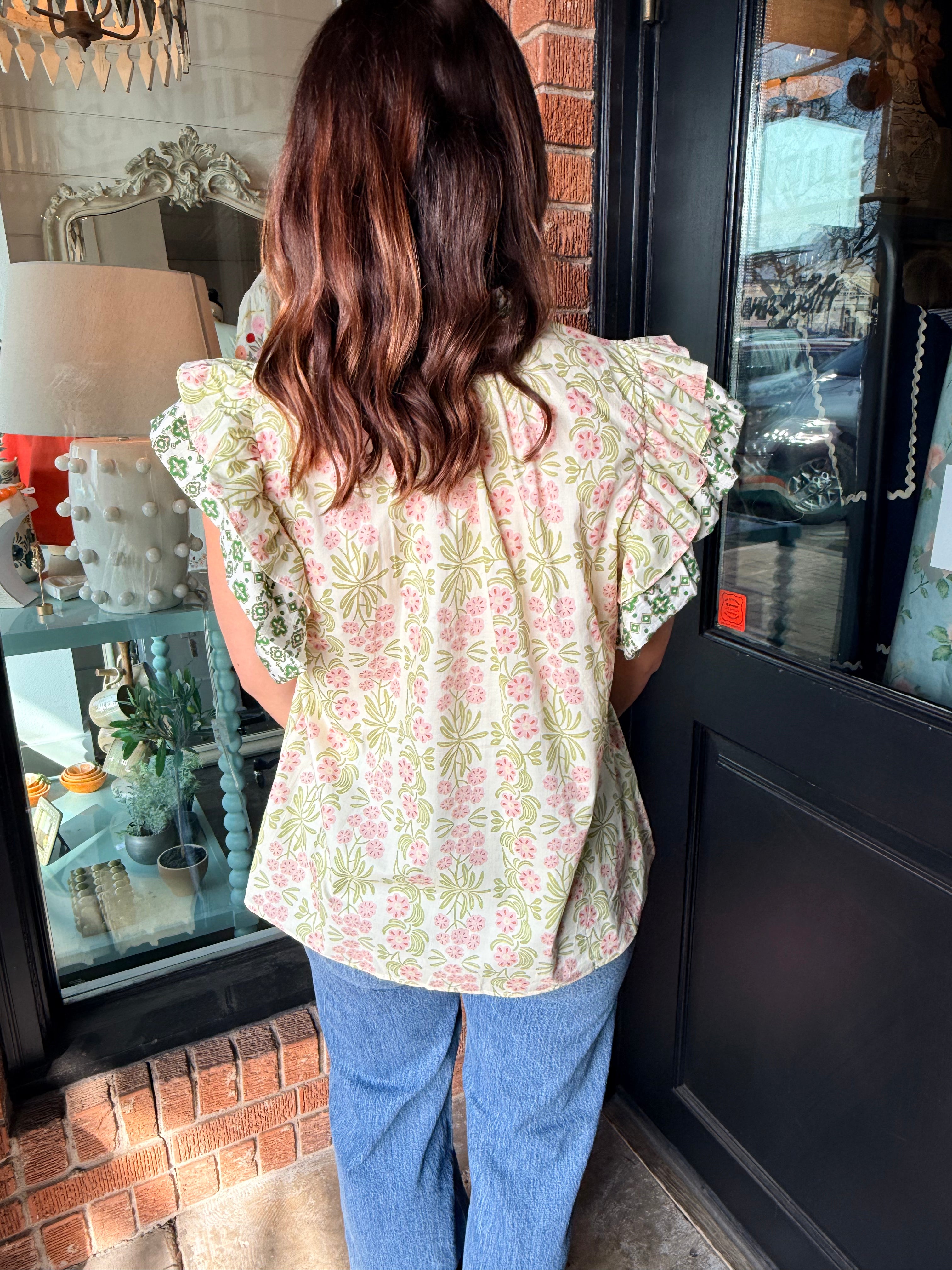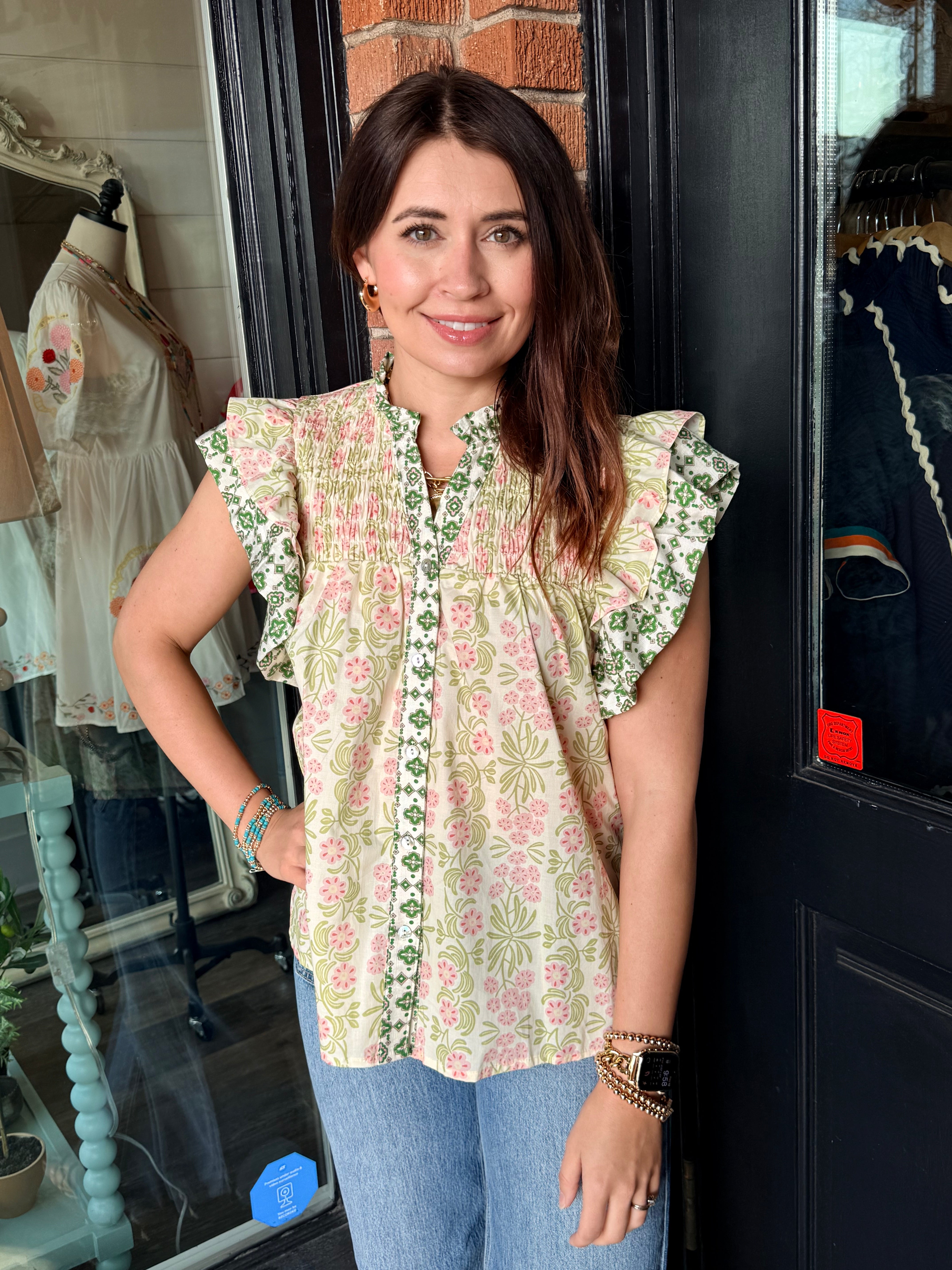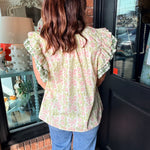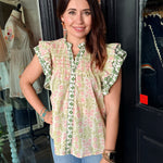 Sweet, feminine, and full of charm — the Laura Pink Floral Top is an easy favorite for everyday wear. Designed with a flattering V-neckline and soft flutter sleeves, this top features delicate ruching along the upper chest for added texture and shape. The full button-down front gives it versatility, making it perfect to wear tucked, untucked, or layered.