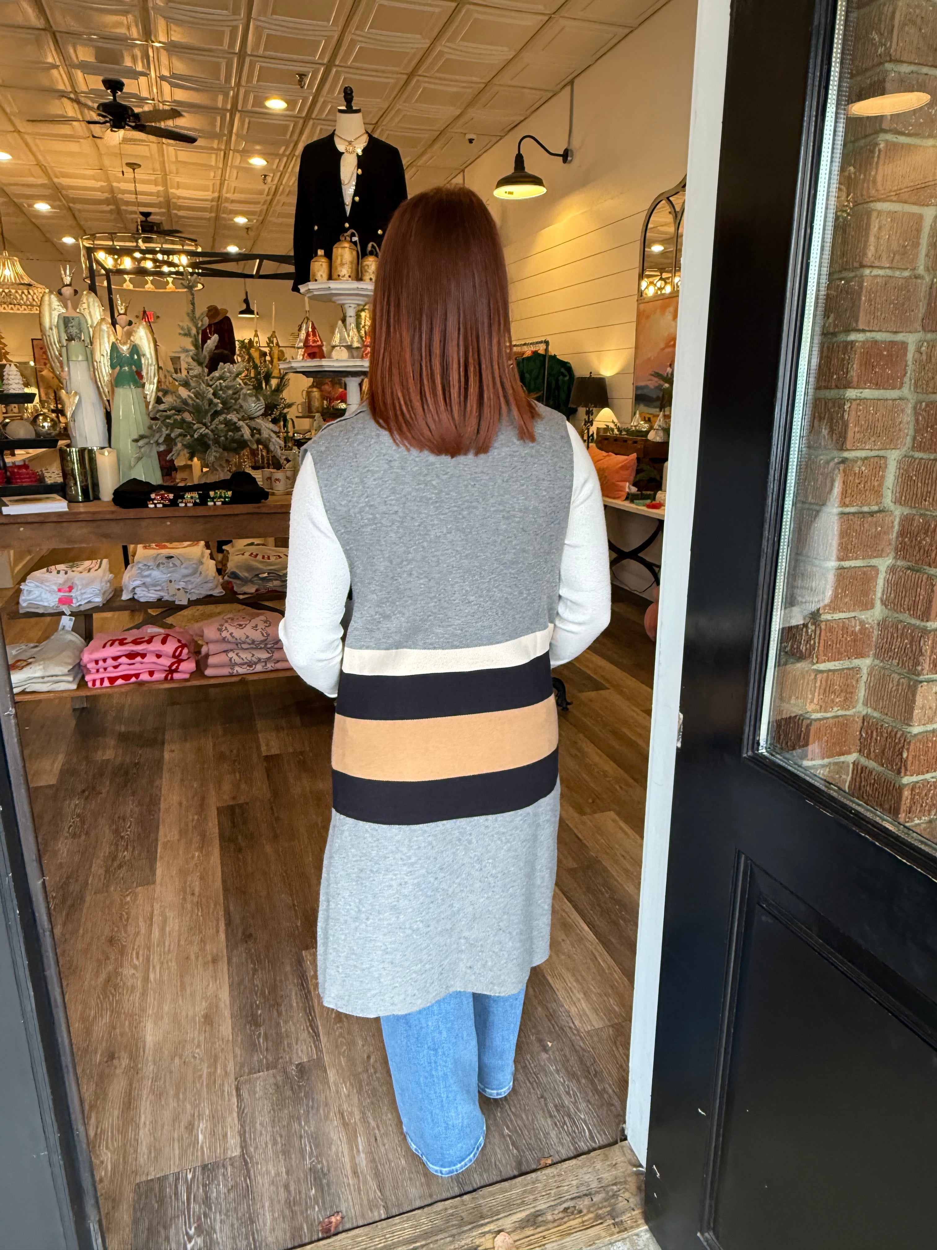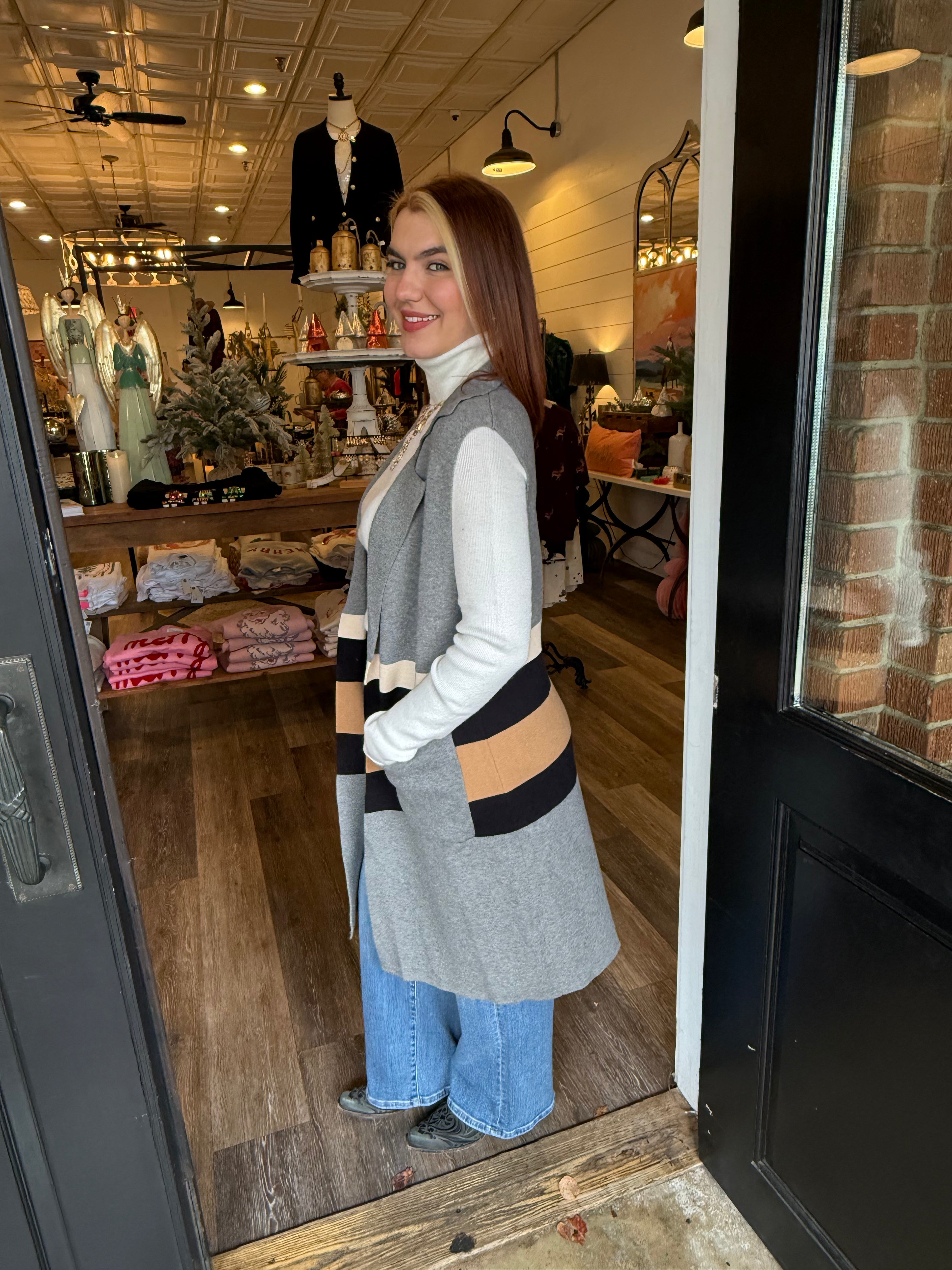 Chic, modern, and effortlessly layerable — the Lauren Cardigan Vest is the perfect way to add style and dimension to your everyday outfits. Designed in a soft color block knit, this long open-front vest drapes beautifully and adds instant polish to any look.