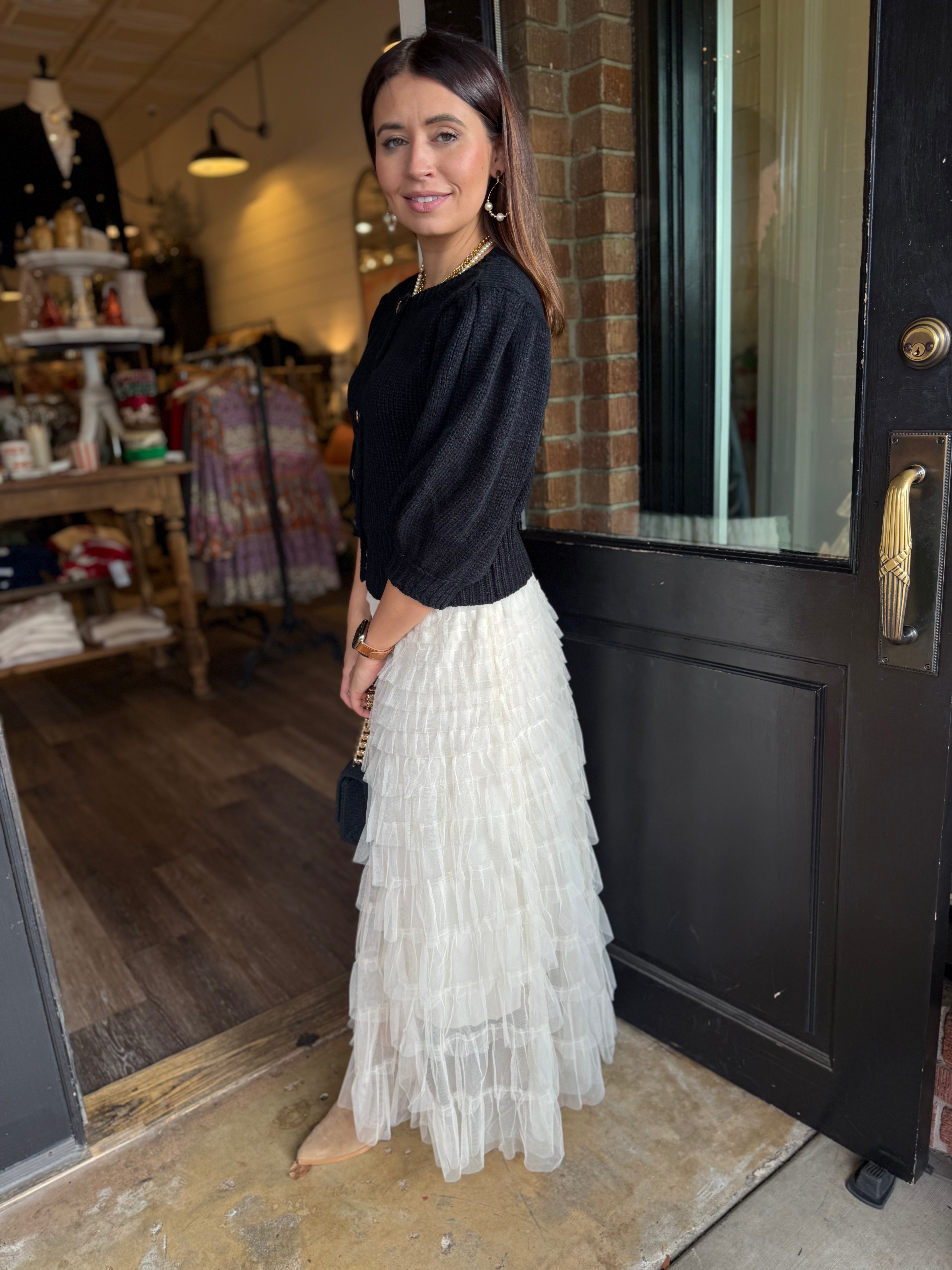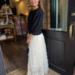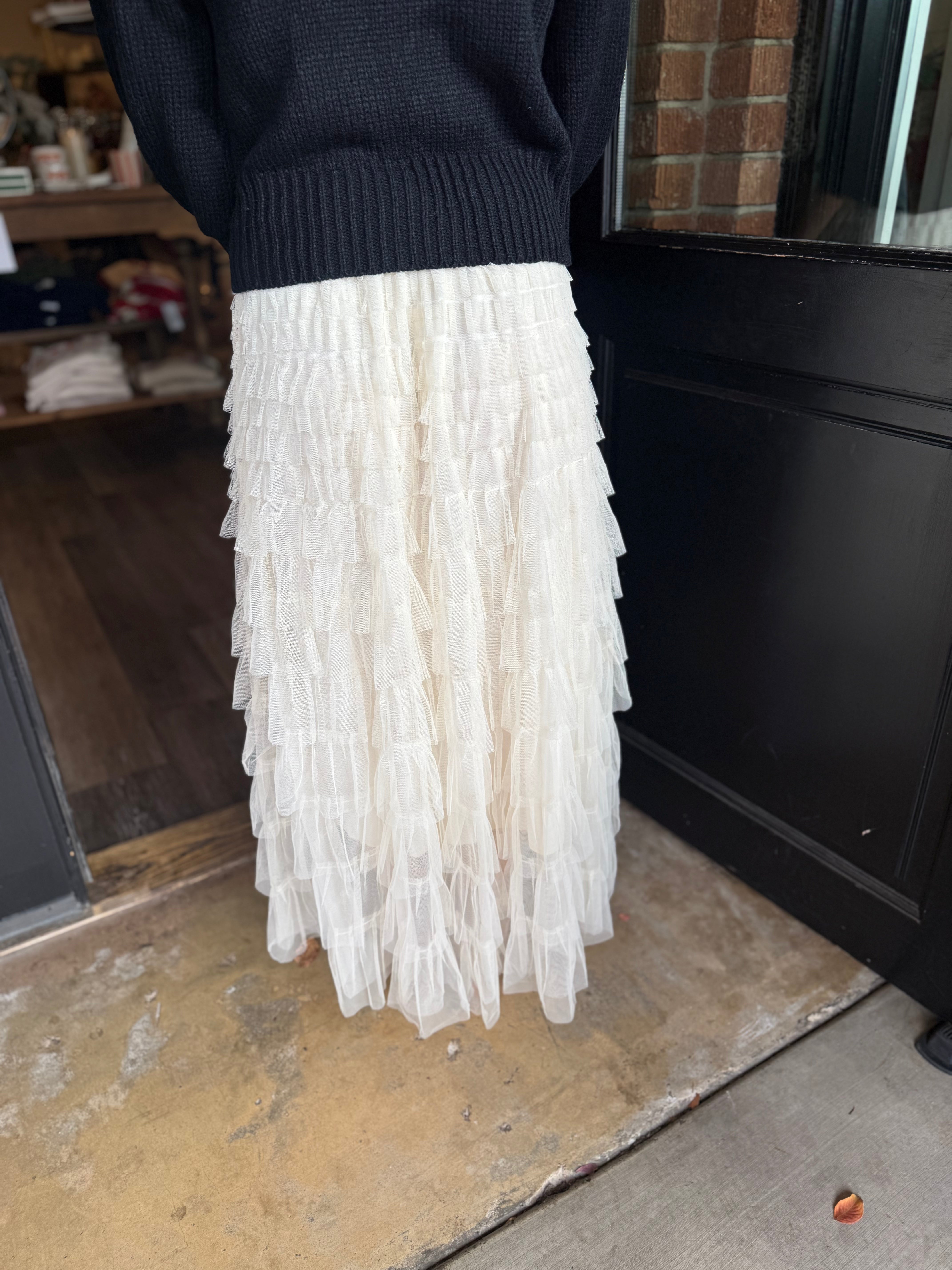 The Leah Ruffle Tulle Midi Skirt is a stunning statement piece designed to turn heads. Crafted from layers of airy tulle, this midi skirt features dramatic, multi-tiered ruffles that cascade from waist to hem, creating beautiful volume, texture, and movement with every step. A smooth, wide elastic waistband offers a comfortable and flattering fit, making this skirt just as easy to wear as it is eye-catching.