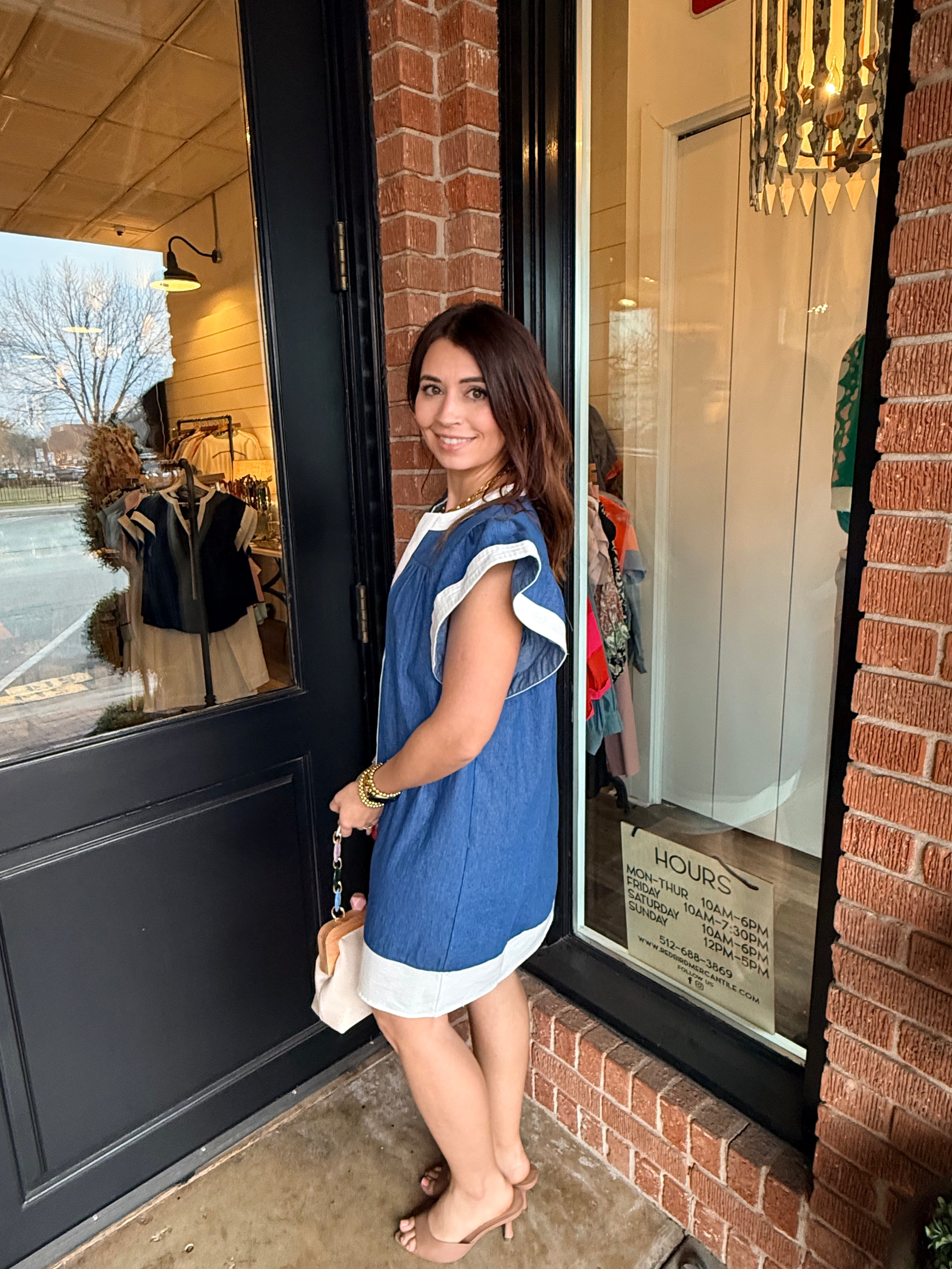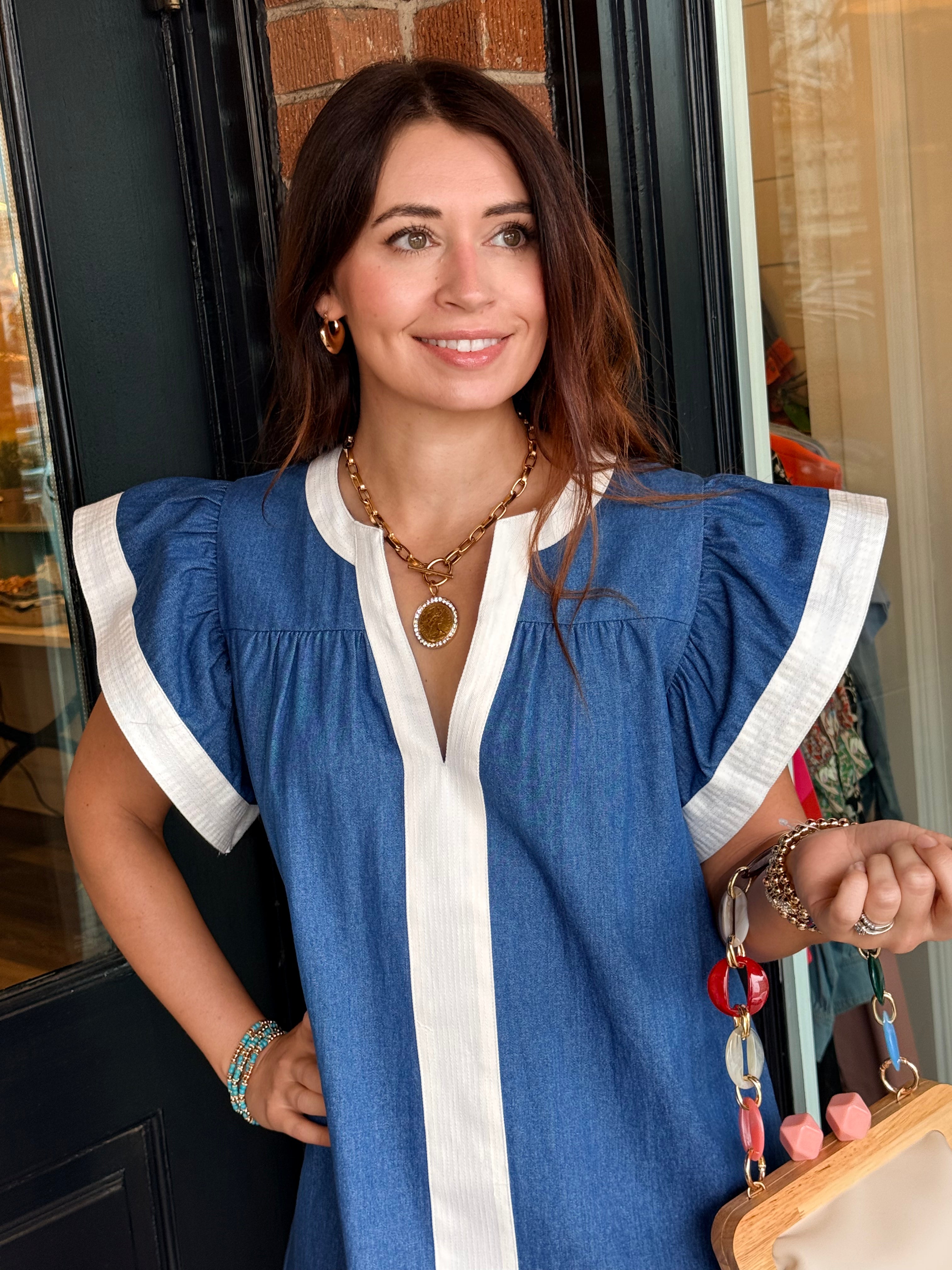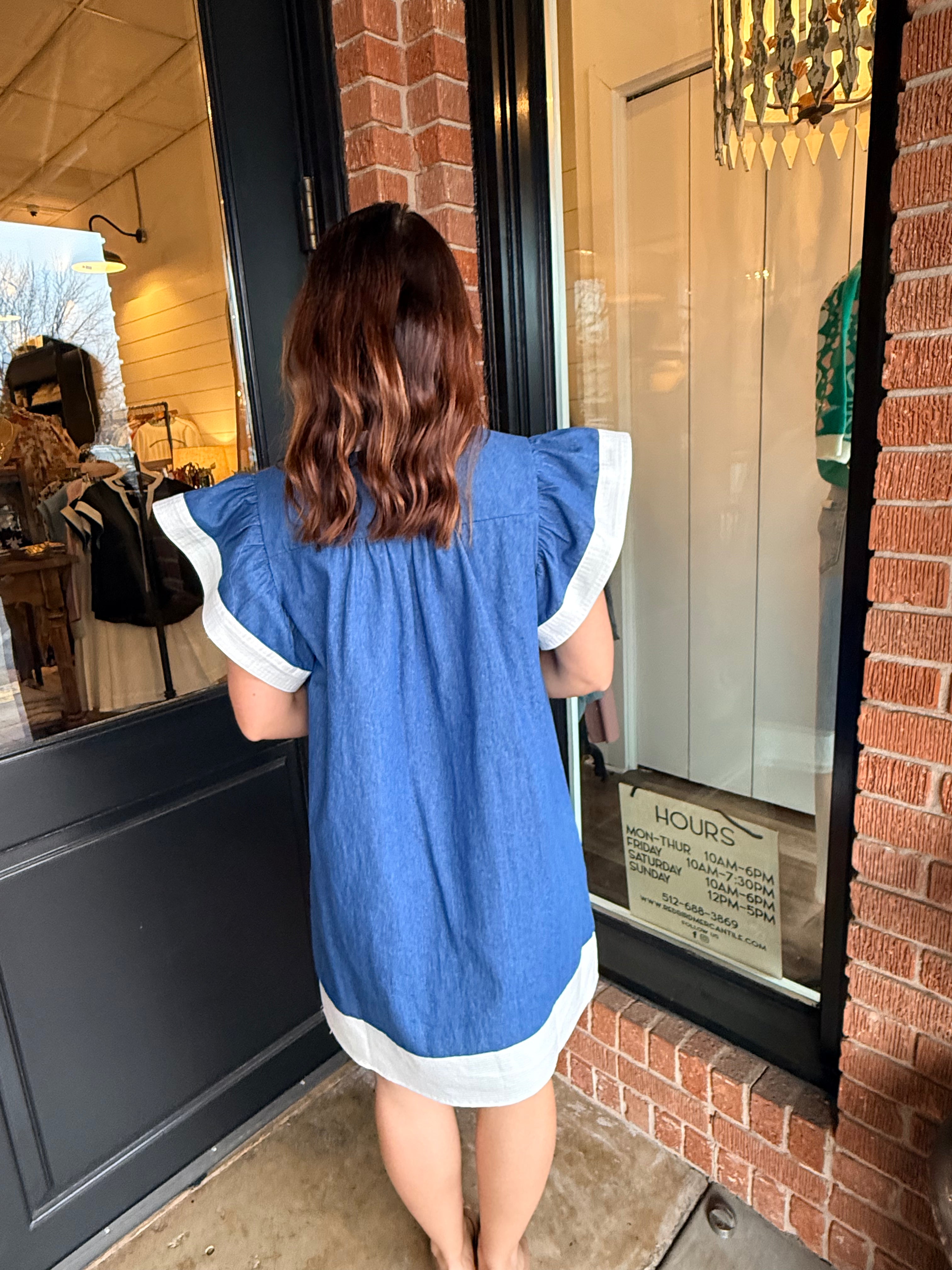 The Leslie Denim Dress is an effortless staple with a feminine twist. Designed in soft 100% cotton denim, this dress features flattering flutter sleeves and a classic V-neckline for an easy, everyday look. The relaxed silhouette keeps it comfortable, while the structured denim fabric gives it that timeless feel.