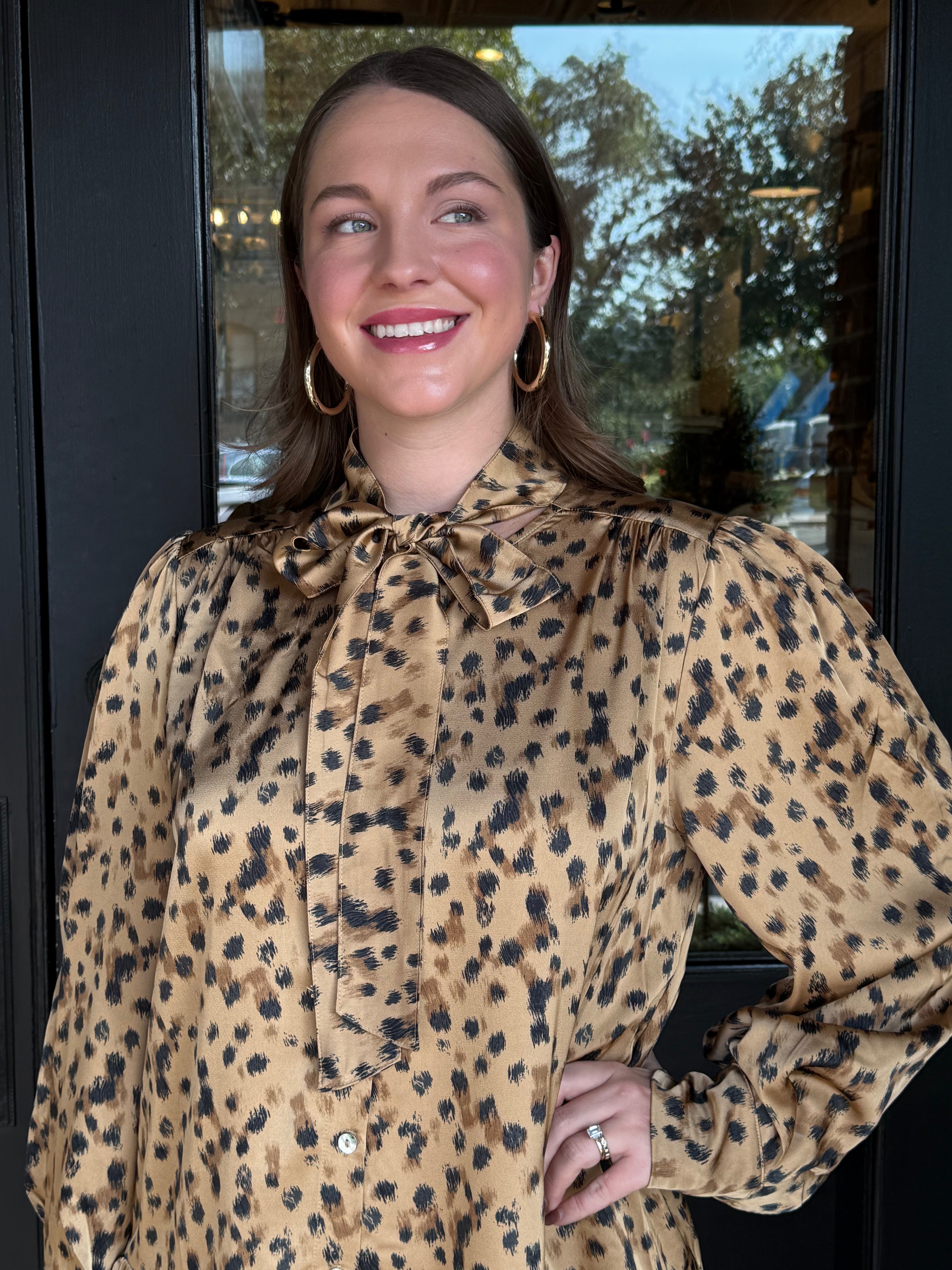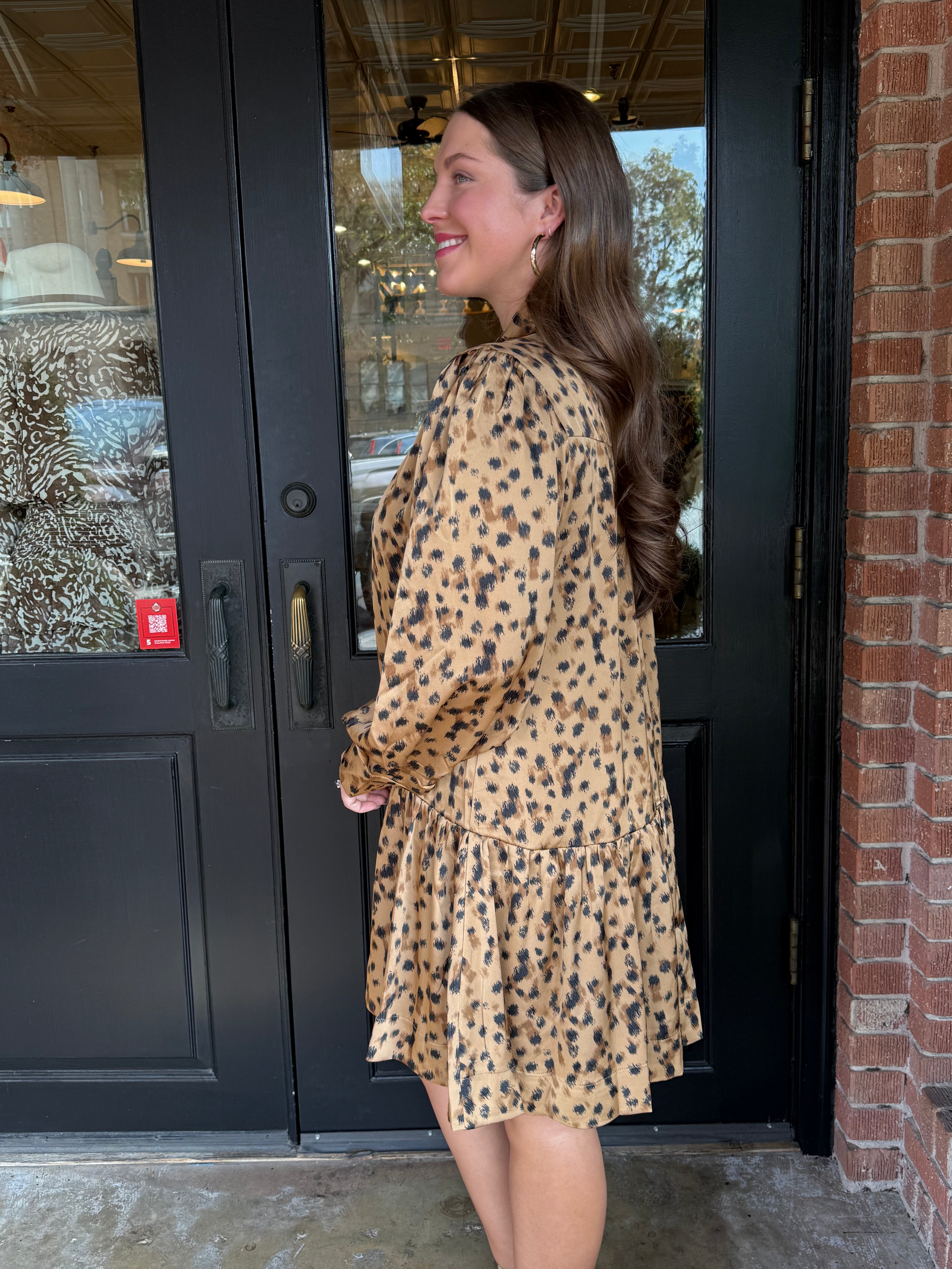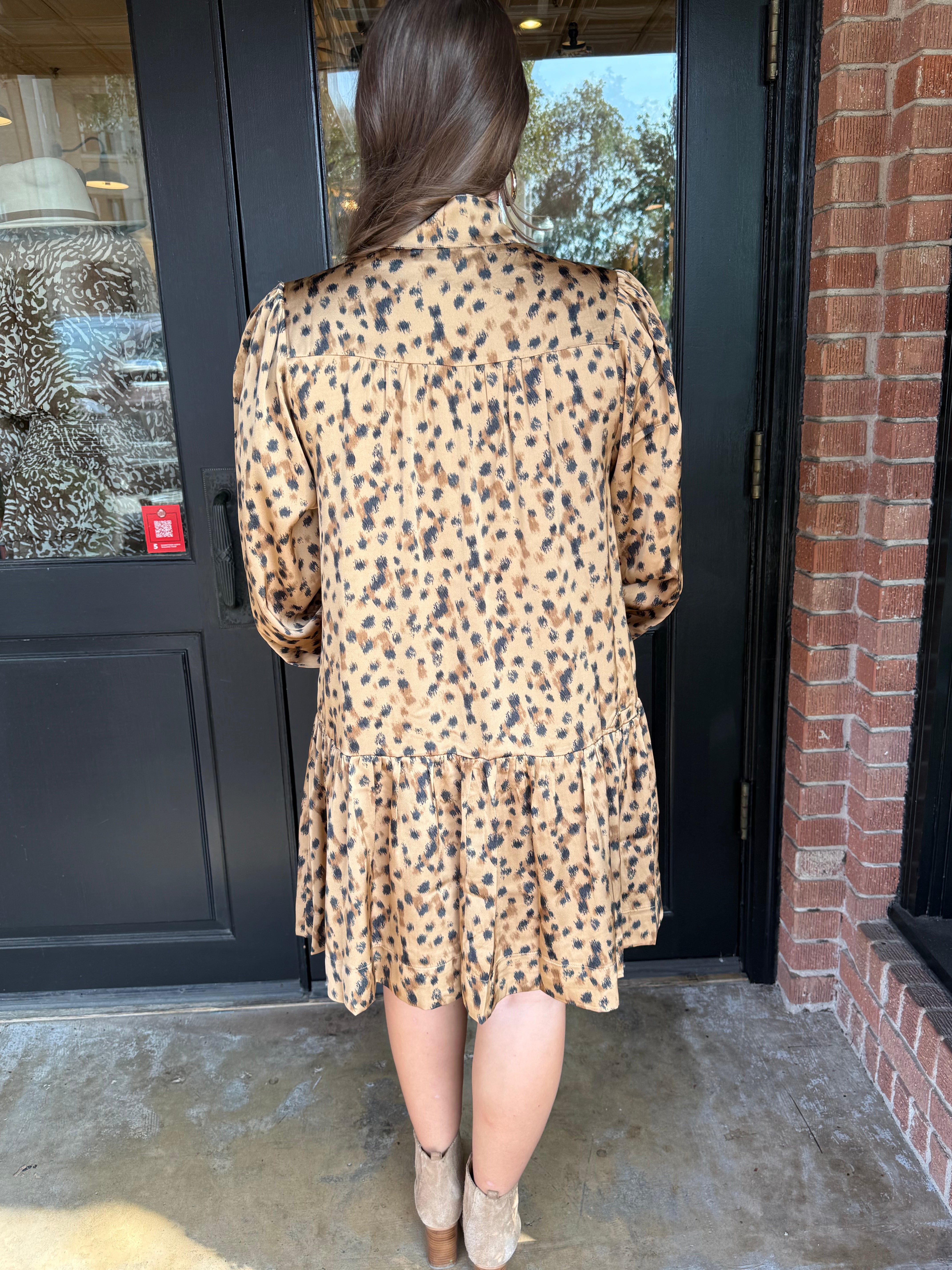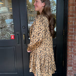 The Lindsy Leopard Tie Neck Mini Dress brings effortless sophistication with a playful twist. Featuring a soft leopard print and feminine ruffle hem, this dress moves beautifully from workdays to weekend outings. The tie-neck detail and button-down bodice add timeless charm you’ll reach for all season long.