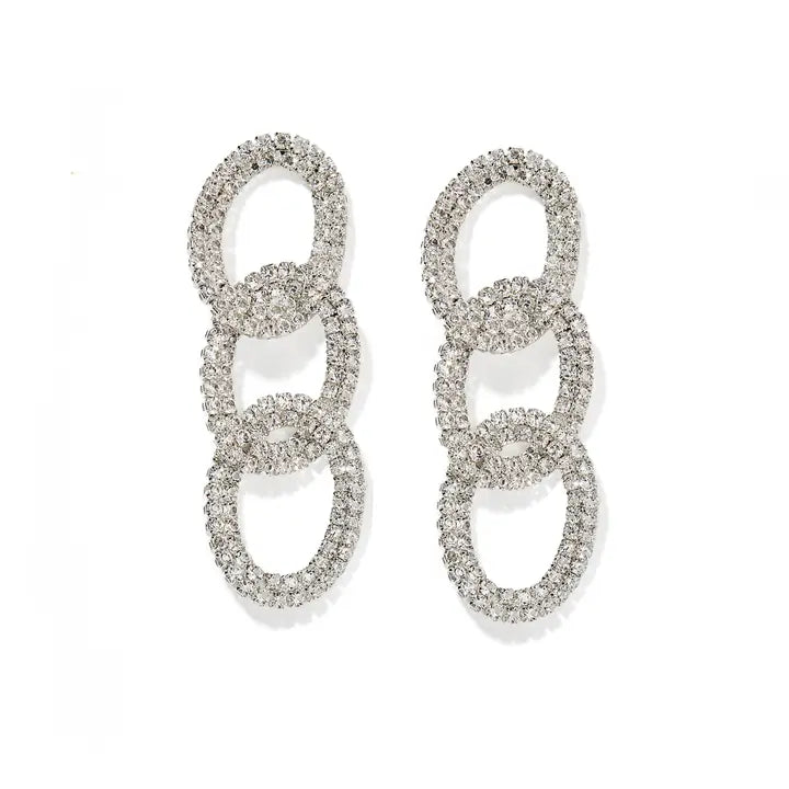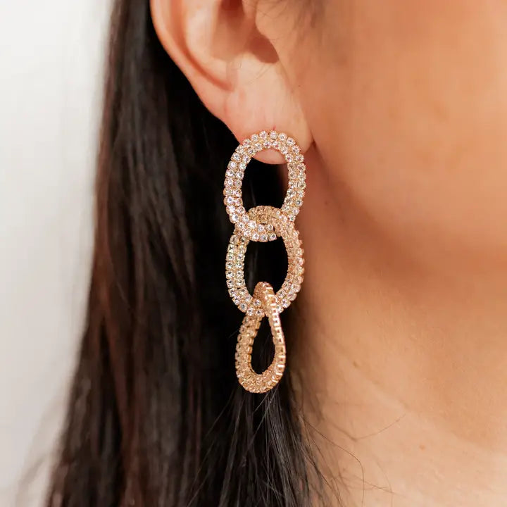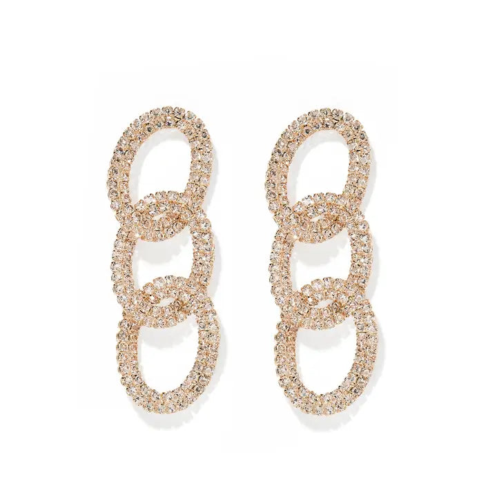 Upgrade your earring game with LINNY CO's Courtney Earrings! Made from safe, light weight, and durable surgical-grade stainless steel, they're perfect for sensitive ears. The Courtney design features three linked ovals, plated in gold with sparkling cz stones. 63mm long and 20mm wide, they're sure to make a statement.