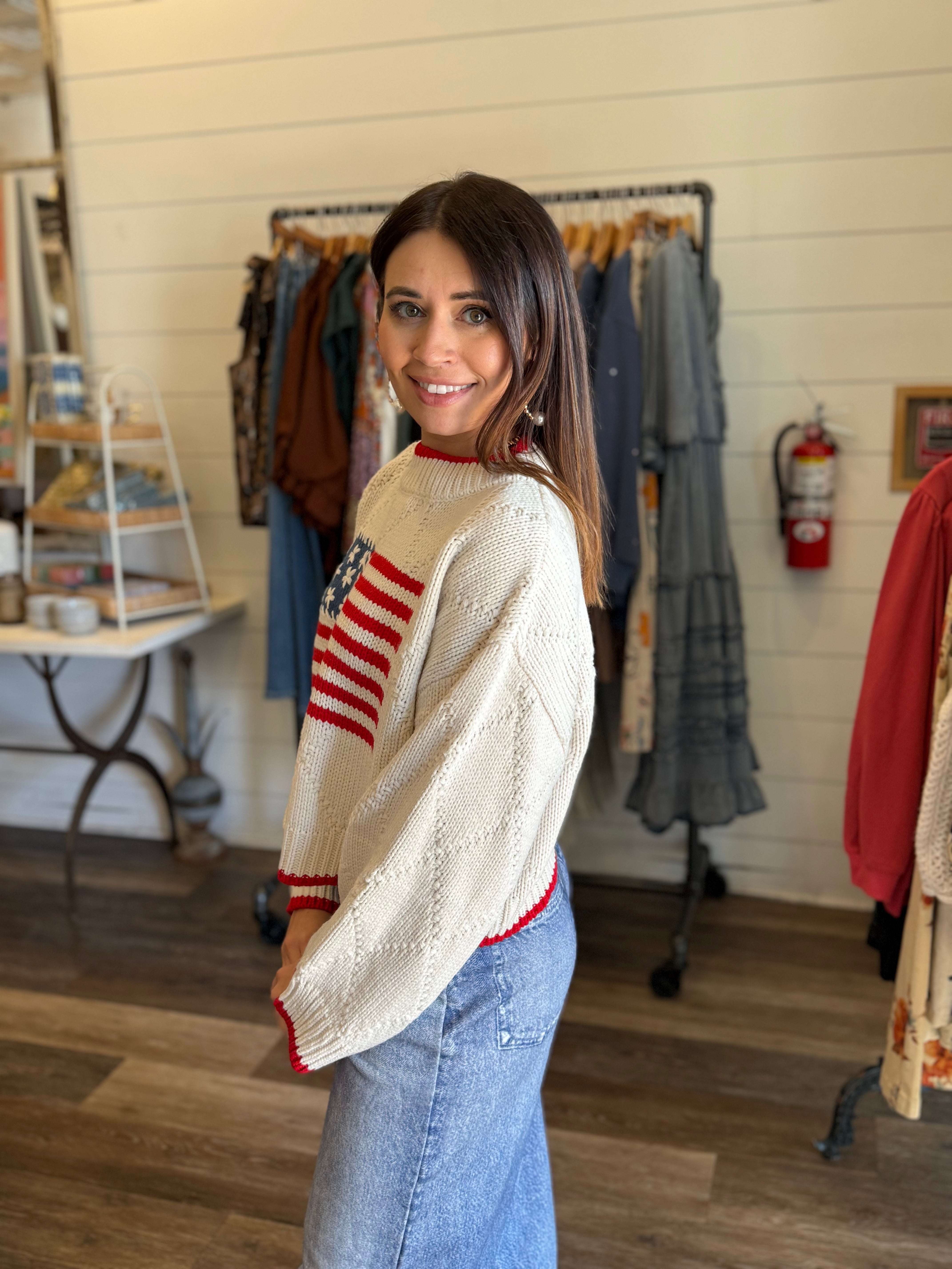 Classic, cozy, and full of patriotic charm, the Liz America Flag Sweater is an easy statement piece for casual days. Featuring an Americana-inspired flag design, this sweater brings laid-back style with a soft knit feel—perfect for summer nights, holiday weekends, and year-round layering.