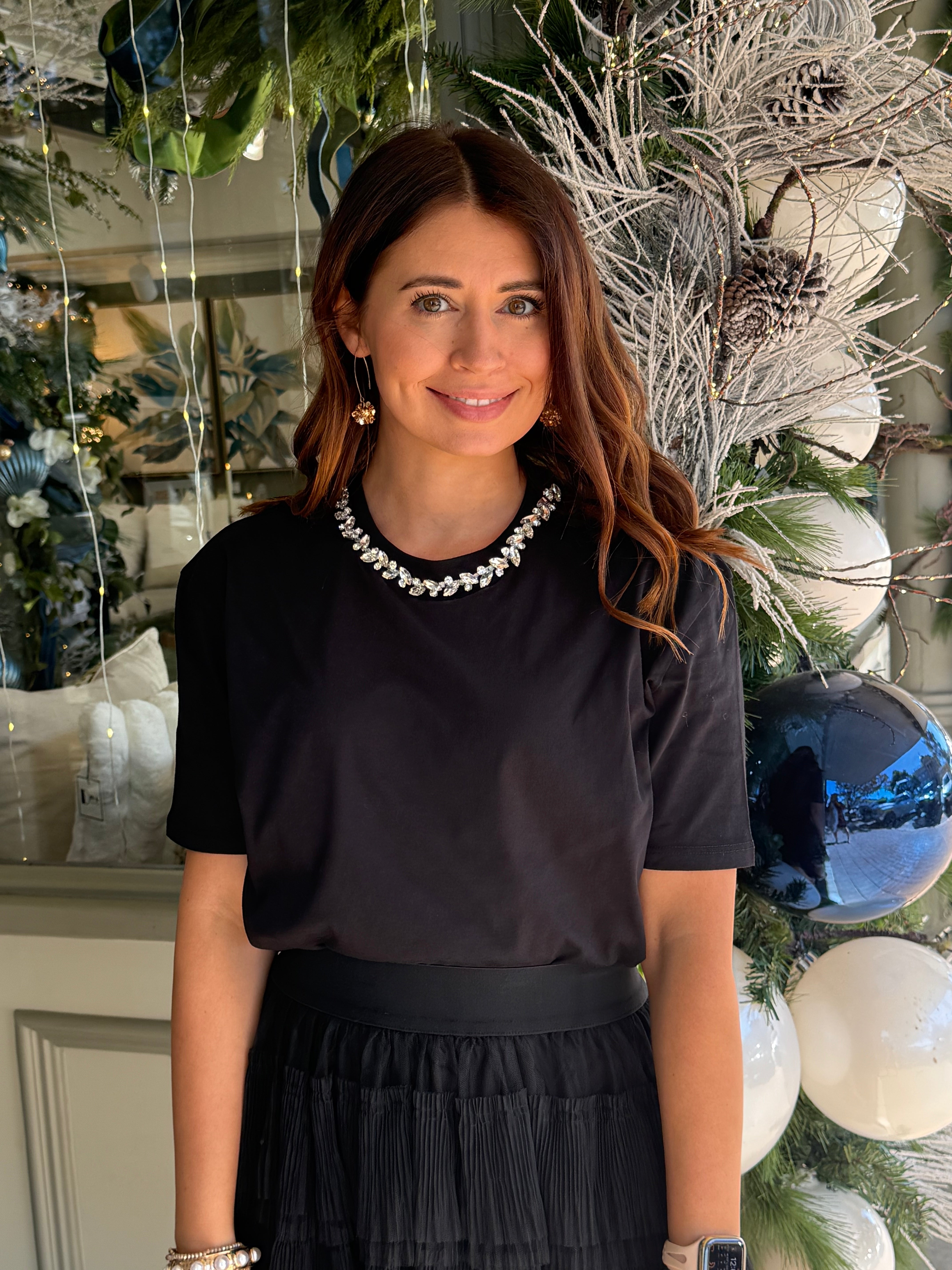 Effortless and elevated, the Lorena Embellish Top brings a touch of sparkle to your everyday style. Made from 100% cotton, this short-sleeve top features delicate embellishments that add subtle shine while keeping a soft, breathable feel. Perfect for pairing with denim, skirts, or under a jacket for a polished look that transitions from day to night.