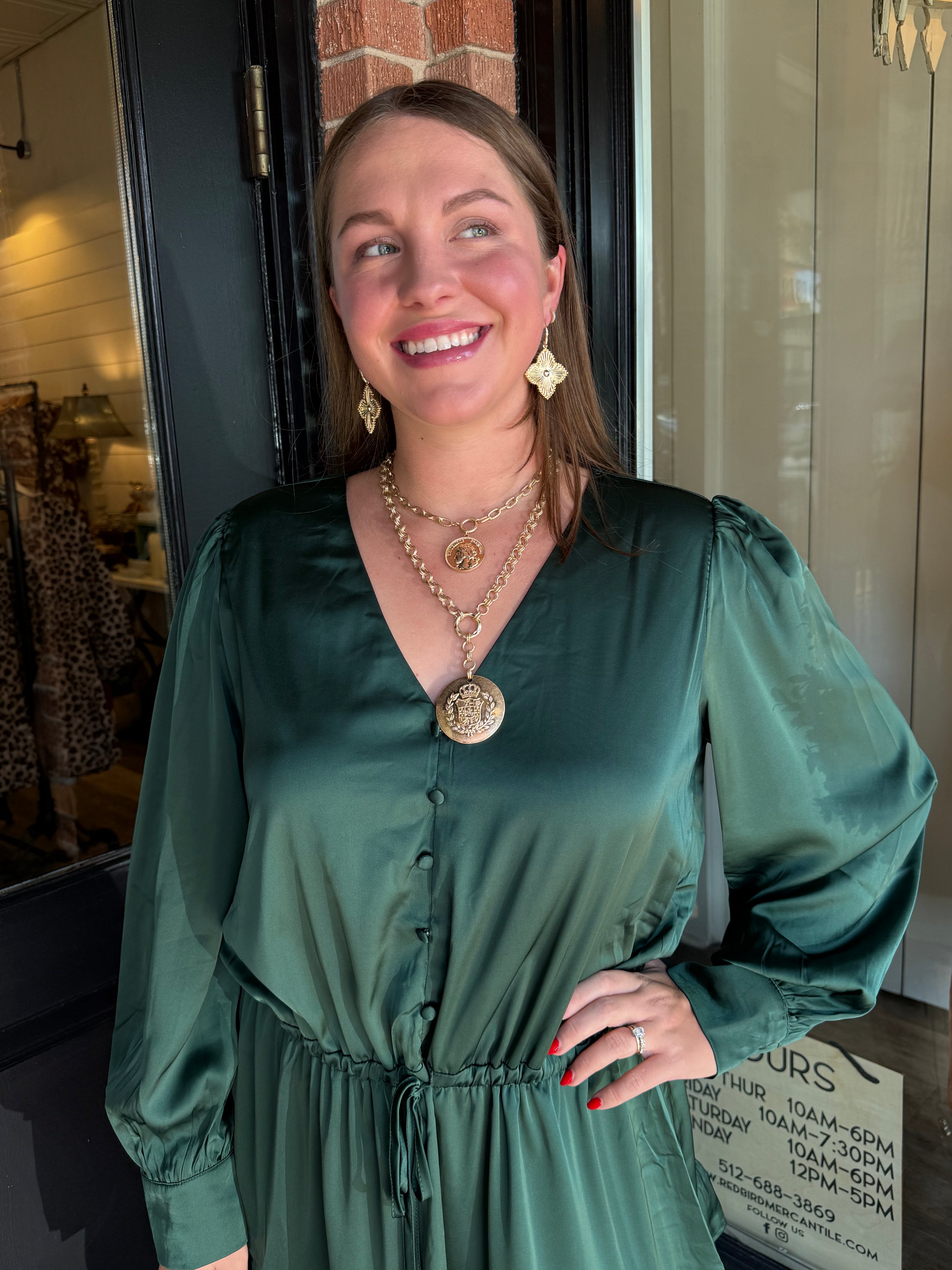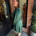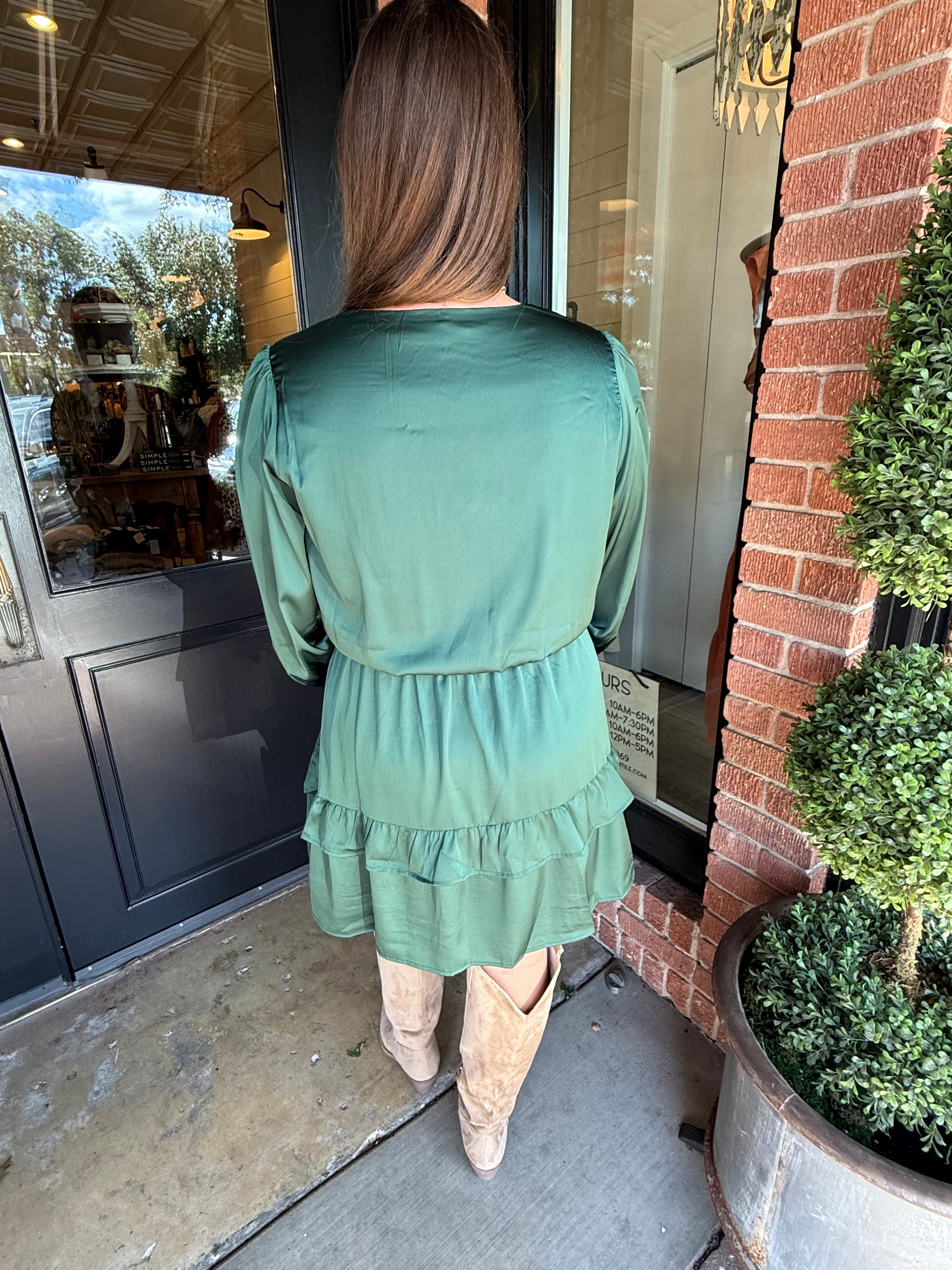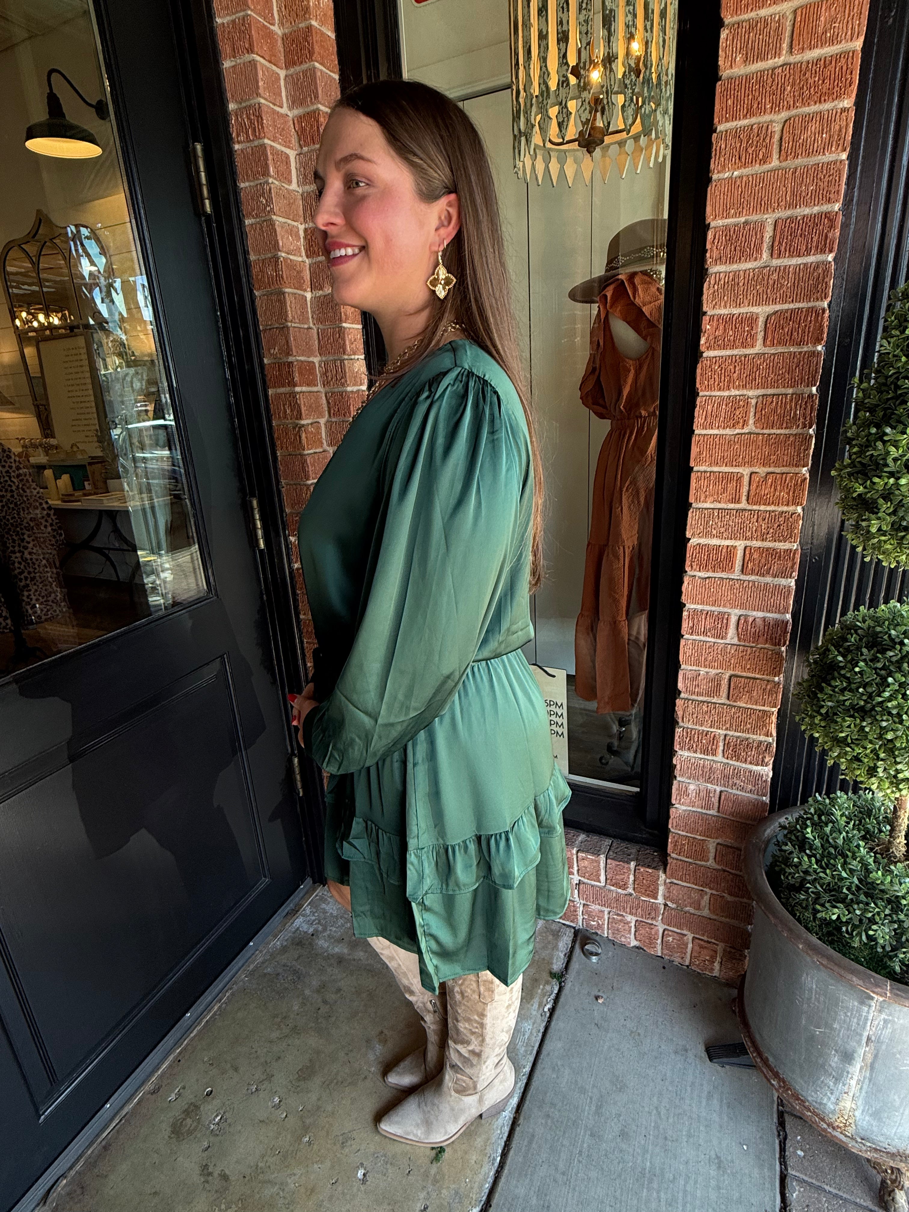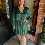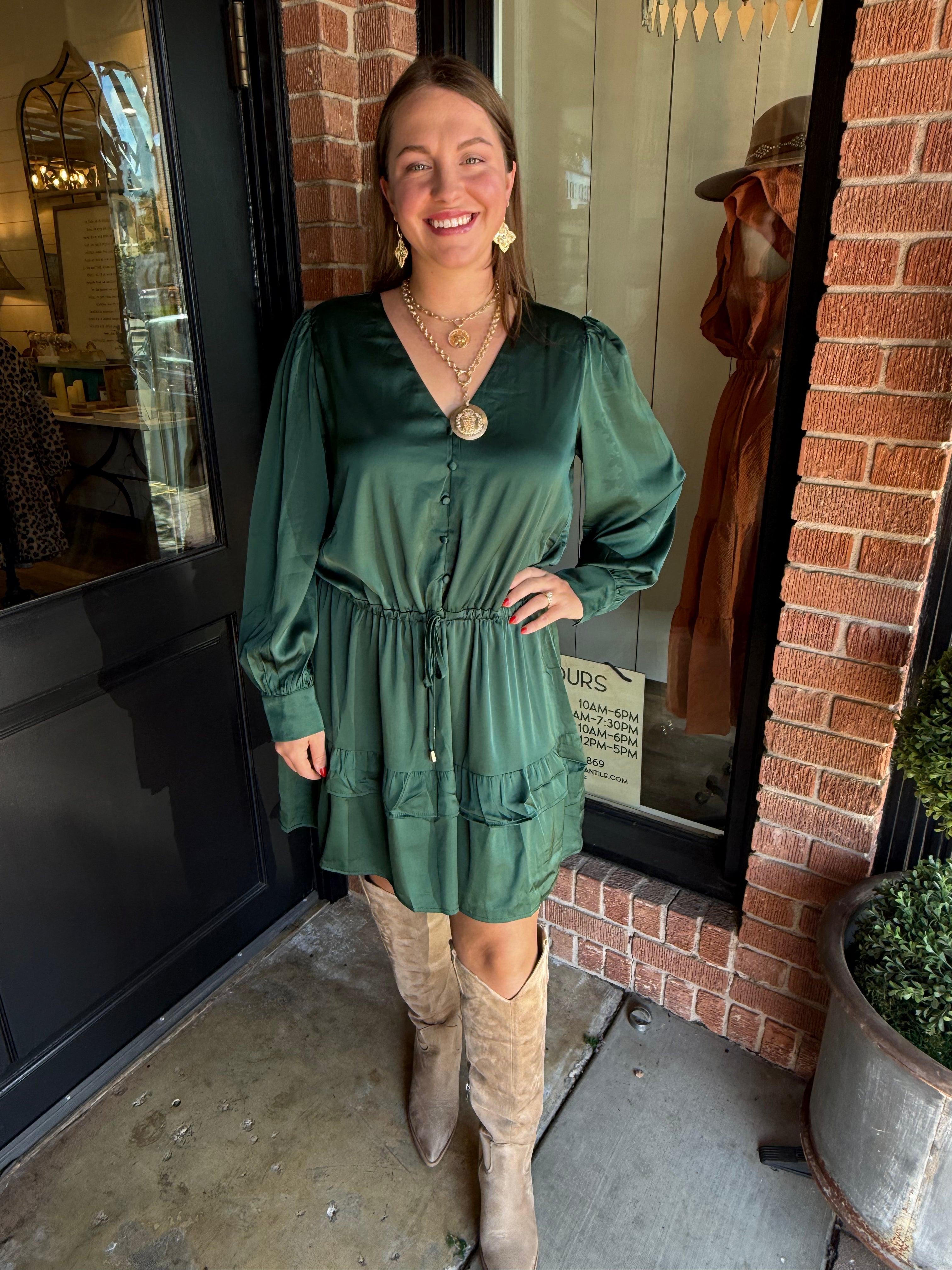 Step into effortless elegance with the Loretta Mini Dress. Crafted in a silky satin fabric, this dress features a flattering tie waist, button-down front, and a tiered skirt that moves beautifully with every step. Long sleeves and a mini length make it perfect for day-to-night styling or special occasions.