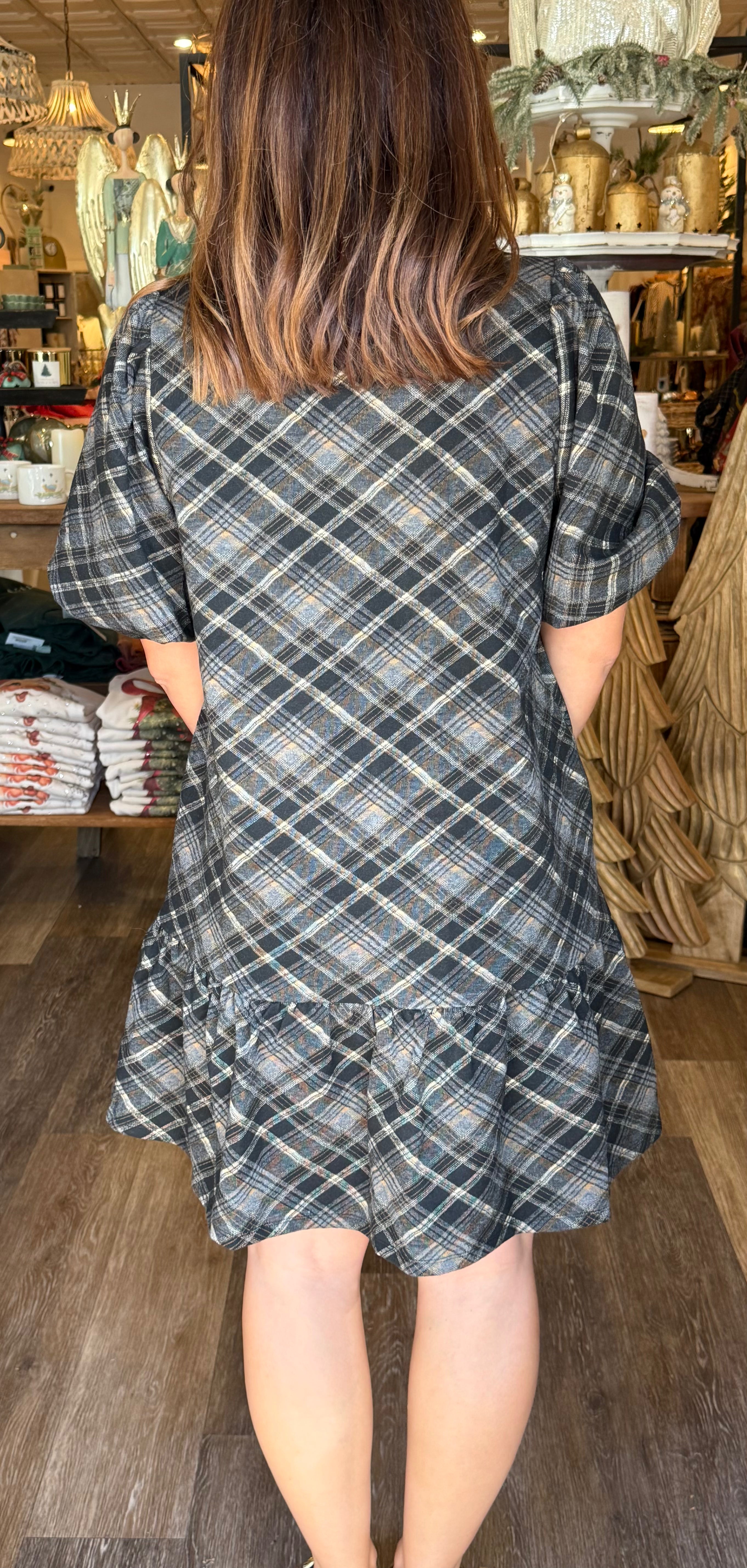 Featuring soft plaid fabric with faux suede contrast, this puff-sleeve dress brings effortless sophistication to cooler days. Its flattering silhouette and cozy materials make it perfect for fall gatherings, workdays, or casual outings on the Square.