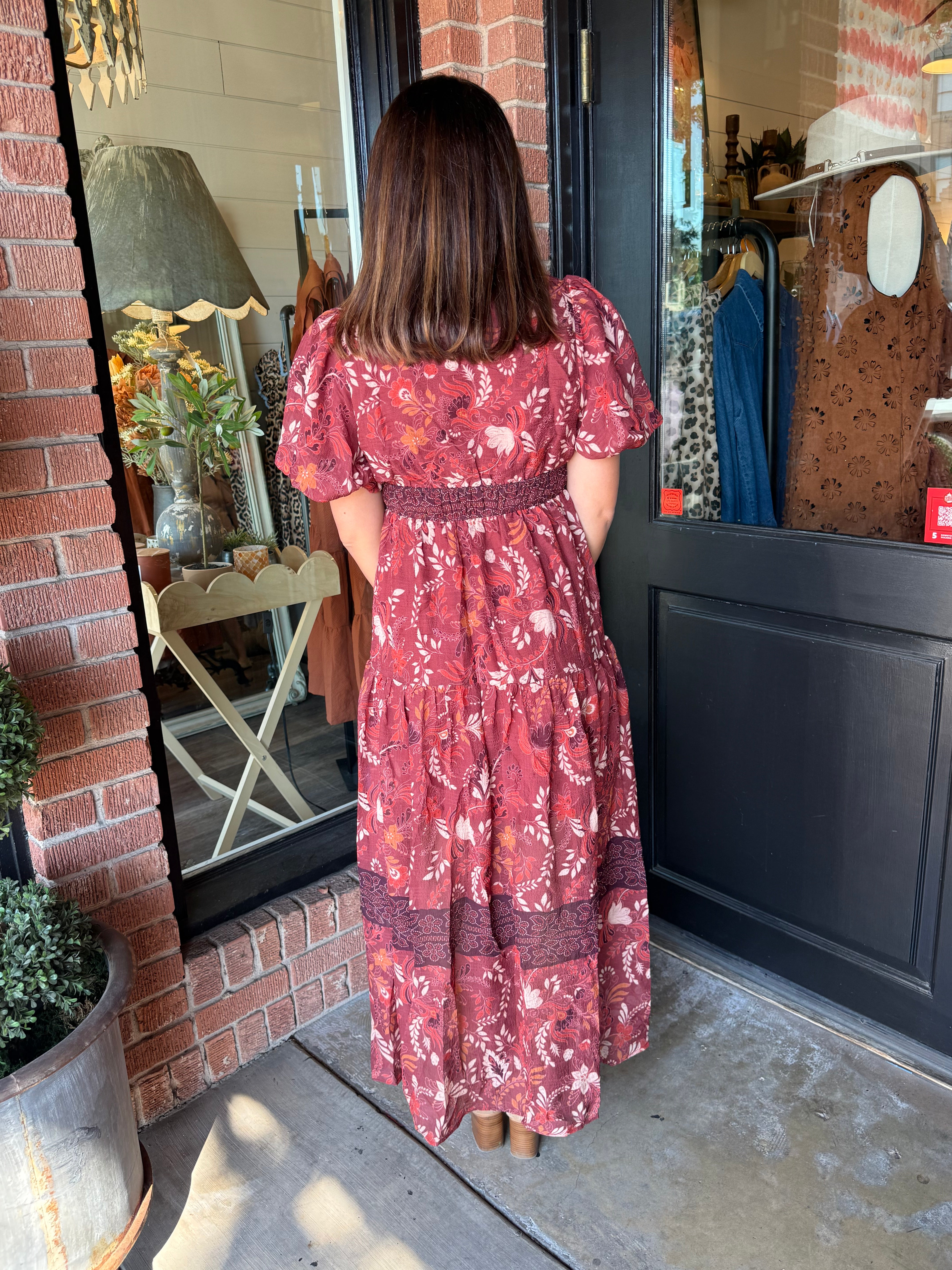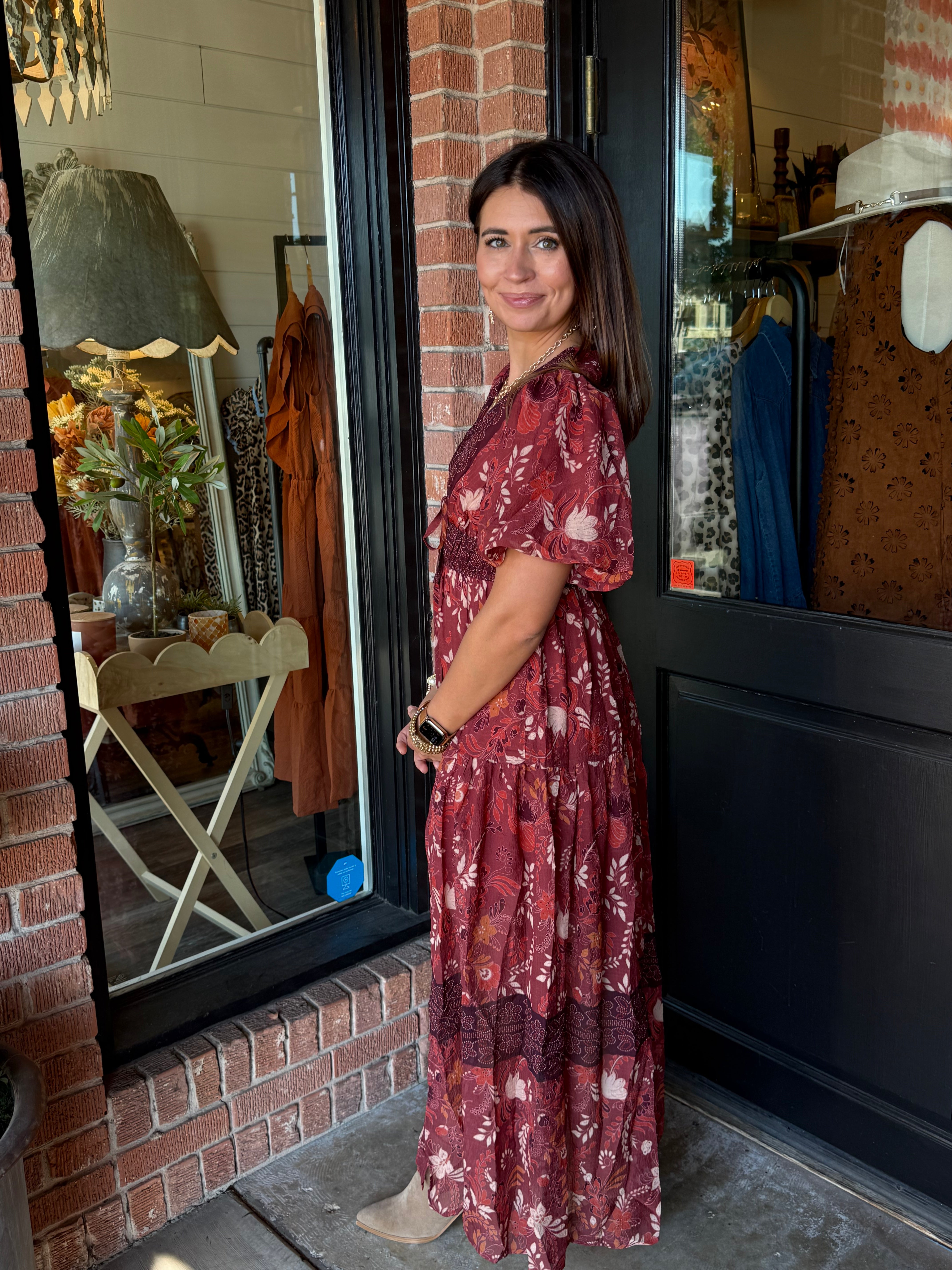 Romantic and feminine, the Lynn Rust Dress brings effortless charm to your fall wardrobe. Designed in a warm floral print, this maxi dress features a flattering V-neckline, puff sleeves, and a self-tie detail at the front for a soft, boho-inspired finish. Lightweight and lined for comfort, it’s the perfect dress for both daytime outings and evening occasions.
