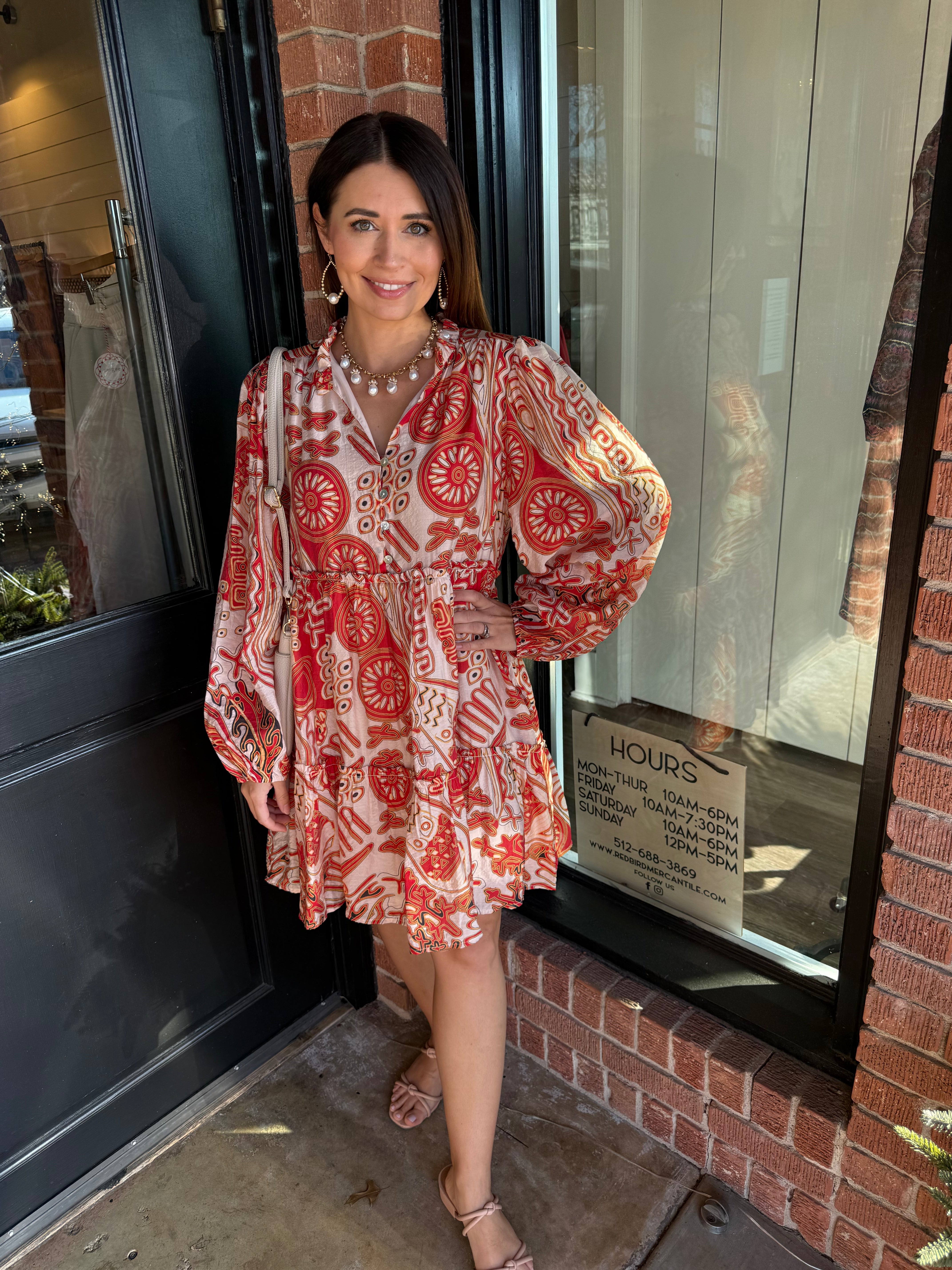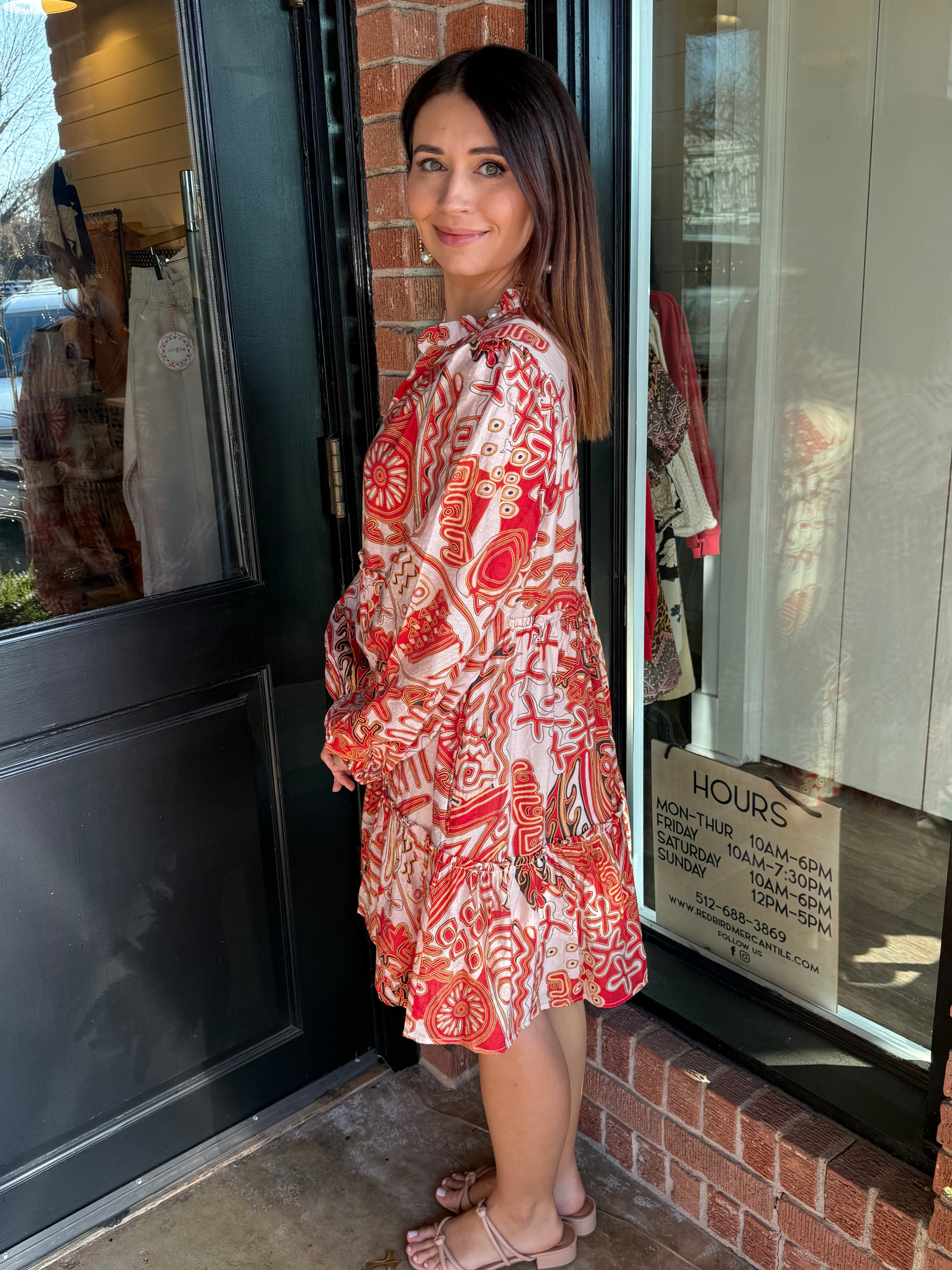 The Macey Pattern Mini Dress is full of feminine details that make it easy to love. Designed with a flattering elastic waist and a tiered skirt, this mini dress features a soft ruffle neckline and an upper button detail for a polished finish. Long sleeves with elastic cuffs and a fully lined interior make it as comfortable as it is cute.