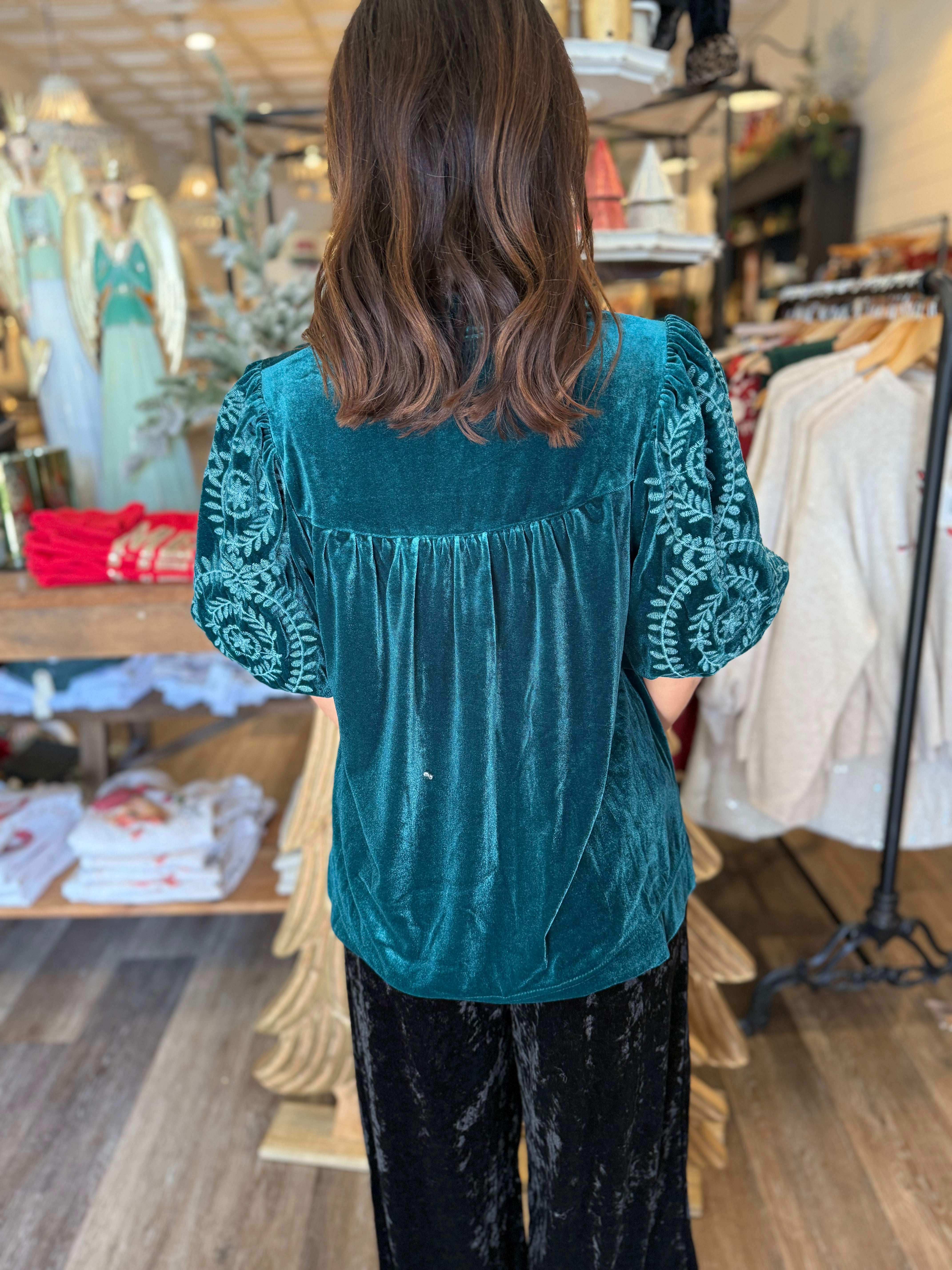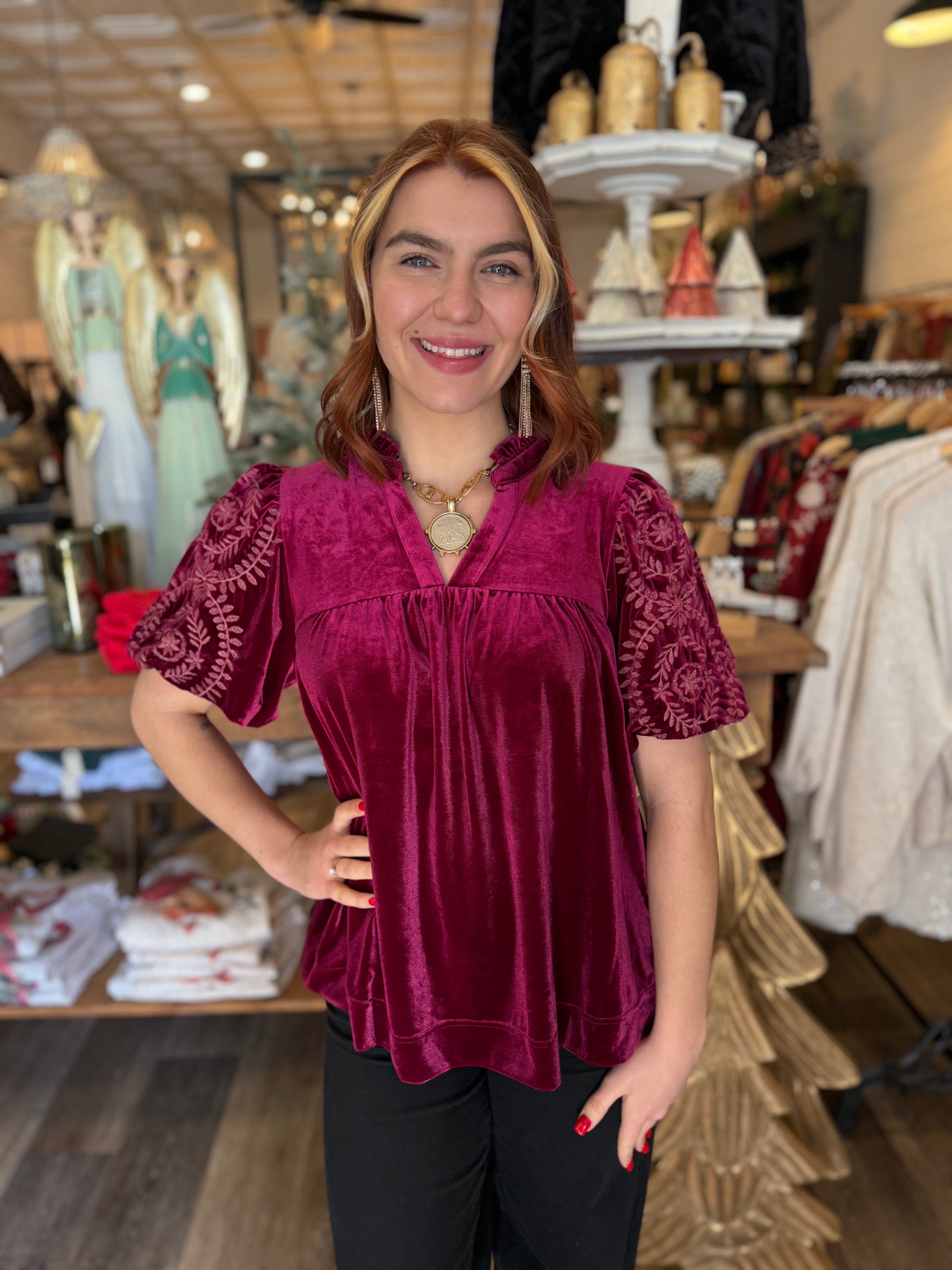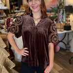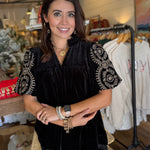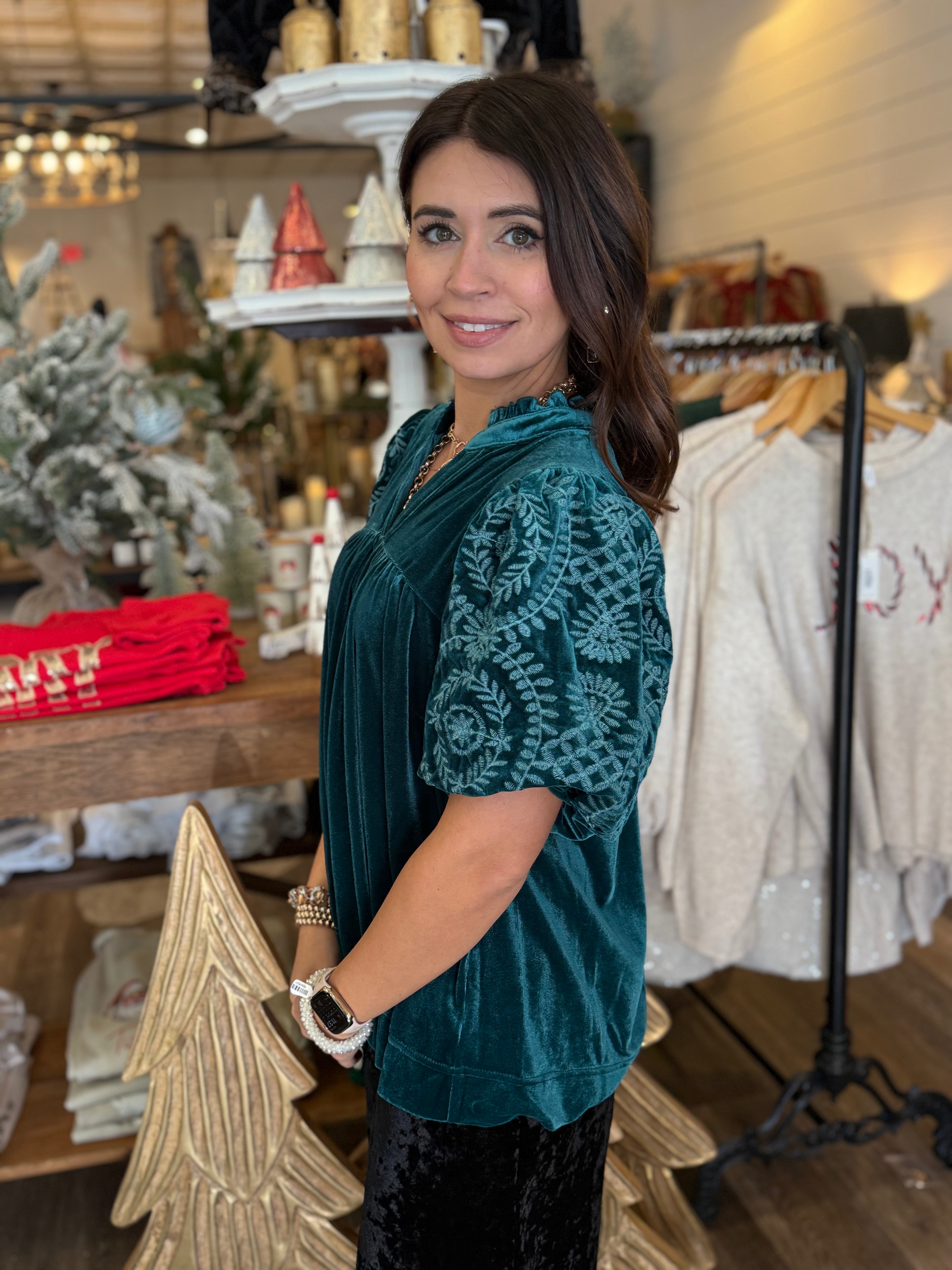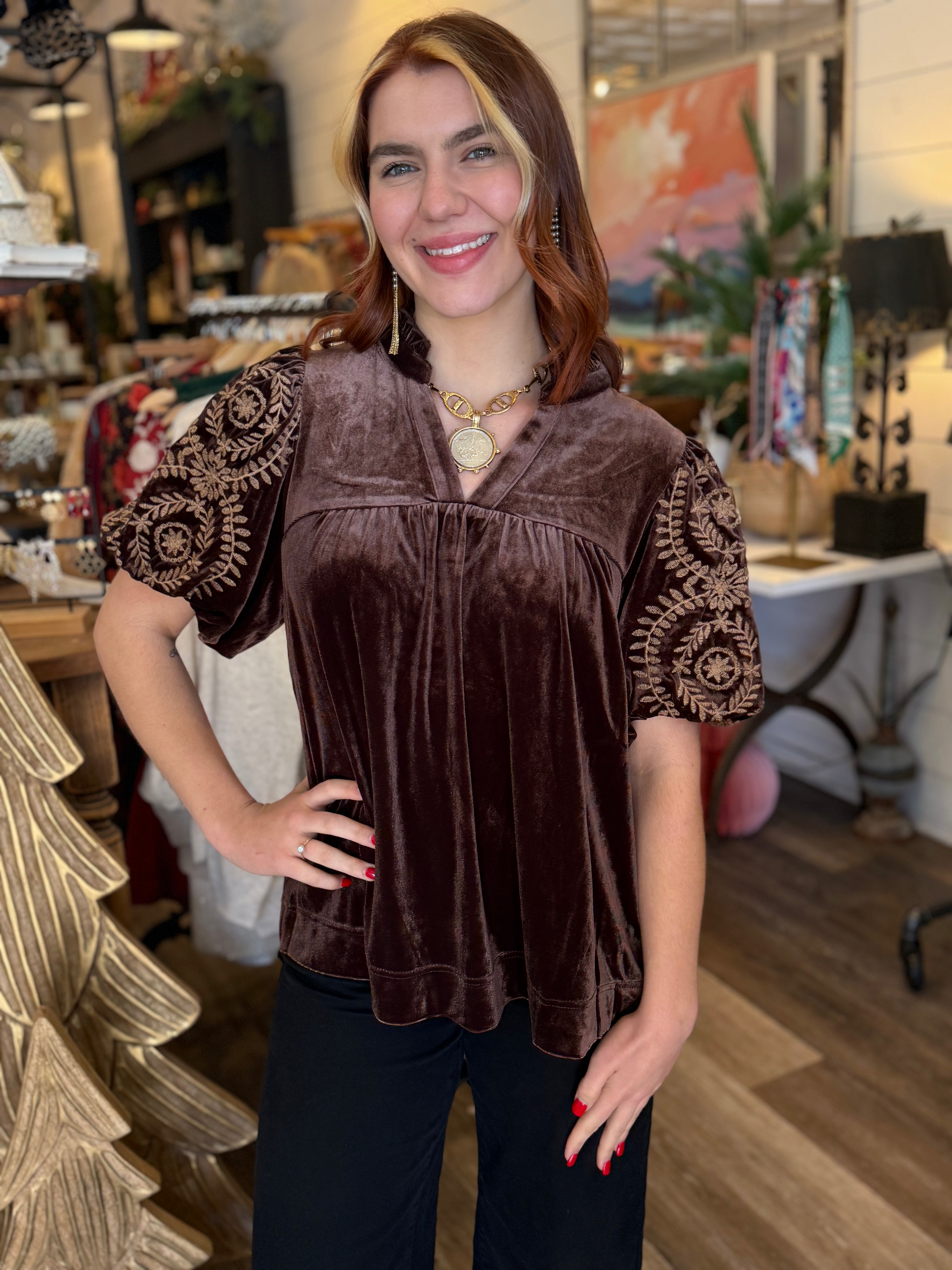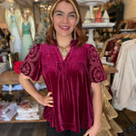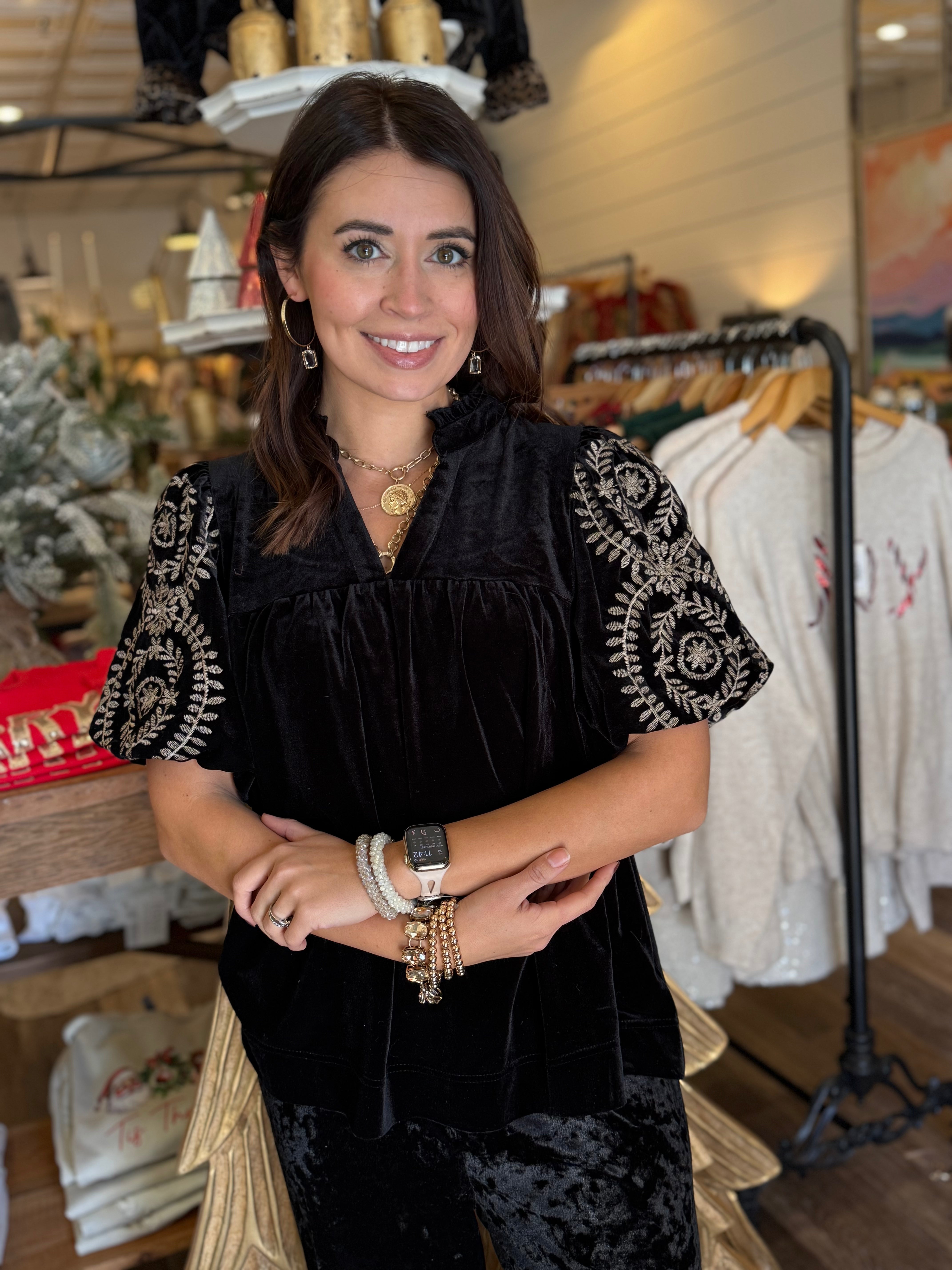 Elevate your look with the luxe Macy Velvet Top, designed with rich velvet fabric and beautifully embroidered bubble sleeves. The ruffle V-neckline adds a feminine touch, while the lined sleeves ensure comfort and elegance. A perfect choice for holiday gatherings, date nights, or anytime you want to shine.