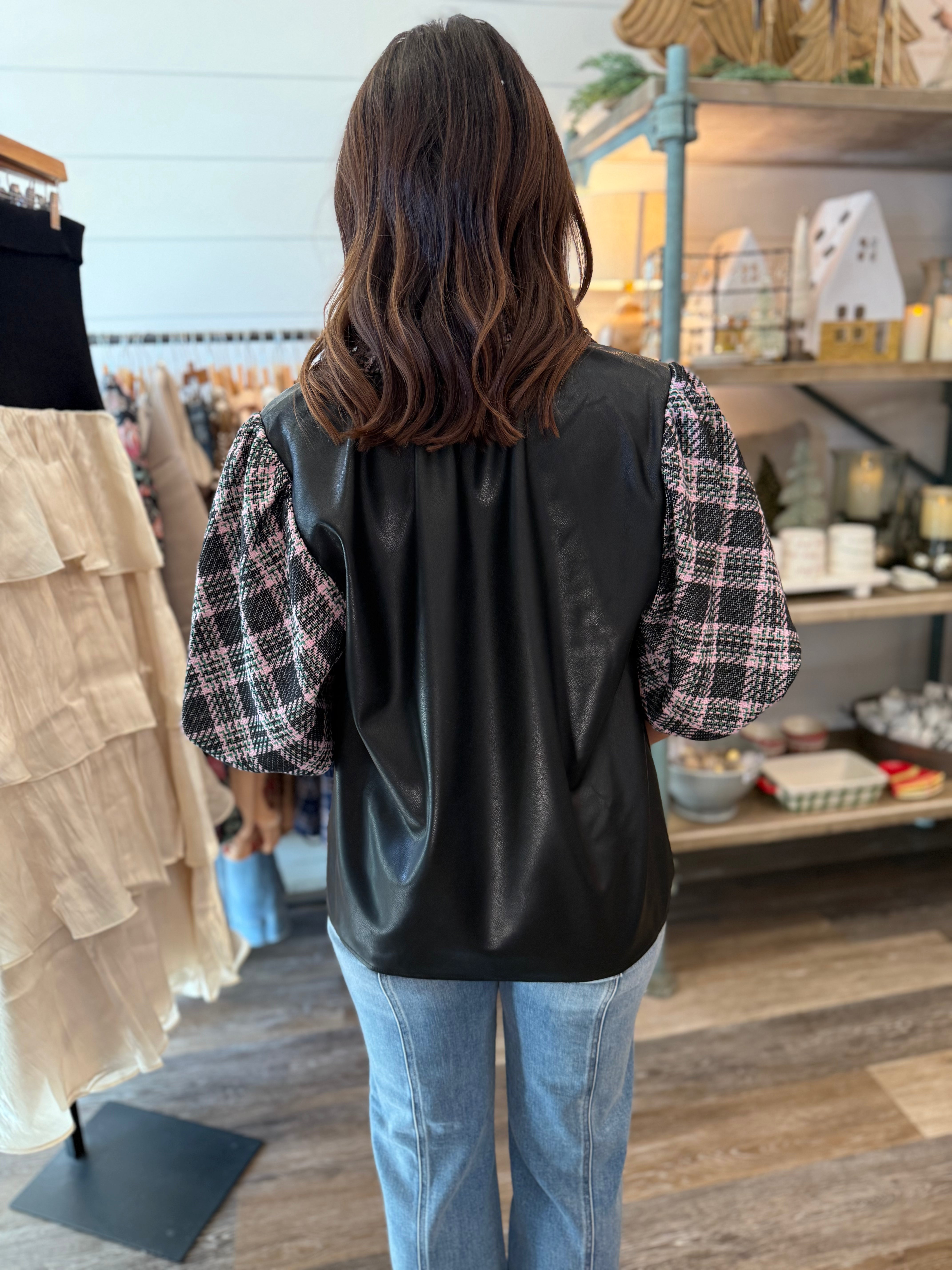 Mixed media design: faux leather body with plaid puff sleeves