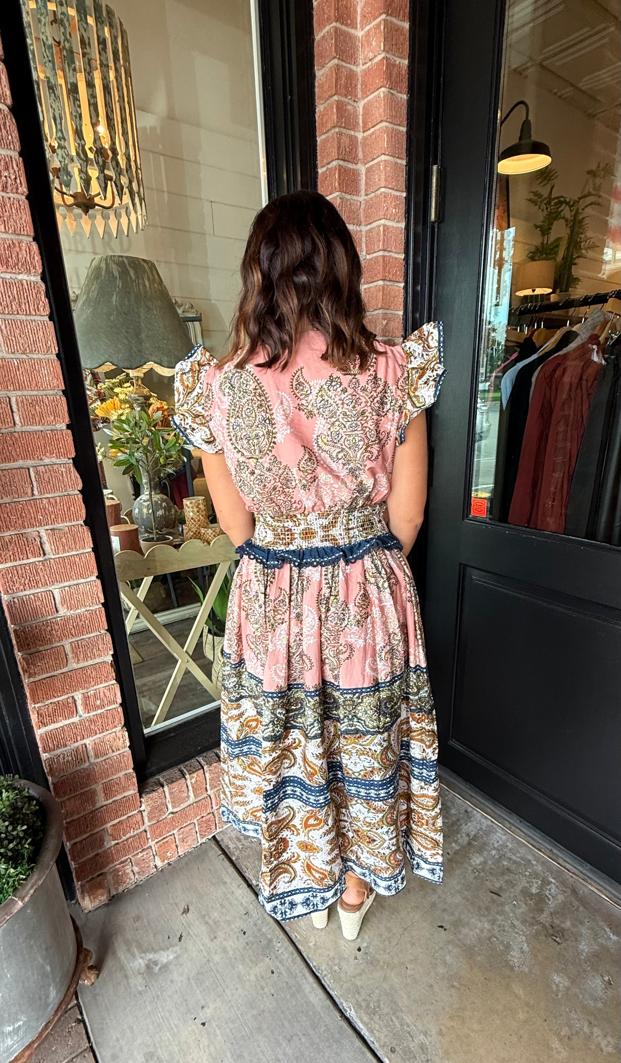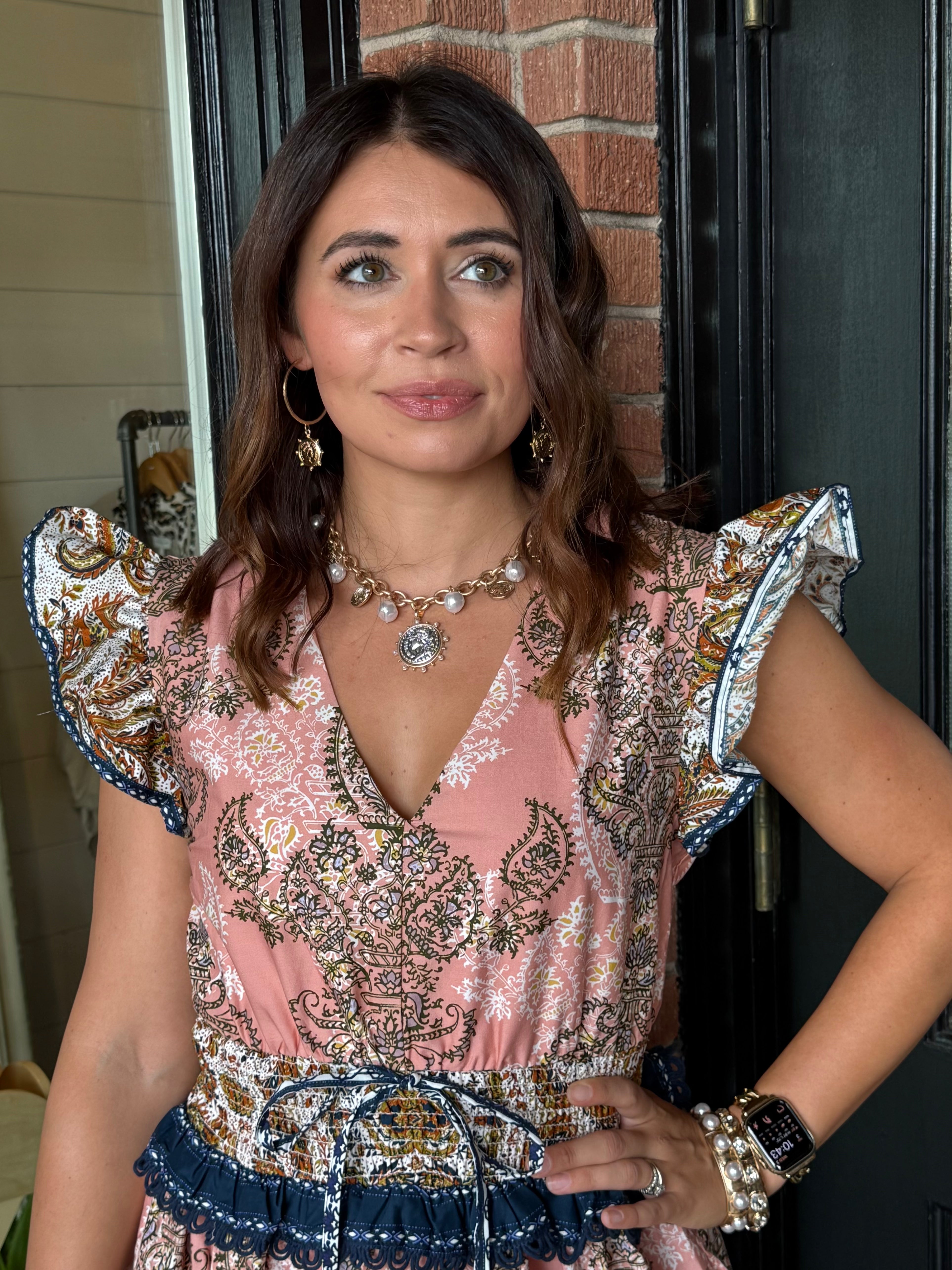 Feminine and flattering, the Margaret Tiered Midi Dress is designed for effortless style. Featuring a smocked waist with delicate trim and front waist tie, this dress offers a comfortable yet defined silhouette. The split neckline and flutter sleeves add soft, romantic details, while the tiered skirt flows gracefully with every step. Fully lined and crafted in a breathable cotton-spandex blend, it’s perfect for warm-weather occasions, brunches, or casual days out.