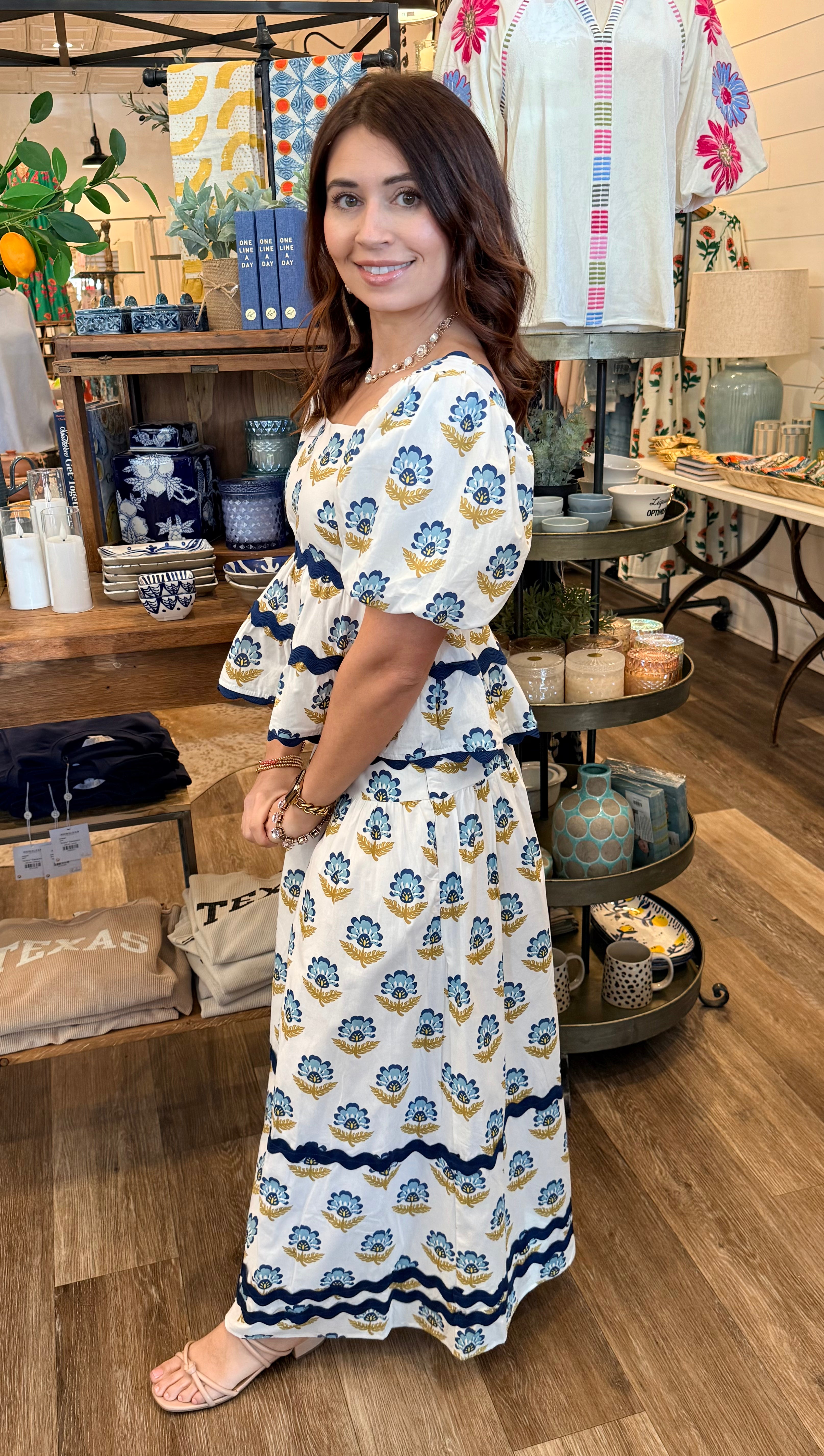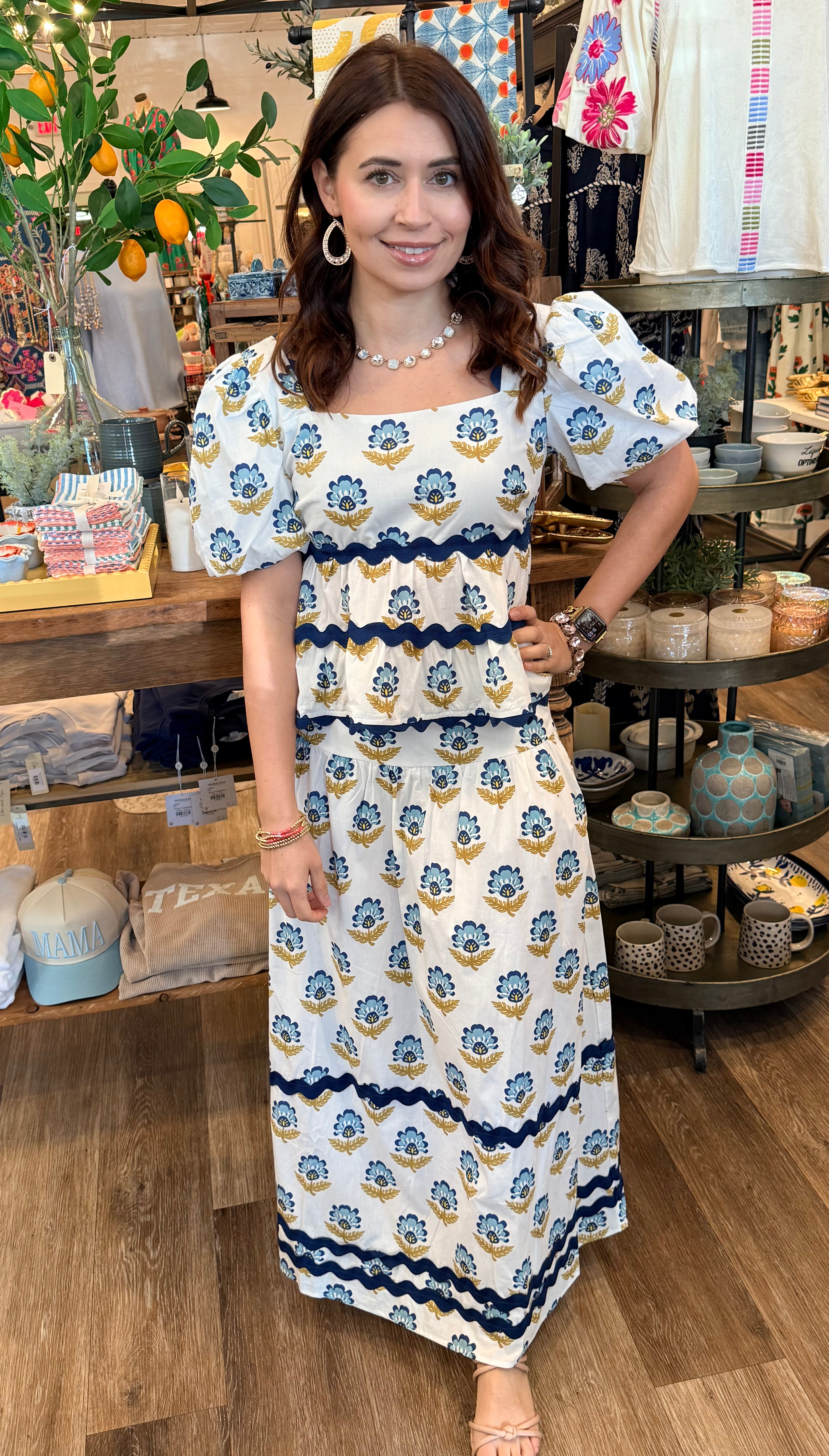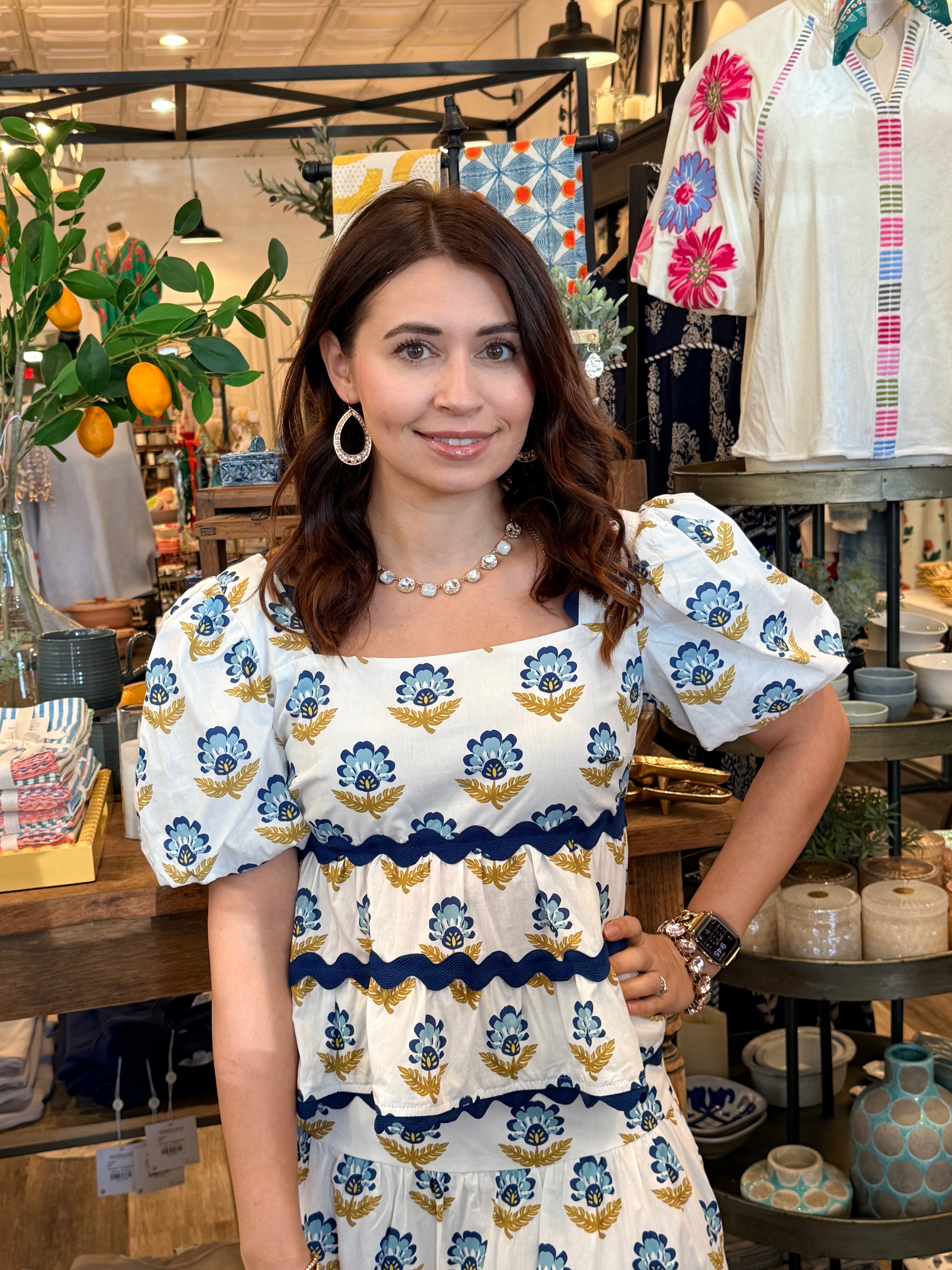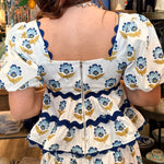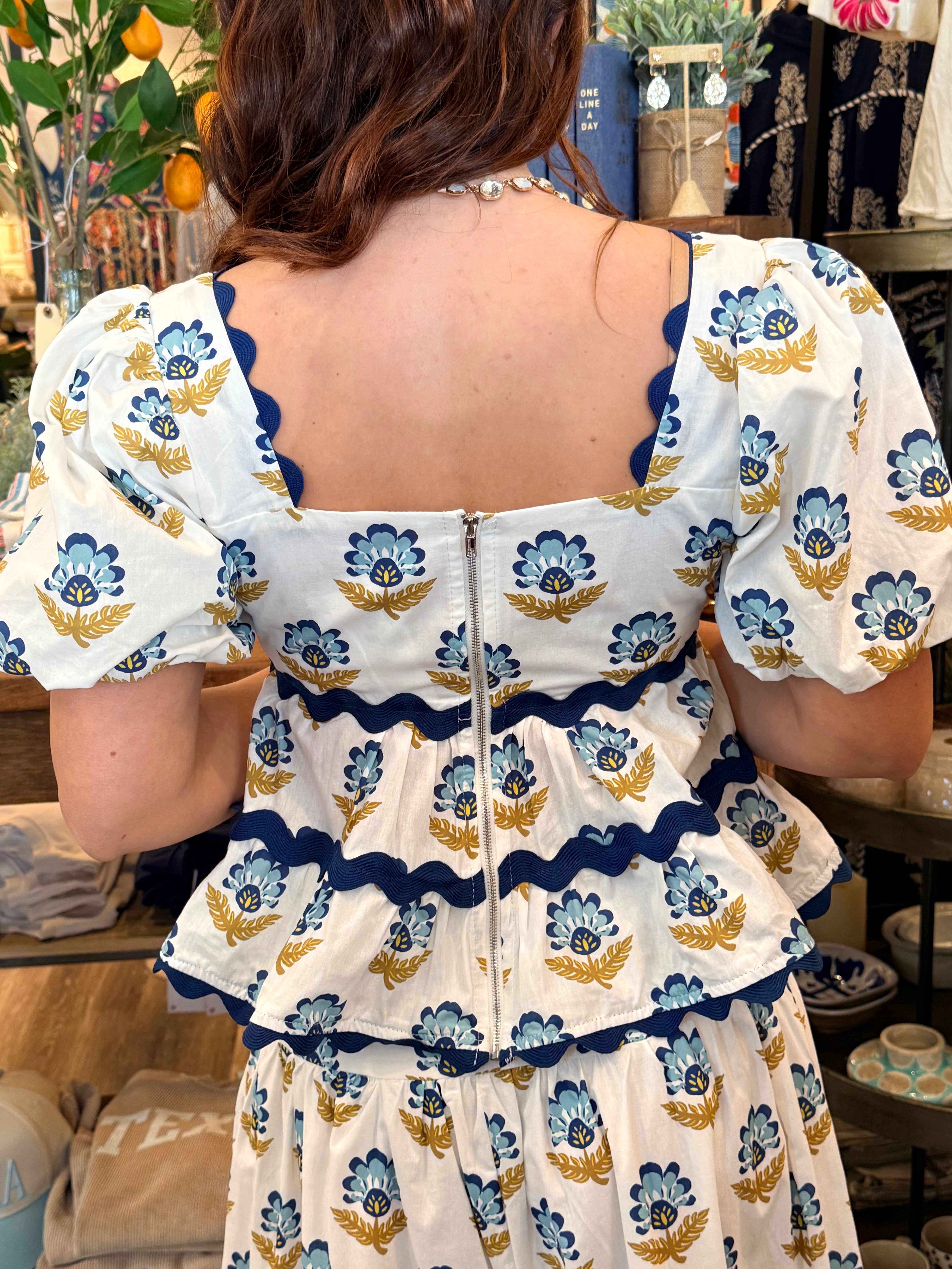 Designed to make a statement, the Margot Floral Peplum Top features a beautiful floral print with layered ruffle tiers trimmed in bold contrast ric-rac detailing. Puff sleeves and a square neckline with scalloped edging add a romantic touch, while the peplum silhouette creates an effortlessly flattering shape. Finished with a concealed zipper at the back for a clean, polished look. Pair it with the matching Margot Skirt for a complete set (sold separately).