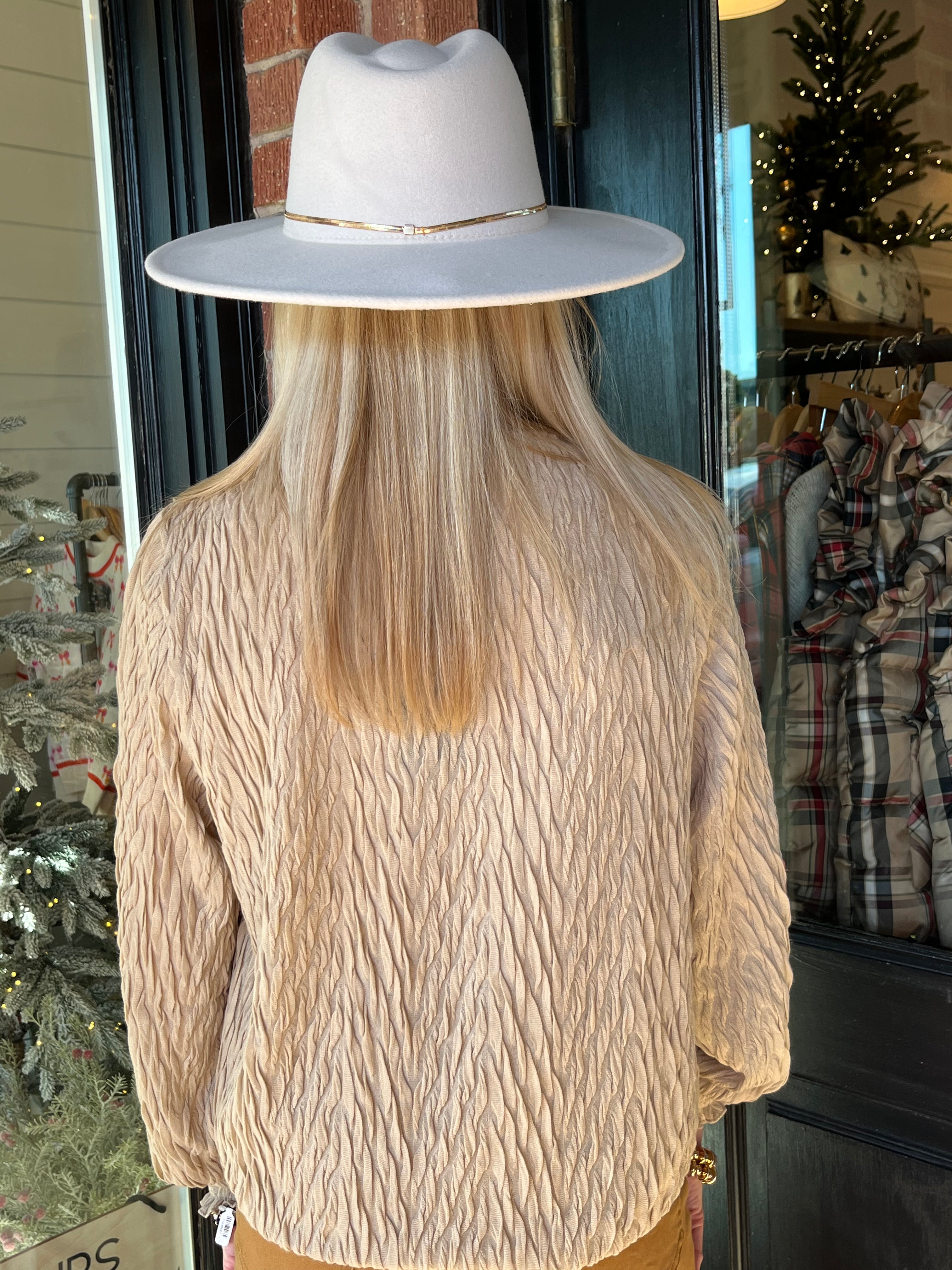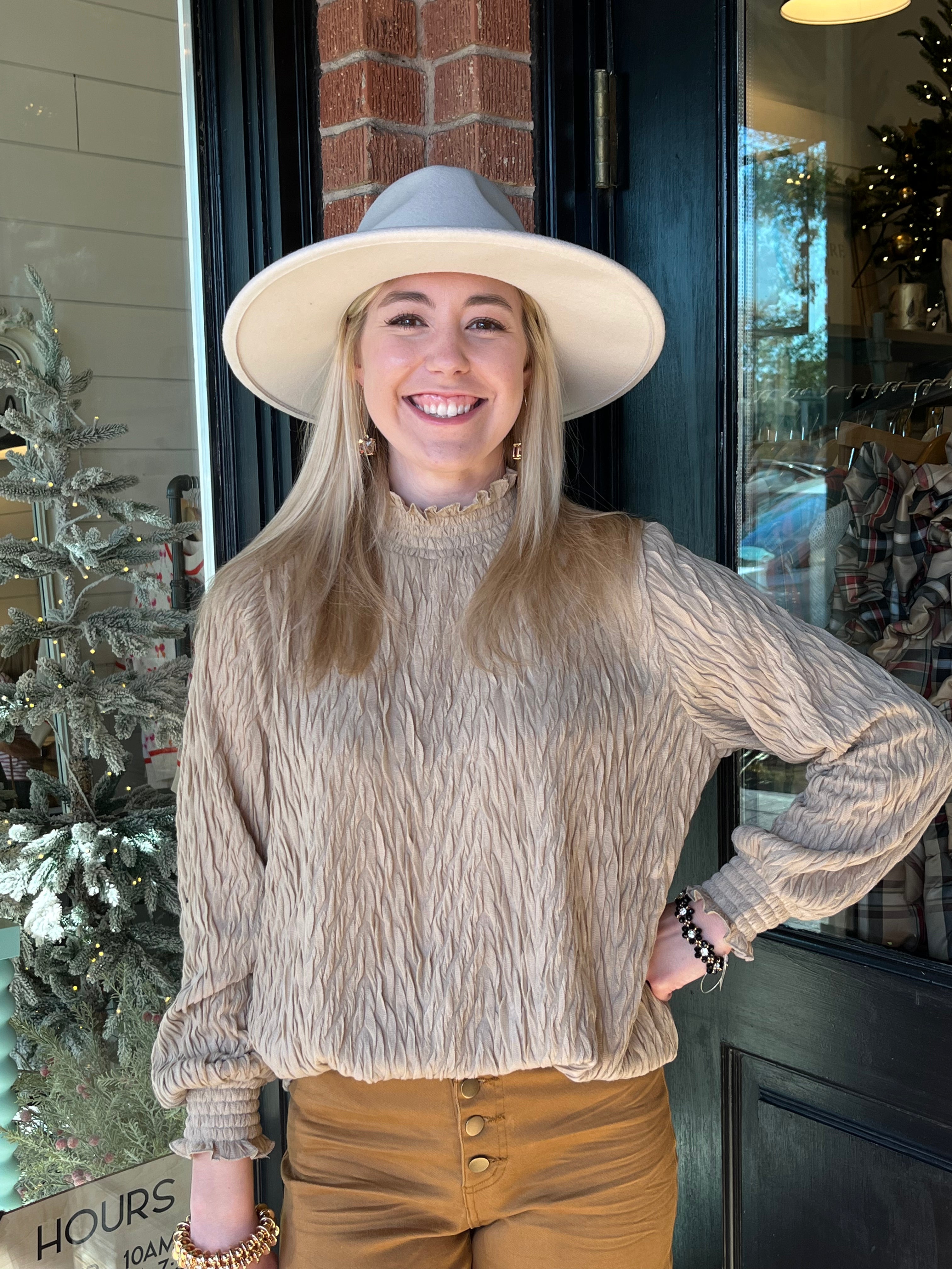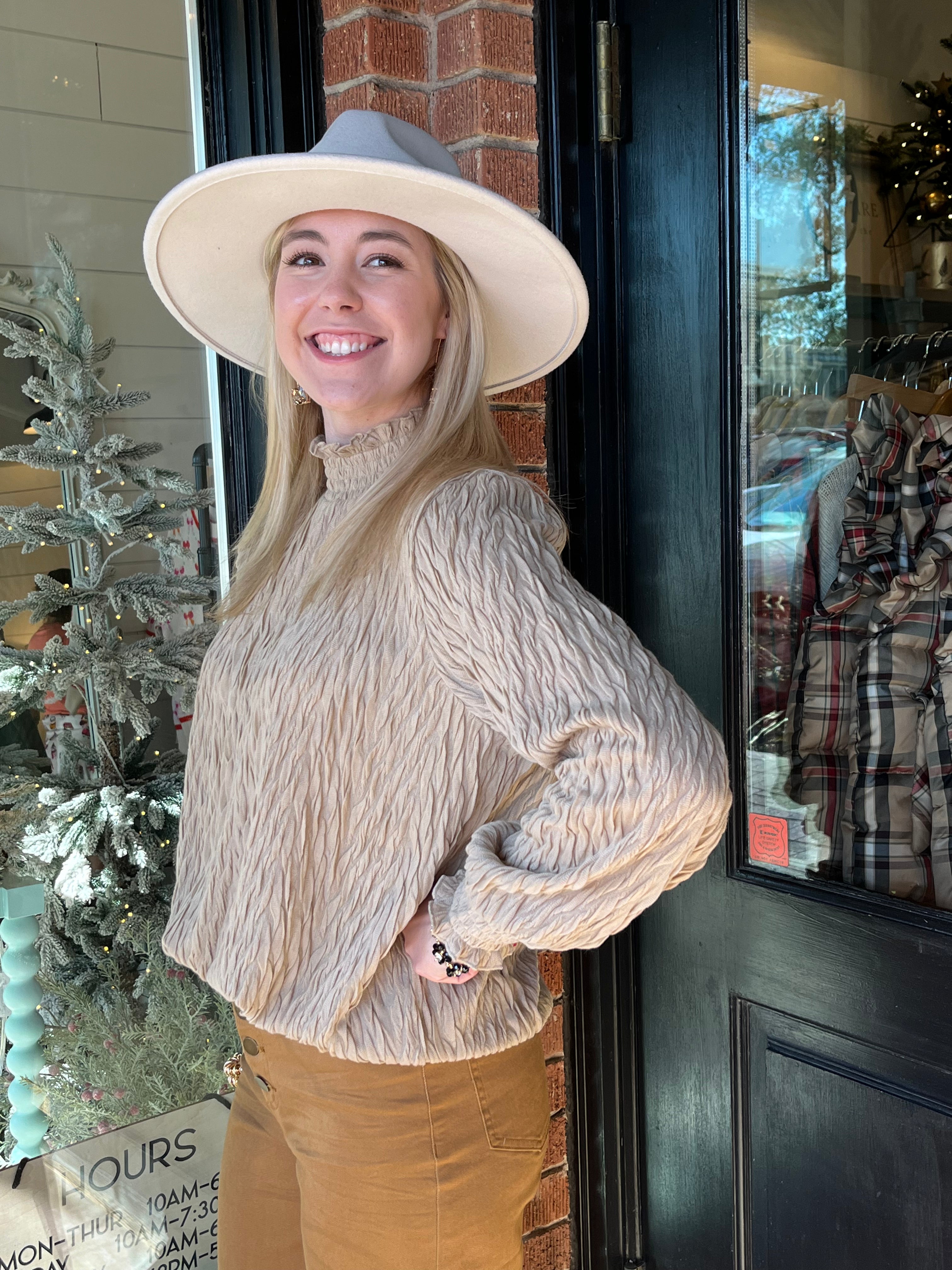 Elevate your style with our Marilyn Crinkled Top. Made with a unique textured fabric in a chic beige shade, this top features a high neckline and relaxed fit for a perfect balance of sophistication and comfort. Pair it with trousers or jeans to add a refined touch to any outfit.