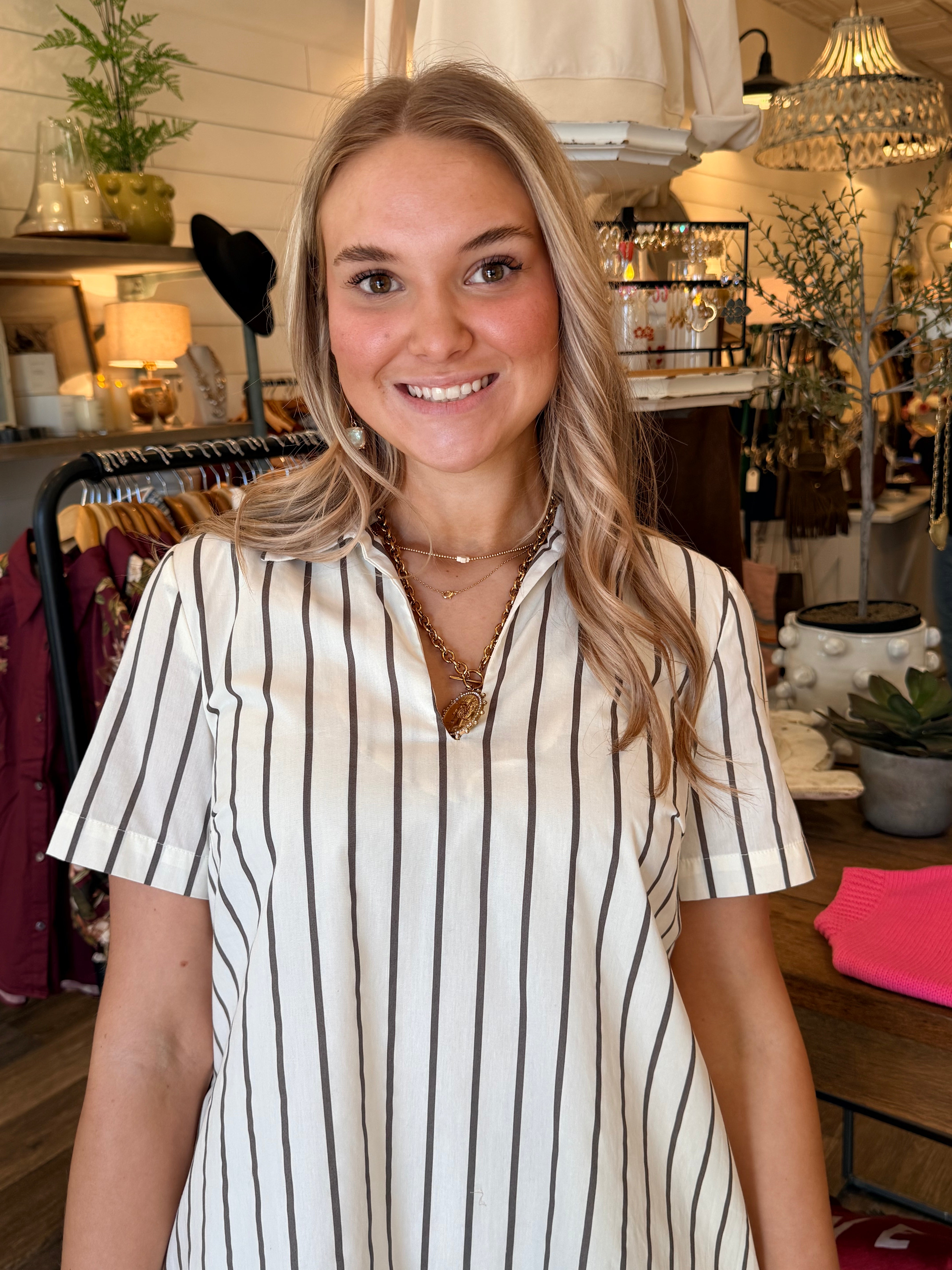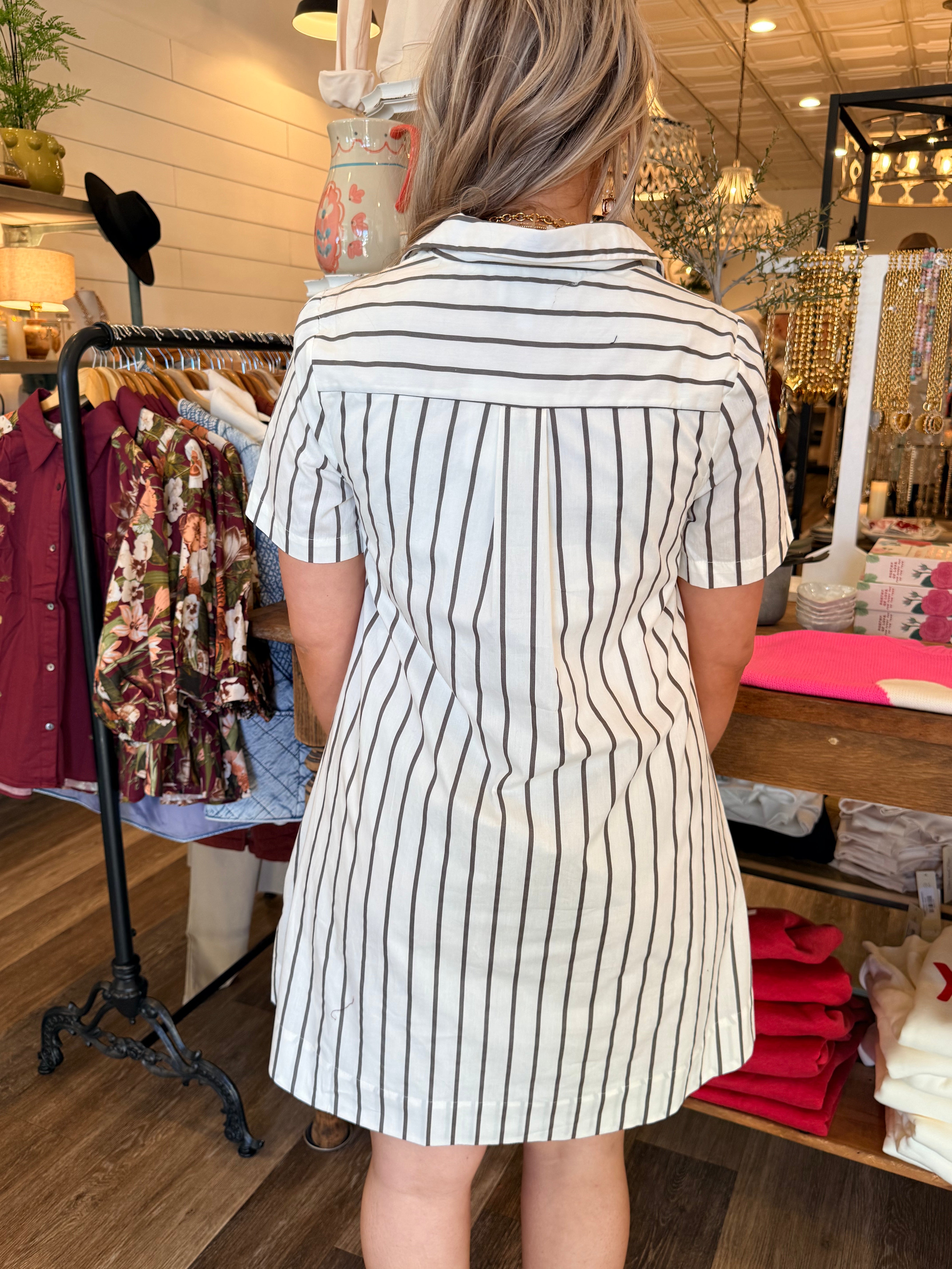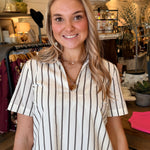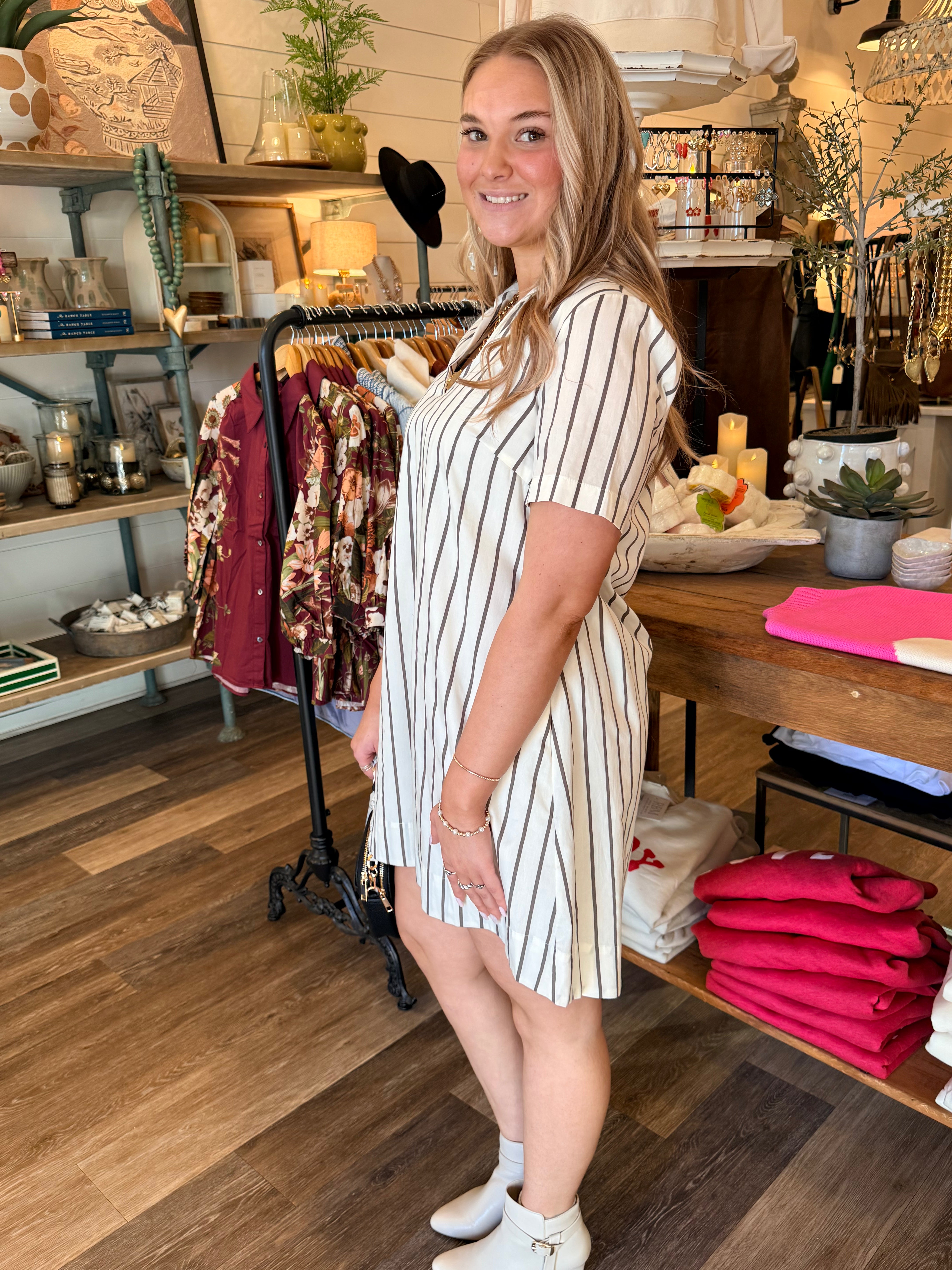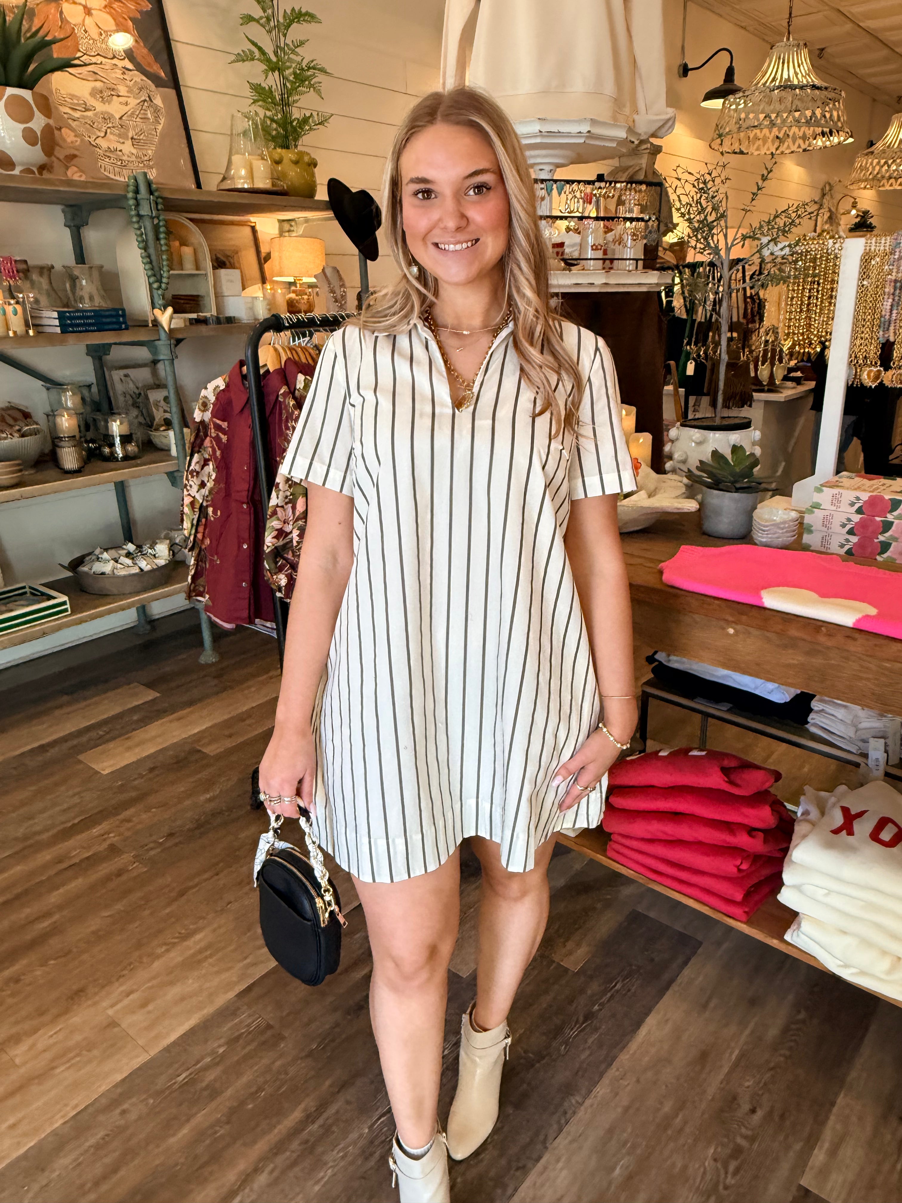 The Marlowe Striped Shift Mini Dress is an easy, go-anywhere piece you’ll reach for again and again. Designed with a modern collared V-neckline and short sleeves, this striped mini dress features a relaxed A-line shift silhouette that drapes beautifully and keeps things comfortable all day long. The crisp “Marshmallow” colorway gives it a fresh, timeless feel that works from season to season.