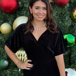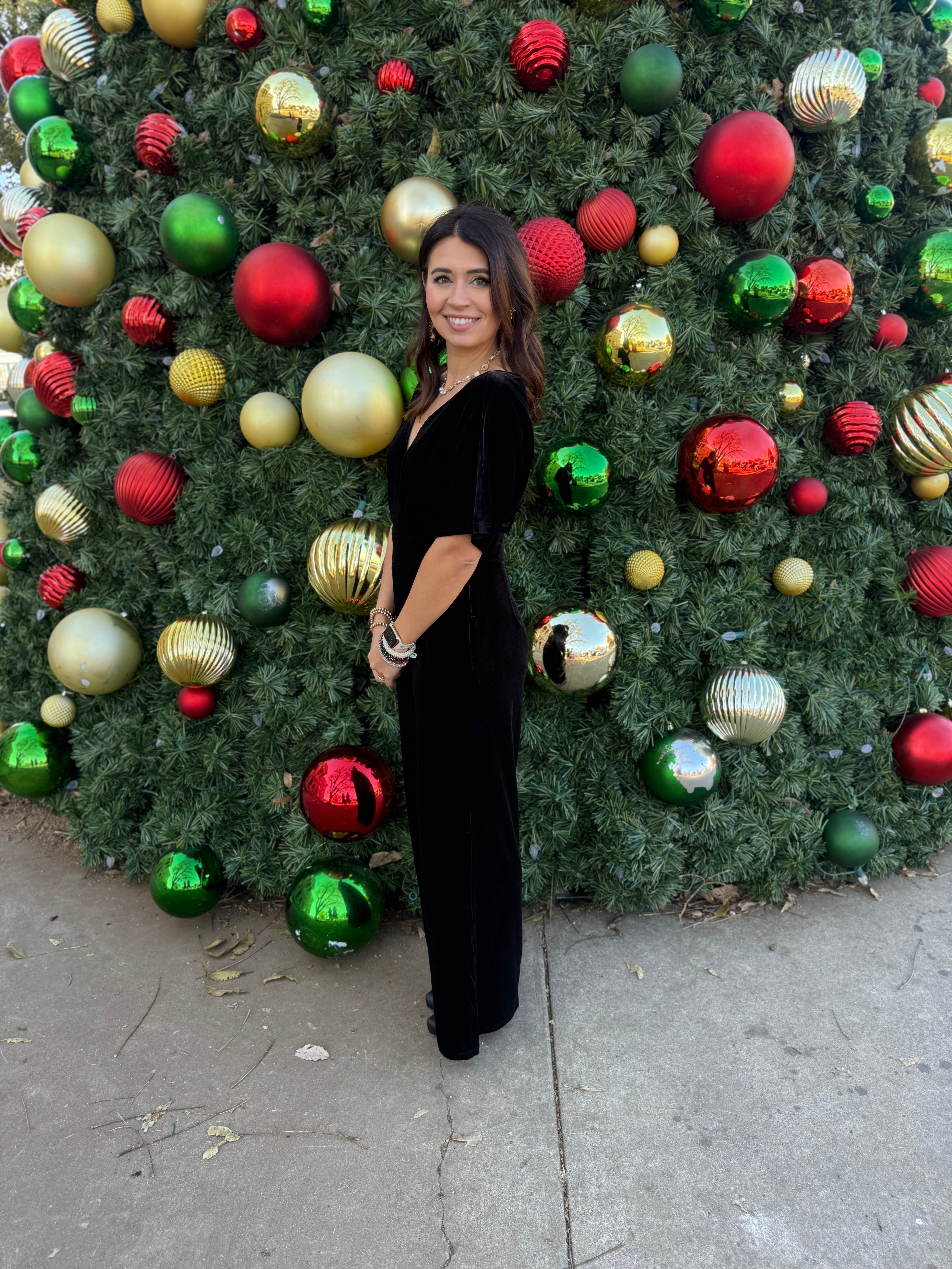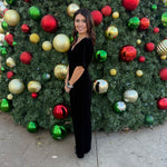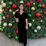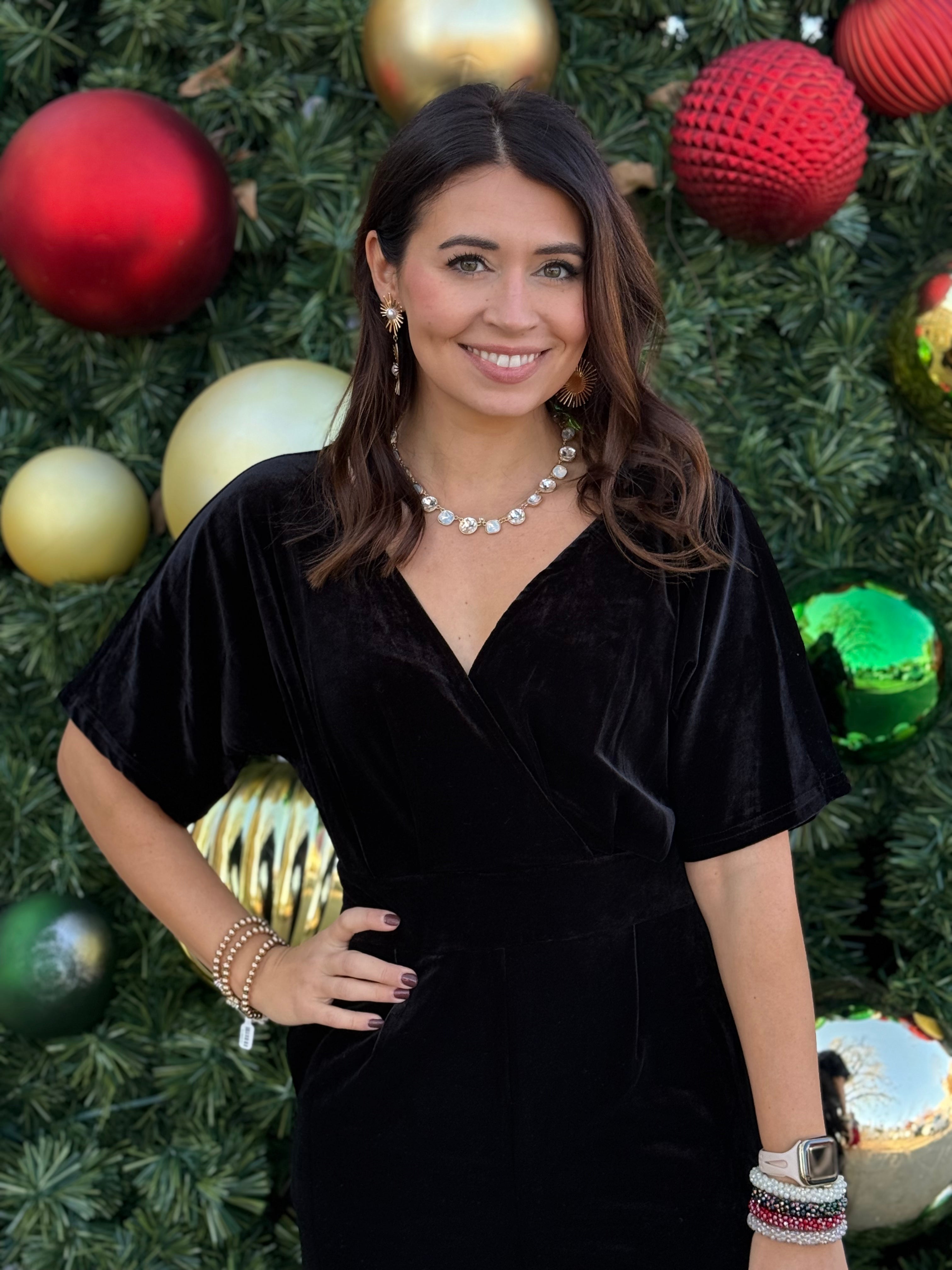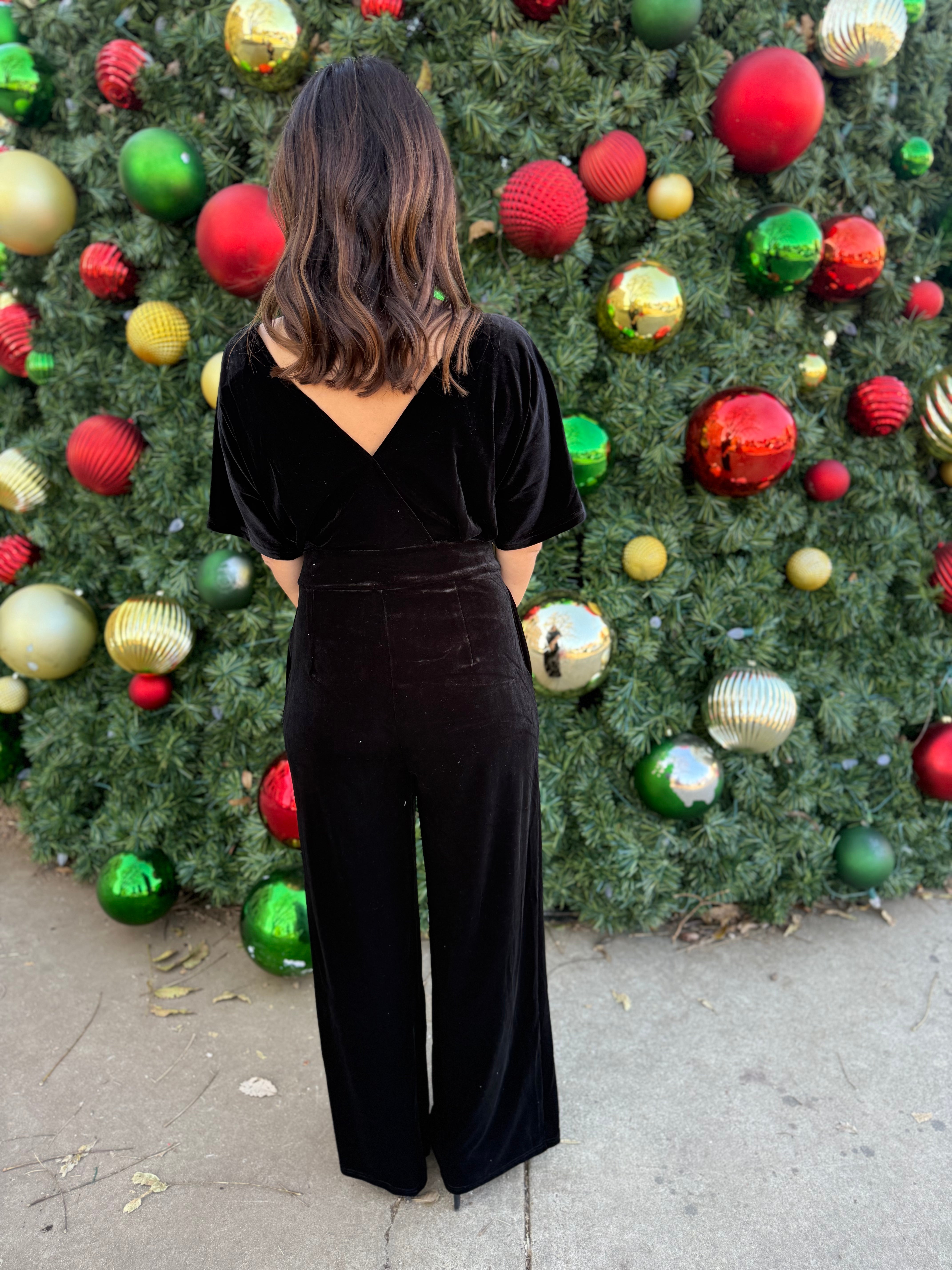 Crafted from luxurious velvet with a surplice neckline and flattering waistline, this one-piece wonder combines comfort with chic style. Side pockets and a relaxed leg silhouette make it as practical as it is polished — perfect for holiday gatherings, date nights, or evenings out on the Square.