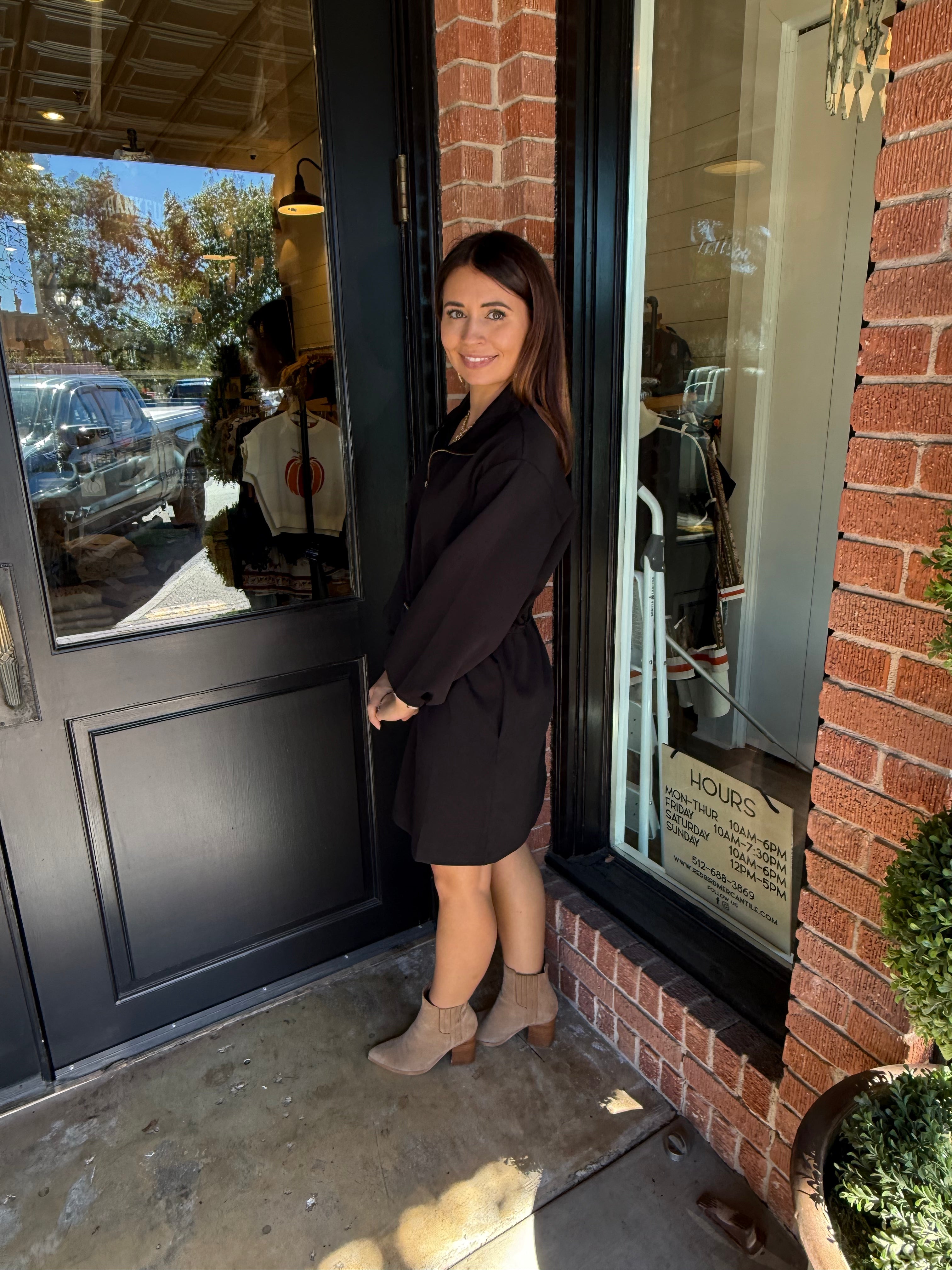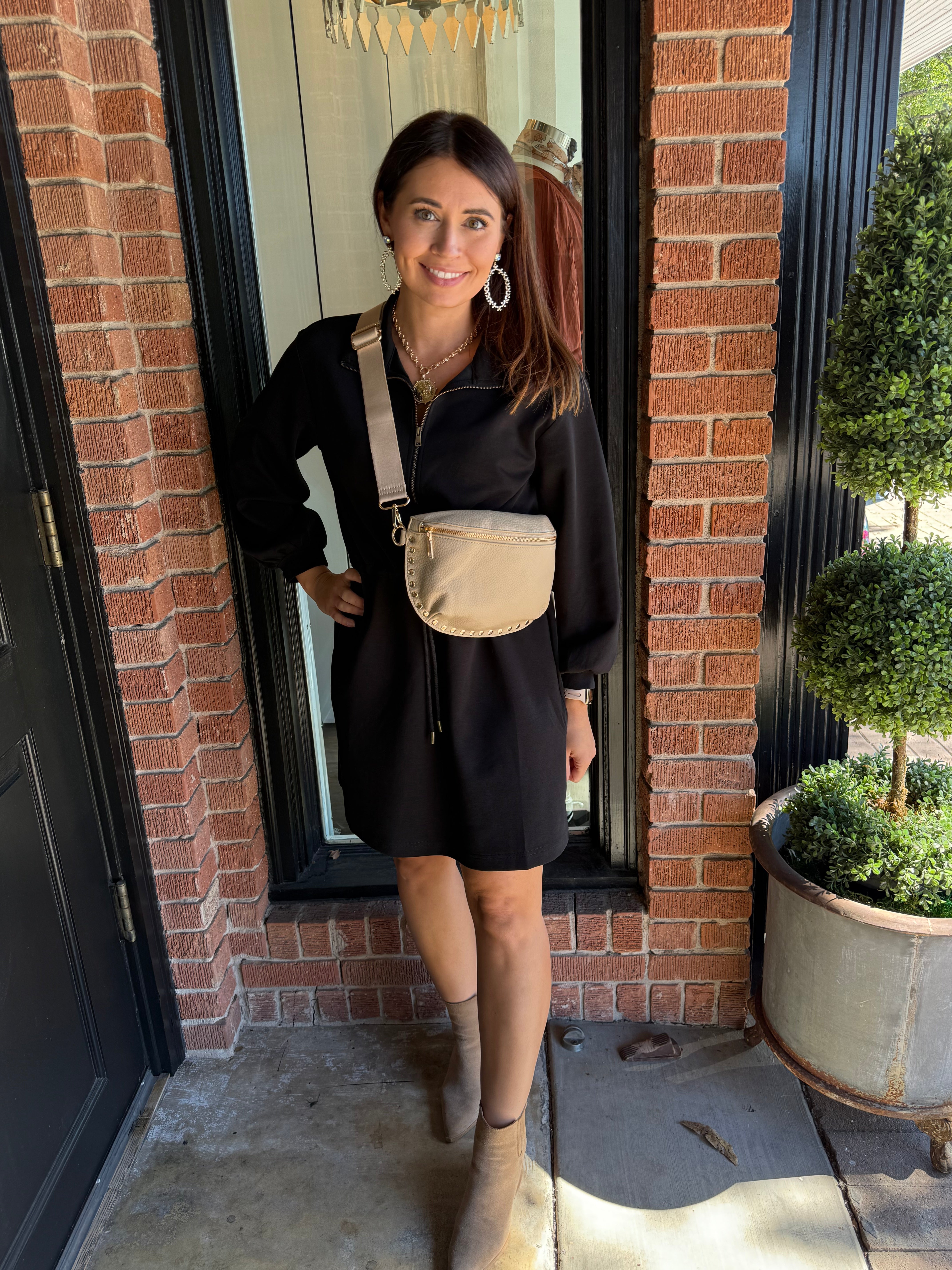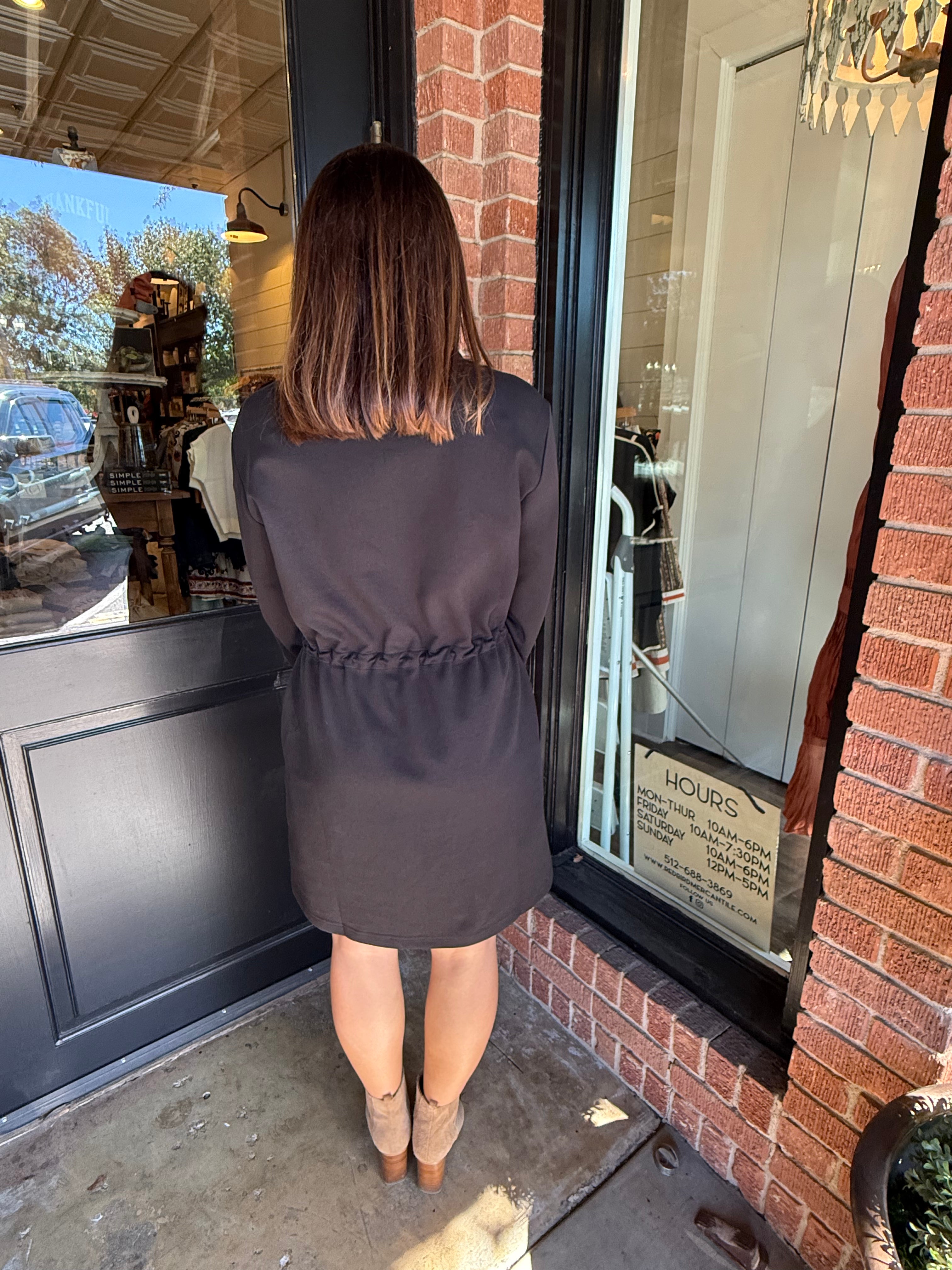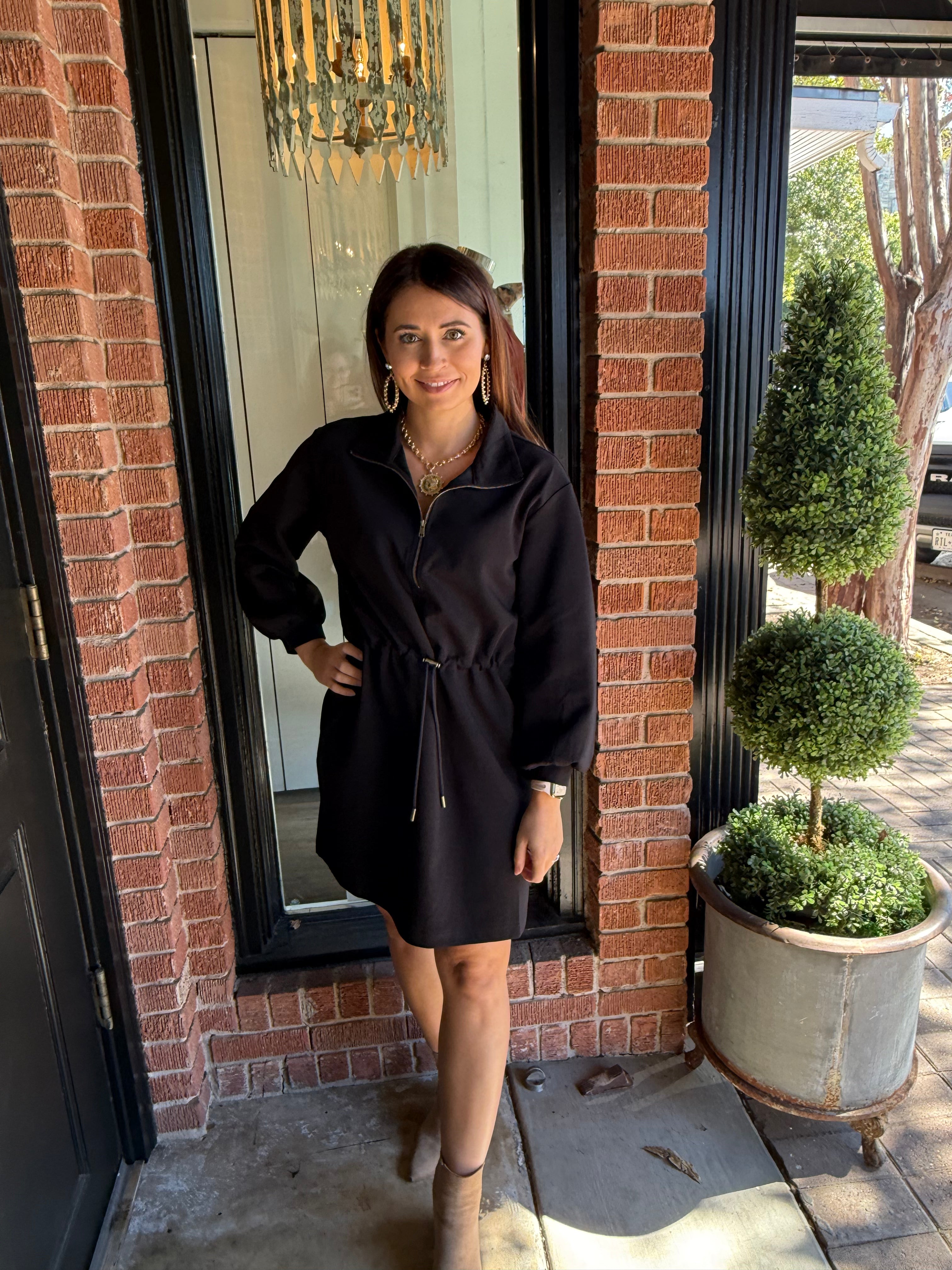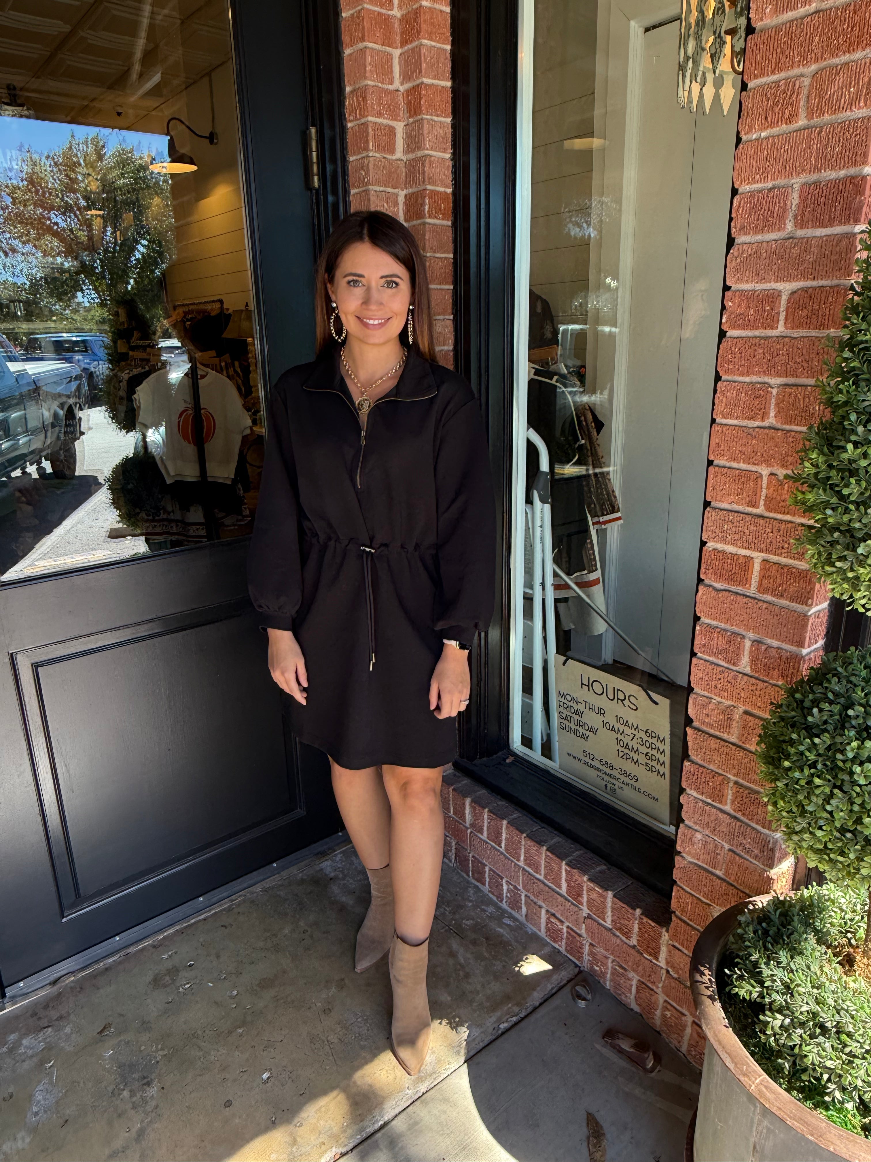 Effortless meets sporty-chic in the Melinda Black Knit Dress. This cozy mini dress features a soft knit fabric, flattering drawstring waist, and functional side pockets — because style should always meet comfort. With a zip-up neckline and long sleeves, it’s perfect for cool days, travel, or casual nights out.