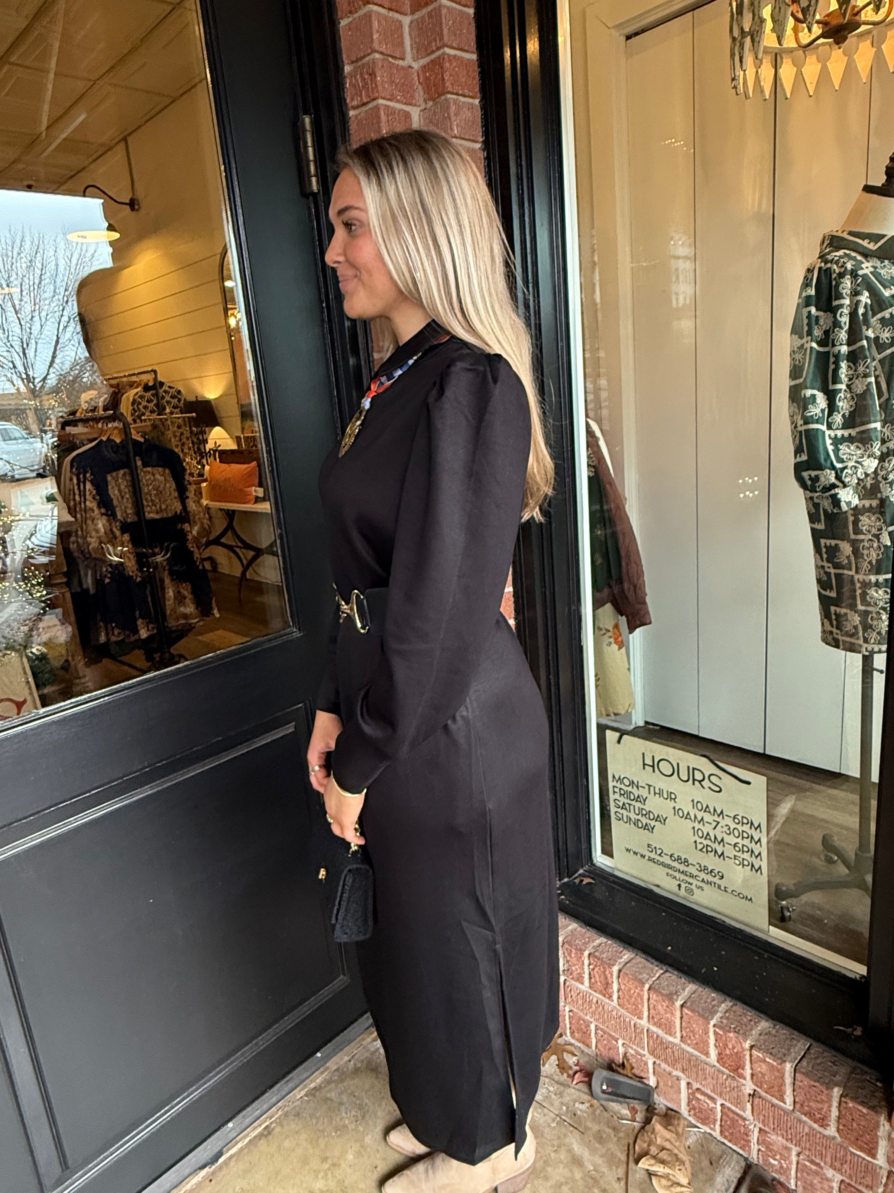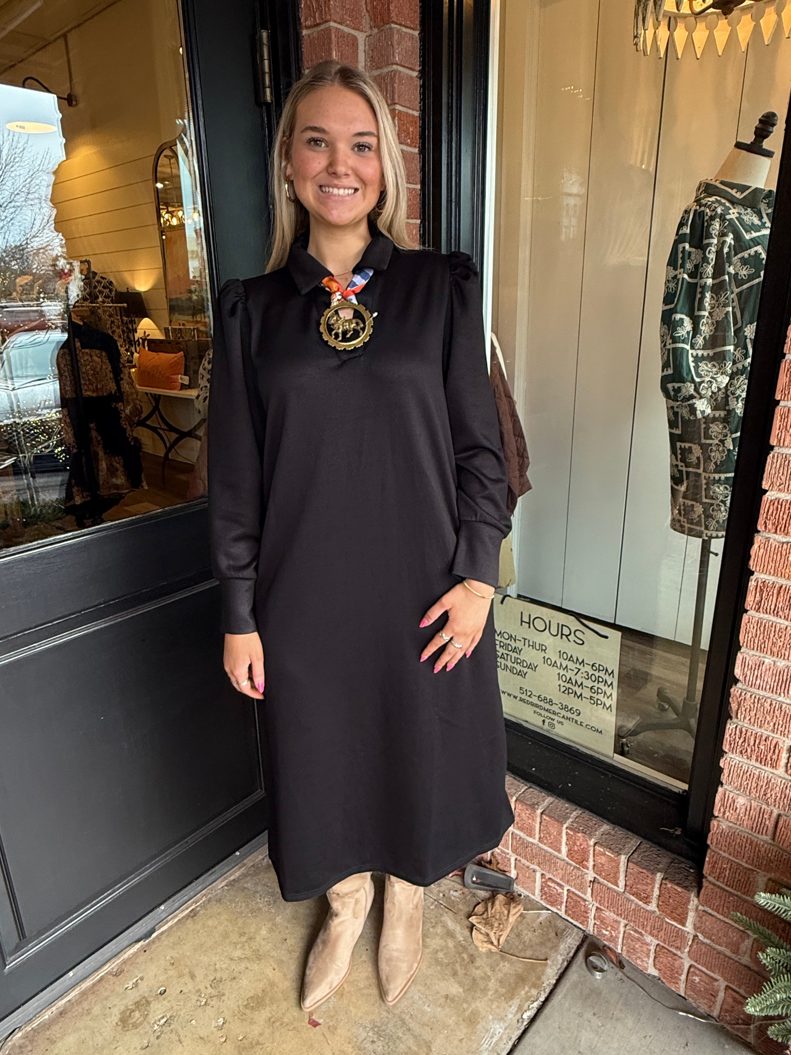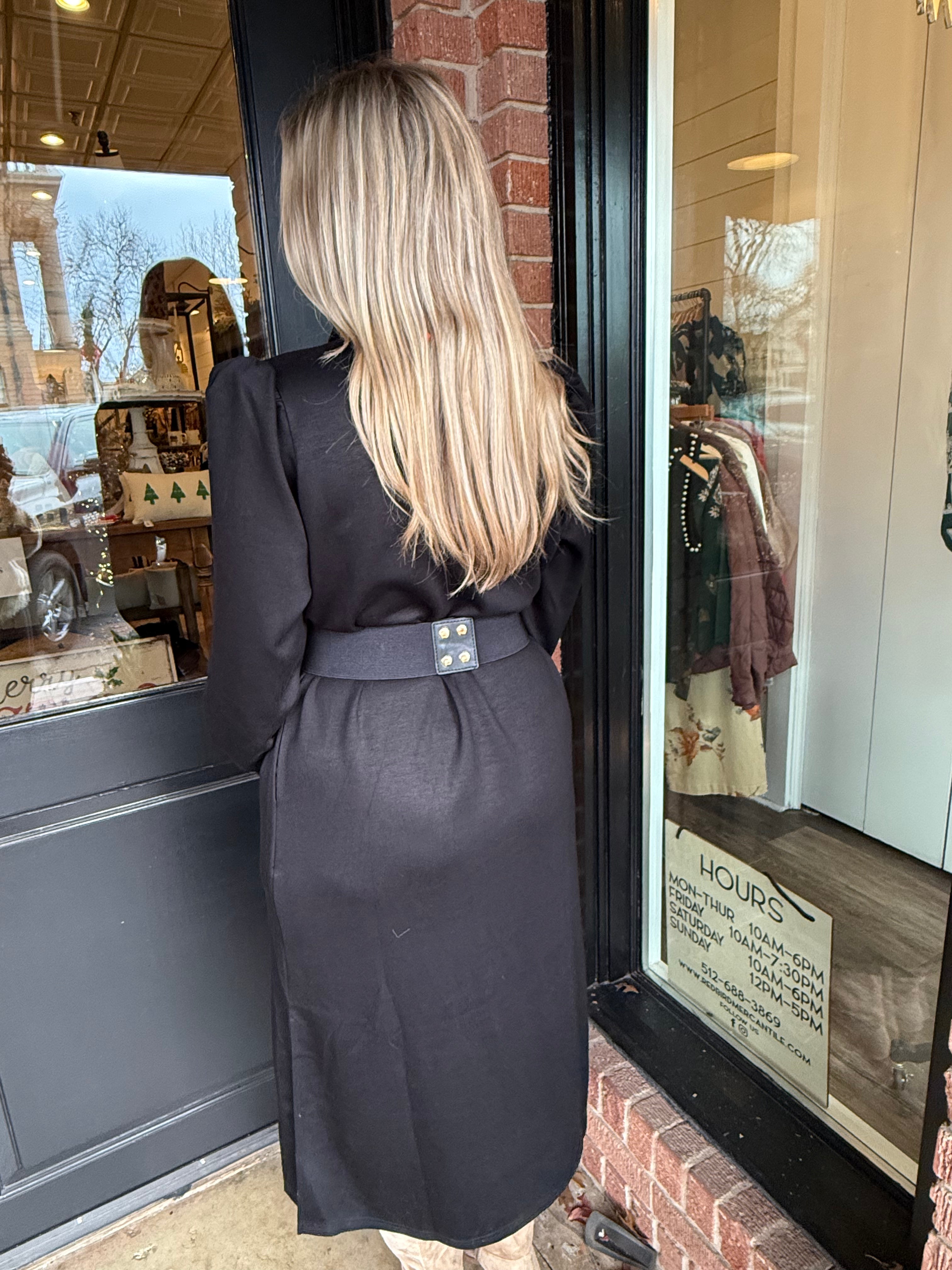 Classic, flattering, and easy to wear—the Milly Black Midi Dress is a must-have for effortless styling. Designed with long sleeves and a v-neck collar, this dress offers a polished look with just the right amount of stretch for all-day comfort. Dress it up with heels or keep it casual with boots or flats.