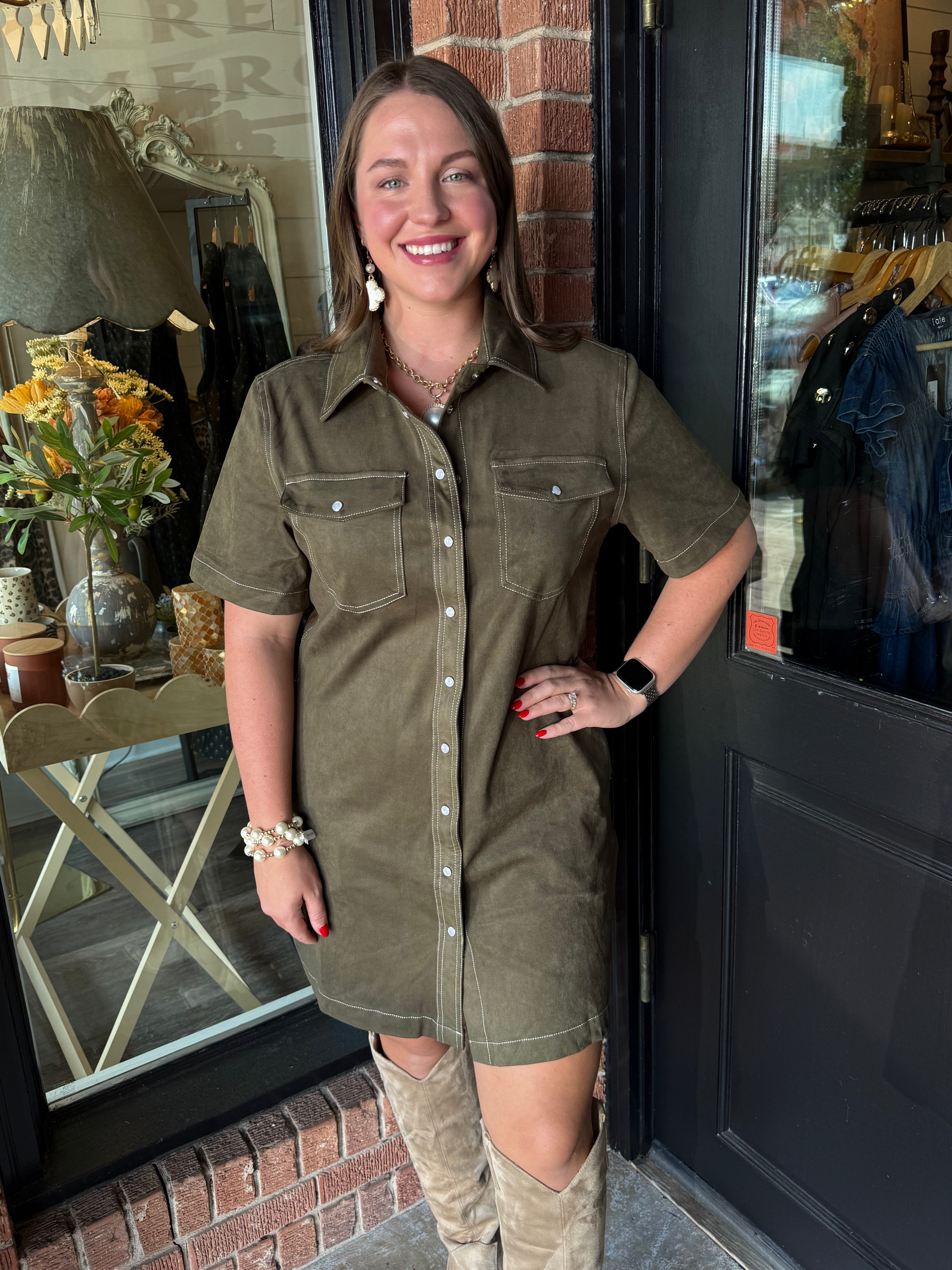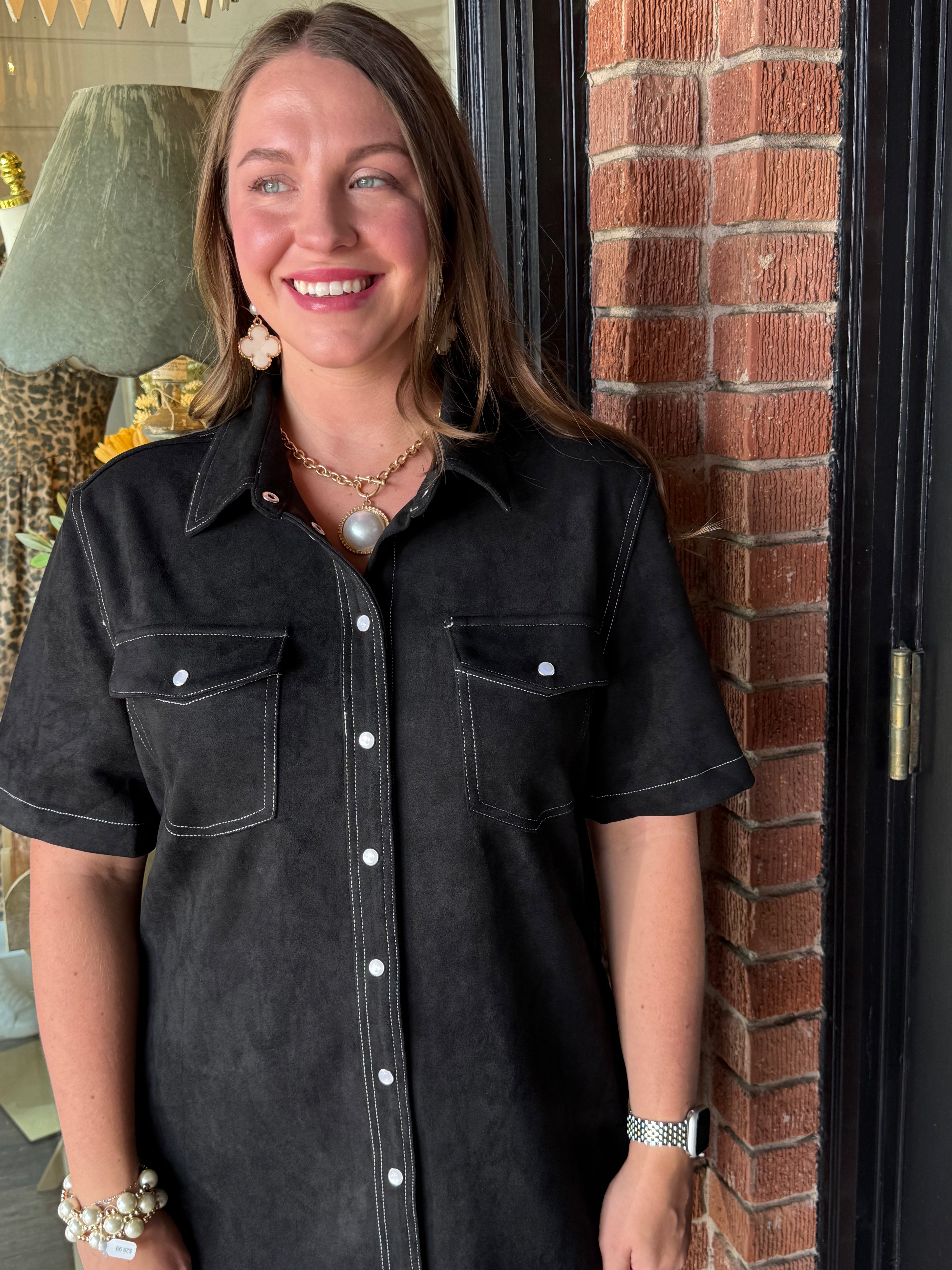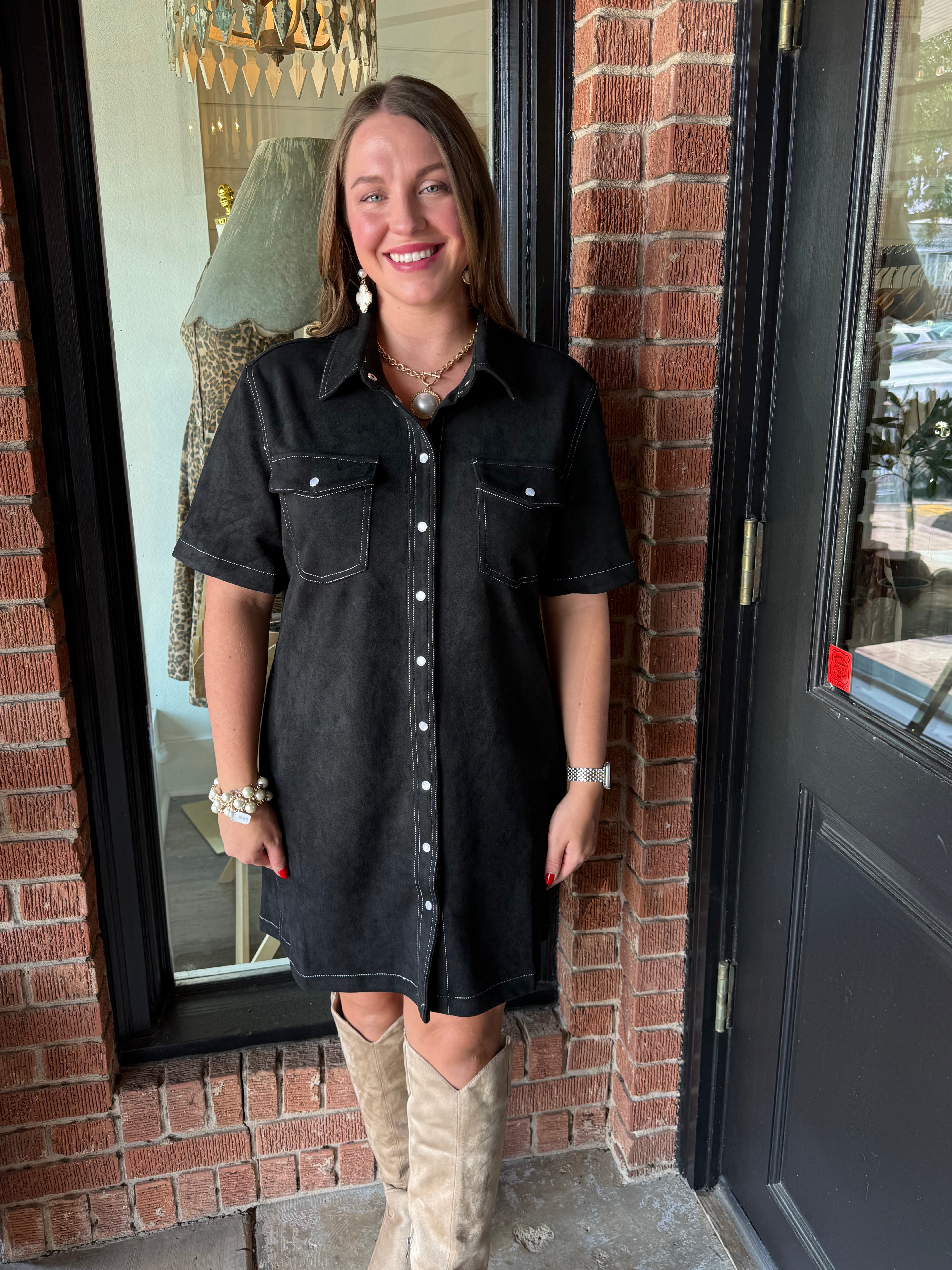 Effortlessly chic, the Miranda Dress brings timeless style with modern functionality. Crafted in soft suede, this button-up dress features short sleeves, a flattering A-line silhouette, and convenient side pockets—perfect for both casual days and polished outings.
