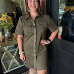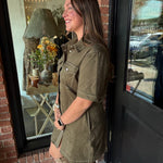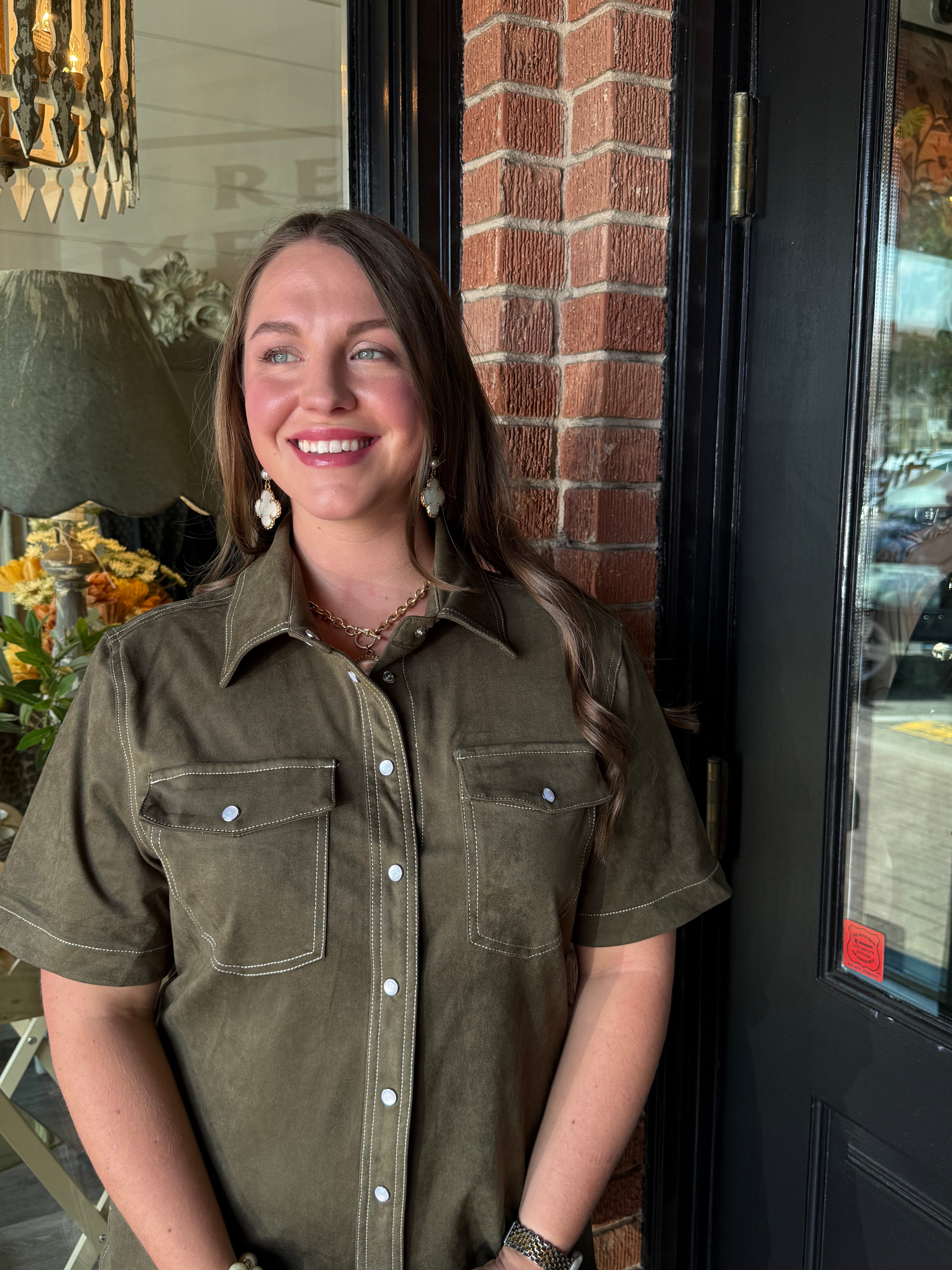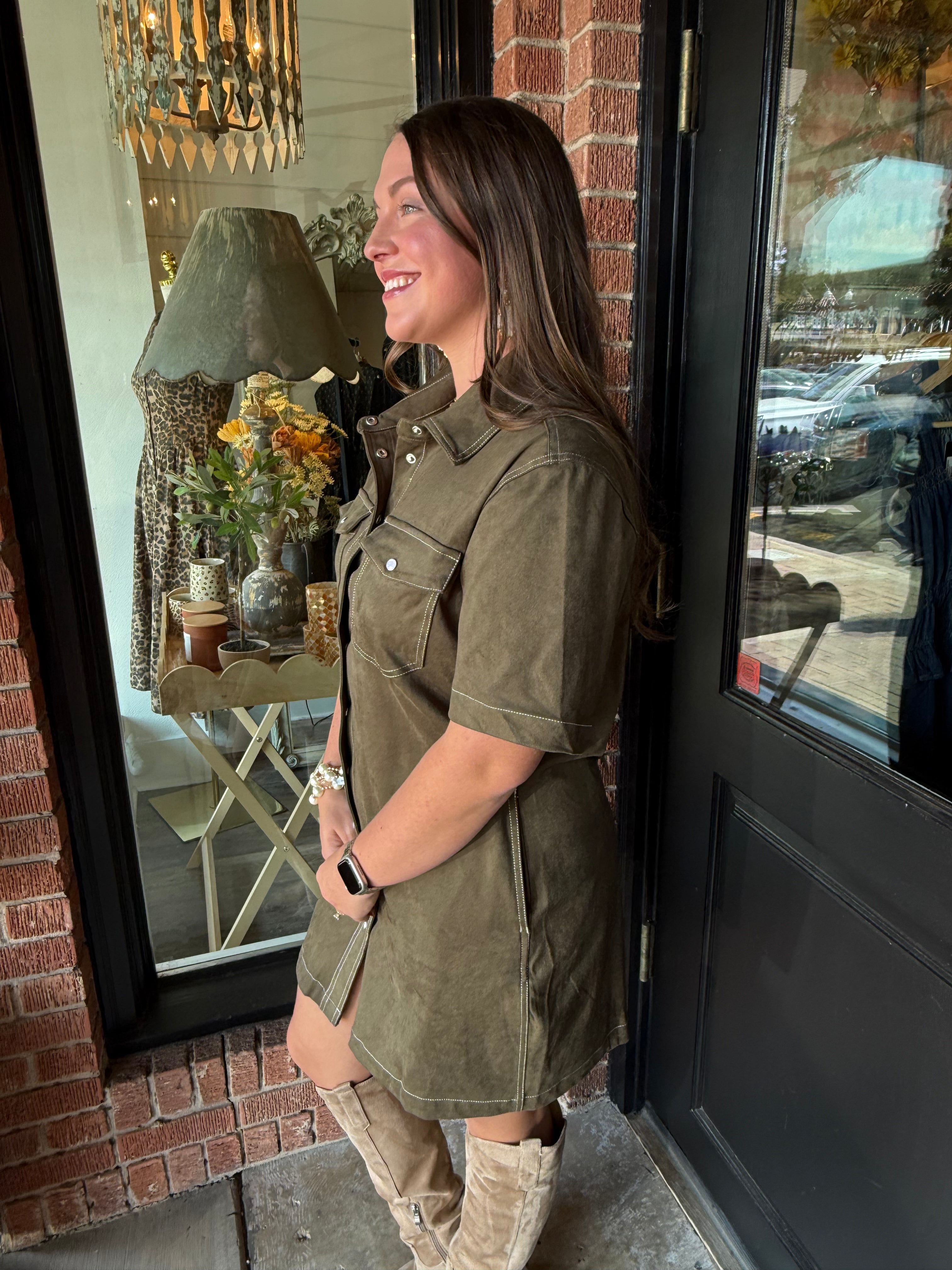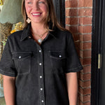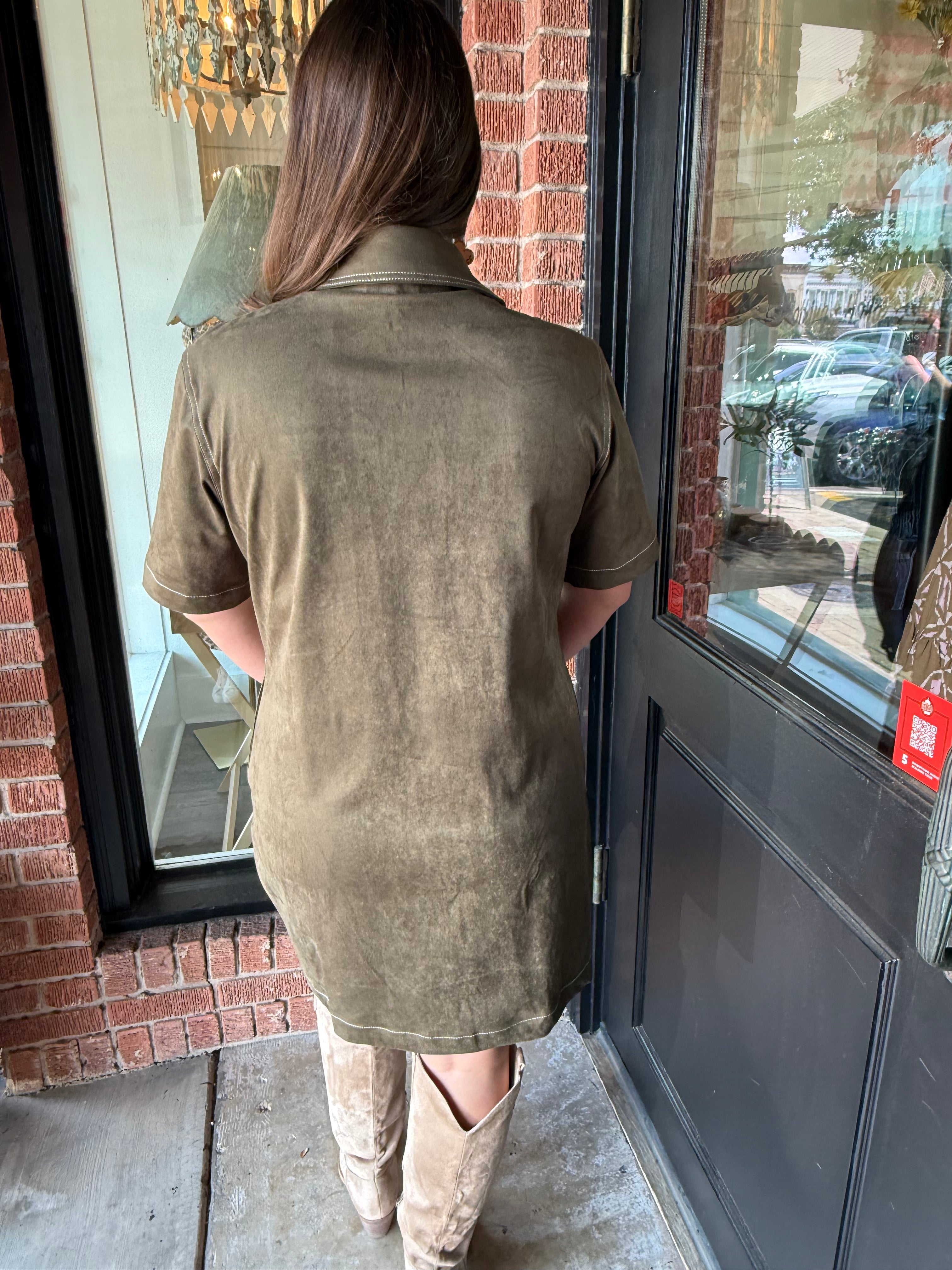 Effortlessly chic, the Miranda Dress brings timeless style with modern functionality. Crafted in soft suede, this button-up dress features short sleeves, a flattering A-line silhouette, and convenient side pockets—perfect for both casual days and polished outings.