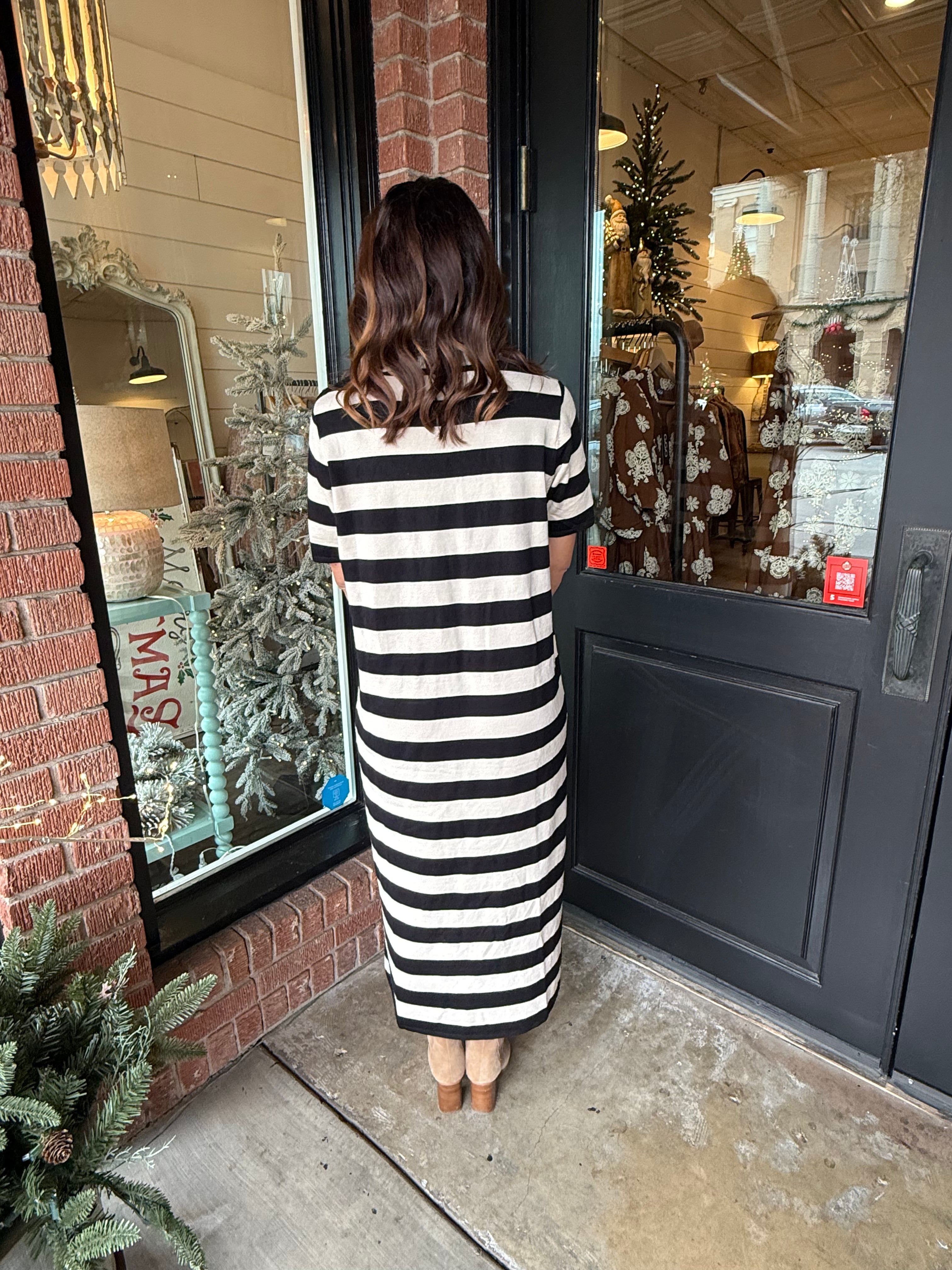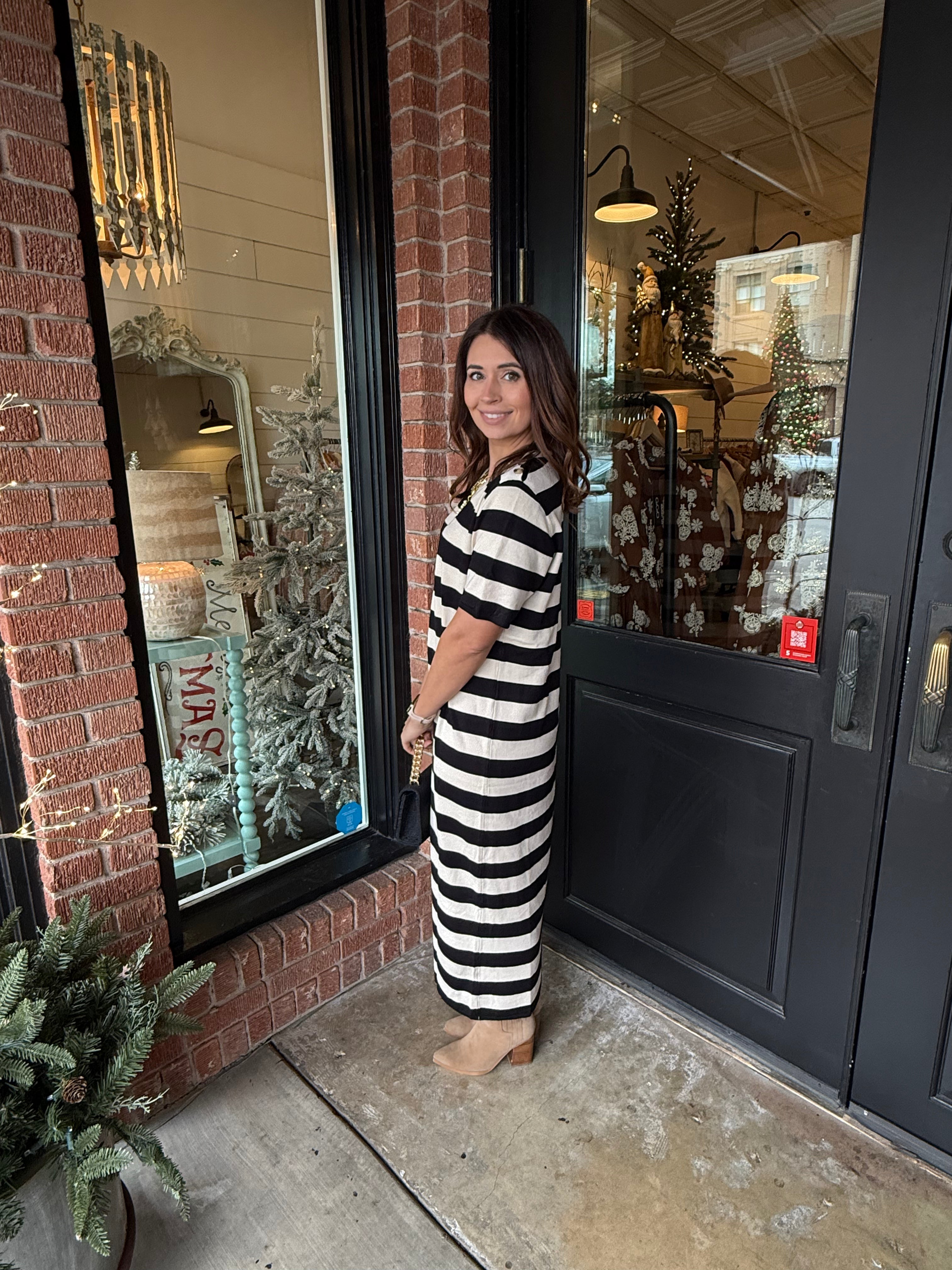Classic and comfortable with a touch of charm — the Nancy Striped Knit Dress is the perfect piece for effortless everyday style. 🤍 Featuring short sleeves, a round neckline, and chic shoulder button details, this lightweight knit dress offers a flattering, true-to-size fit. Easy to wear and easy to love, it’s your go-to for polished comfort all season long.