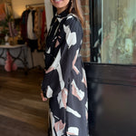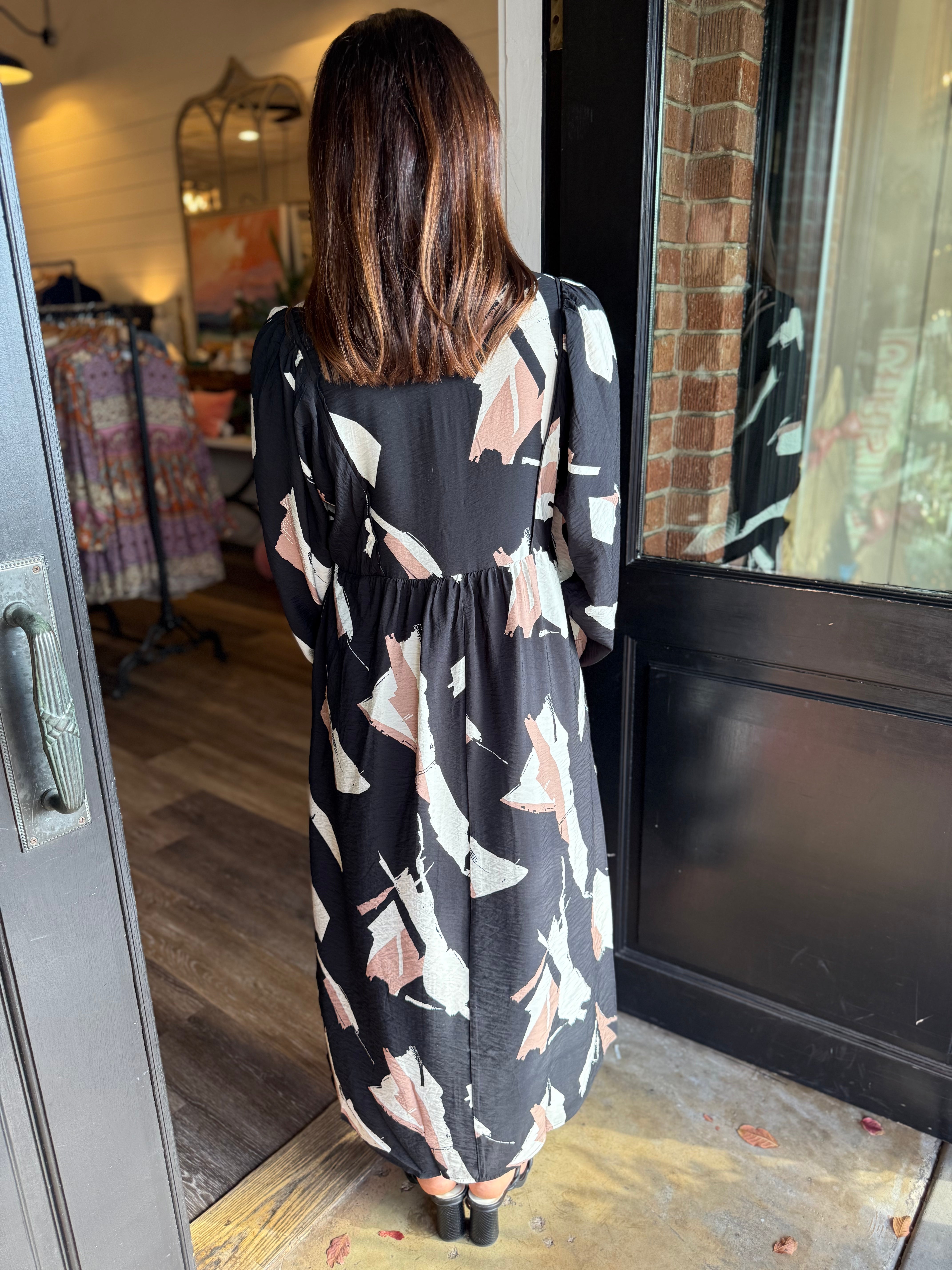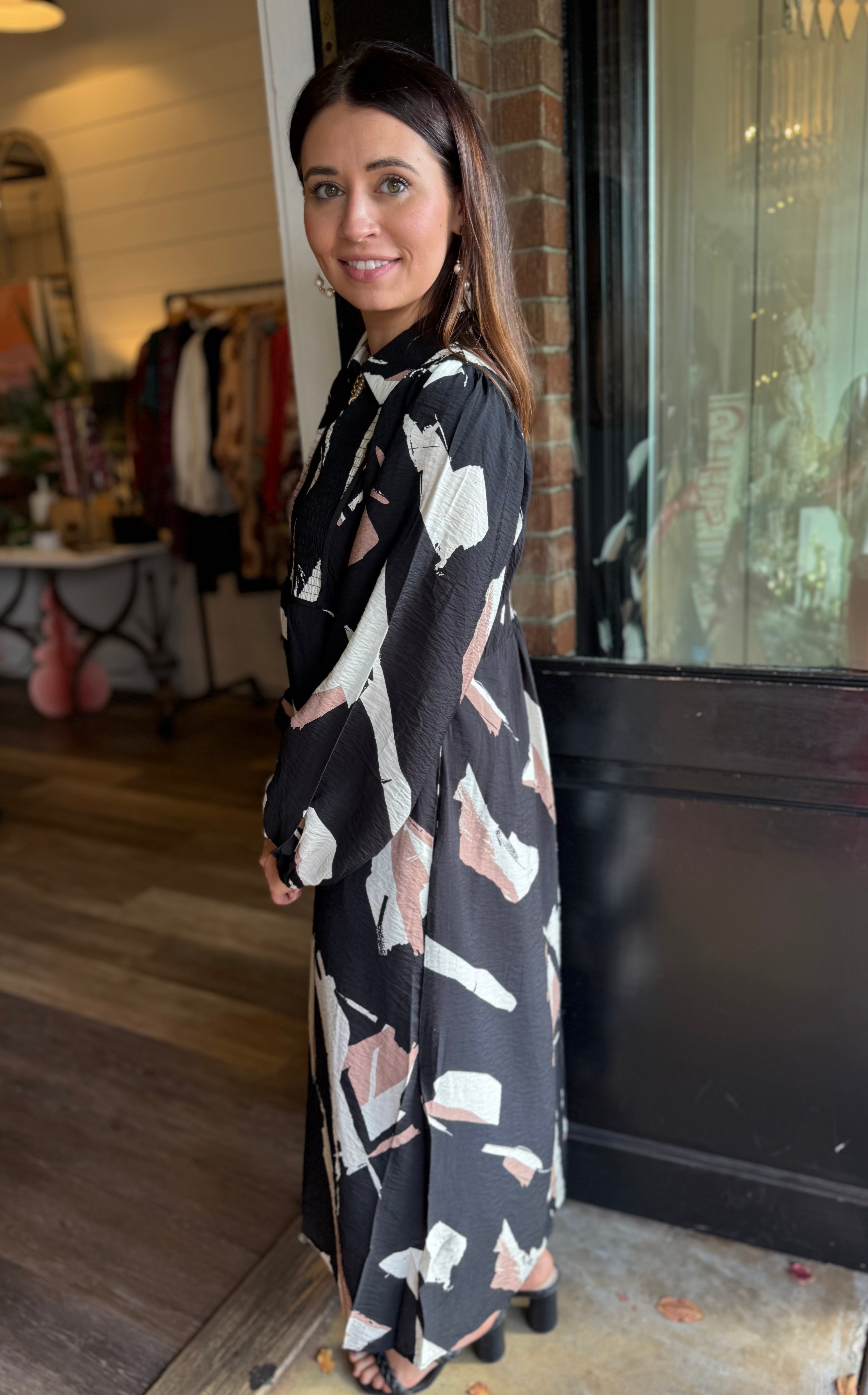 Chic, flowy, and full of modern elegance — this Neely Abstract Print Midi Dress is the effortless statement piece every wardrobe needs. Designed with a collared neckline and beautiful chest smocking detail, it creates a flattering, feminine shape while staying relaxed and comfortable. The dramatic long puff sleeves add soft volume, and the abstract print brings a bold, artistic touch to the look.