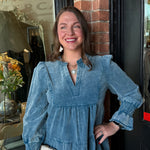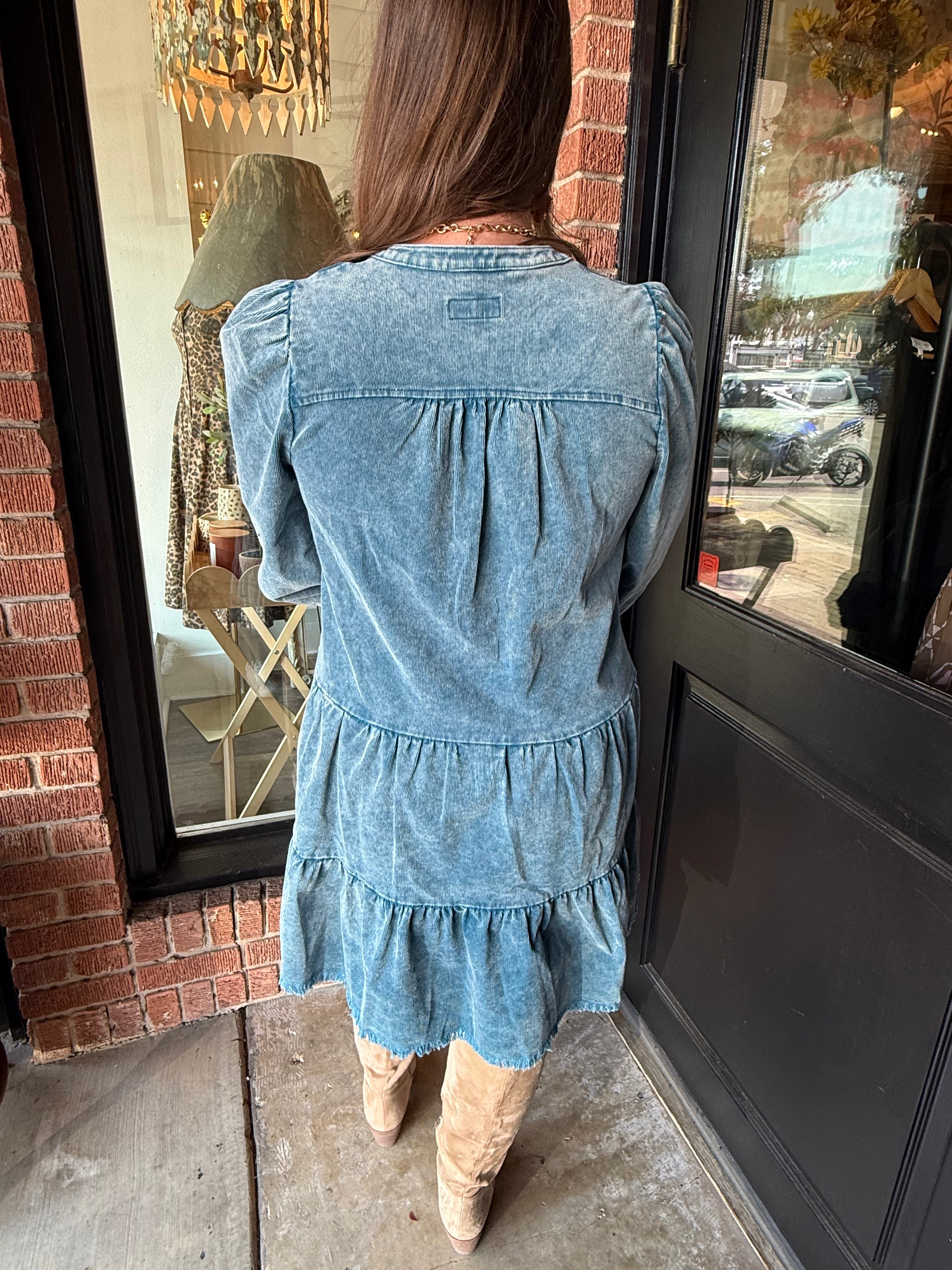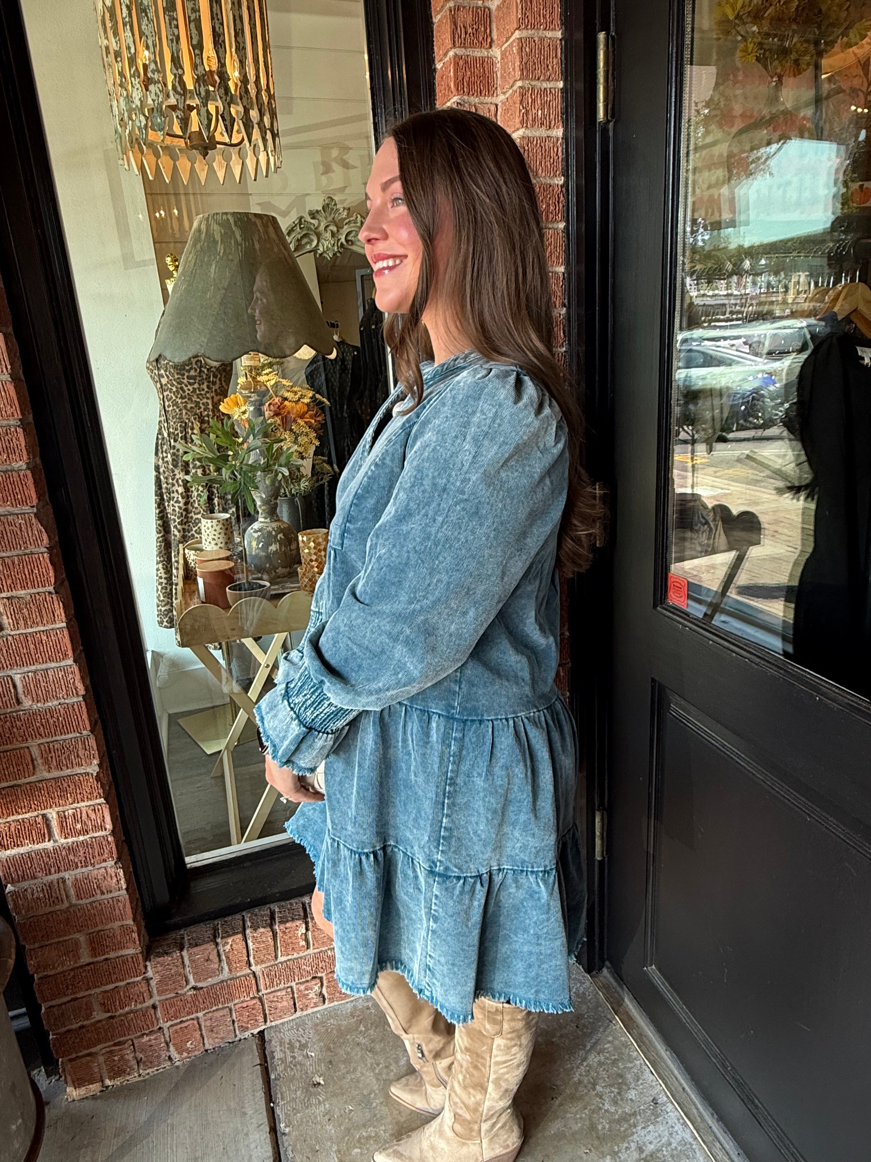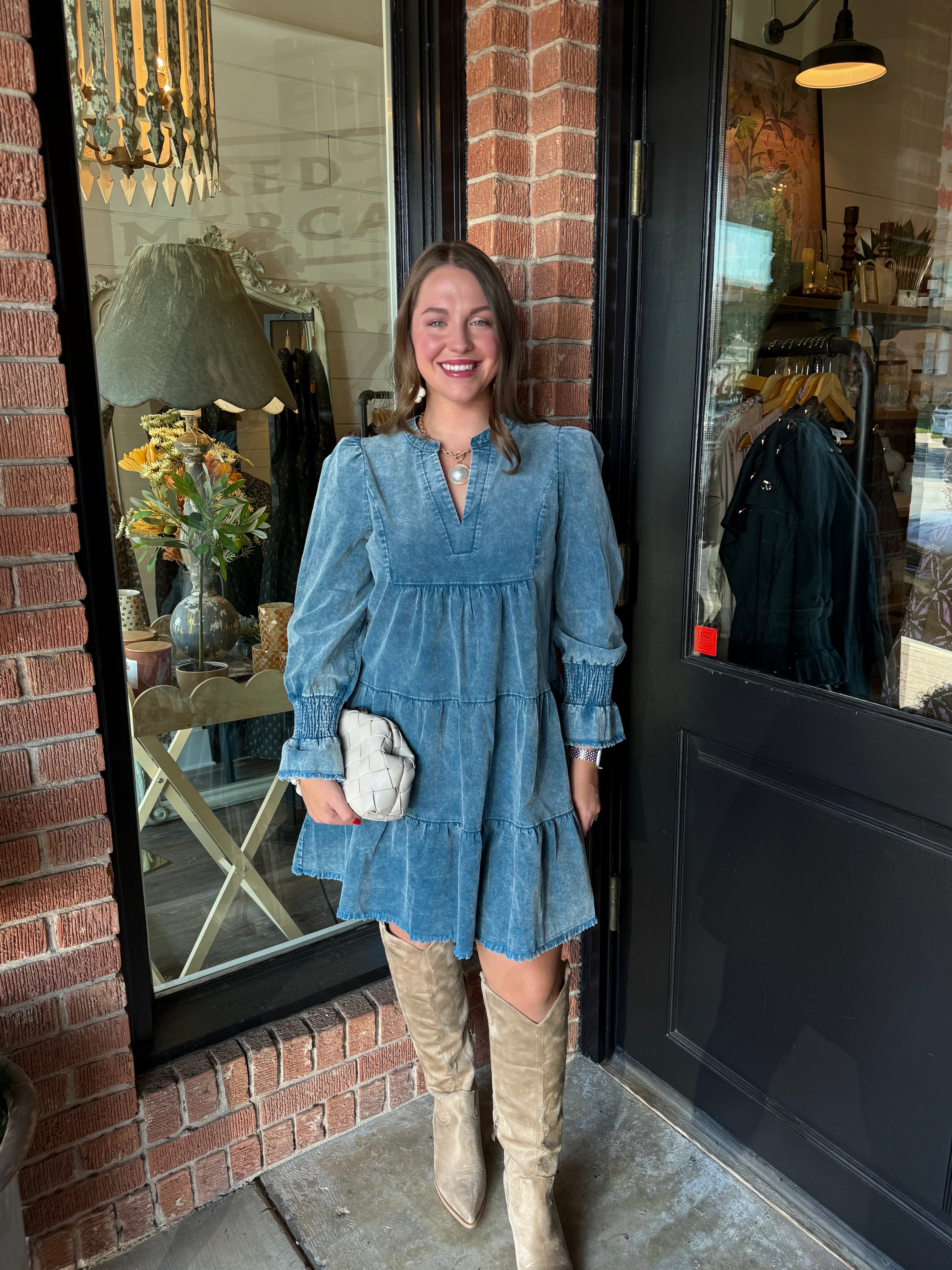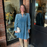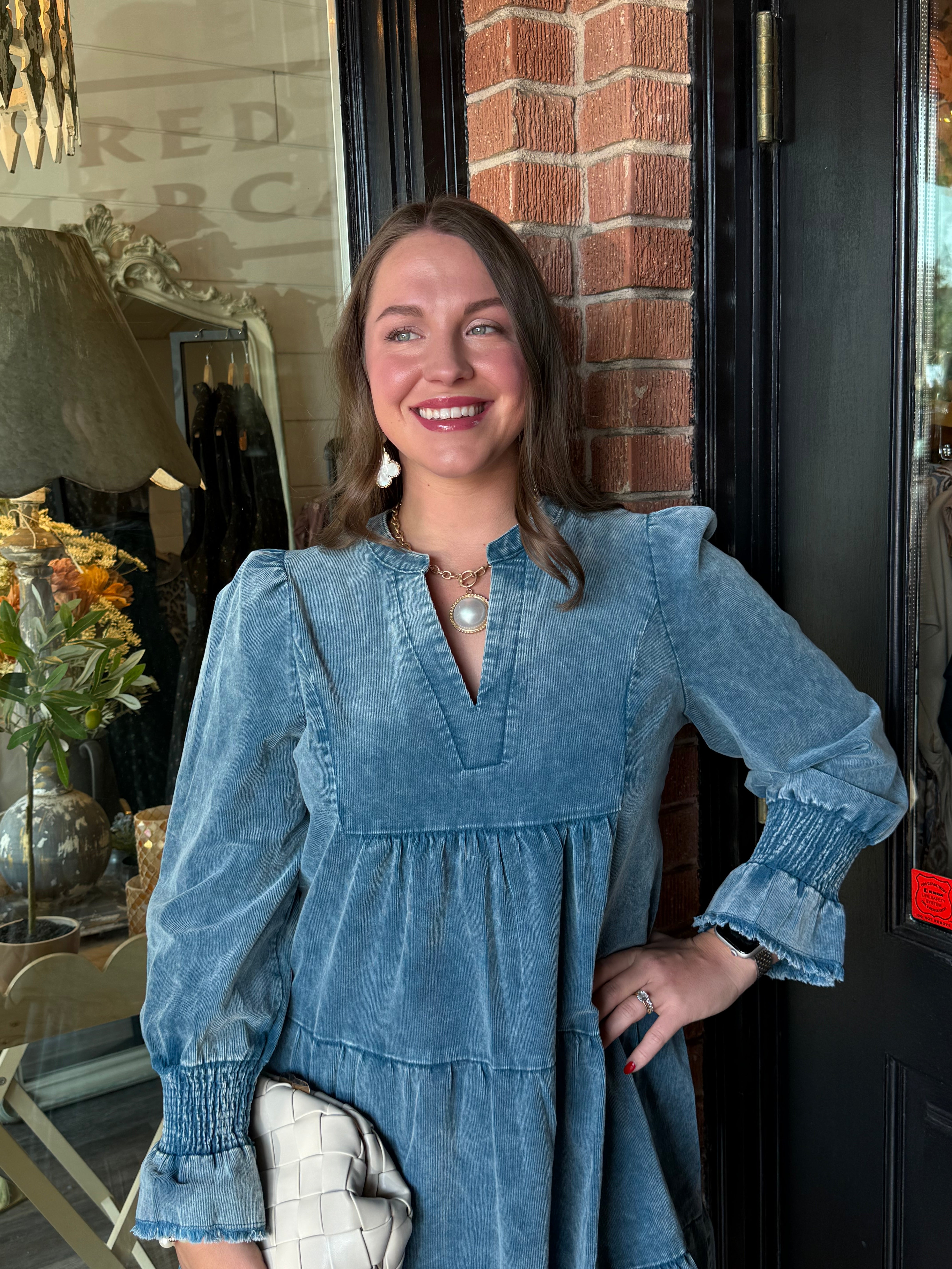 Casual, chic, and effortlessly cool—the Nellie Dress is your new go-to for everyday style. Crafted in soft corduroy with a stone-washed finish, this dress features a flattering V-neckline, tiered skirt, and smocked long sleeves for a relaxed yet polished look. The distressed hem adds a modern, worn-in vibe that pairs perfectly with boots or sneakers.