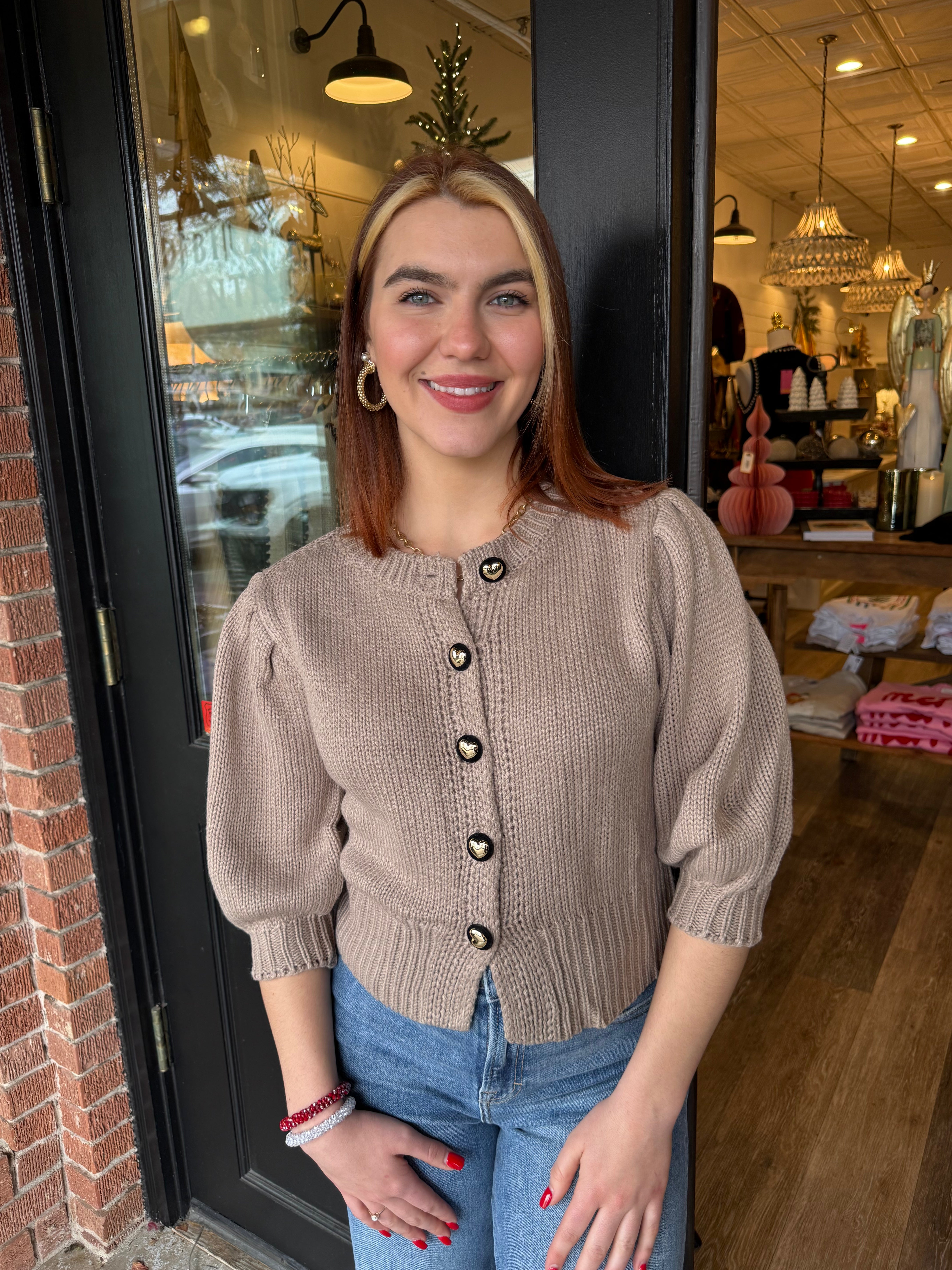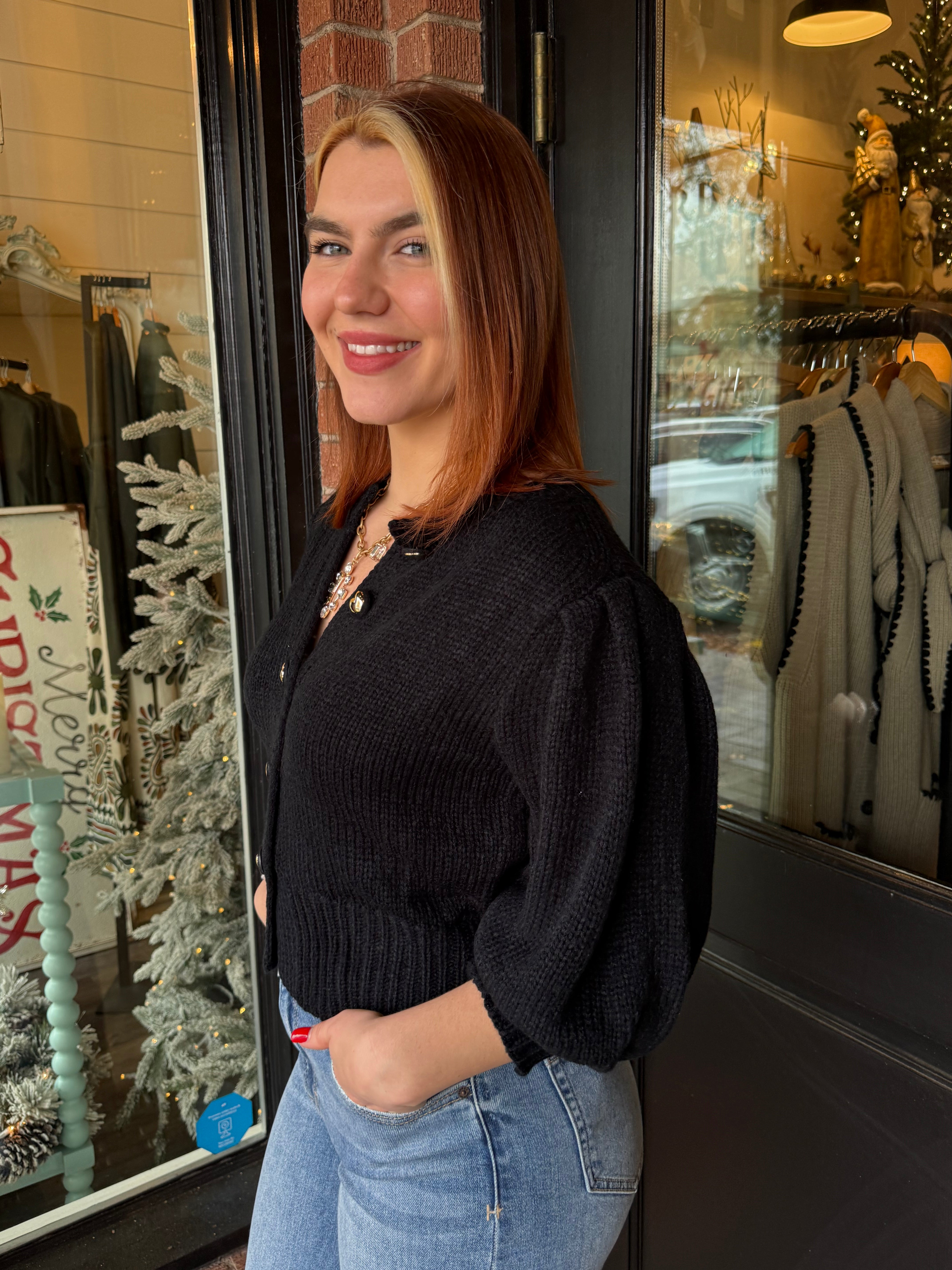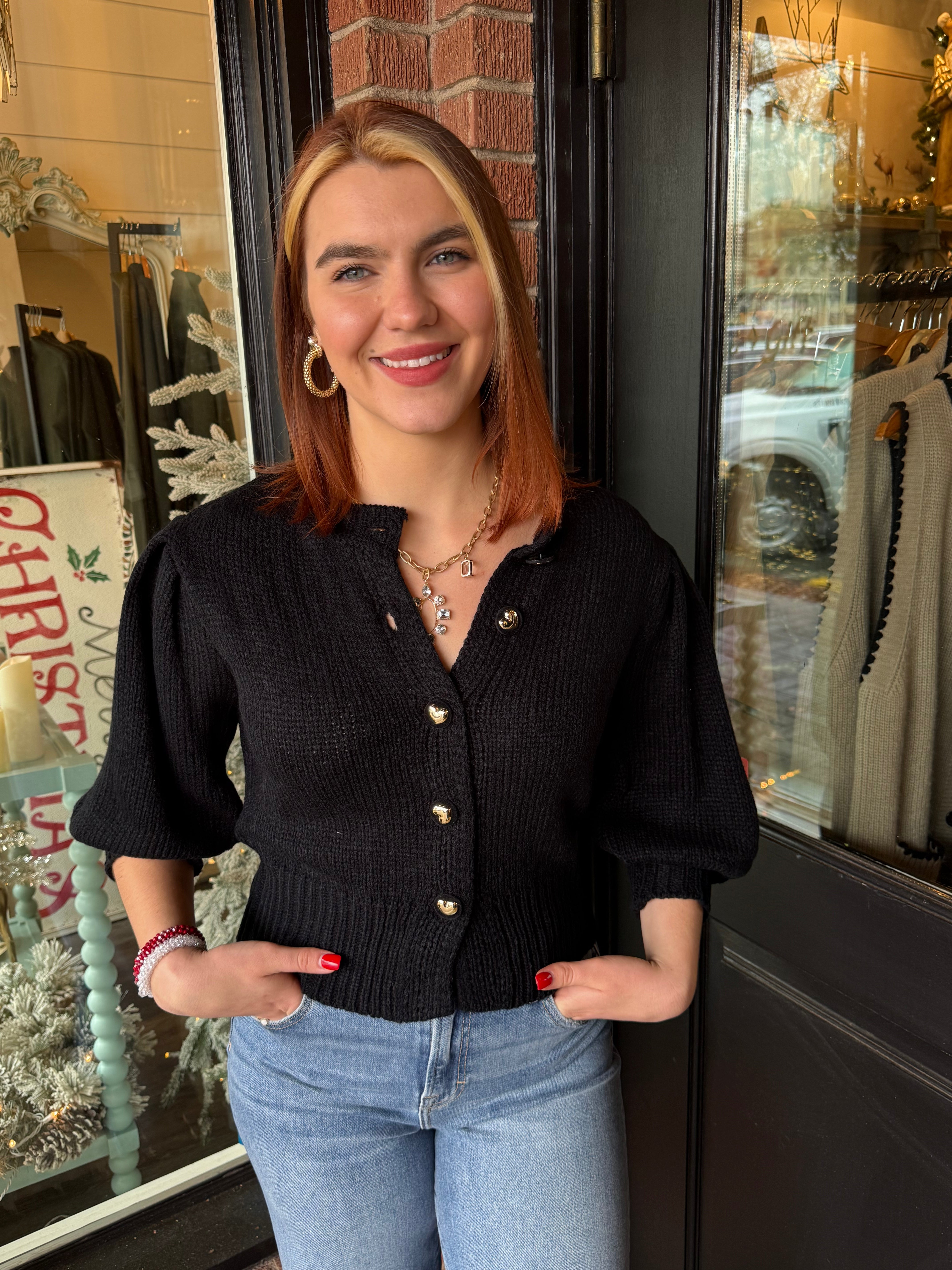 The Piper Puff Sleeve Button-Down Sweater is the perfect mix of cozy and cute. Designed with soft puff sleeves and a classic button-down front, this cropped sweater pairs effortlessly with high-waisted denim, skirts, or trousers. Easy to layer or wear on its own, it’s a fun go-to for cooler days.