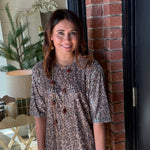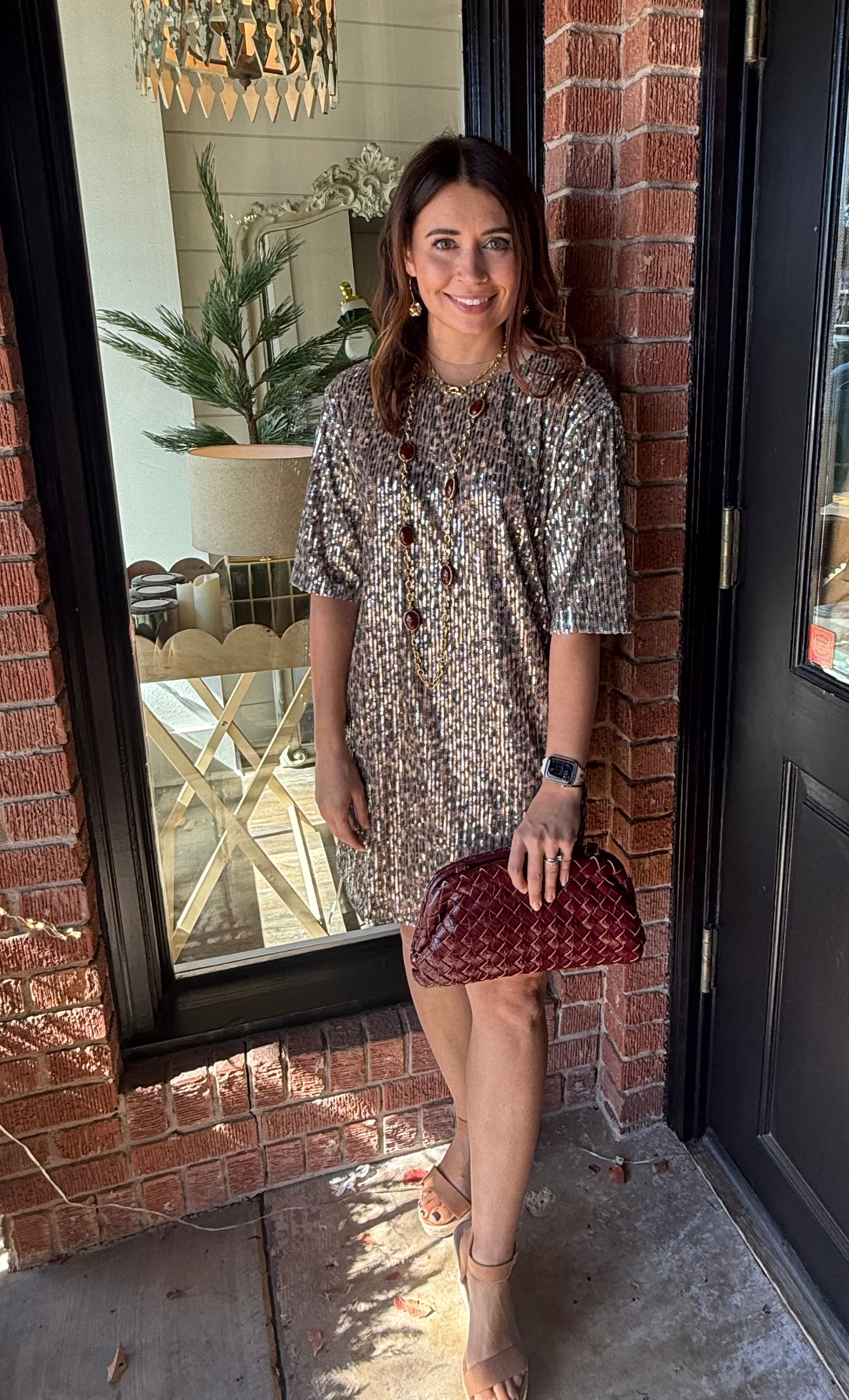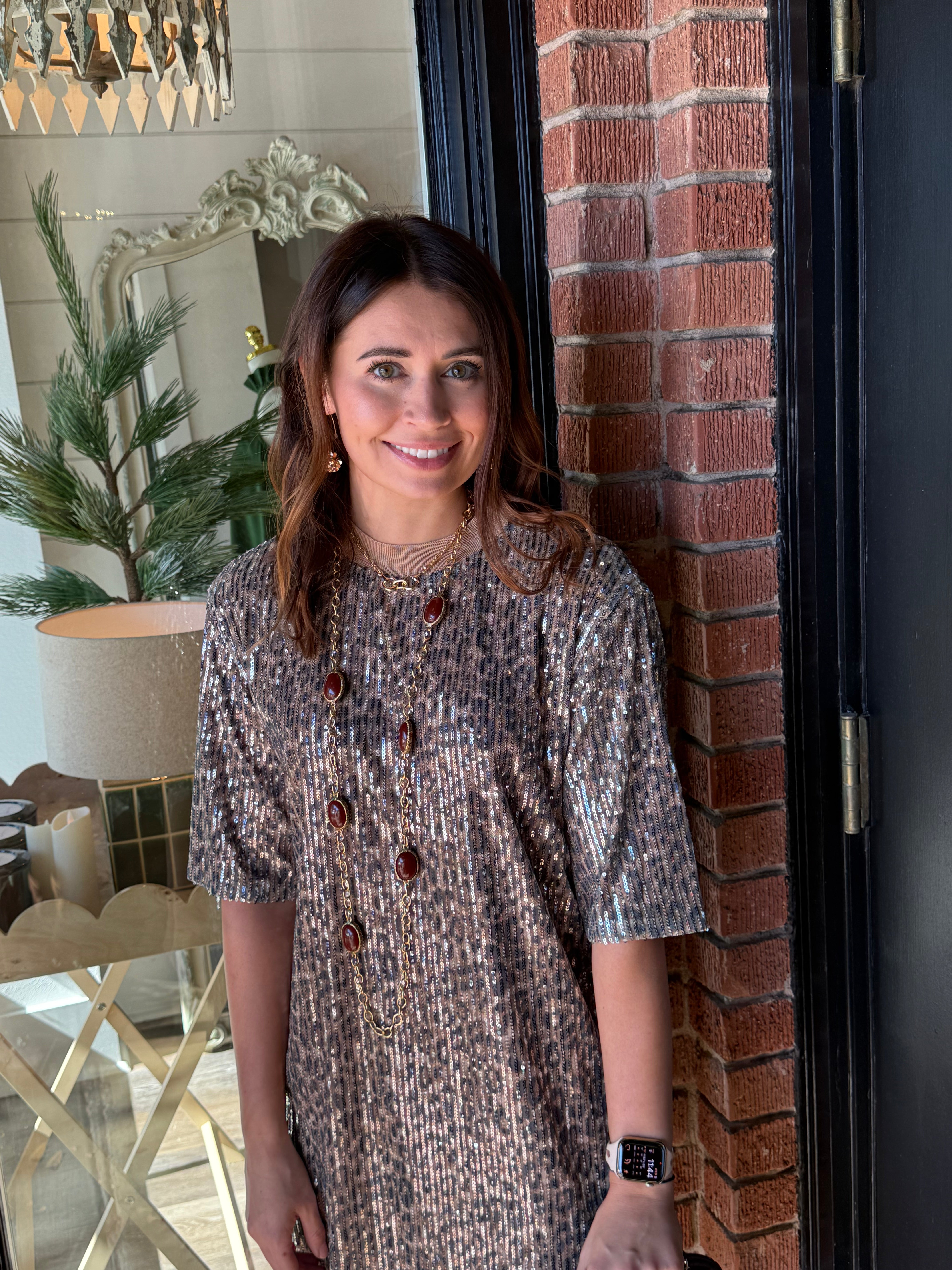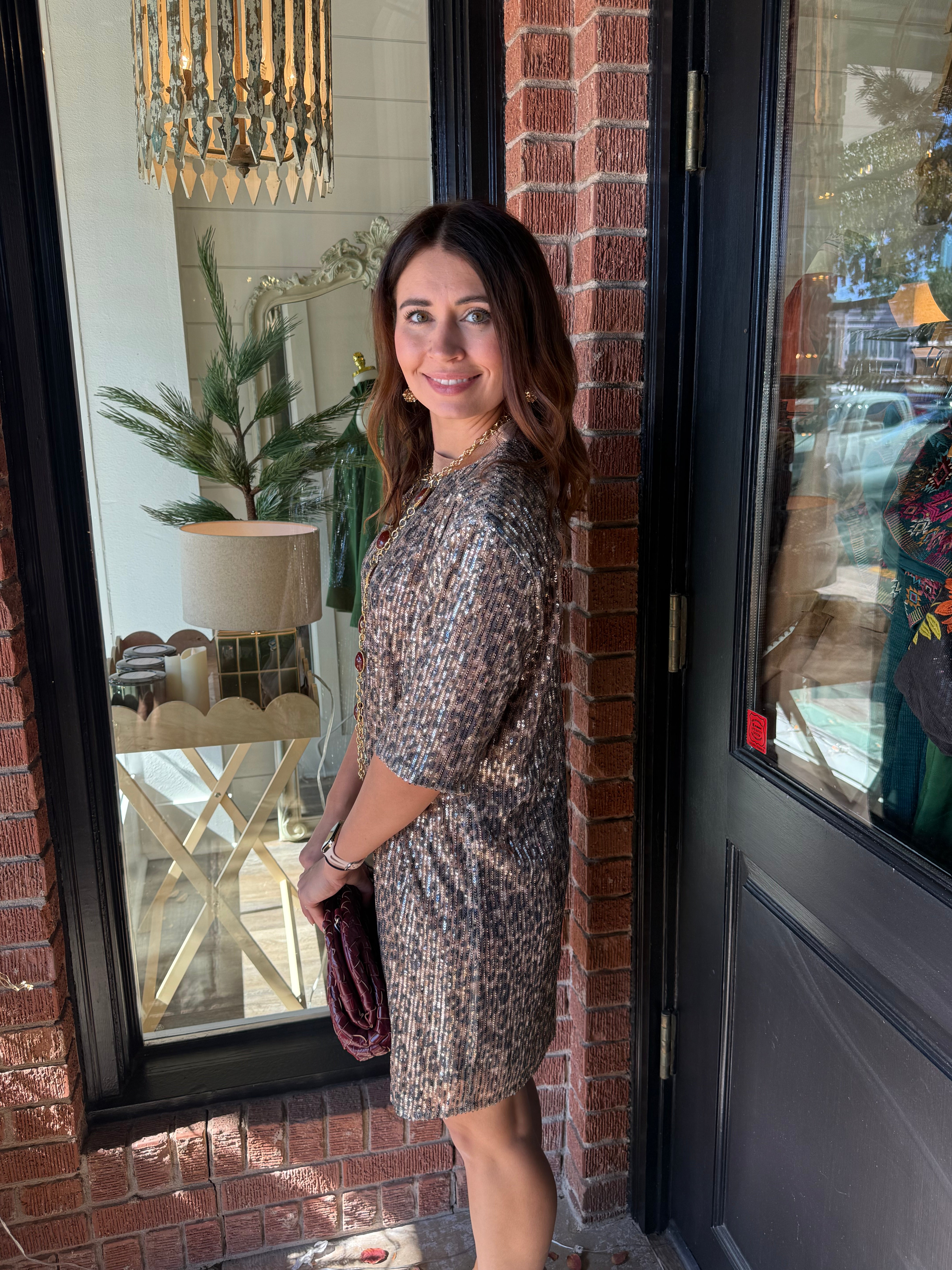 Sparkle and stand out in the Rachel Sequin Cheetah Dress! Featuring an eye-catching sequin cheetah pattern, this fully lined dress brings bold, festive energy to any occasion. Designed with short sleeves and a flattering scoop neckline, it offers just the right balance of glamour and comfort — perfect for holiday parties, date nights, or special events.