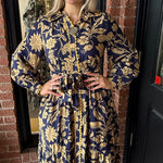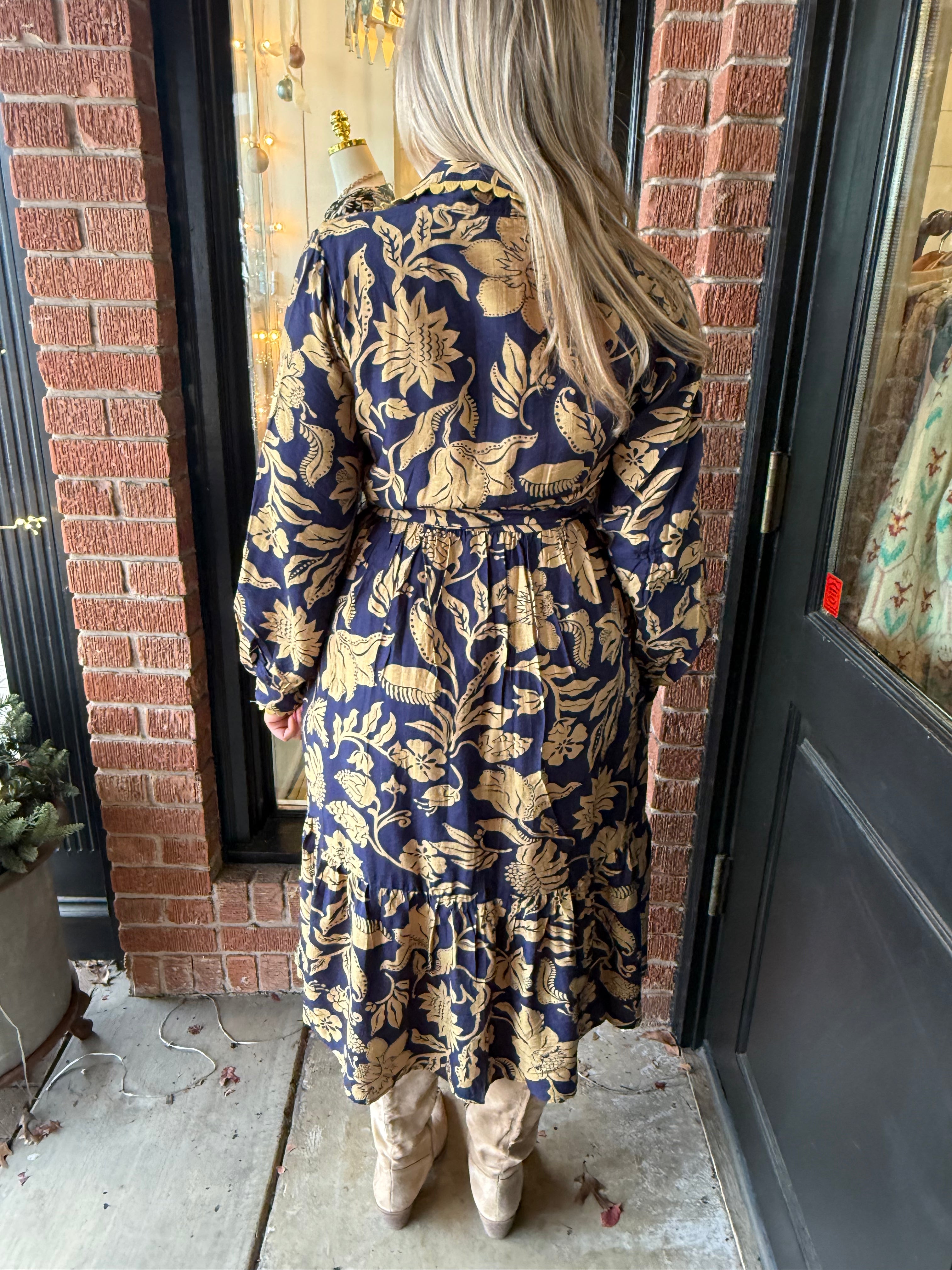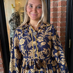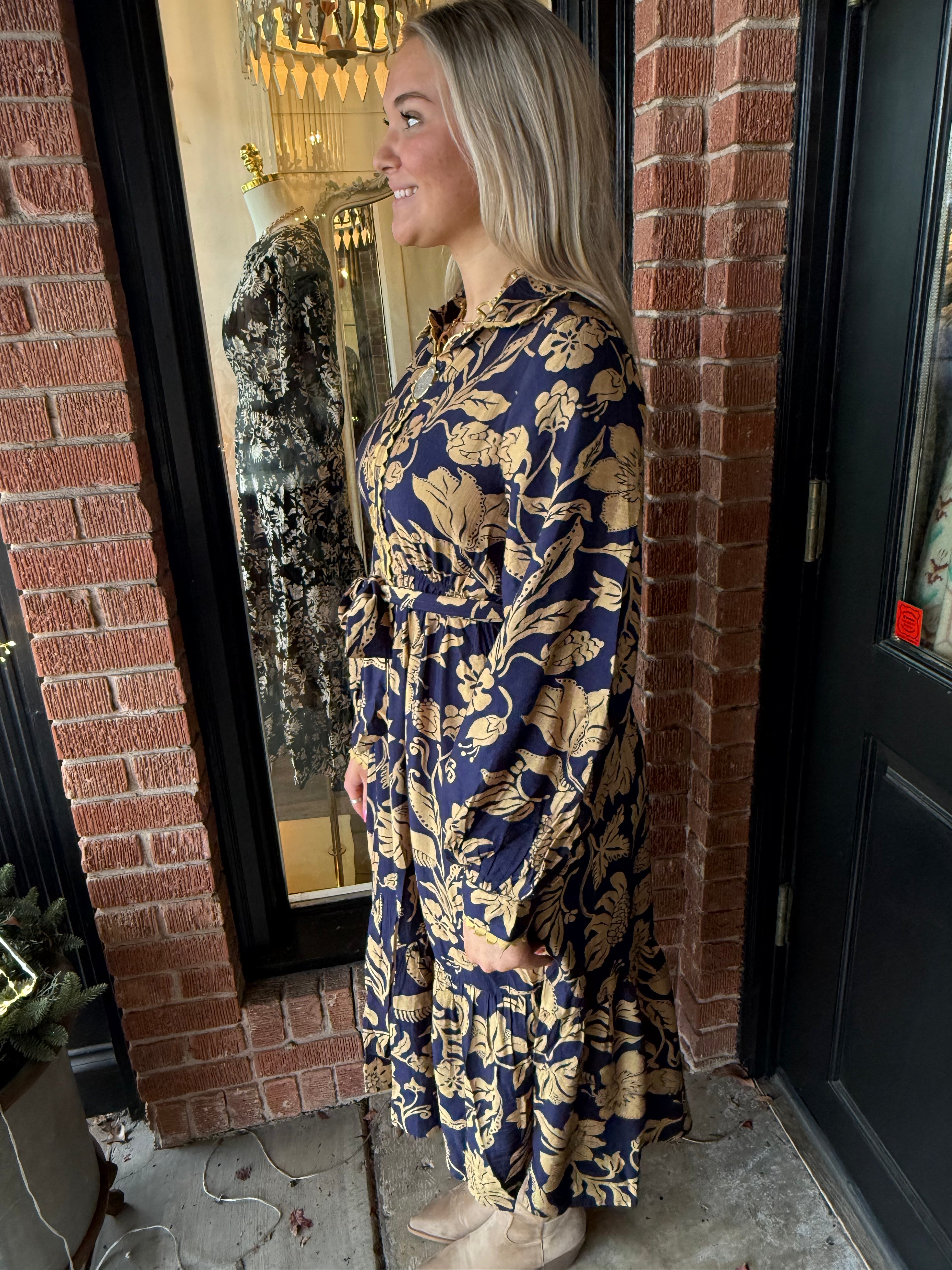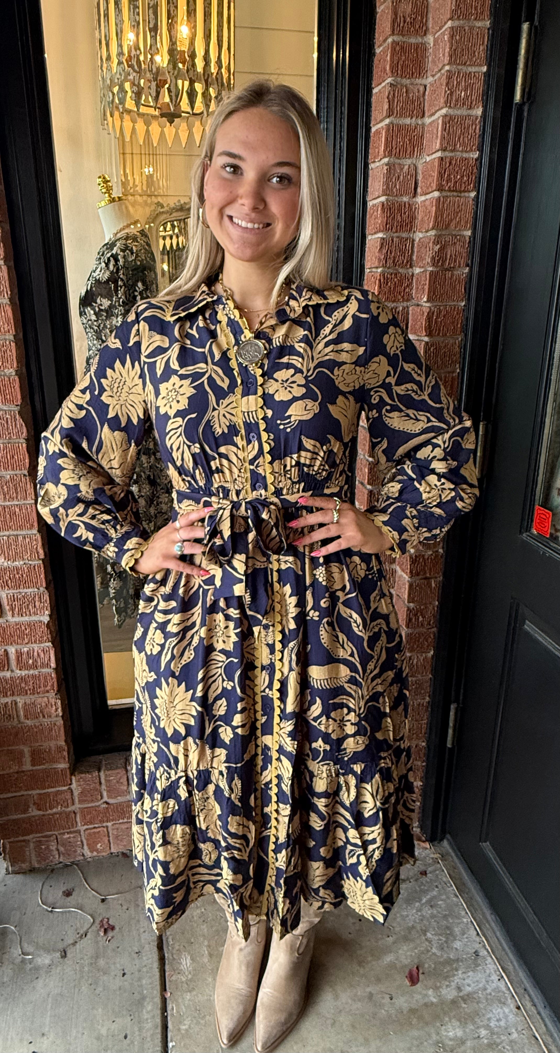 The Randi Blue Midi Dress is full of charming details that make it an instant favorite. Designed with long sleeves and a classic collar neckline, this dress features a full button-down front accented with ricrac trim for a fun, feminine touch. The adjustable tie waist creates a flattering silhouette, perfect for everyday wear or special occasions.