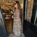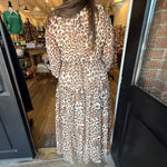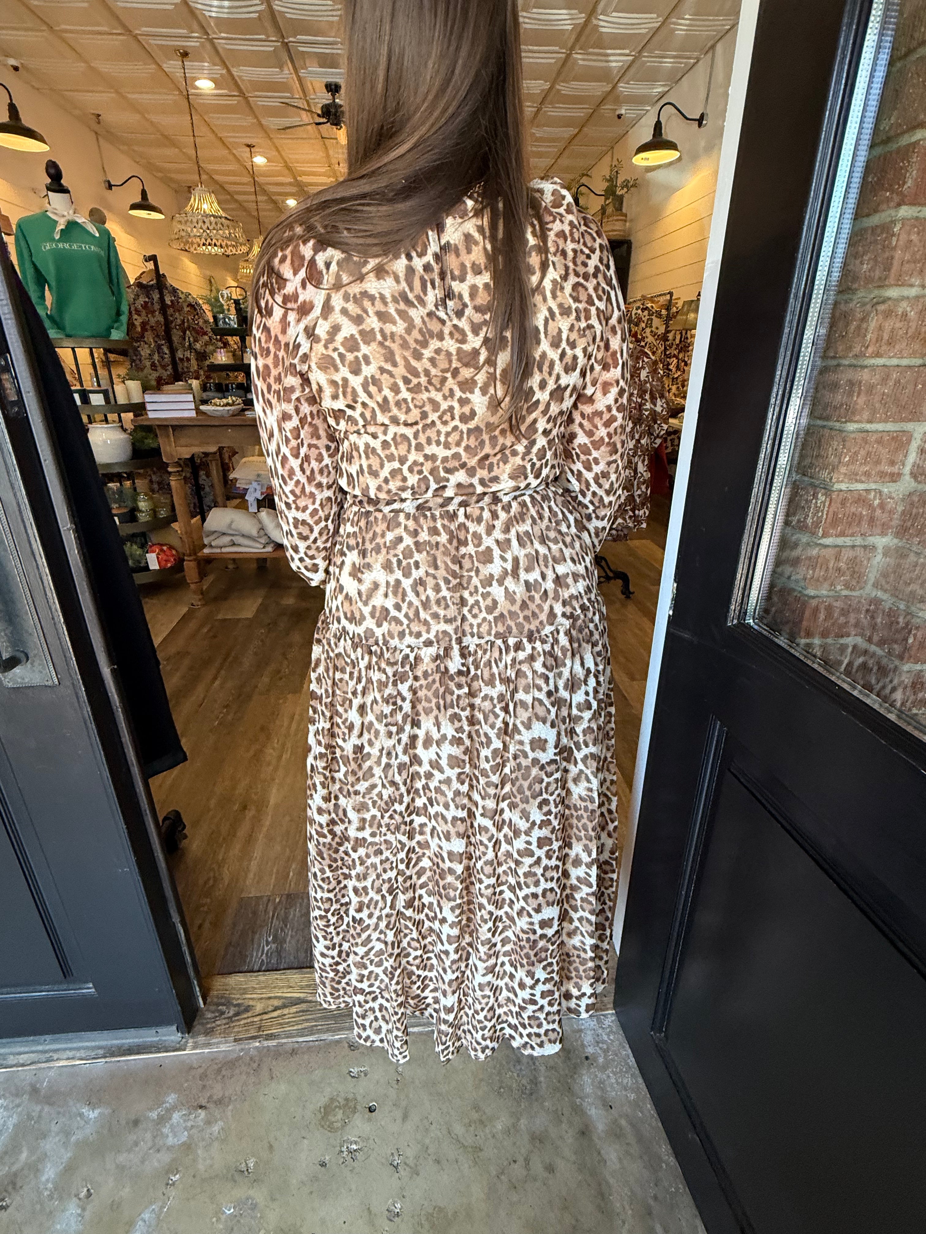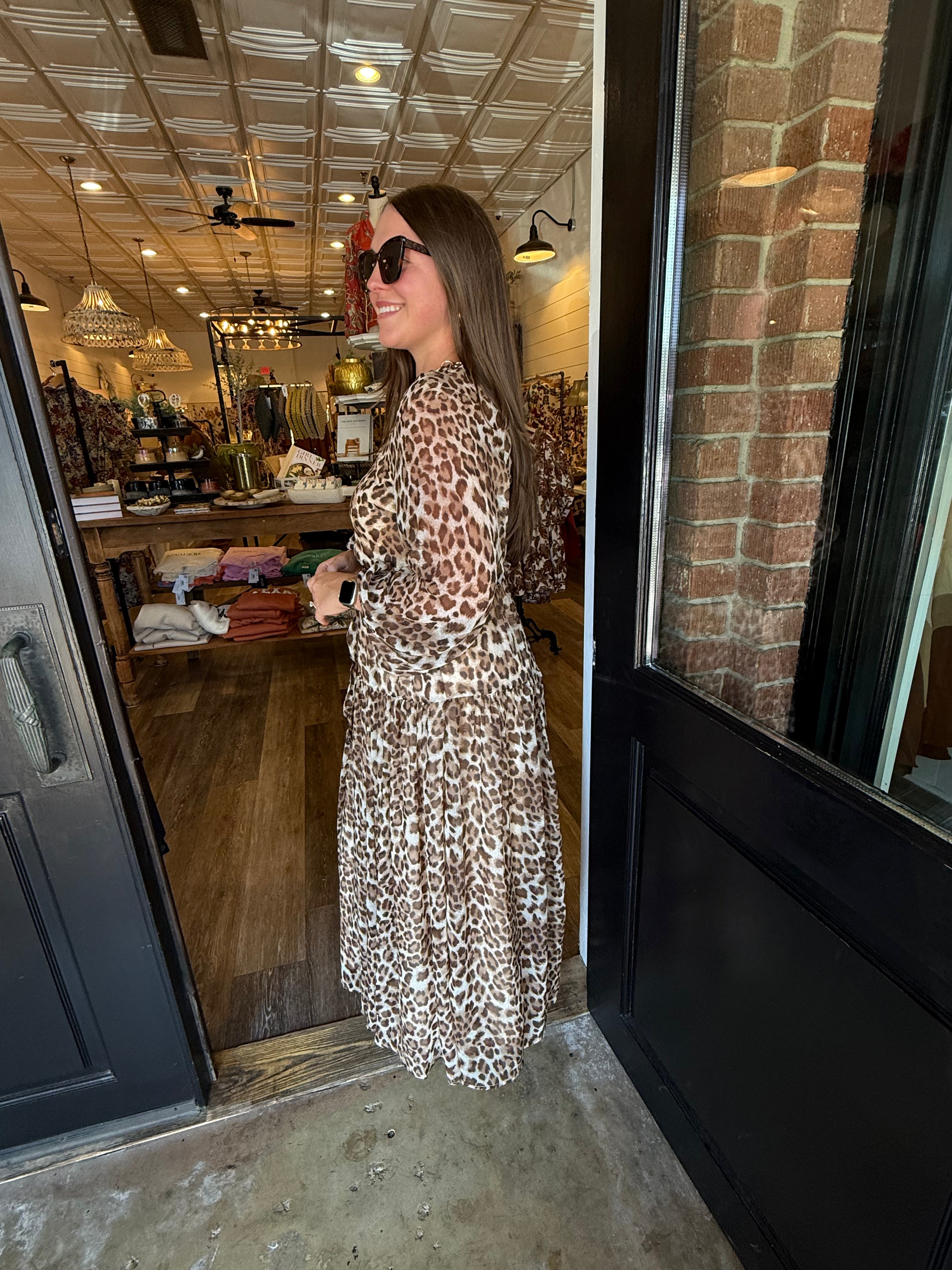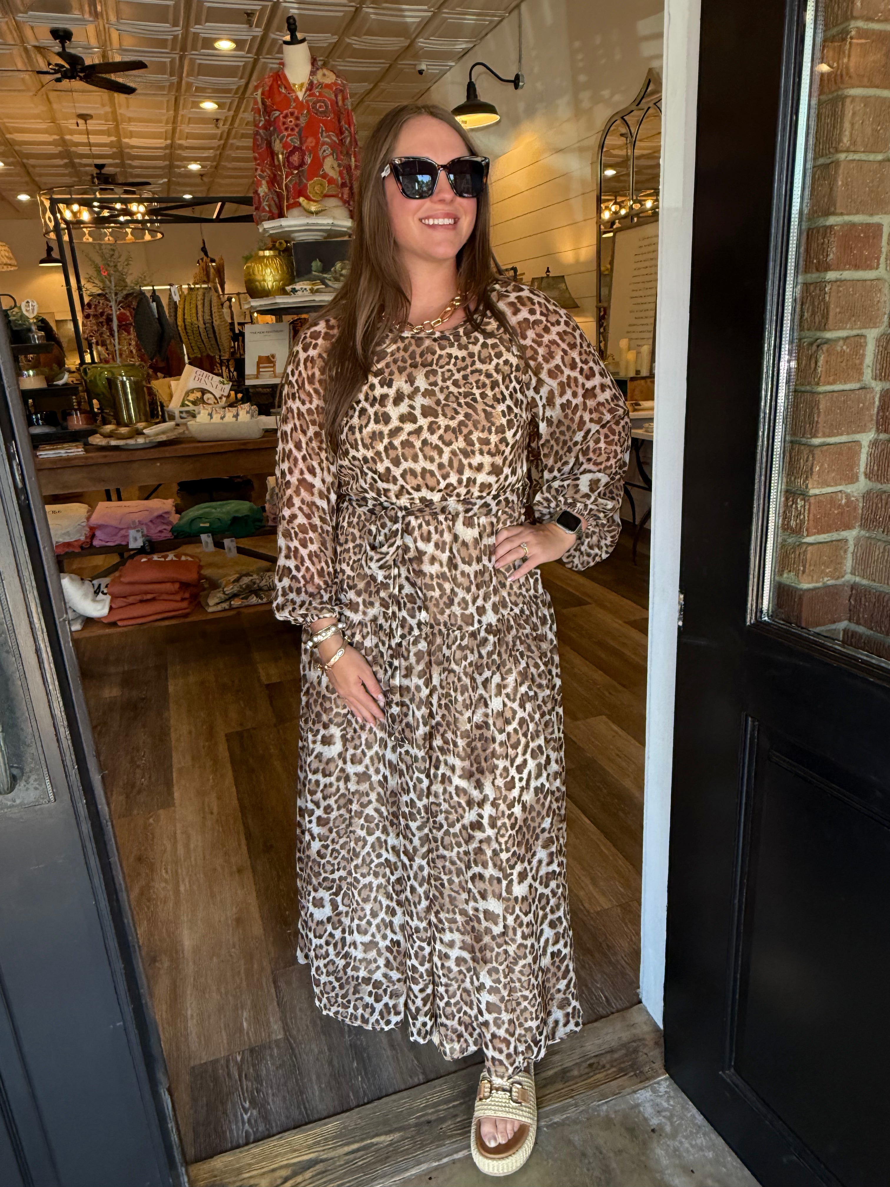 The Reagan Leopard Maxi Dress is bold, elegant, and designed to stand out. Featuring a sheer long sleeve design, a flattering elastic waist with adjustable tie belt, and a back neck button closure, this maxi blends chic details with a timeless silhouette. The striking leopard print makes a statement, while the fully lined body provides comfort and coverage. Crafted from soft polyester with a rayon lining, it drapes beautifully and feels effortless to wear.