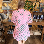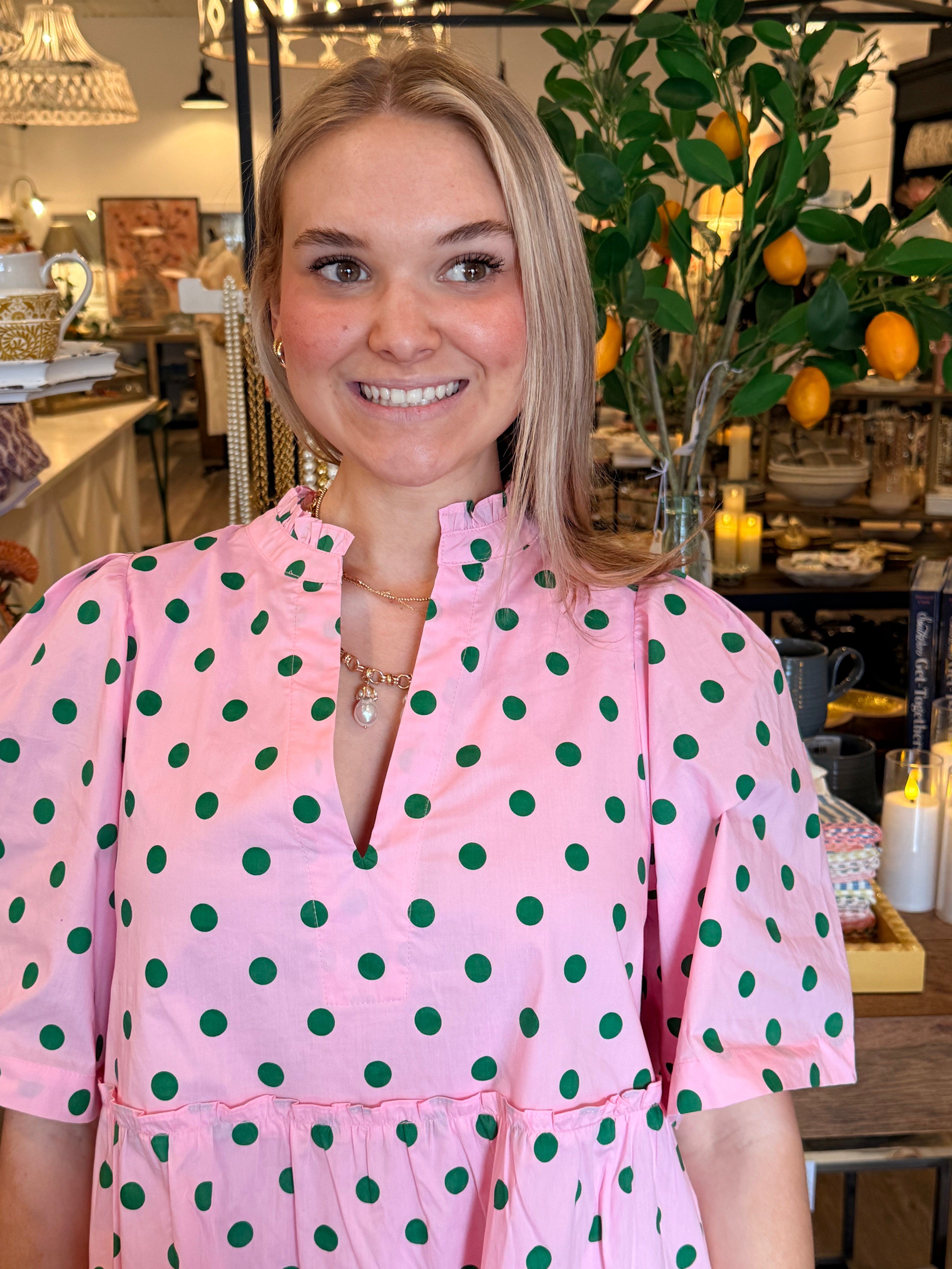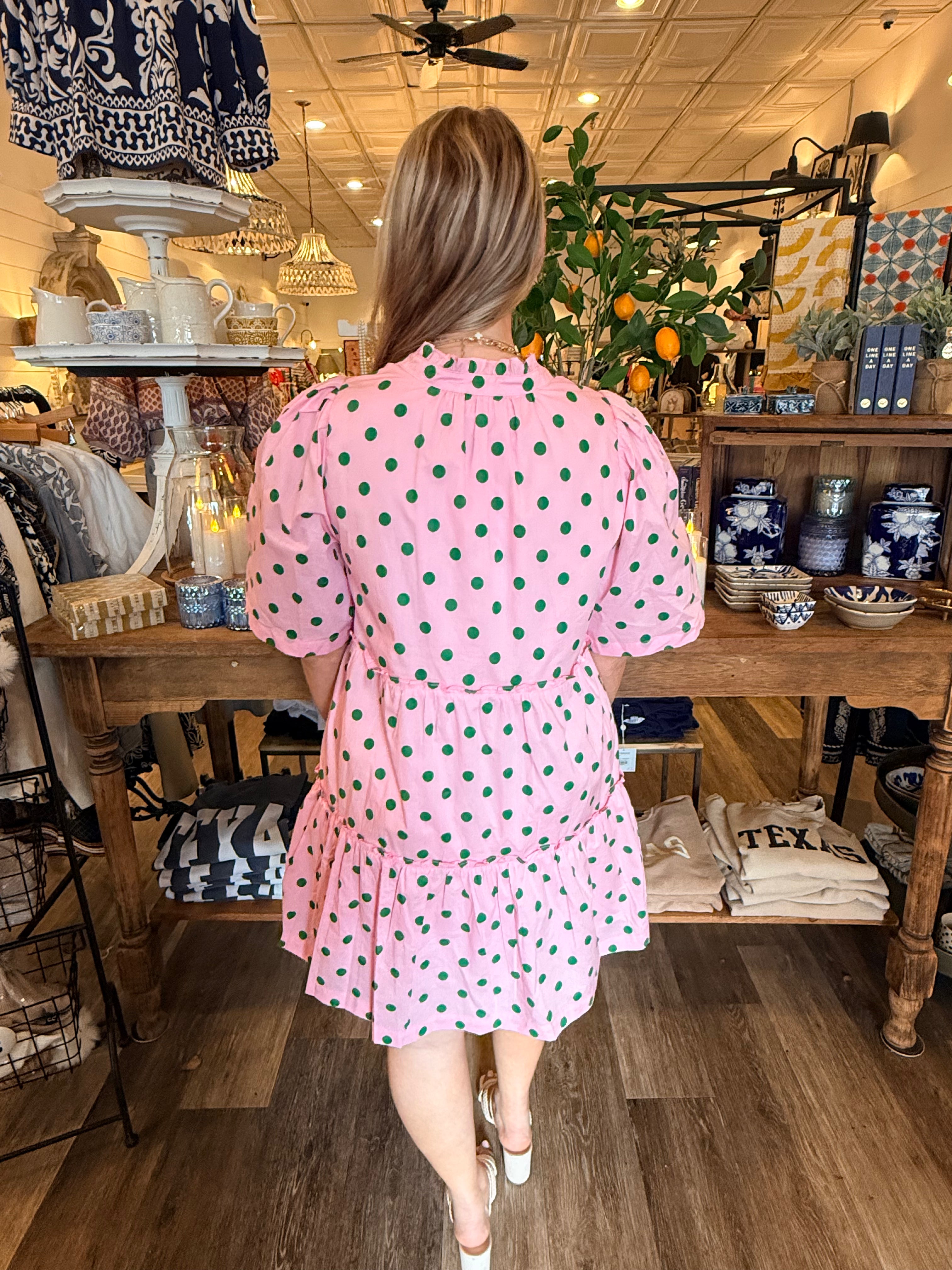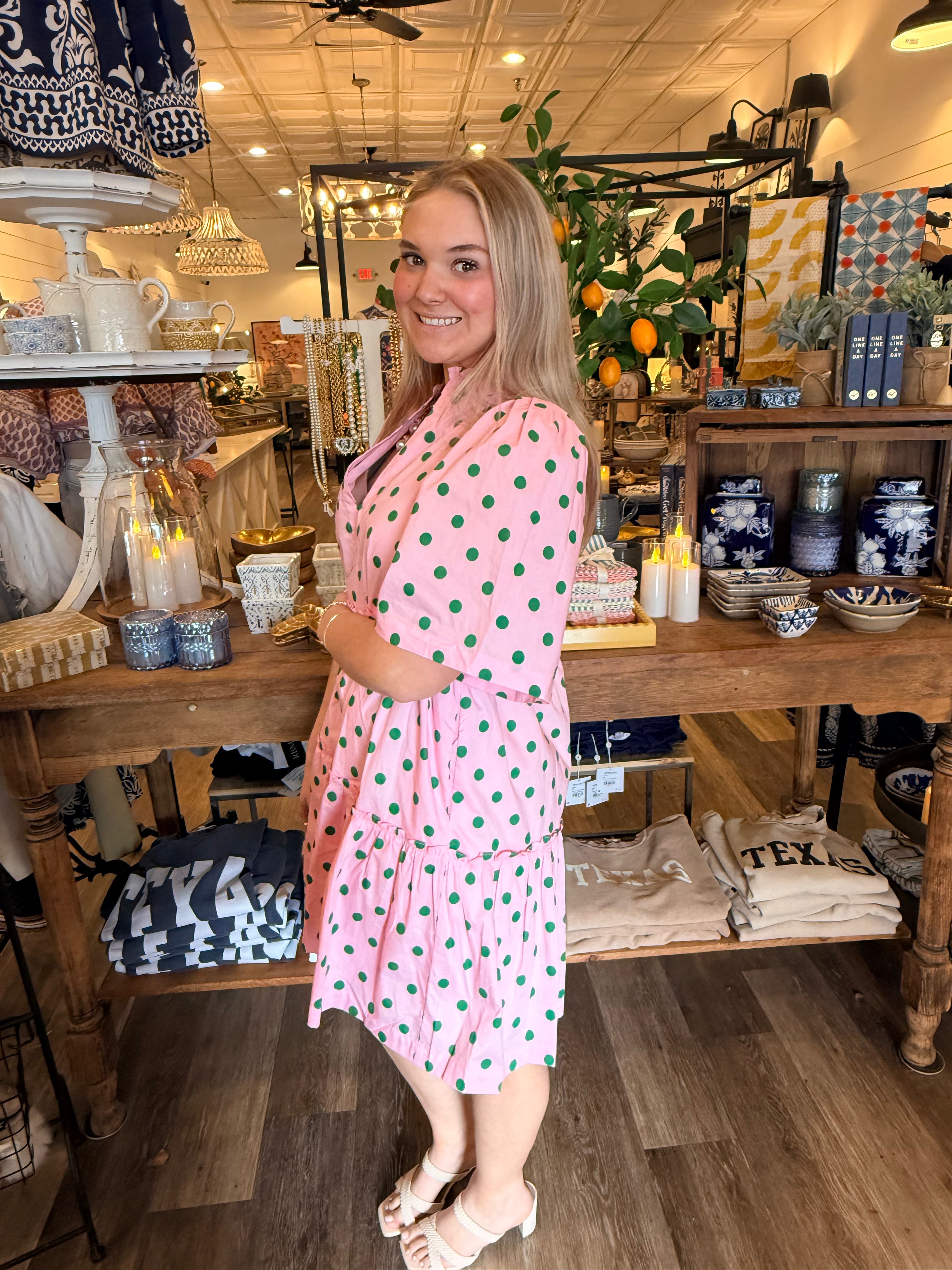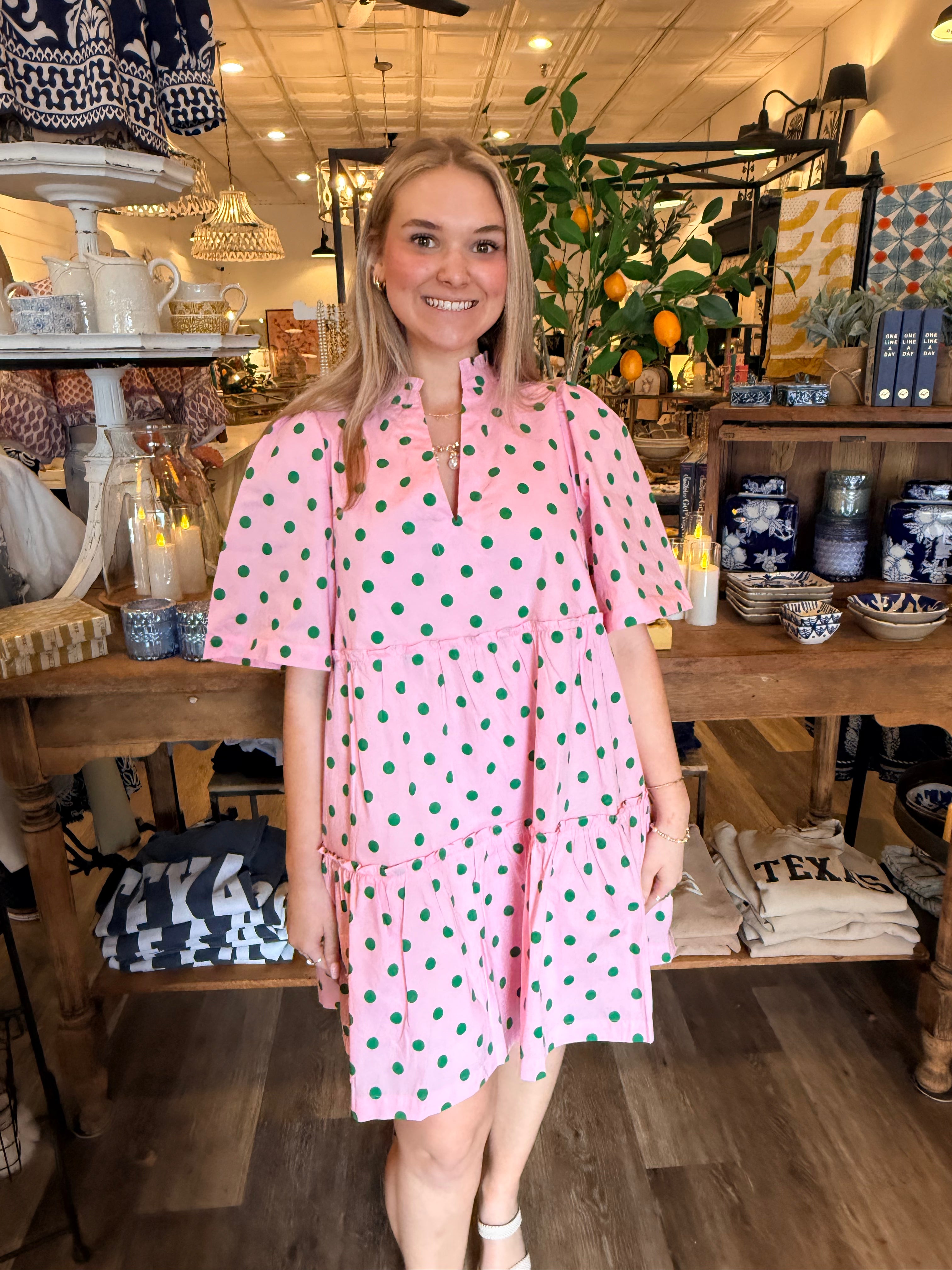 Sweet and effortless, the Riana Dot Shift Dress is an easy go-to for everyday wear. Designed with a relaxed shift silhouette, this dress features short sleeves, a split neckline with ruffle trim, and a playful tiered ruffle hem. Fully lined for comfort, it’s a lightweight piece that works beautifully from day to night.