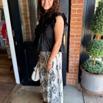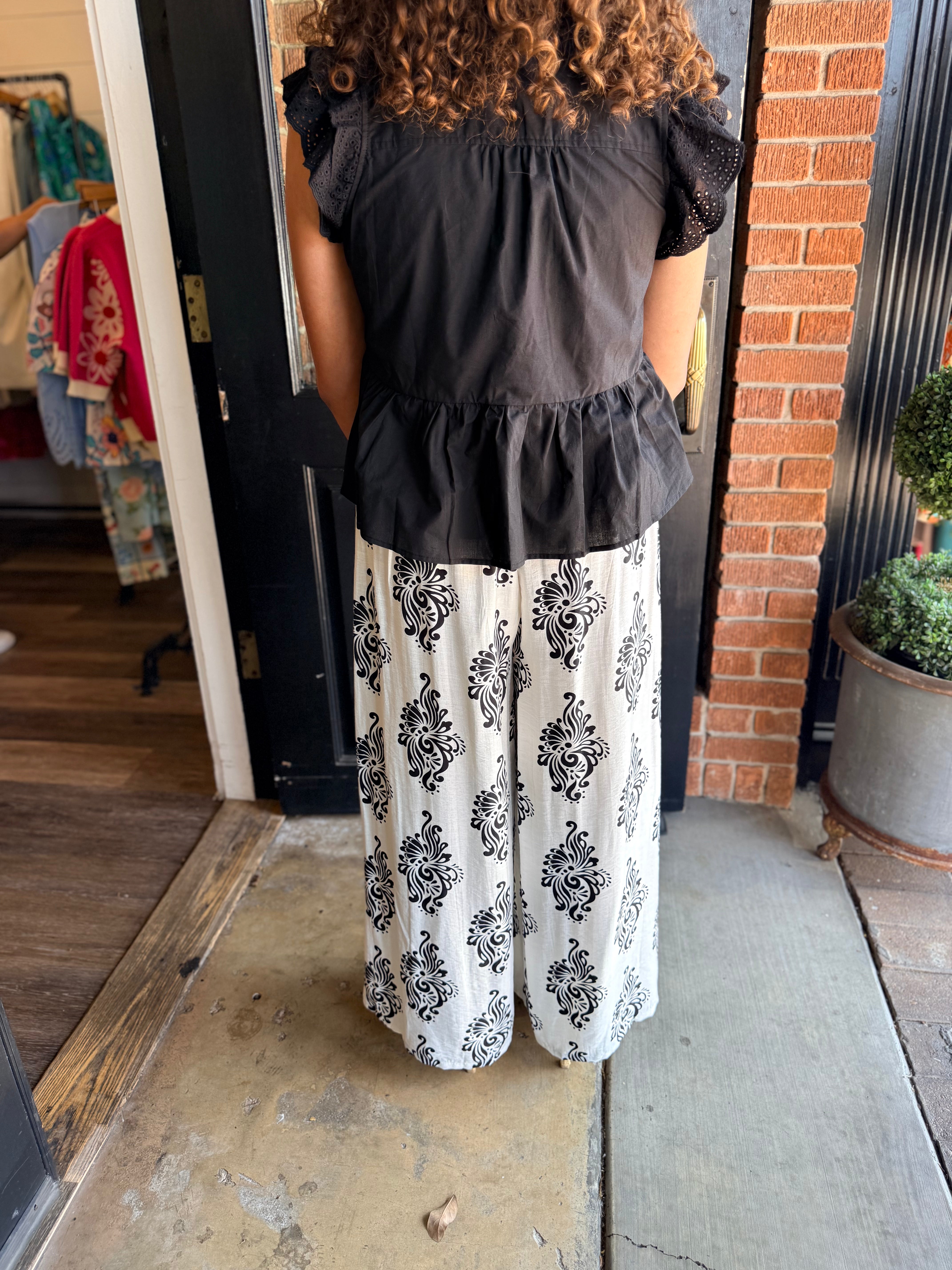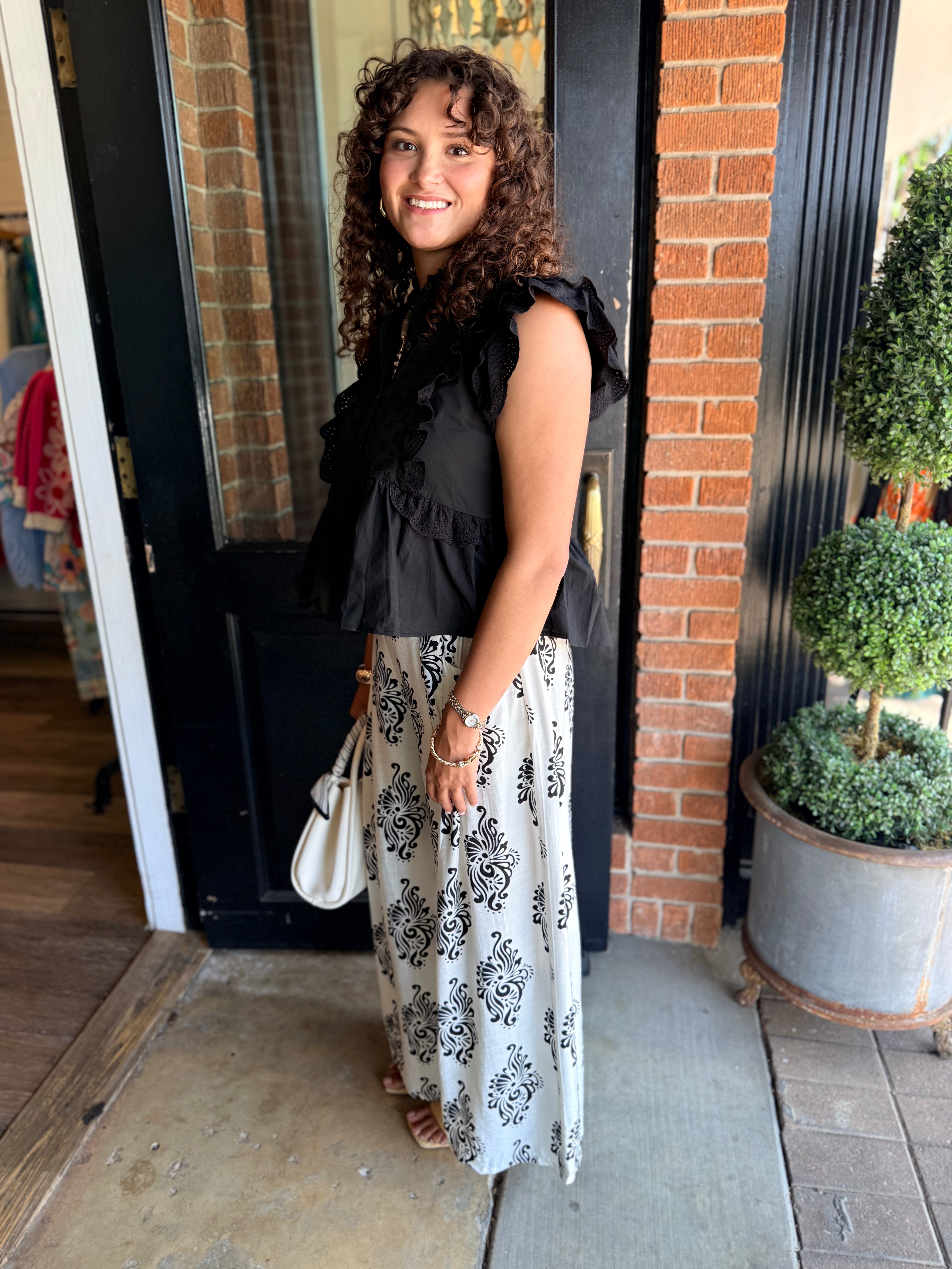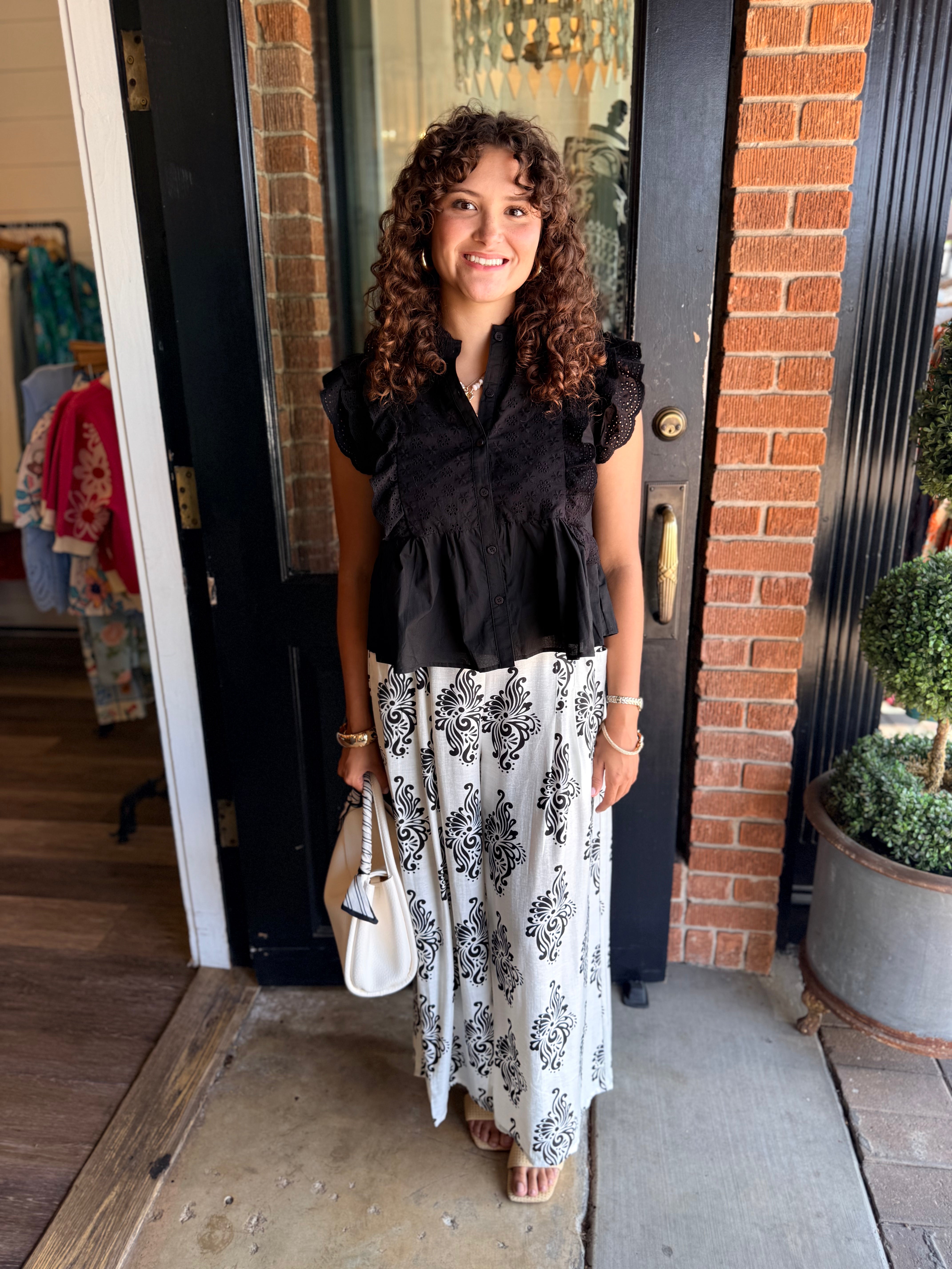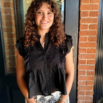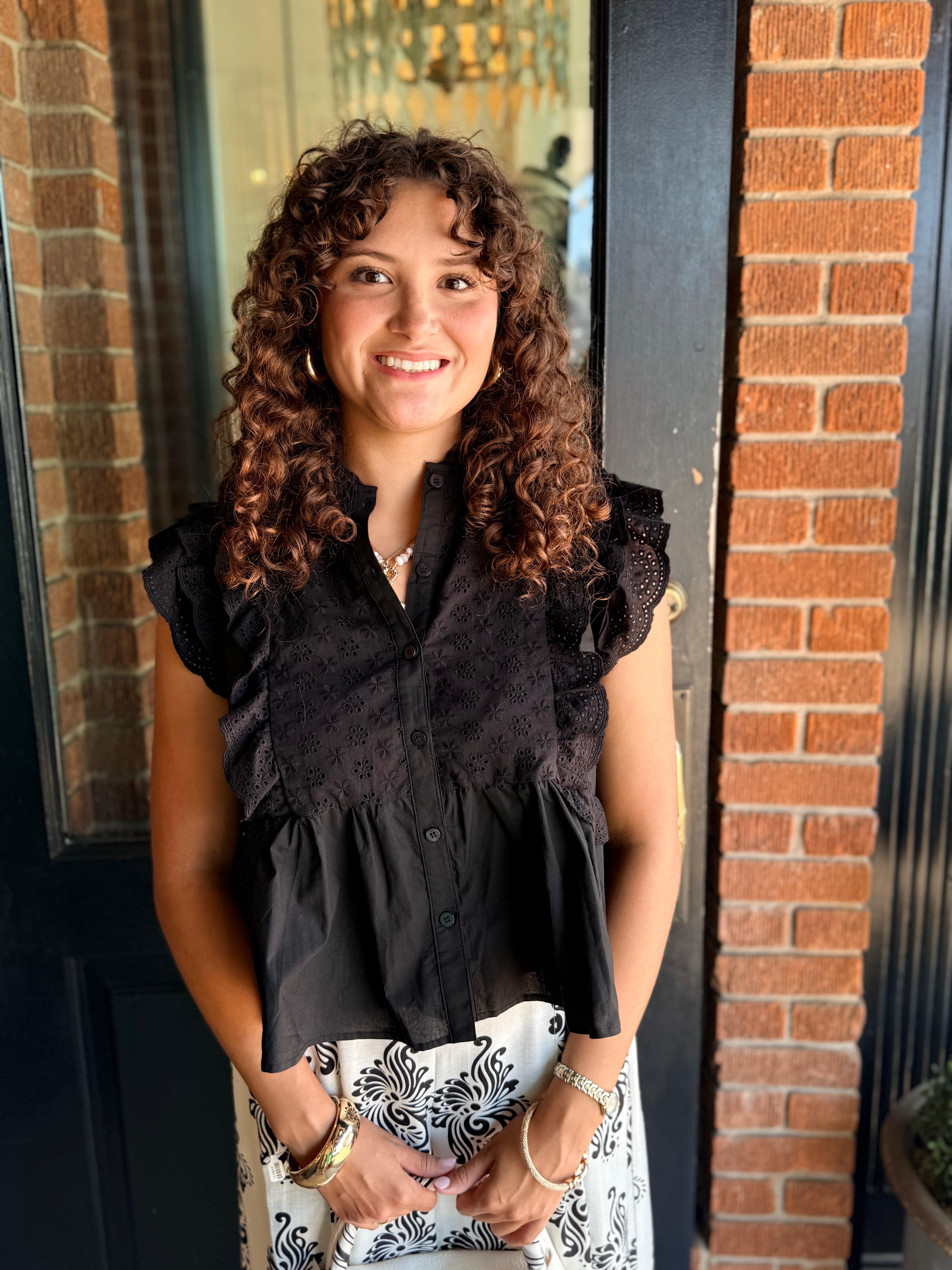 Feminine, detailed, and easy to style. The Romy Eyelet Top features a delicate eyelet bodice with a ruffled neckline and button front for a classic, polished look. Tiered flutter sleeves and a soft peplum hem create a flattering shape that pairs perfectly with denim or white pants.