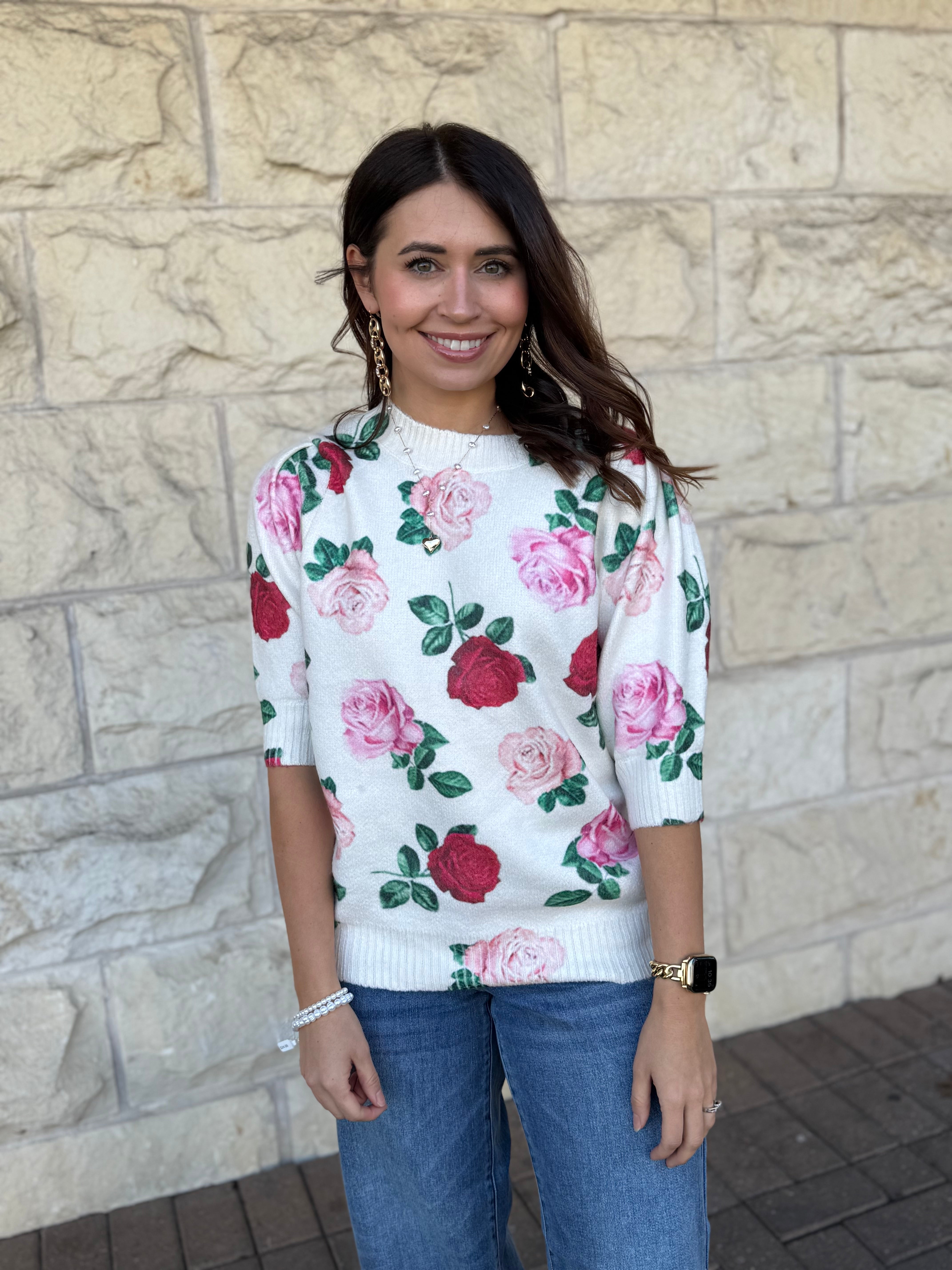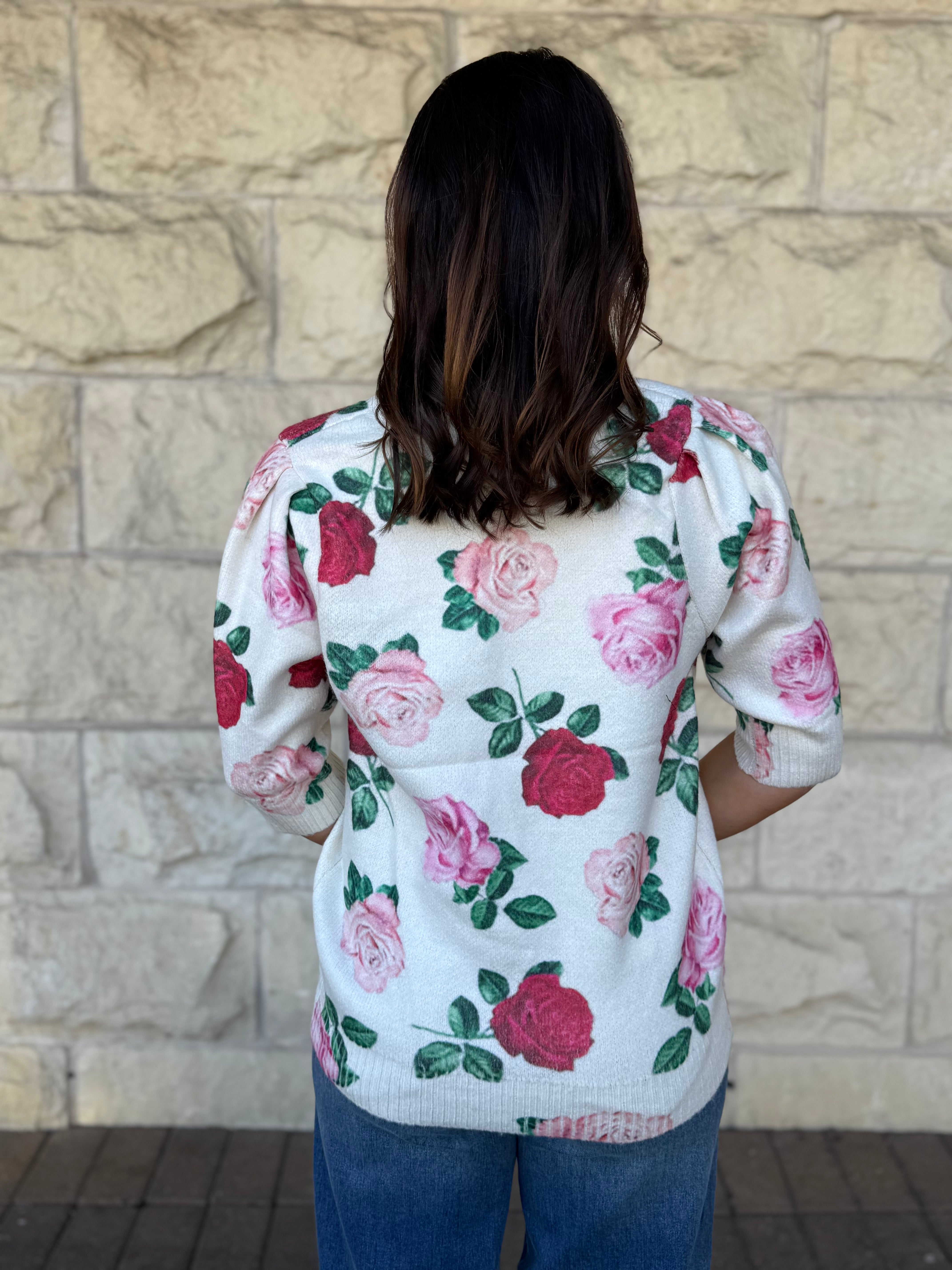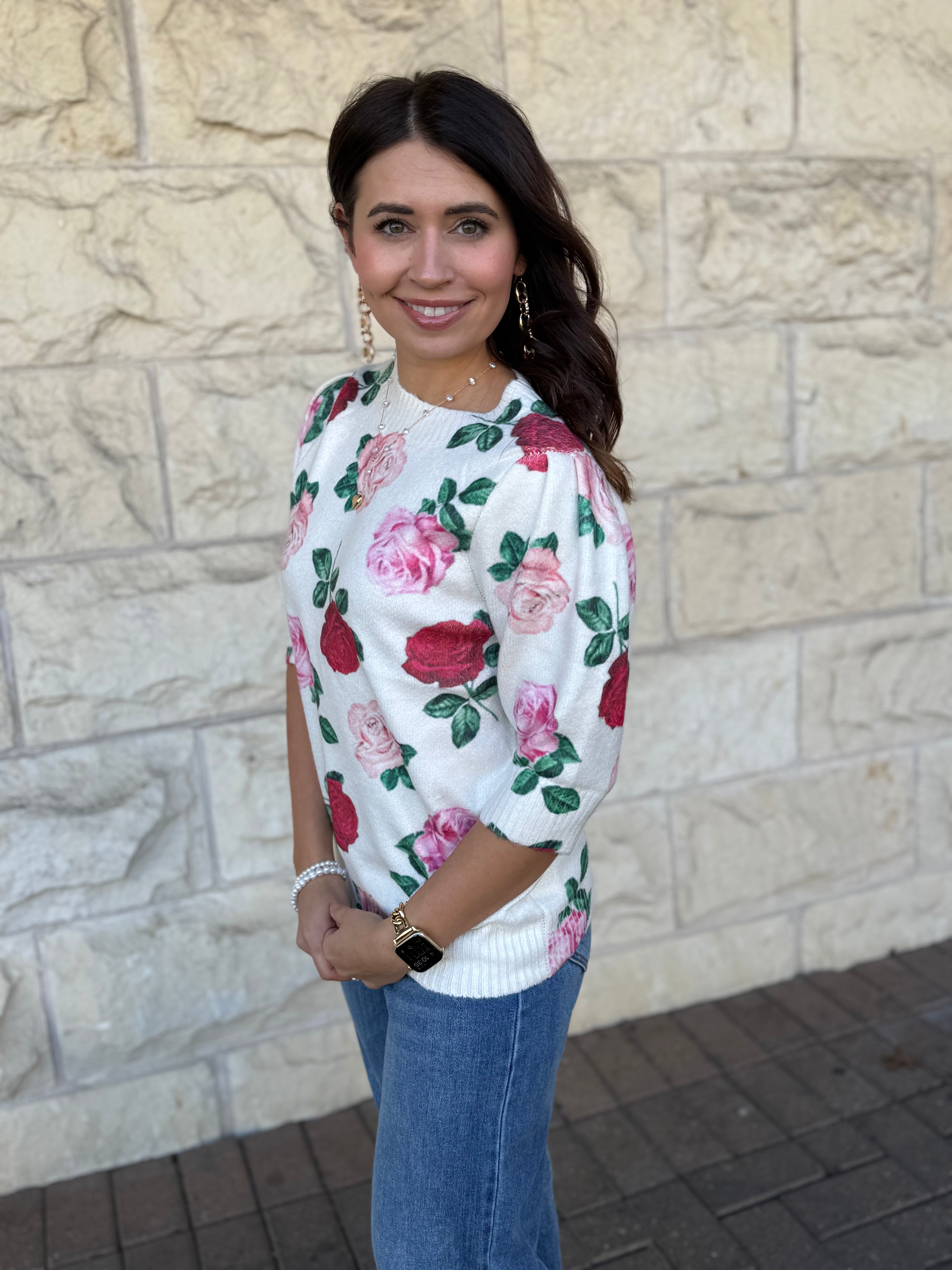 Soft, cozy, and full of charm, the Rose English Garden Knit Sweater is one of those pieces that instantly makes you feel put together. Designed with a classic ribbed crew neckline and a relaxed drop-shoulder fit, this sweater features sweet puff short sleeves with ribbed hems and an allover English rose floral print that adds the prettiest touch. The soft, skin-friendly knit feels amazing on, making it perfect for everyday wear from morning to night.