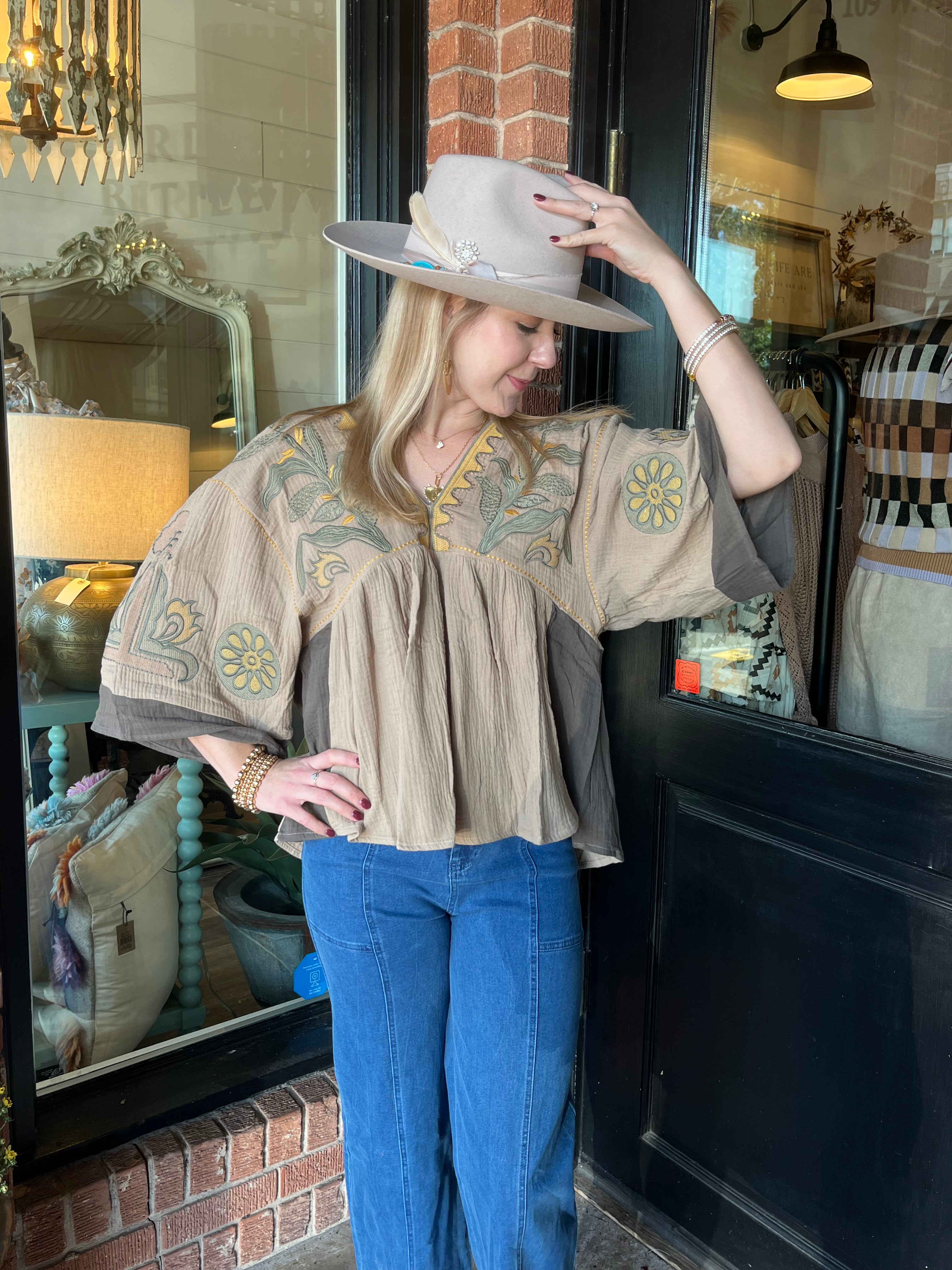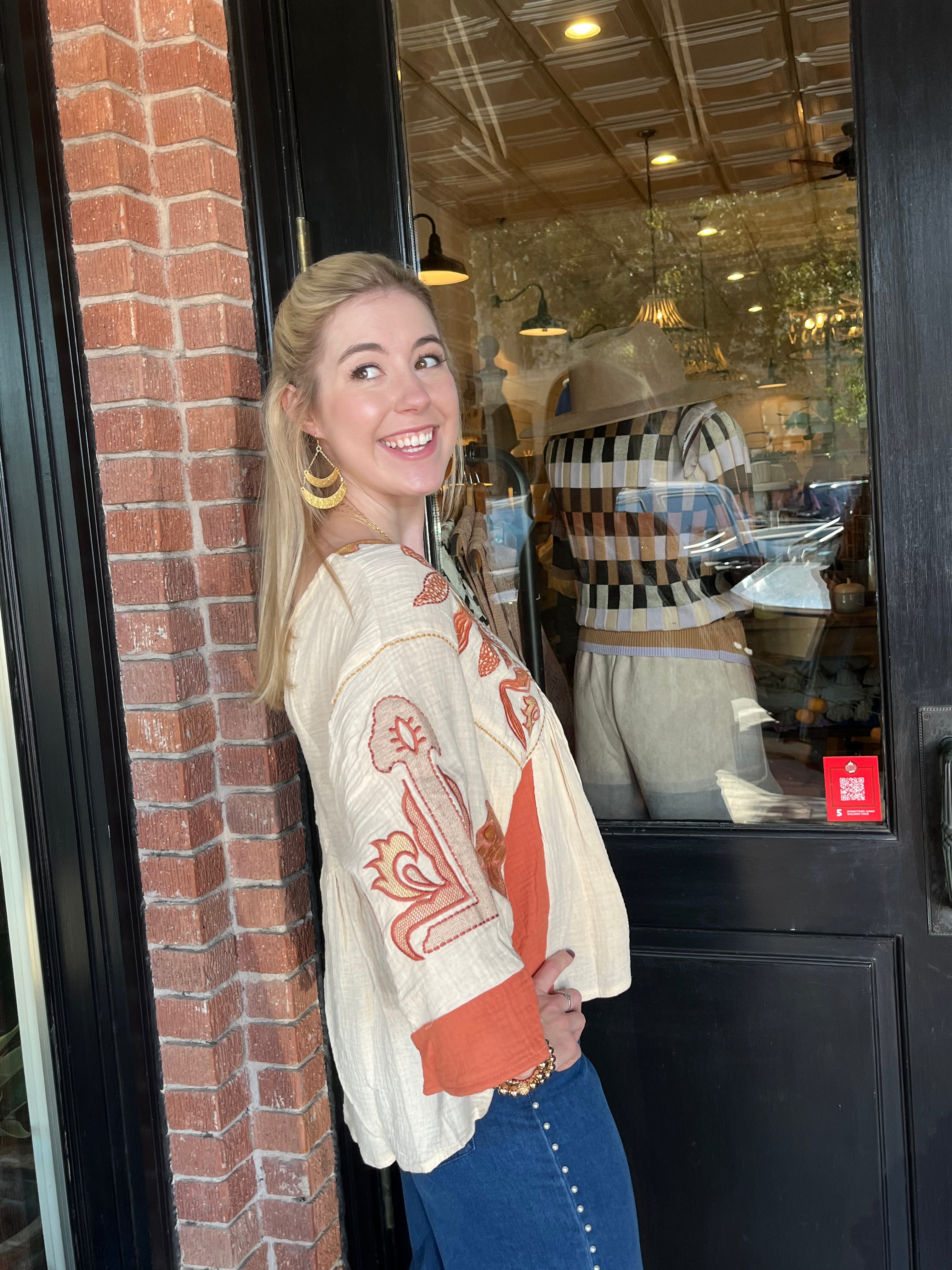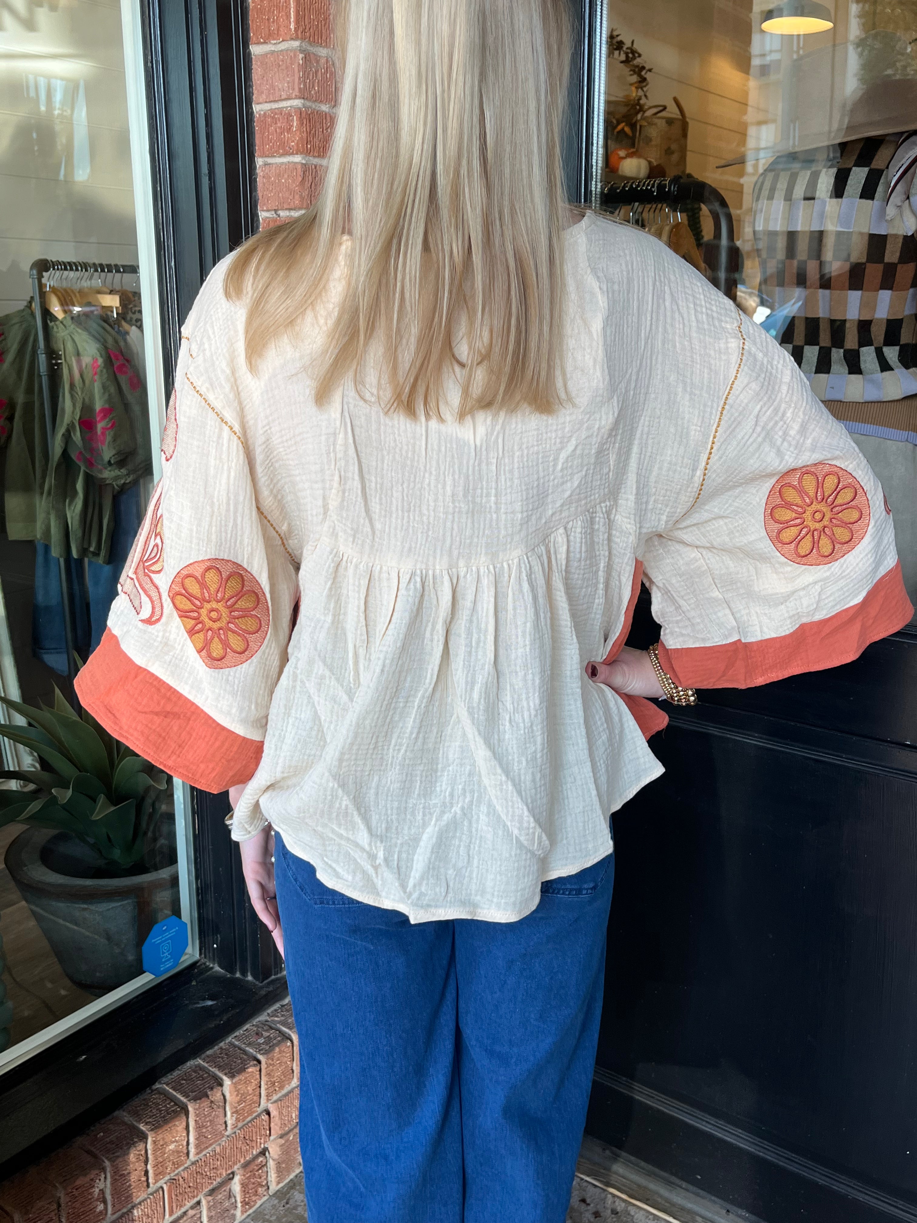 Get ready to rock the fall season with our Ruby Vintage Embroidery Patch Gauze Top. The beautiful embroidered details and bouncy sleeves add the perfect touch of fun to any outfit- whether you pair it with jeans or pants. Don't miss out on this must-have piece for your wardrobe!