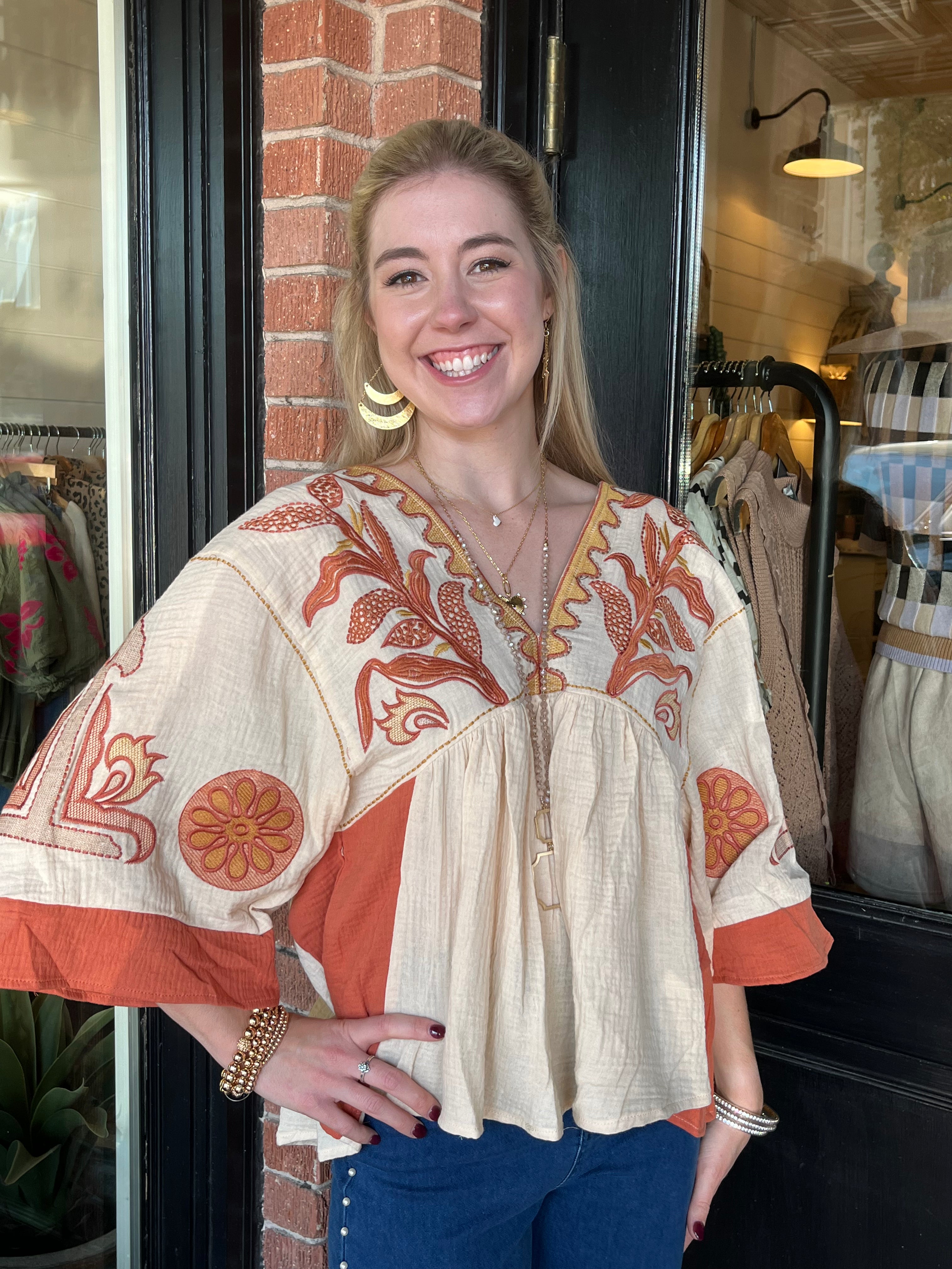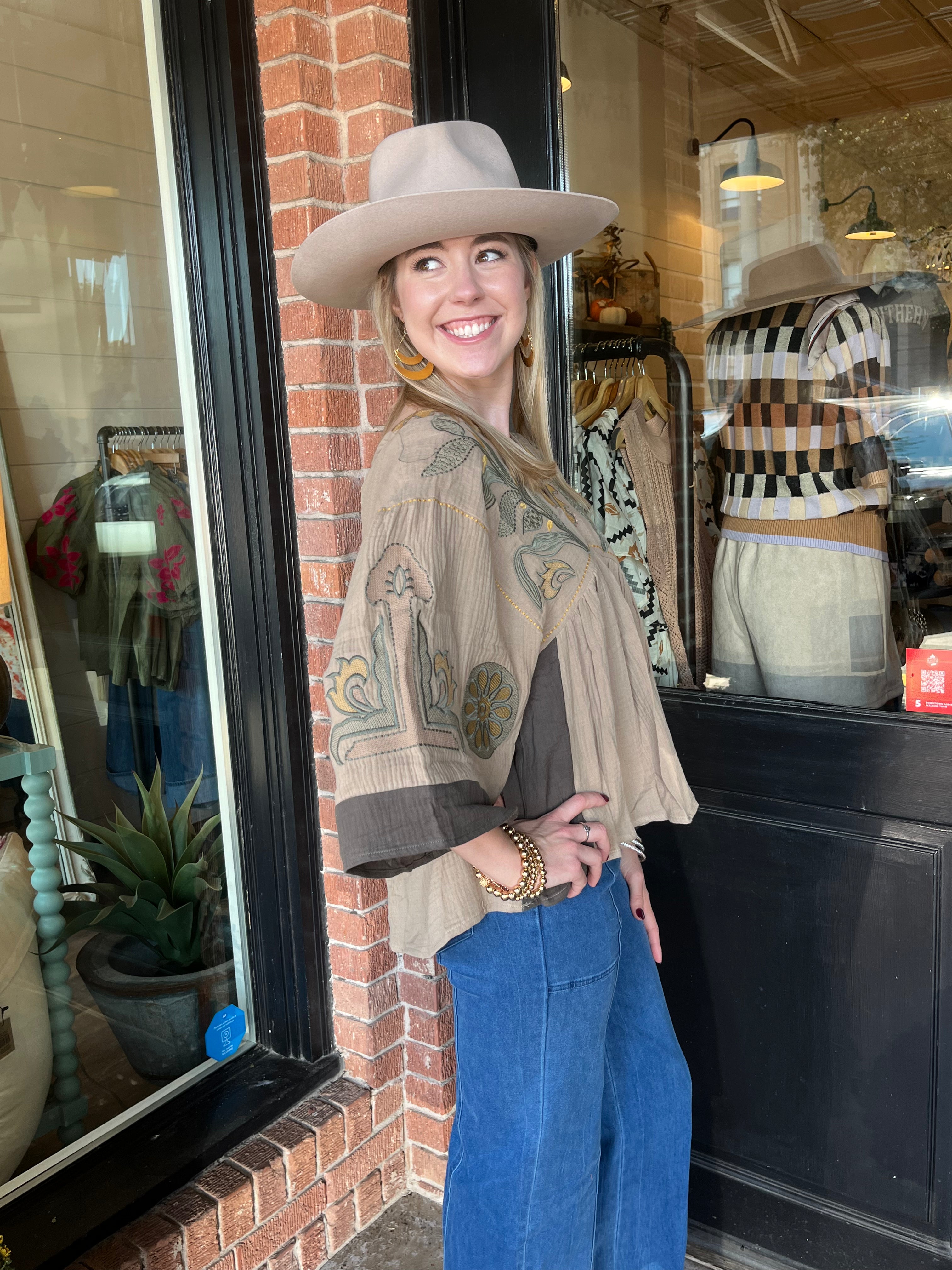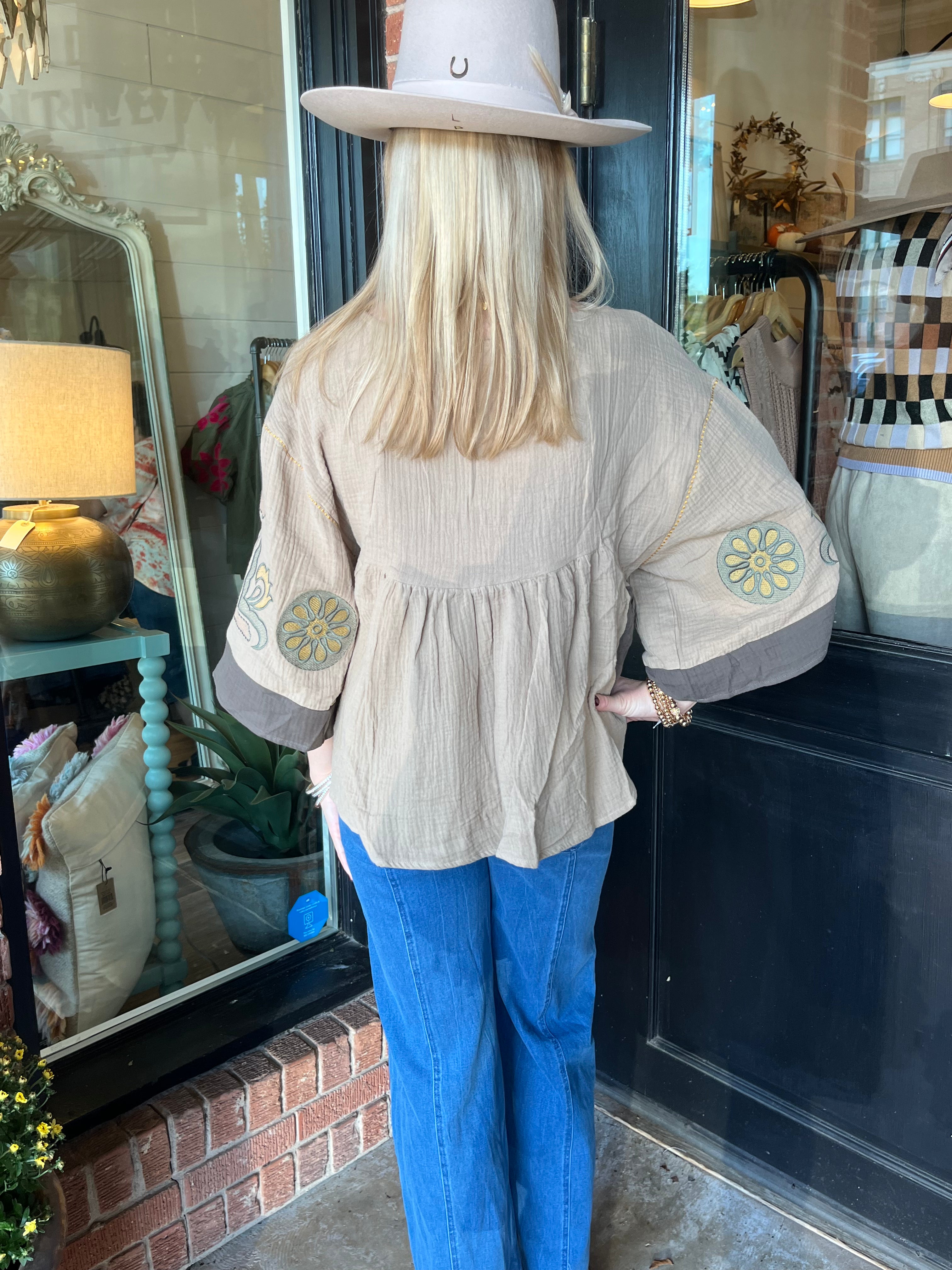 Get ready to rock the fall season with our Ruby Vintage Embroidery Patch Gauze Top. The beautiful embroidered details and bouncy sleeves add the perfect touch of fun to any outfit- whether you pair it with jeans or pants. Don't miss out on this must-have piece for your wardrobe!