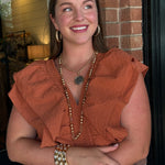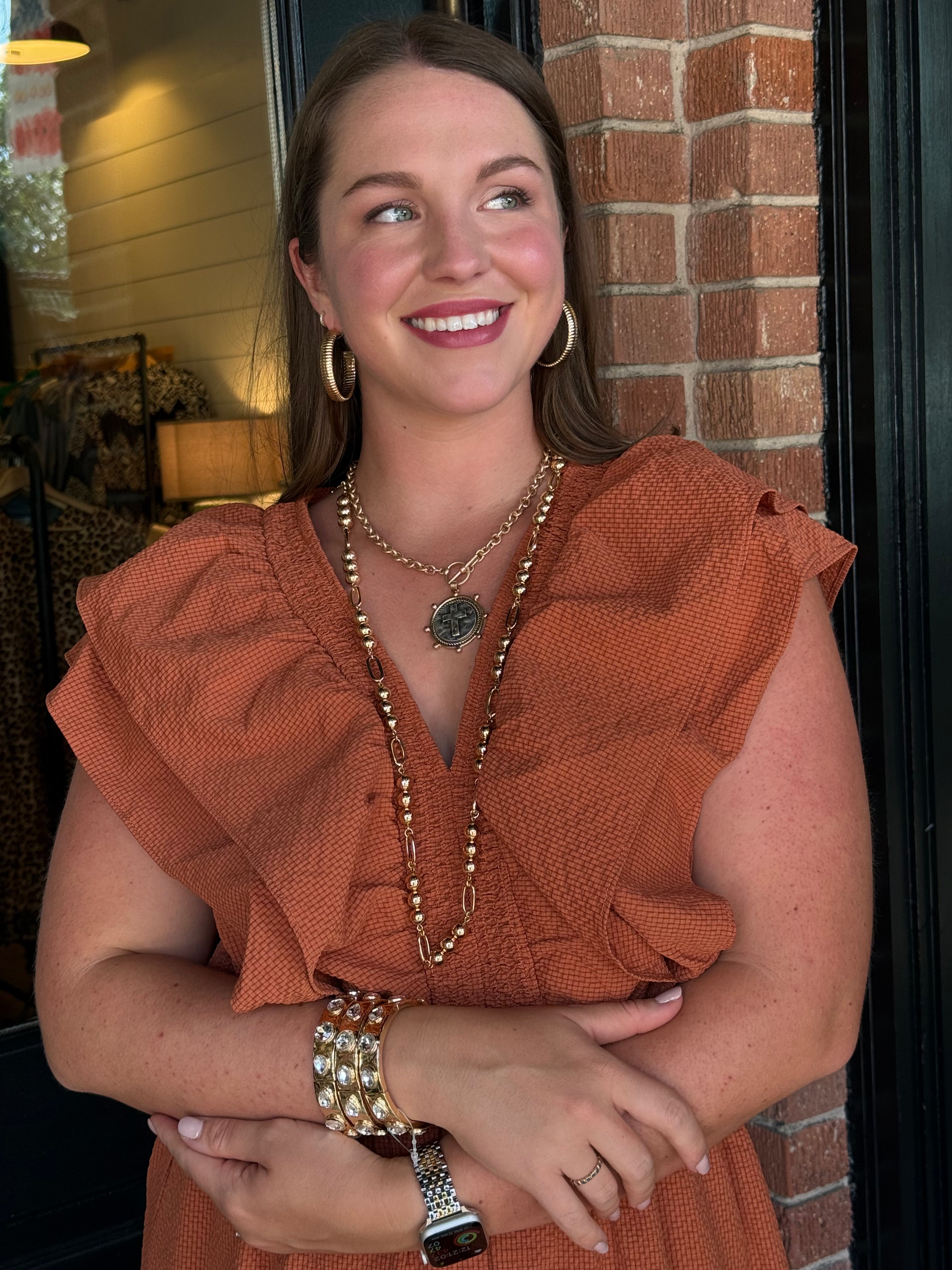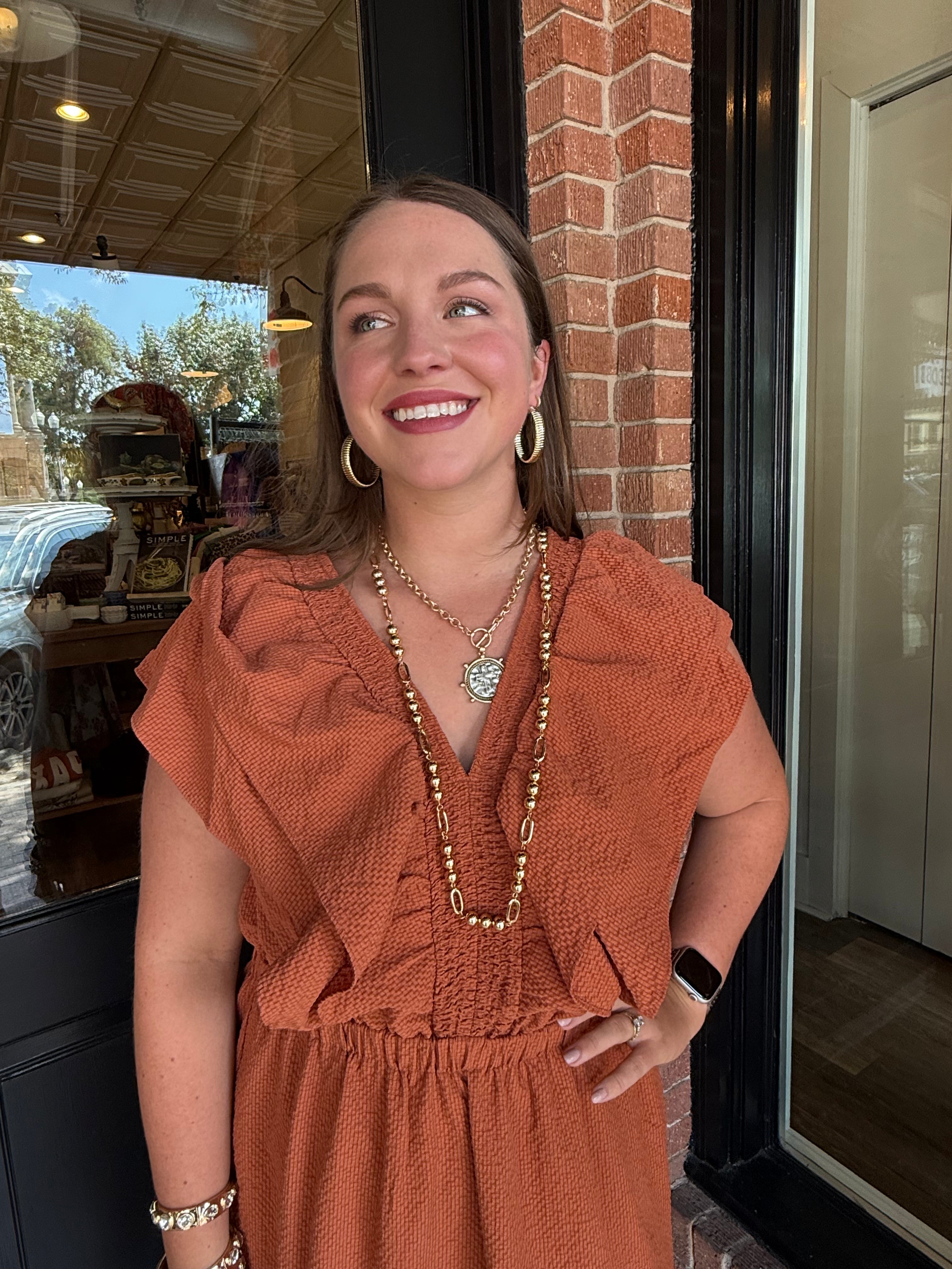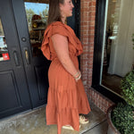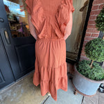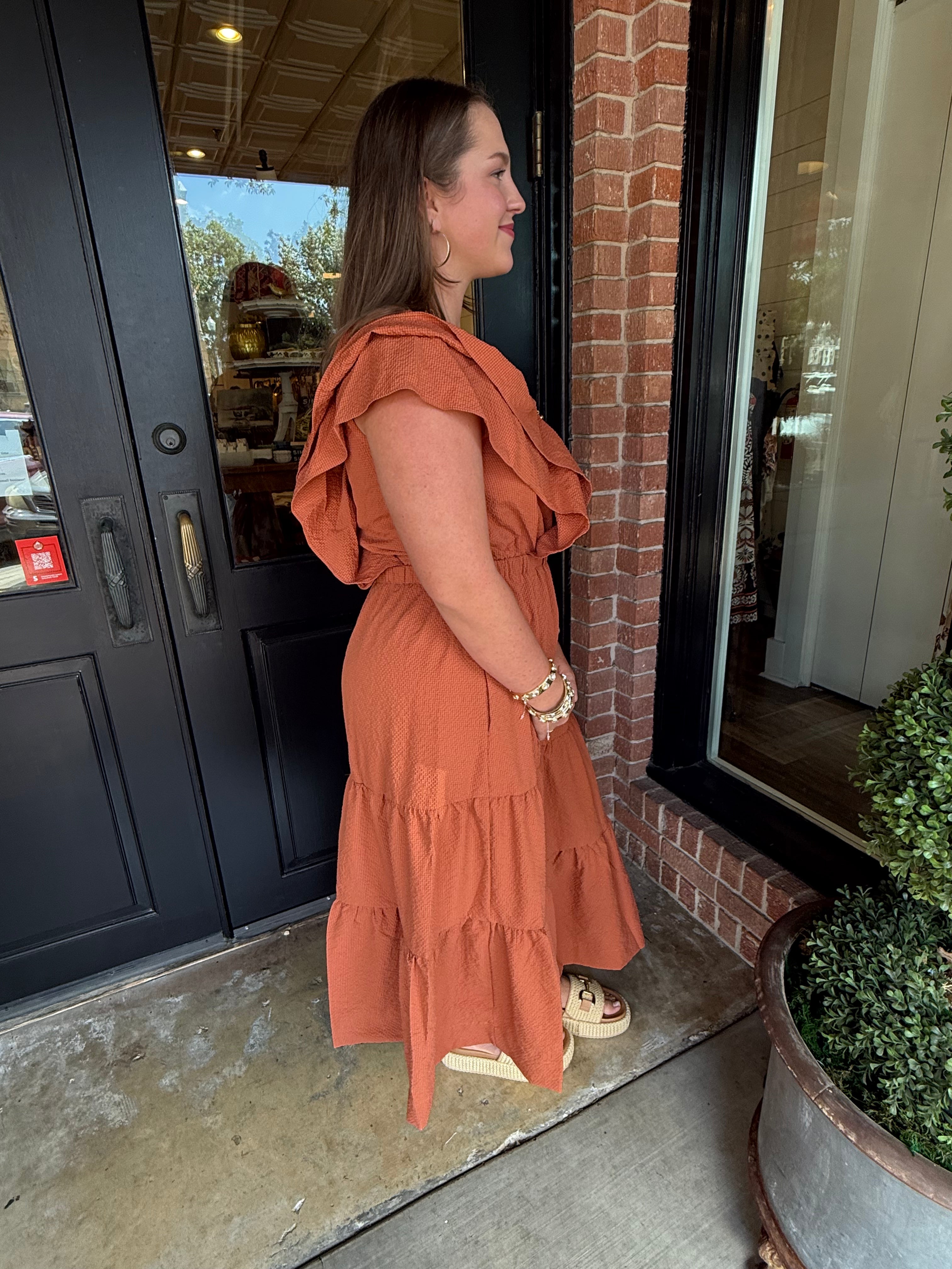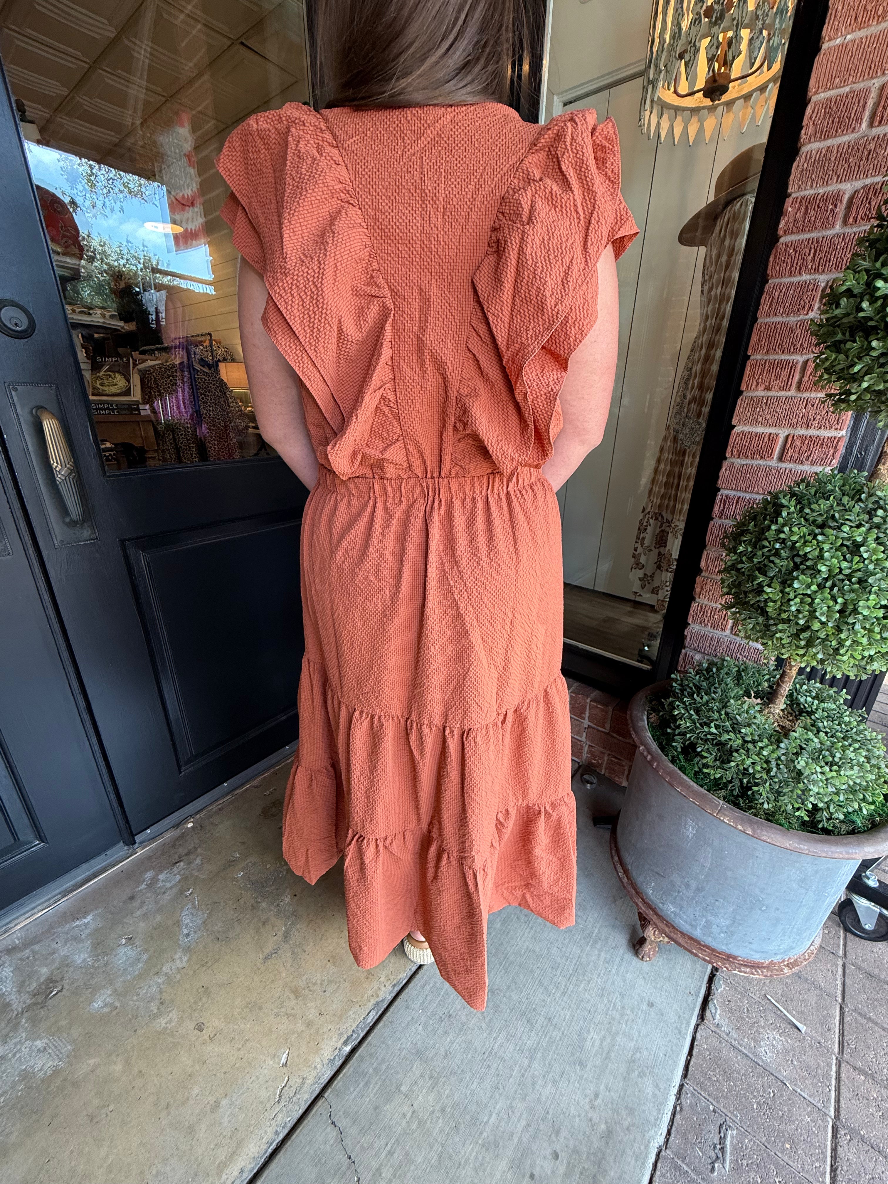 Elevate your wardrobe with the Sadie Textured Maxi Dress, featuring a flattering v-neckline with delicate ruffle detailing on the front and sleeves. The tiered silhouette flows gracefully for an effortlessly feminine look, perfect for brunch, date night, or weekend outings.